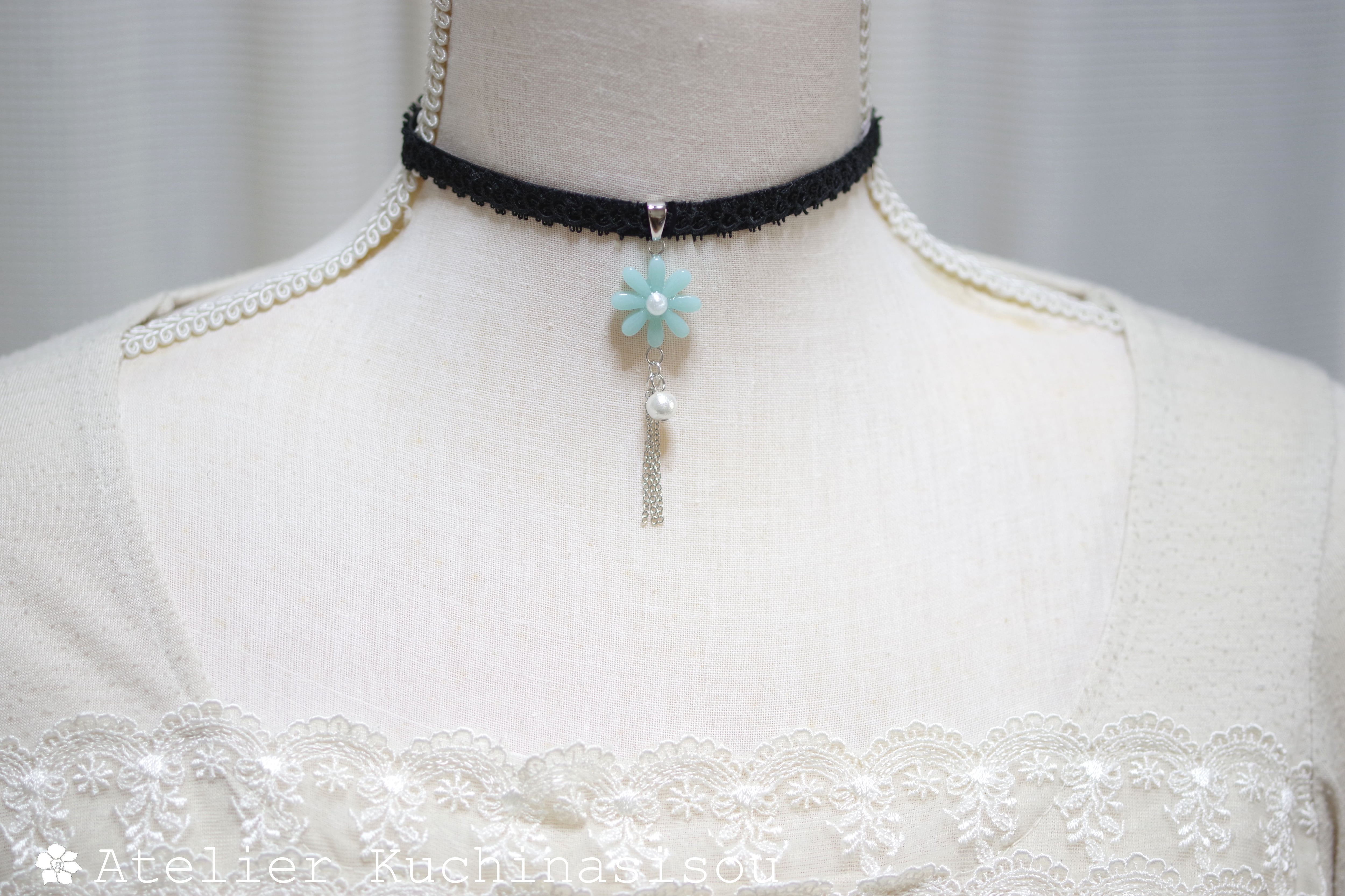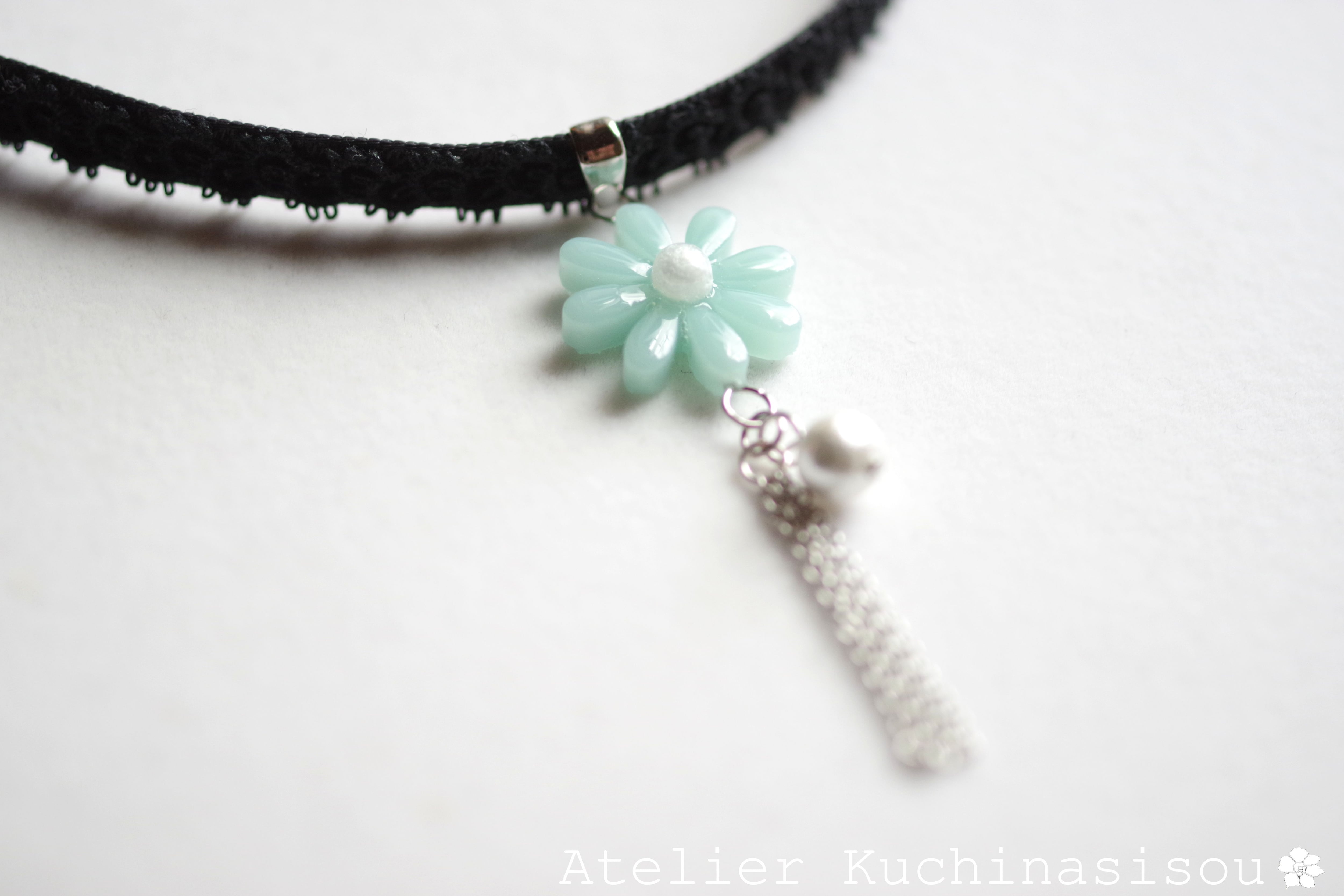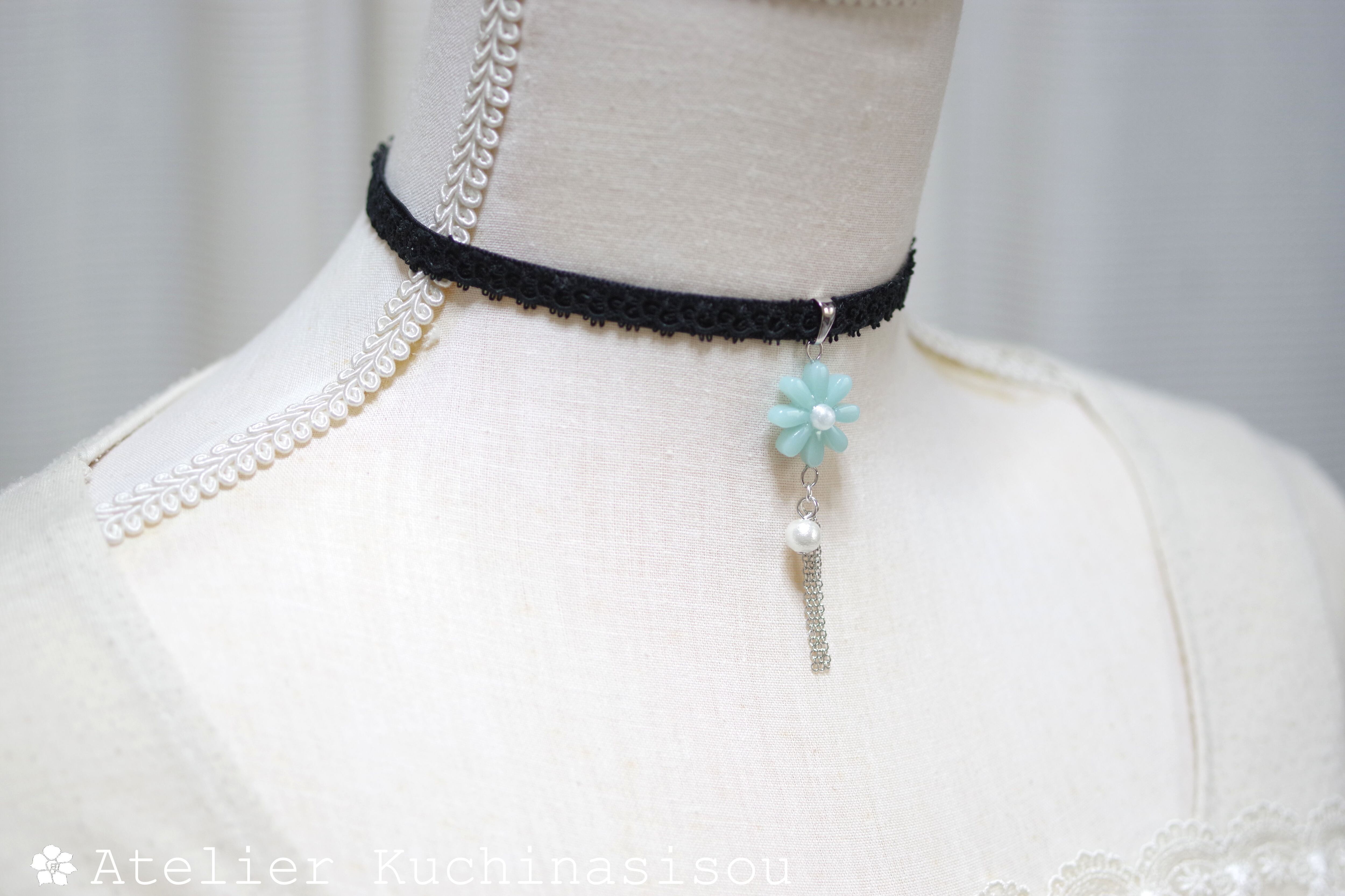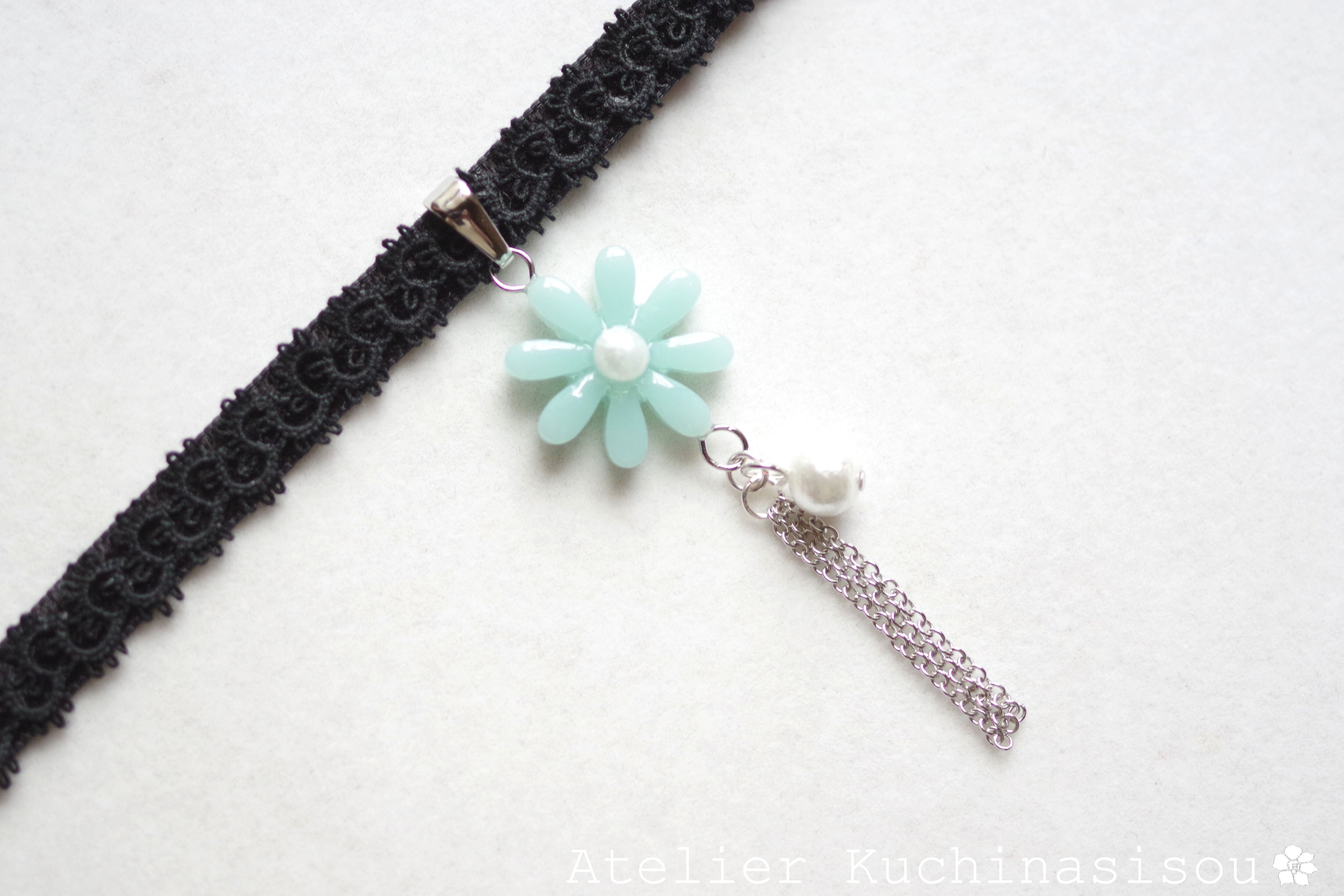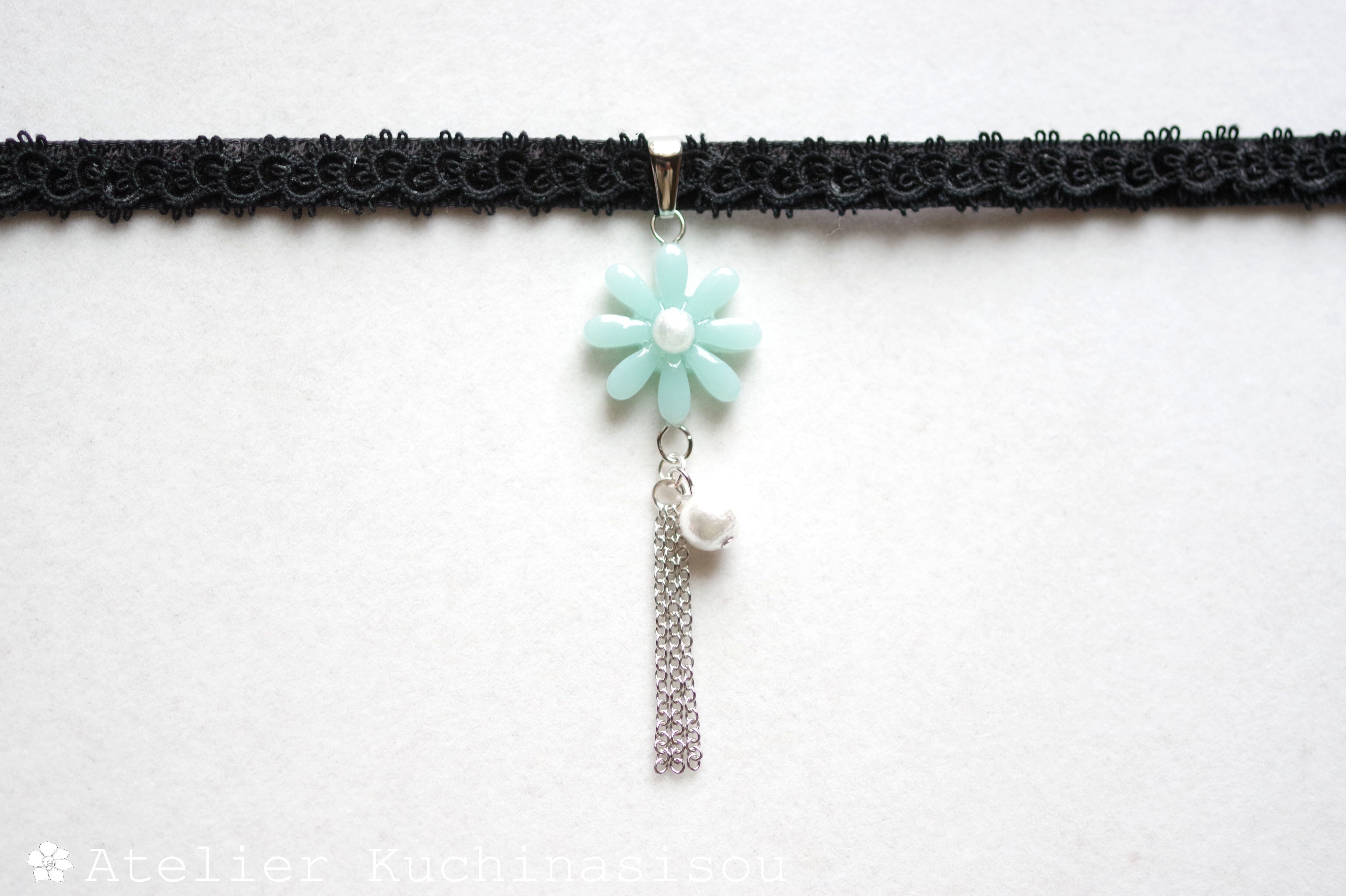 緑味を帯びた優しく淡い水色のお花モチーフのレジンを、ベルベットリボンにタティングレースで装飾を施したチョーカーに仕上げました。