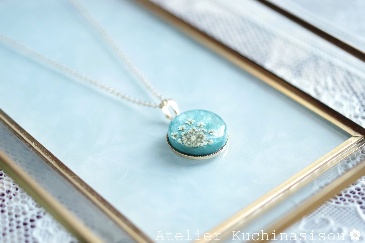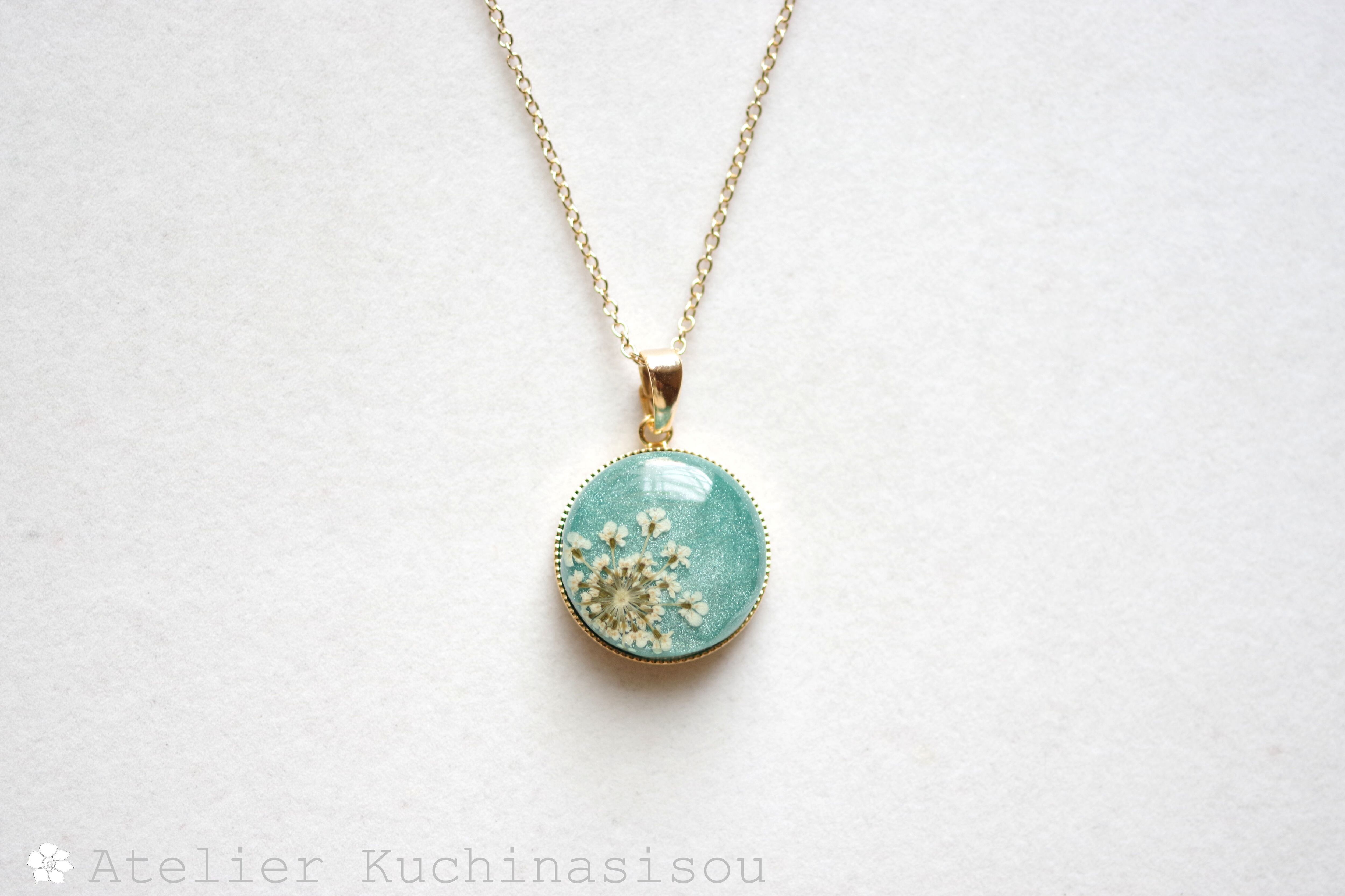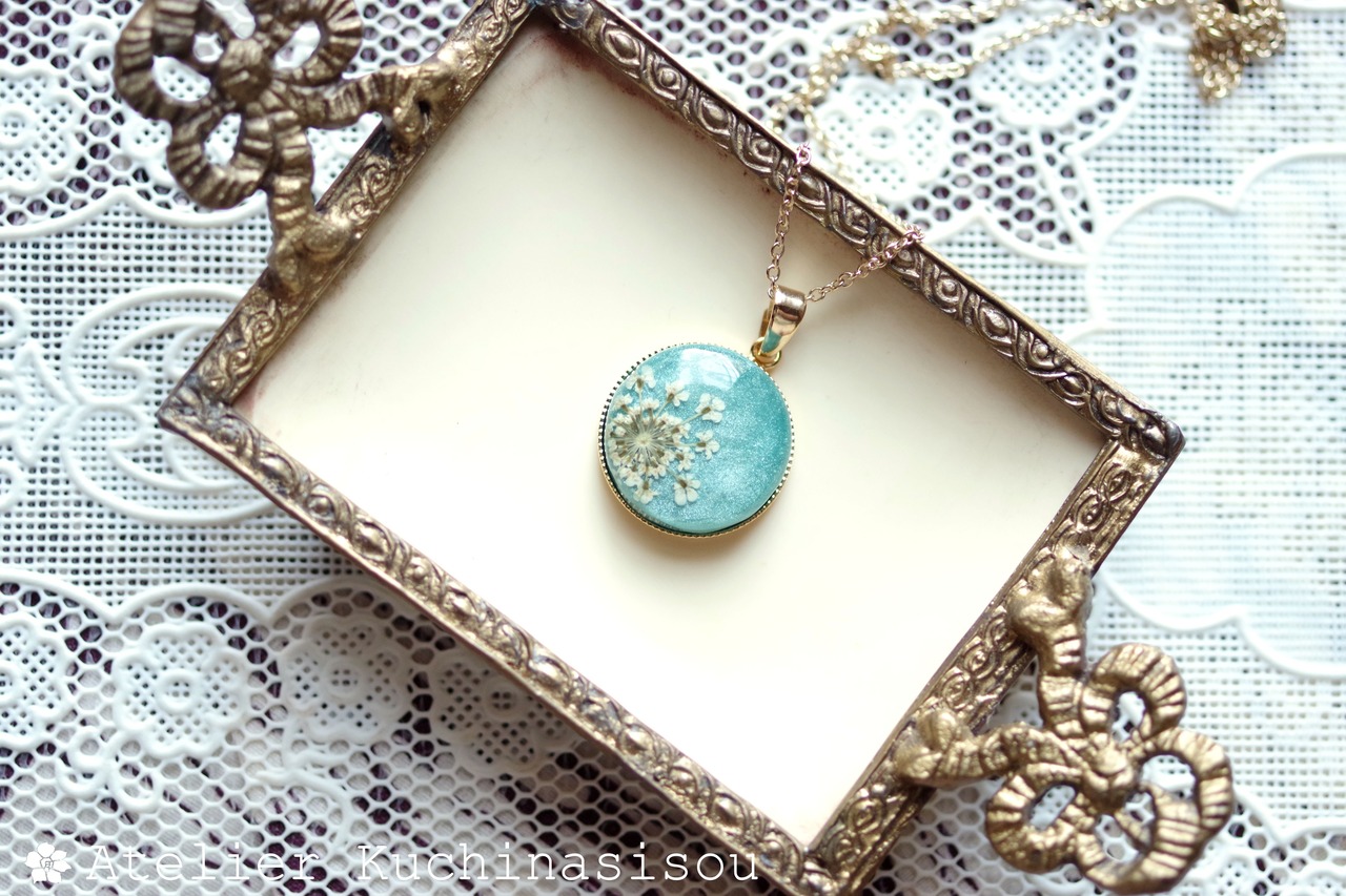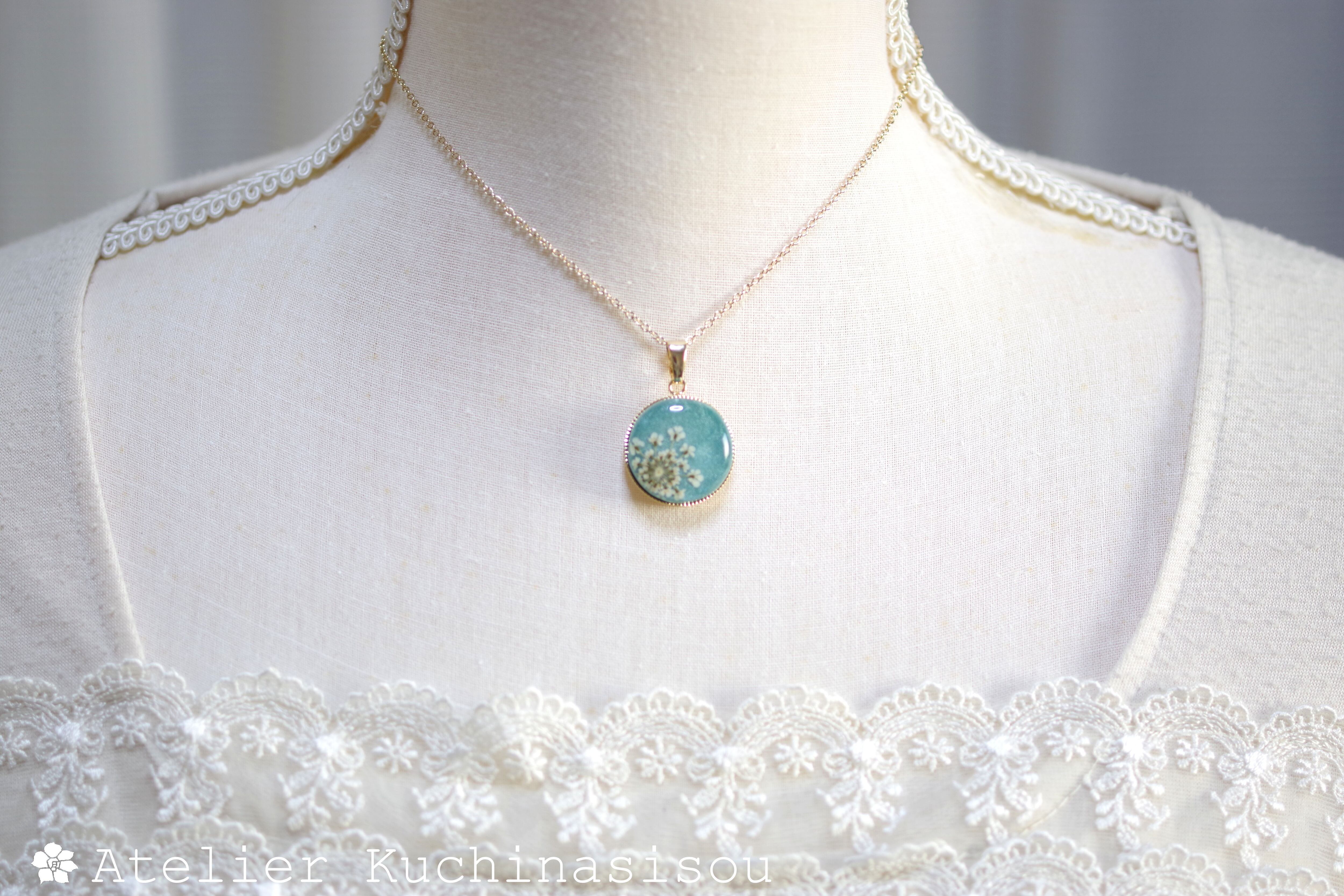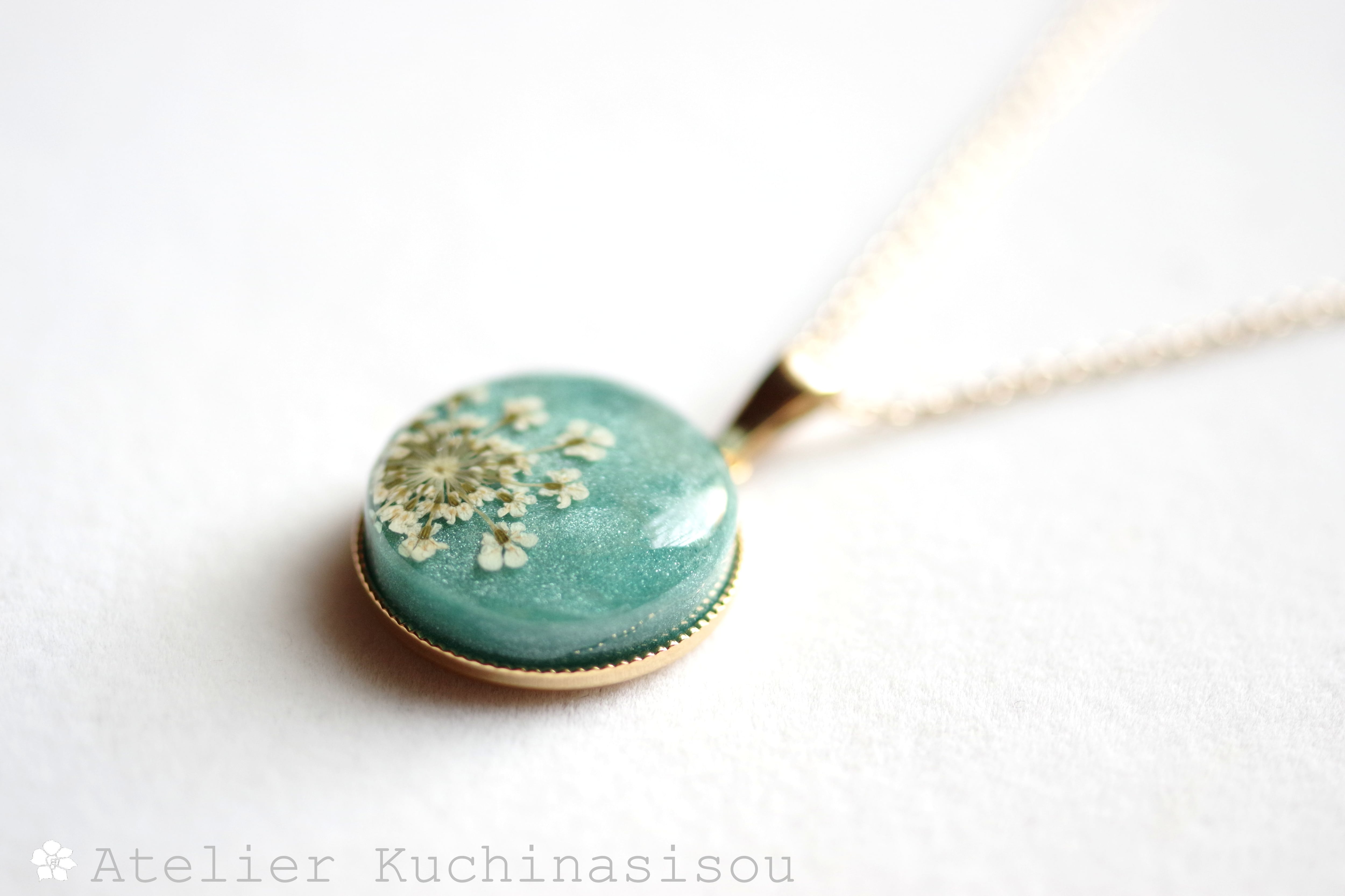光沢のあるモスグリーンのレジンに白いレースフラワーをあしらった、華やかでありながら淑やかなペンダント。