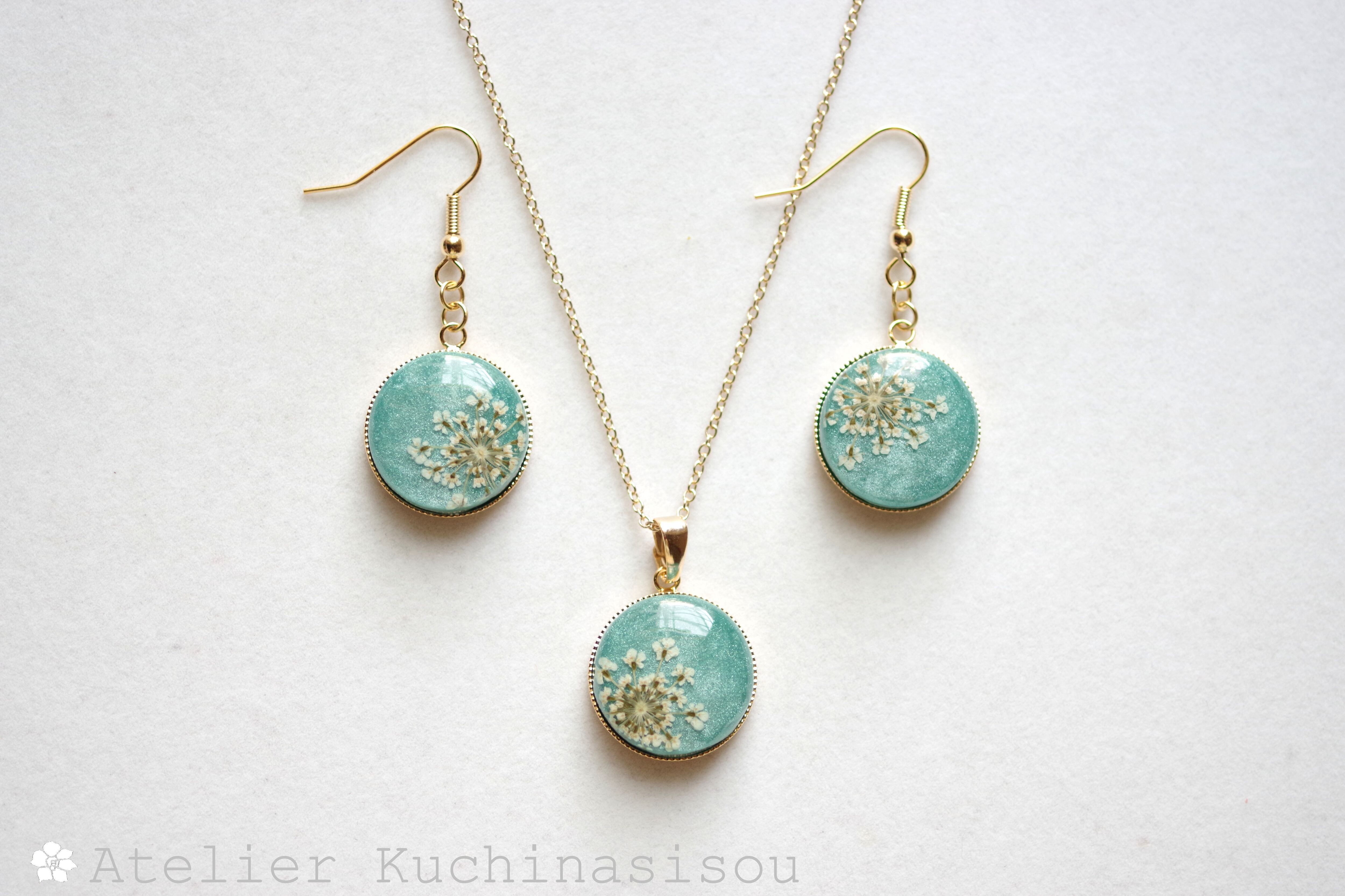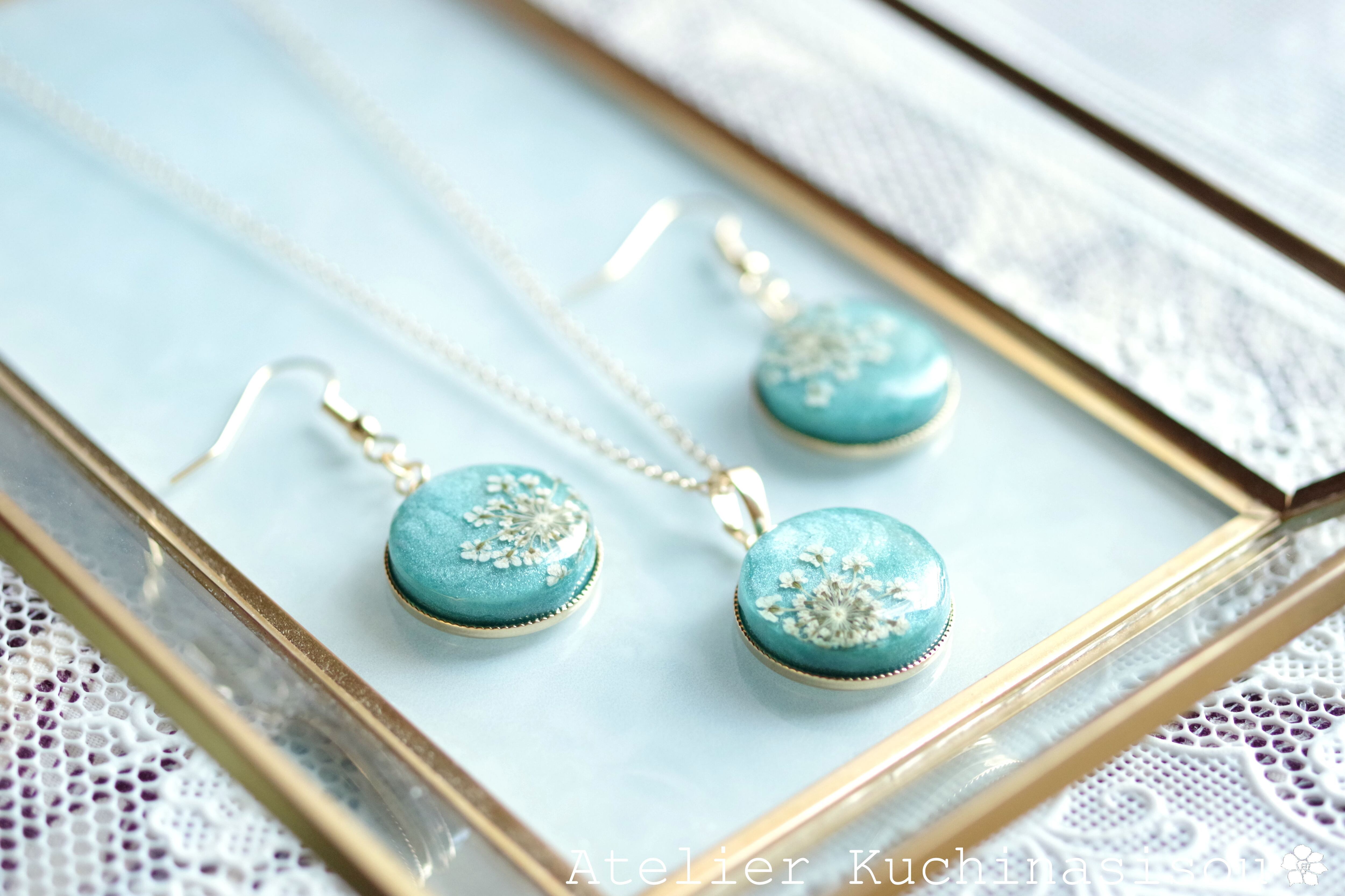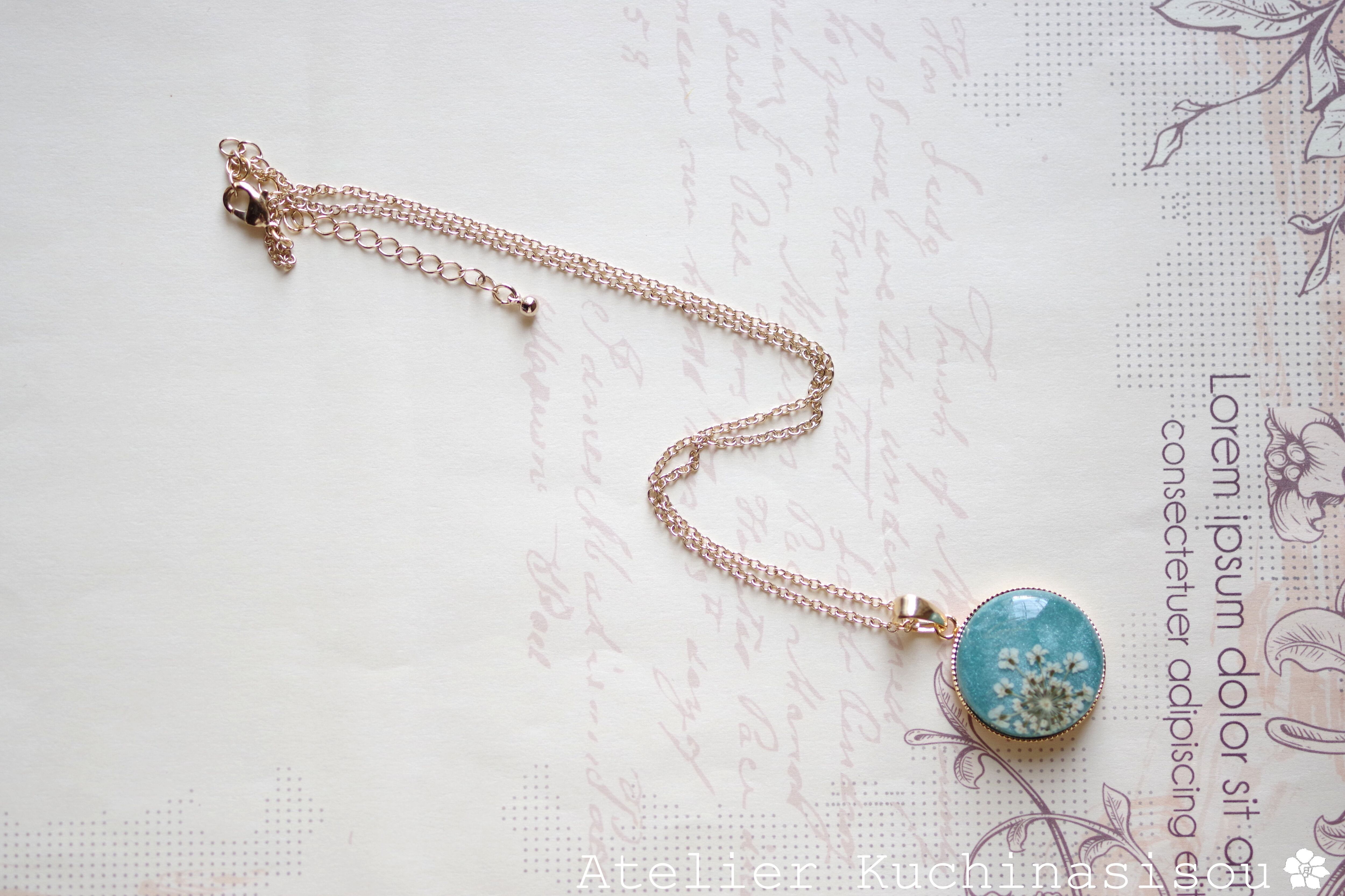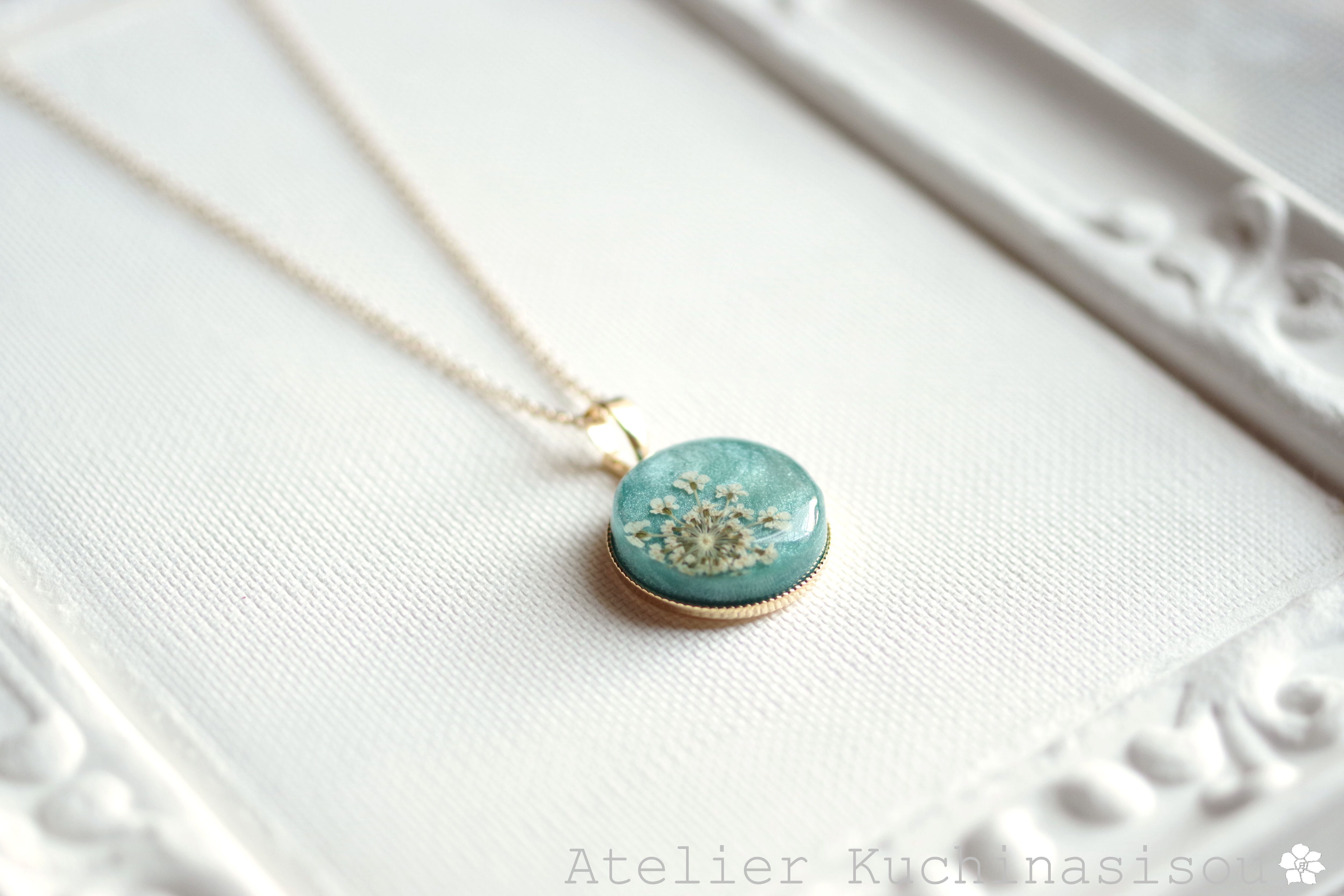 光沢のあるモスグリーンのレジンに白いレースフラワーをあしらった、華やかでありながら淑やかなペンダント。