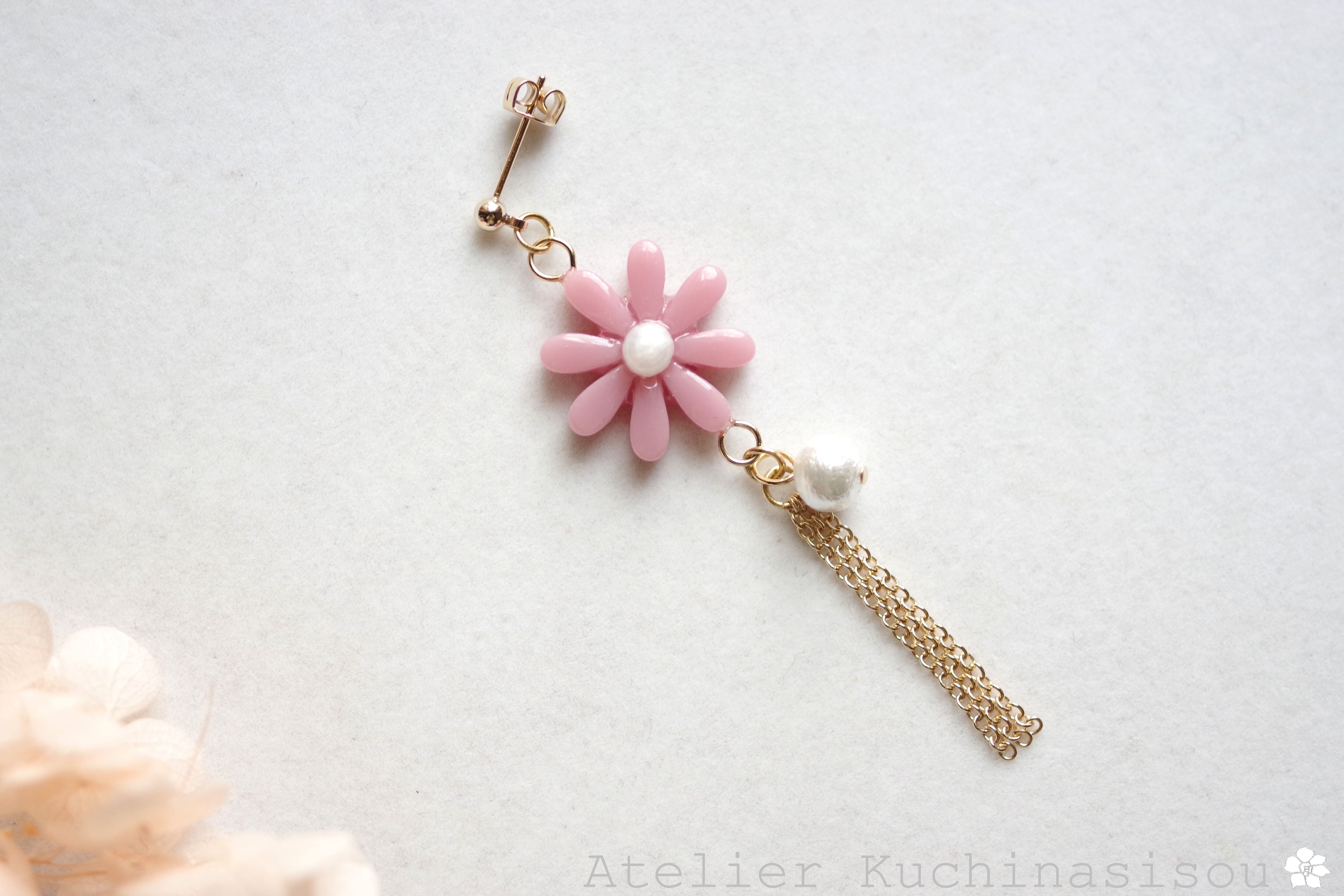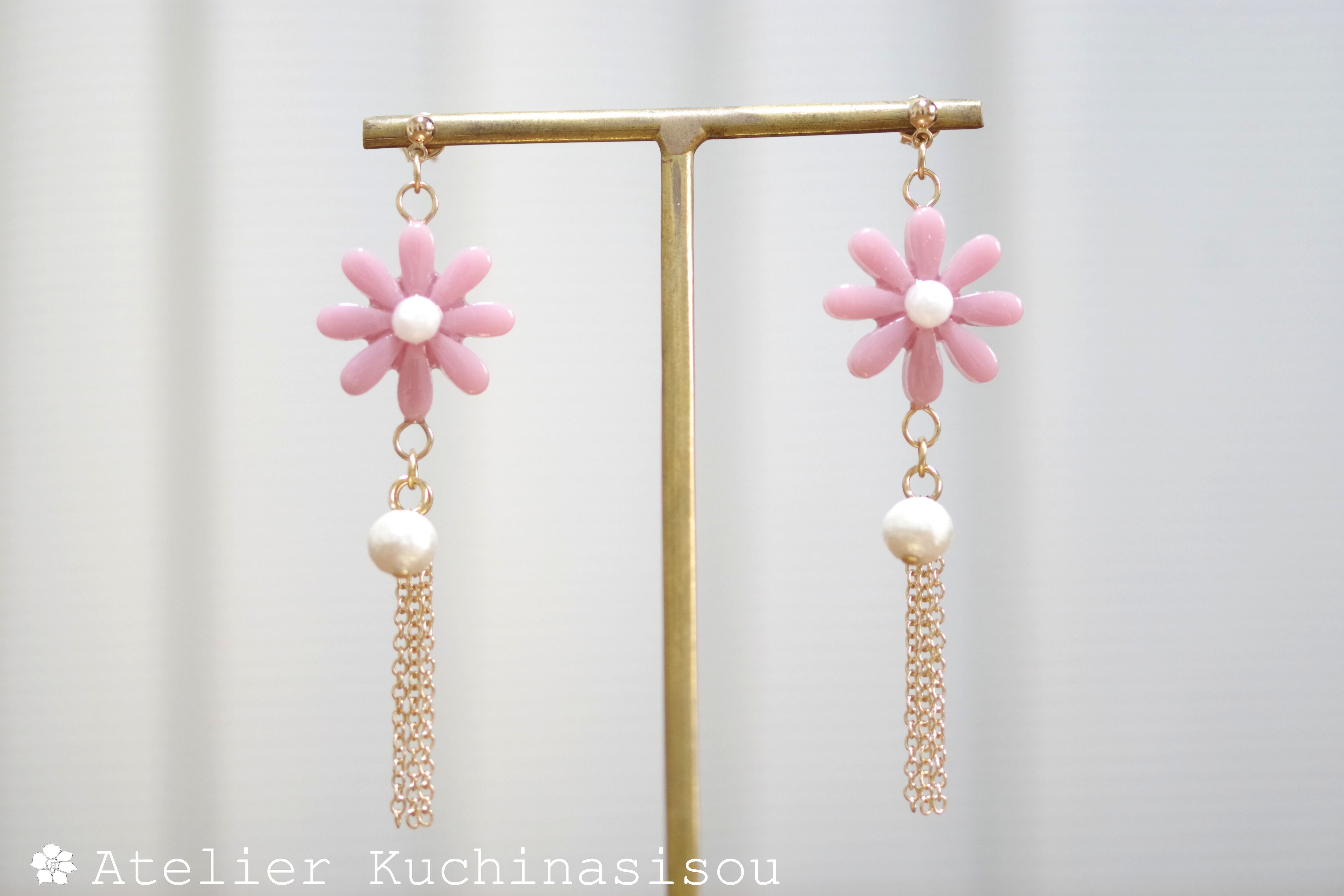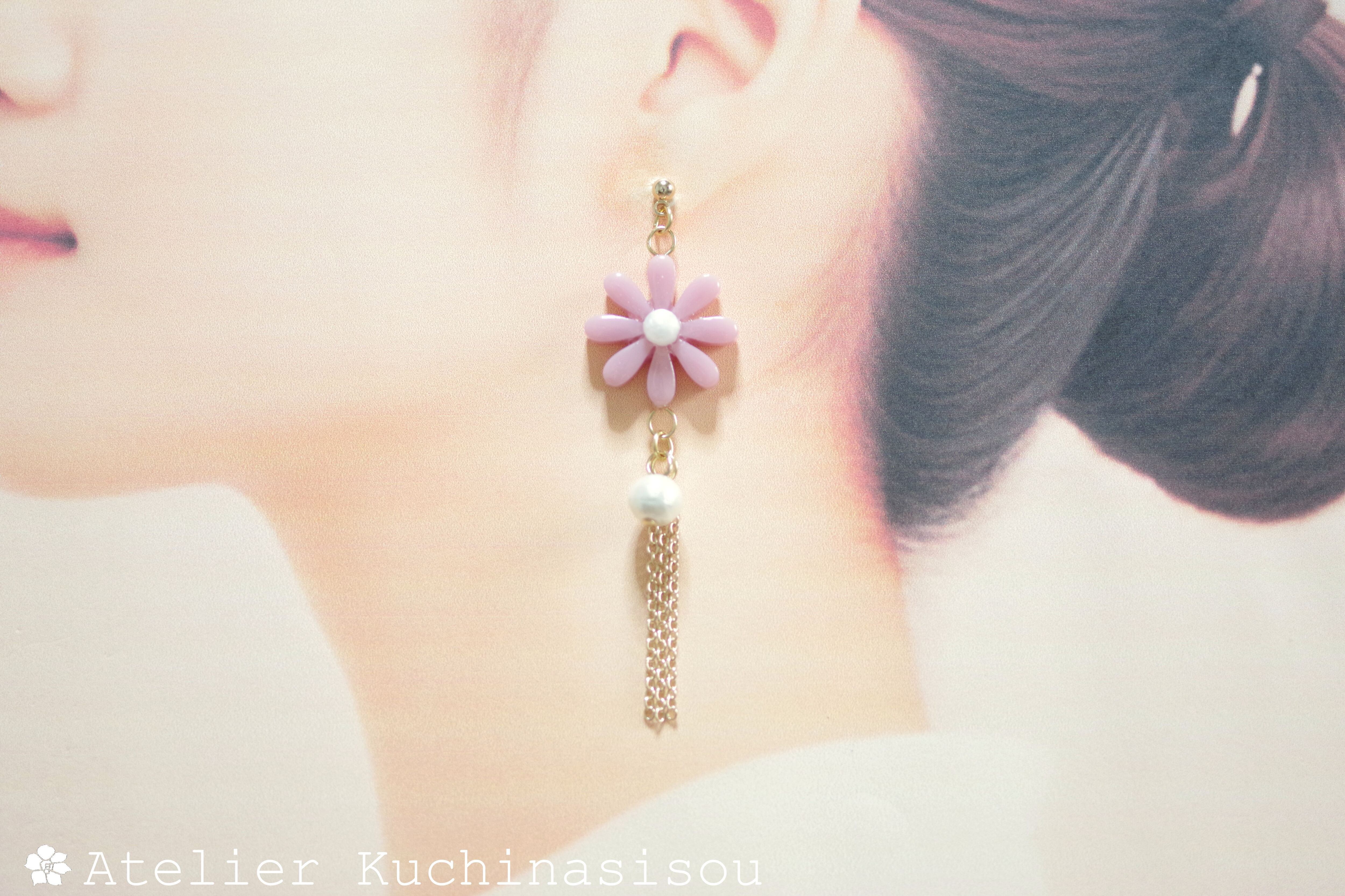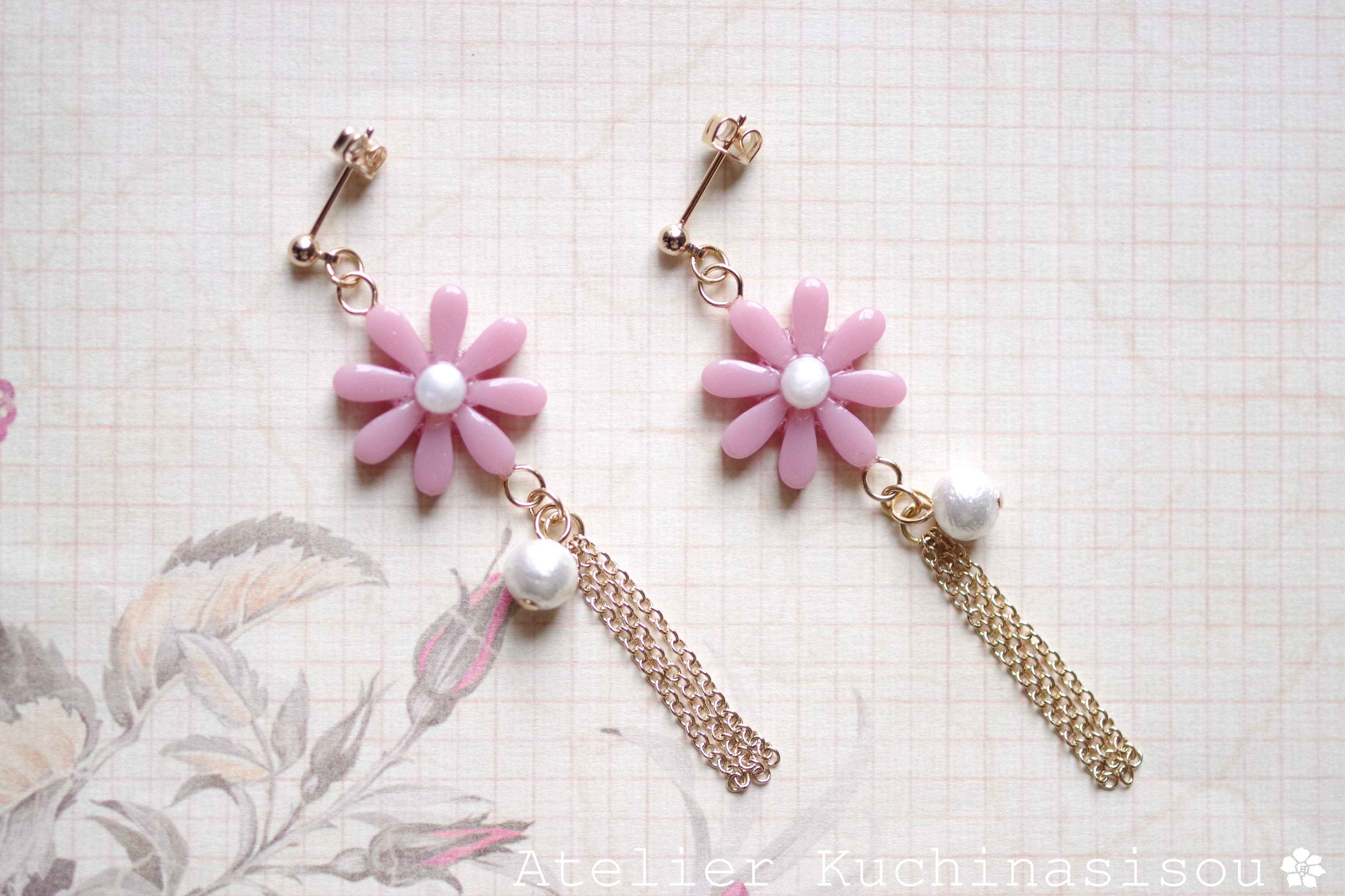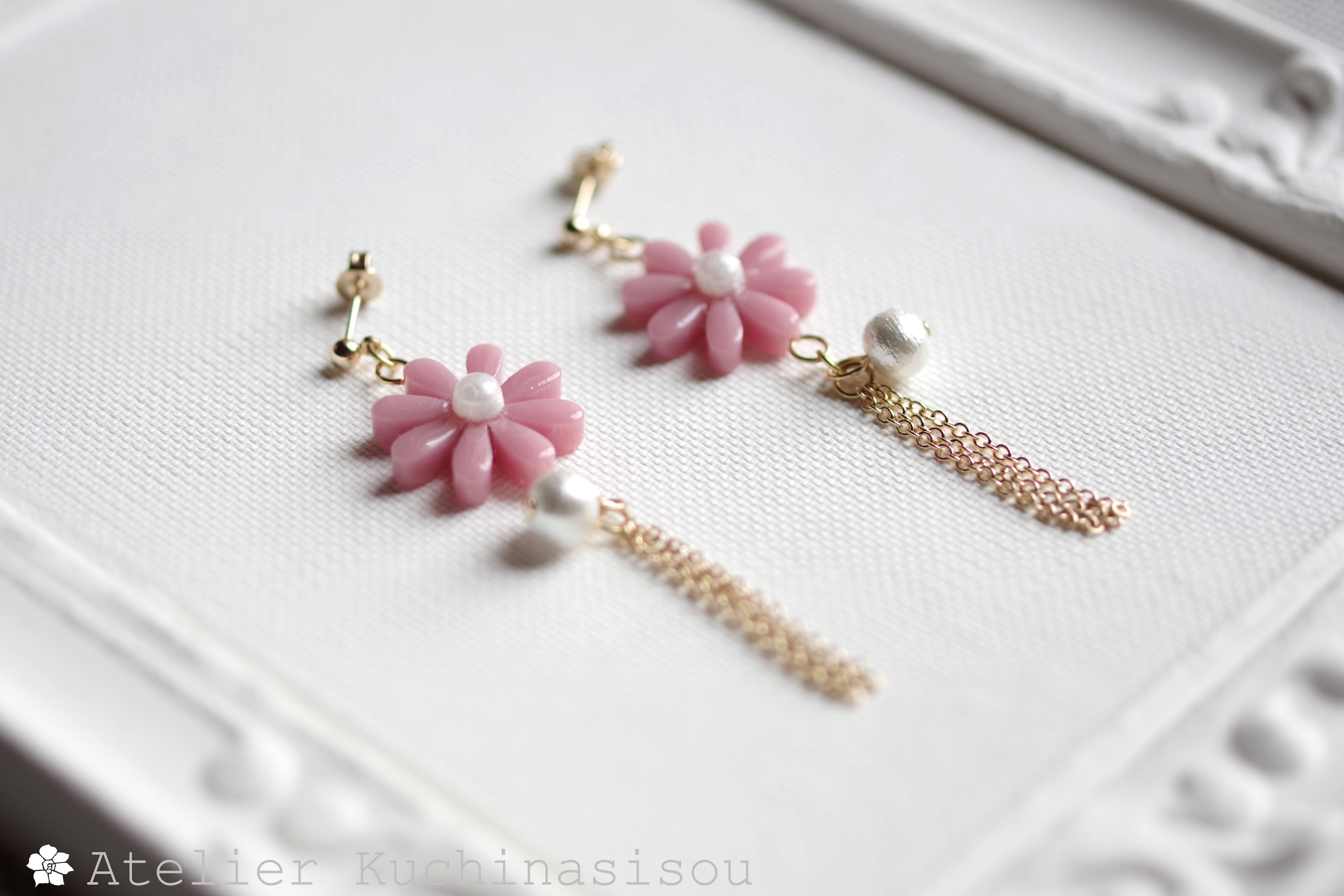 レジンでお花とコットンパールとフリンジのピアスを作りました♪