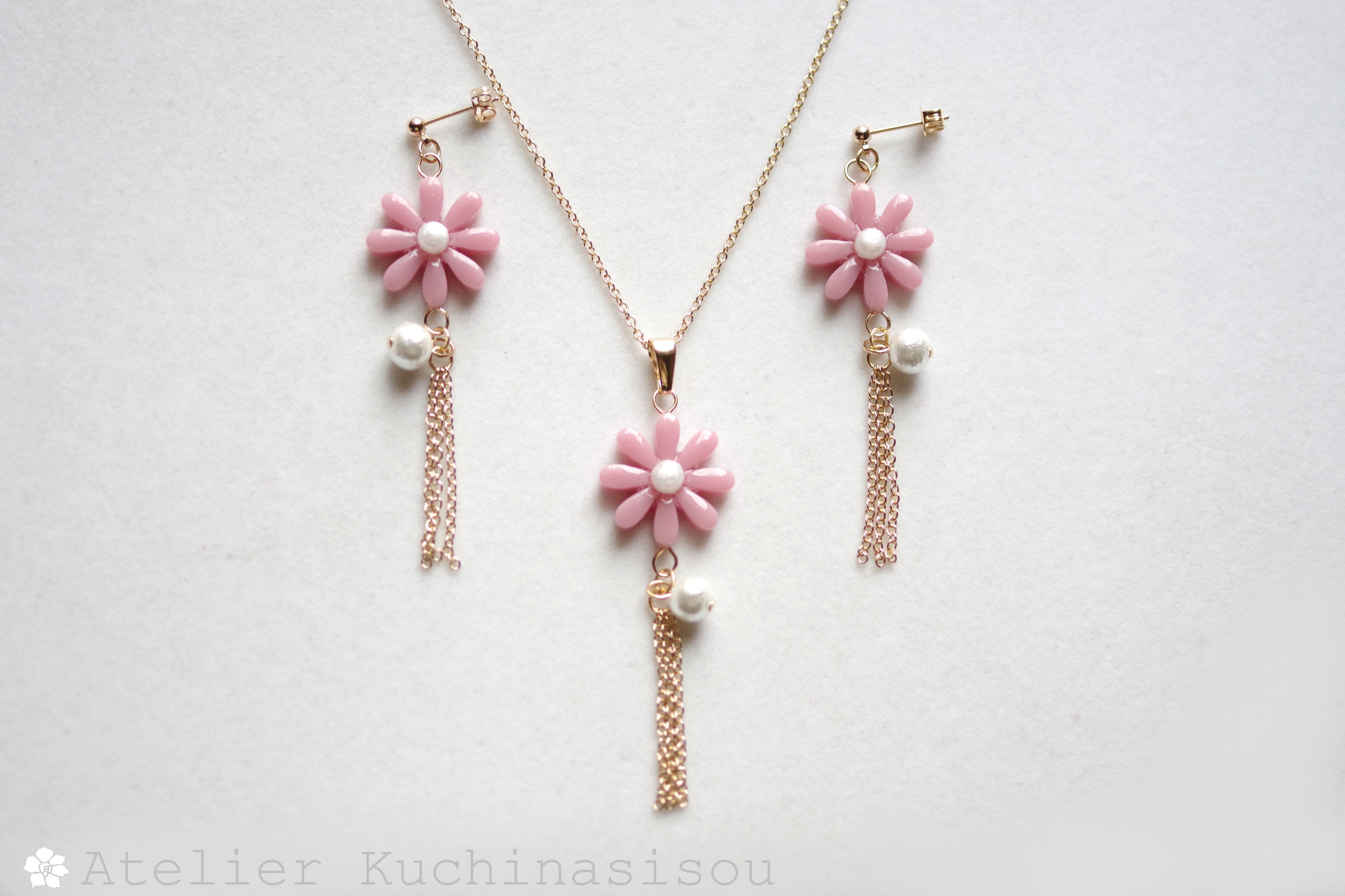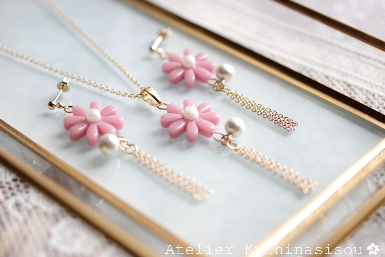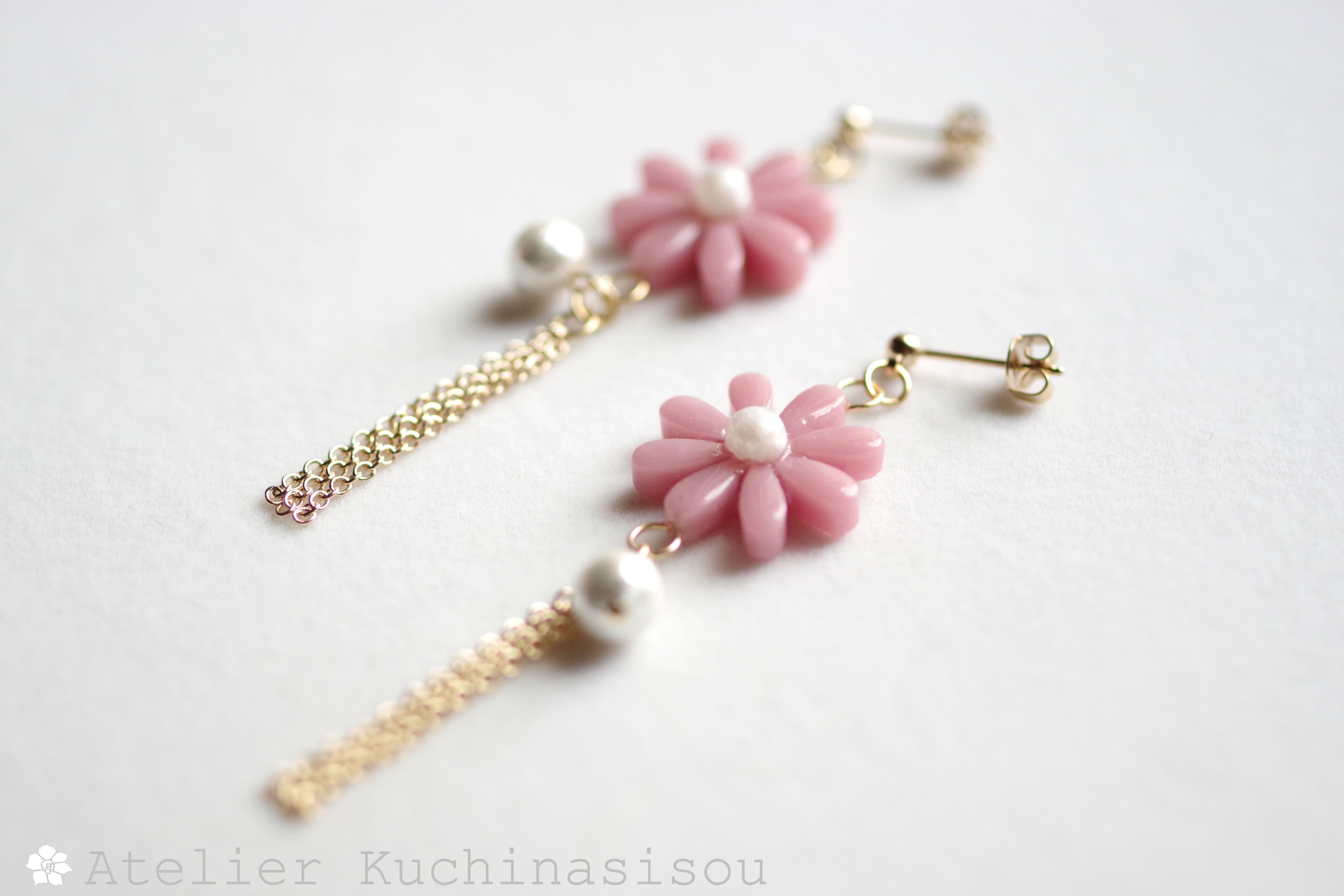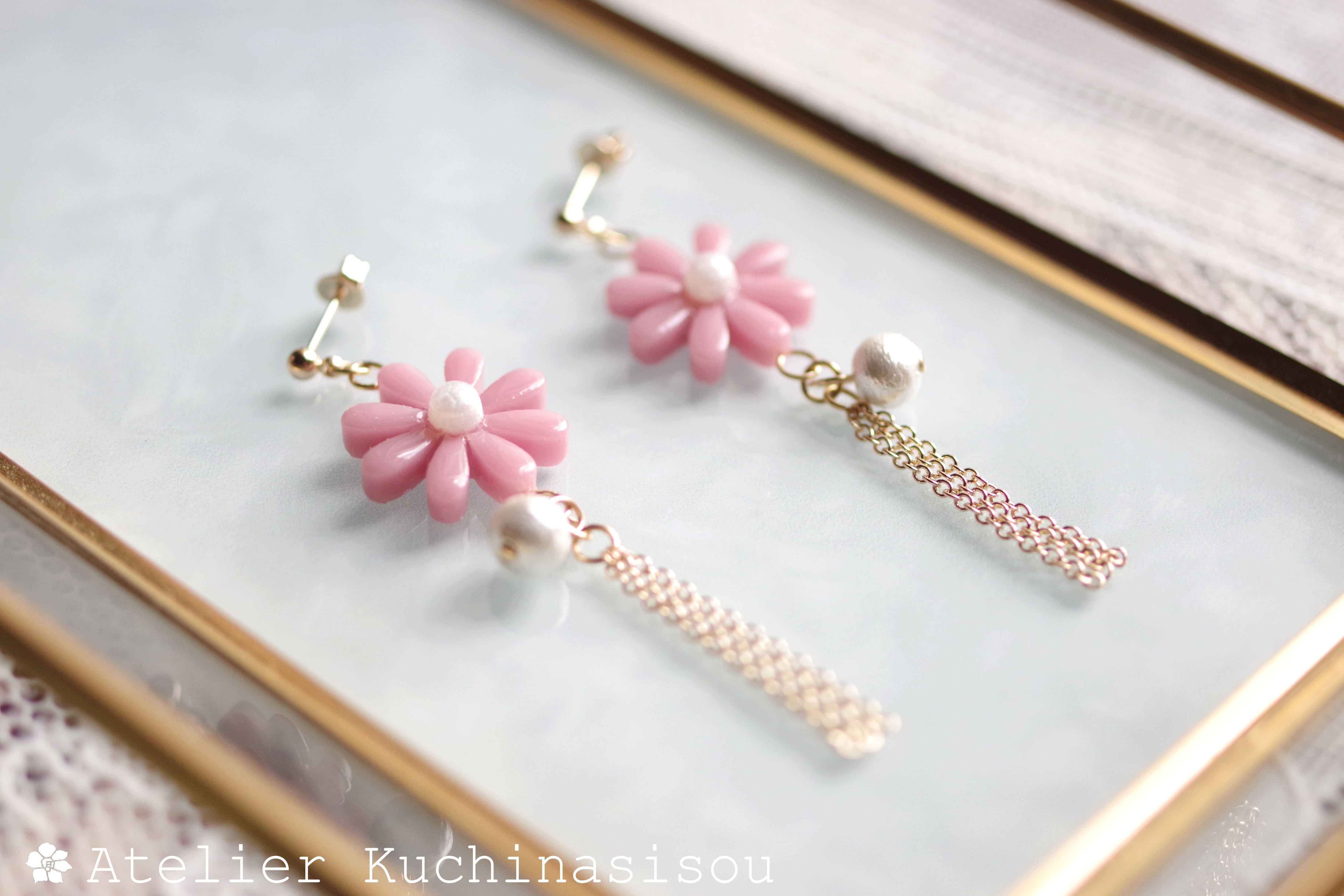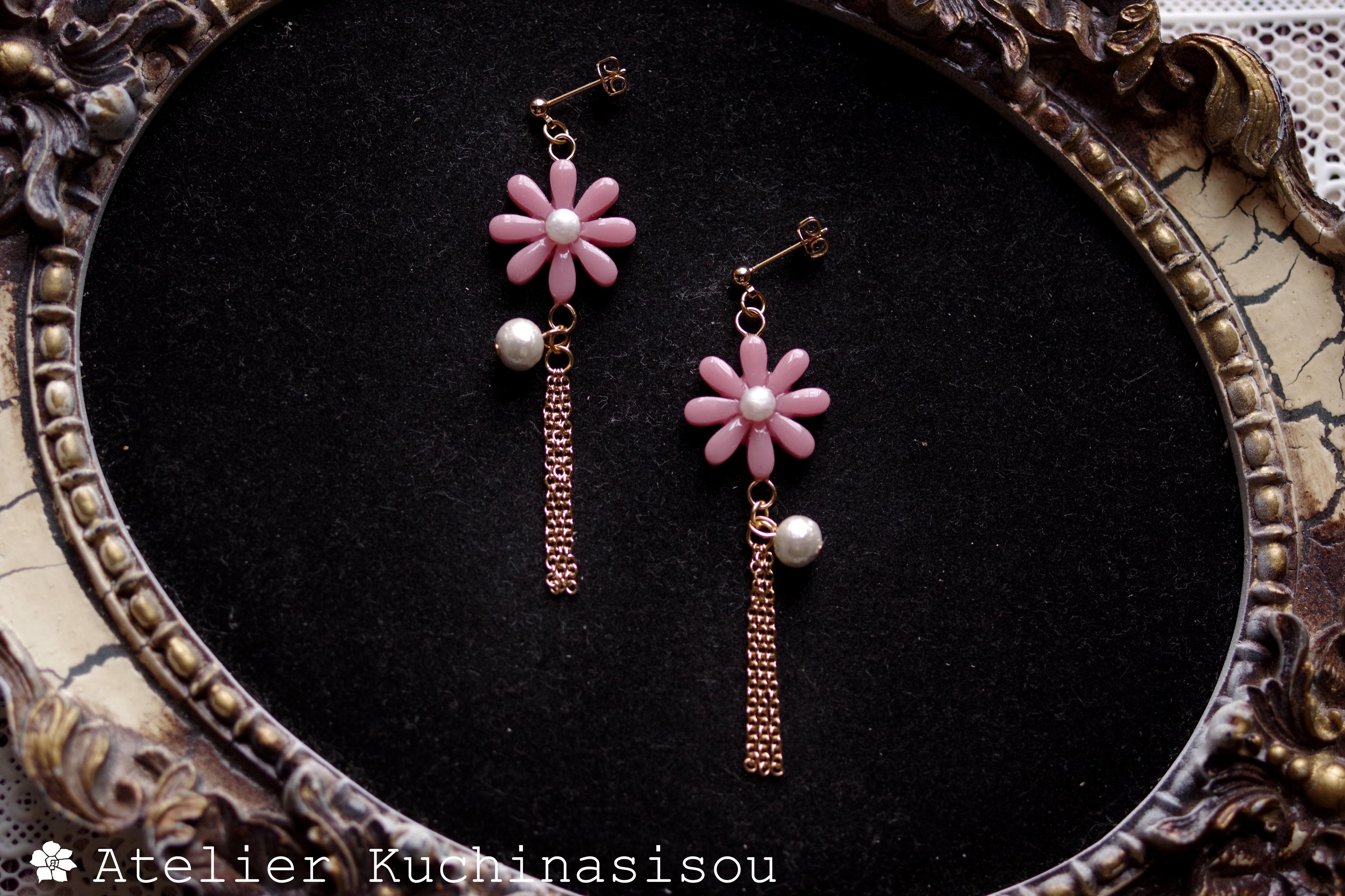 レジンでお花とコットンパールとフリンジのピアスを作りました♪