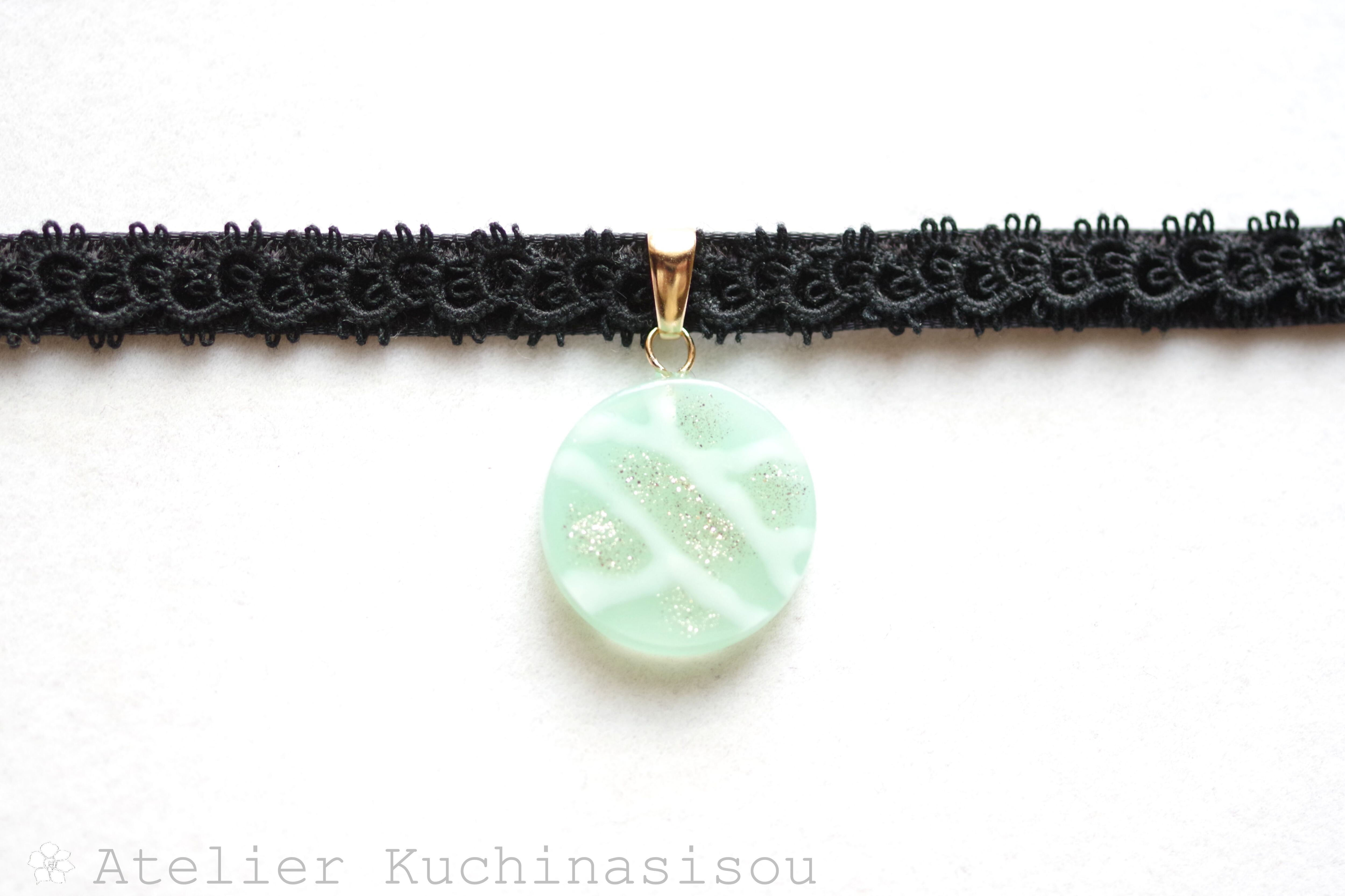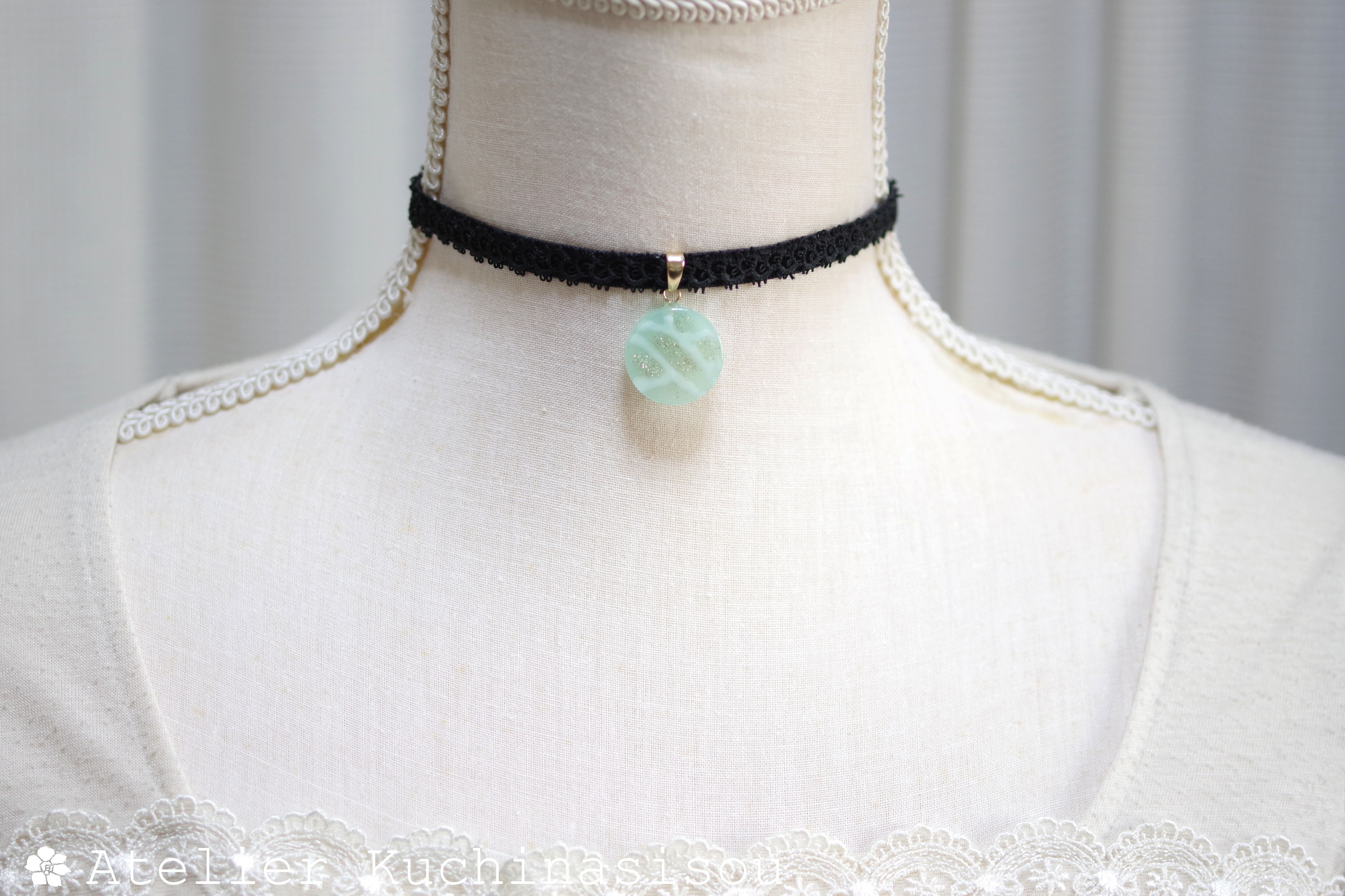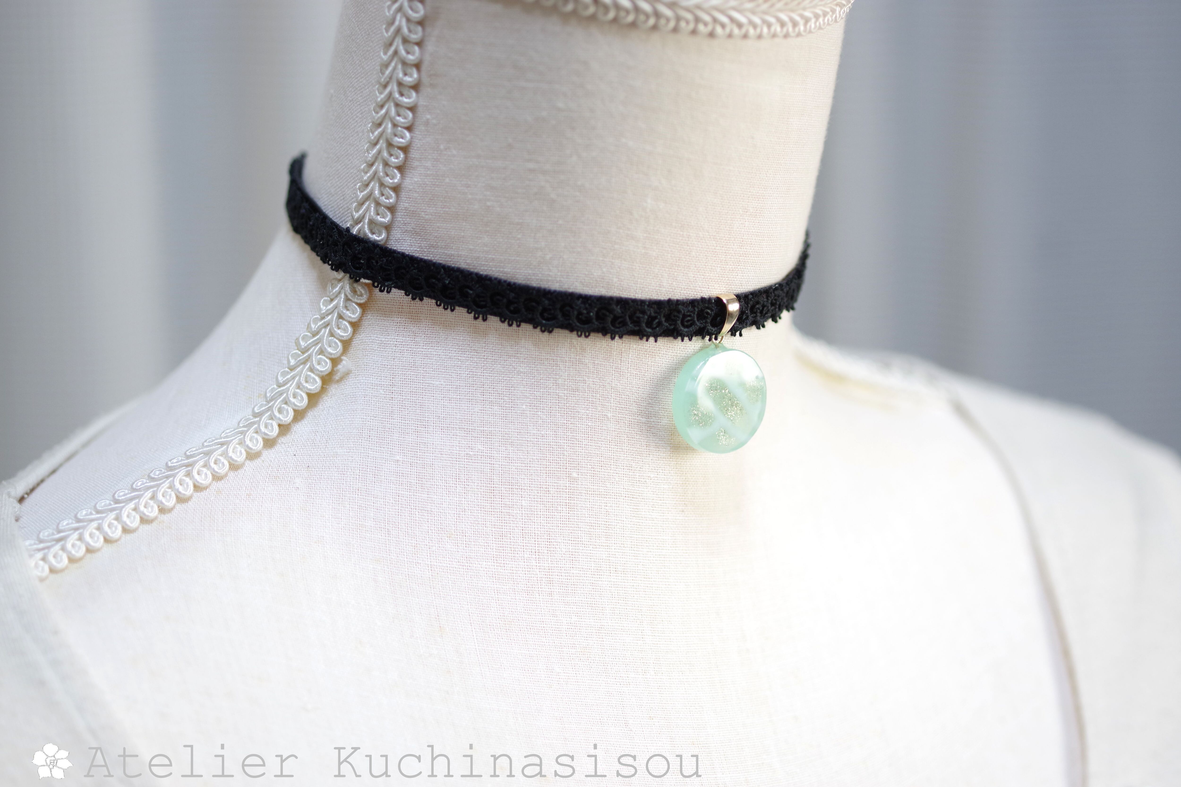 半透明のグリーンにラメを乗せ、水面のような模様を描いた、しっとりとした風情と爽やかさを併せ持ったレジンを、ベルベットリボンにタティングレースで装飾を施したチョーカーに仕上げました。