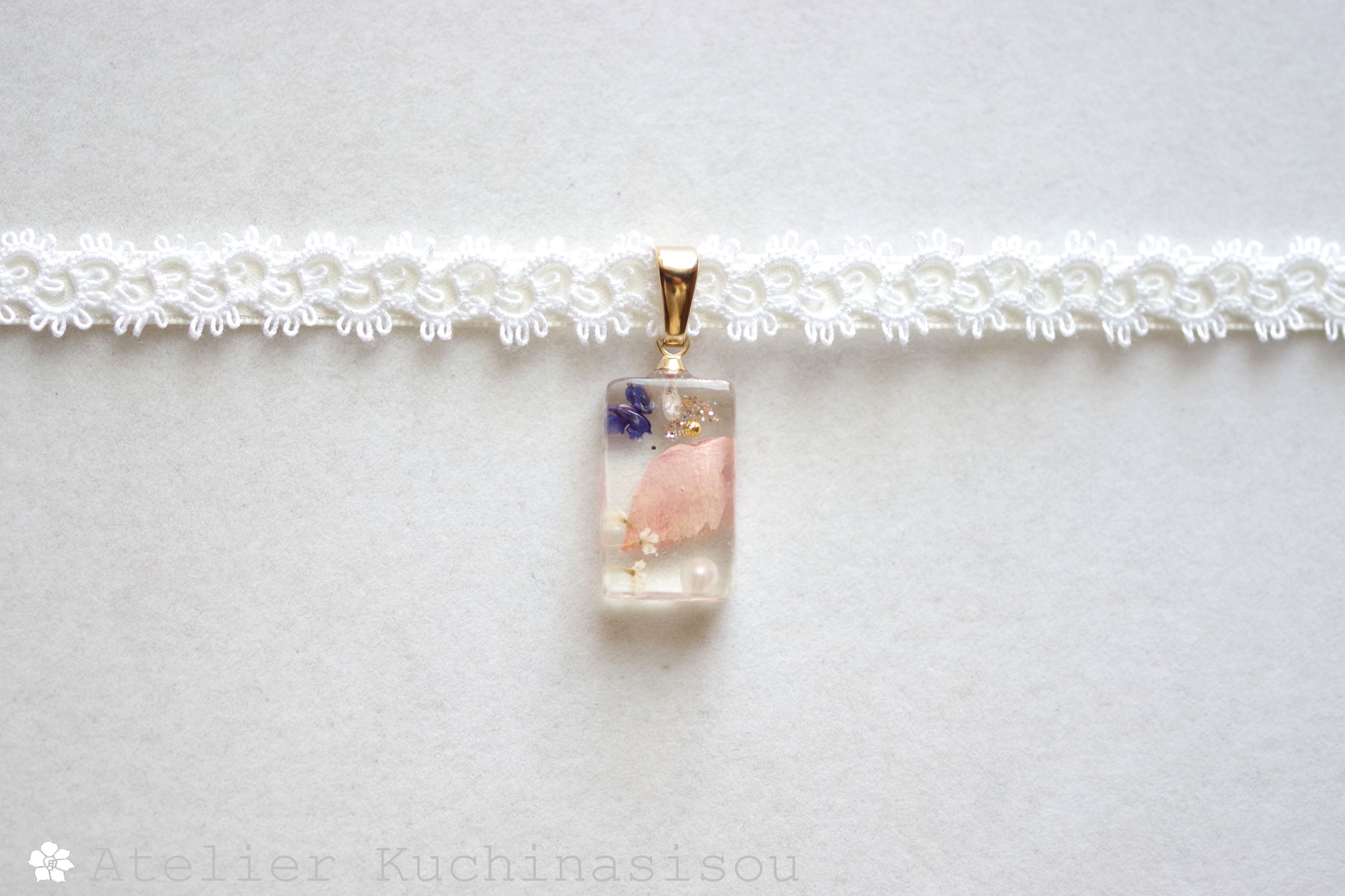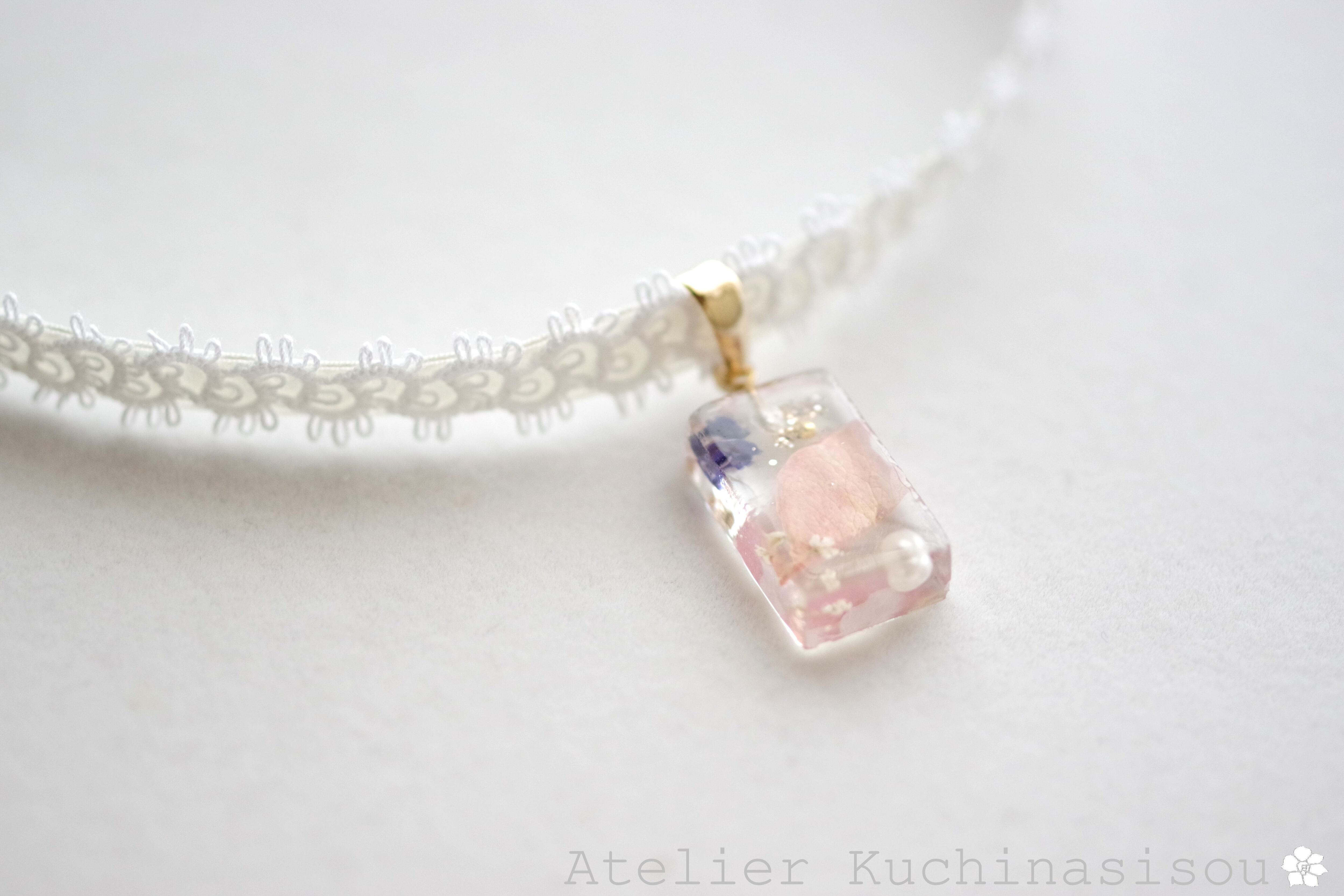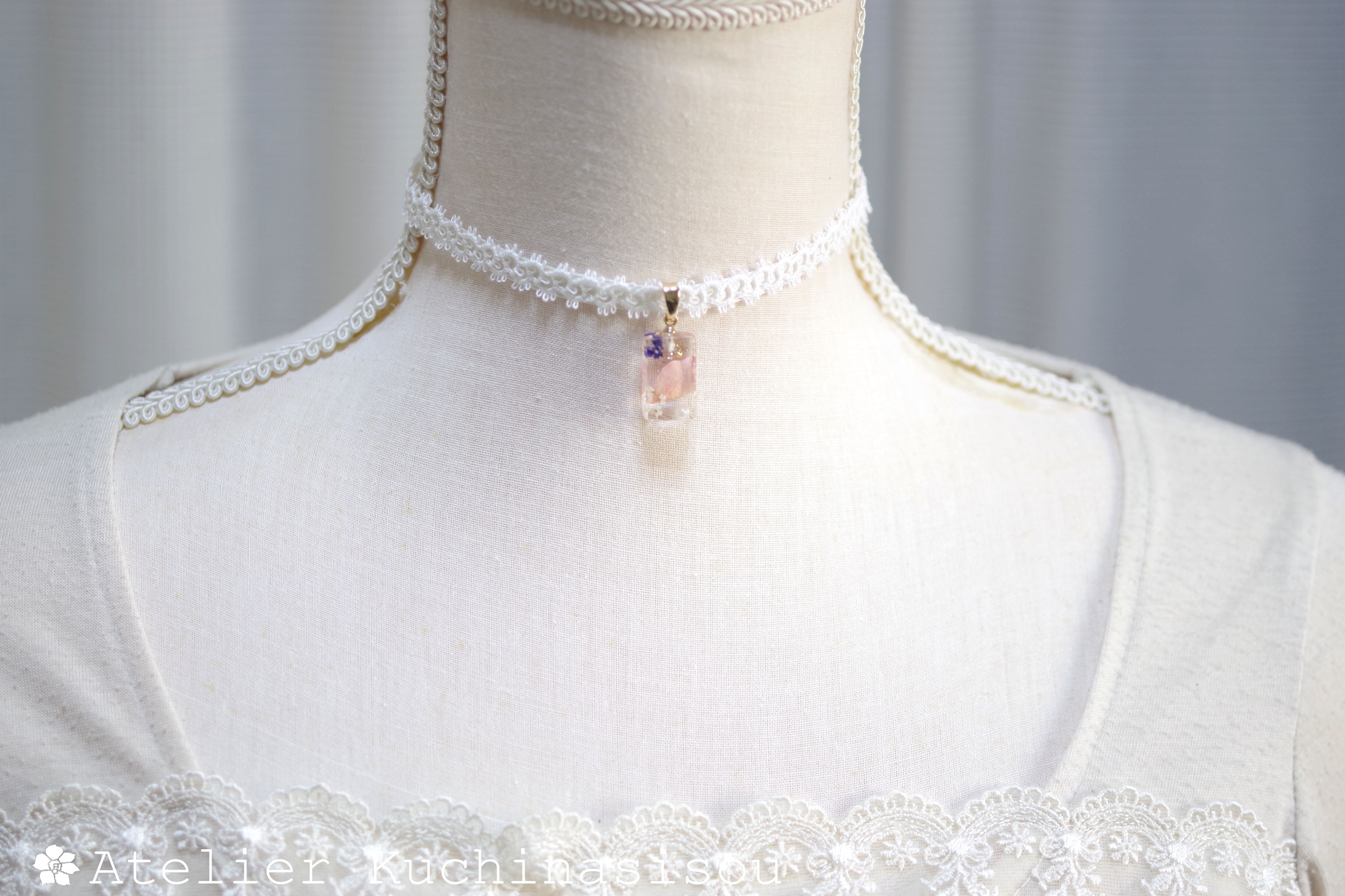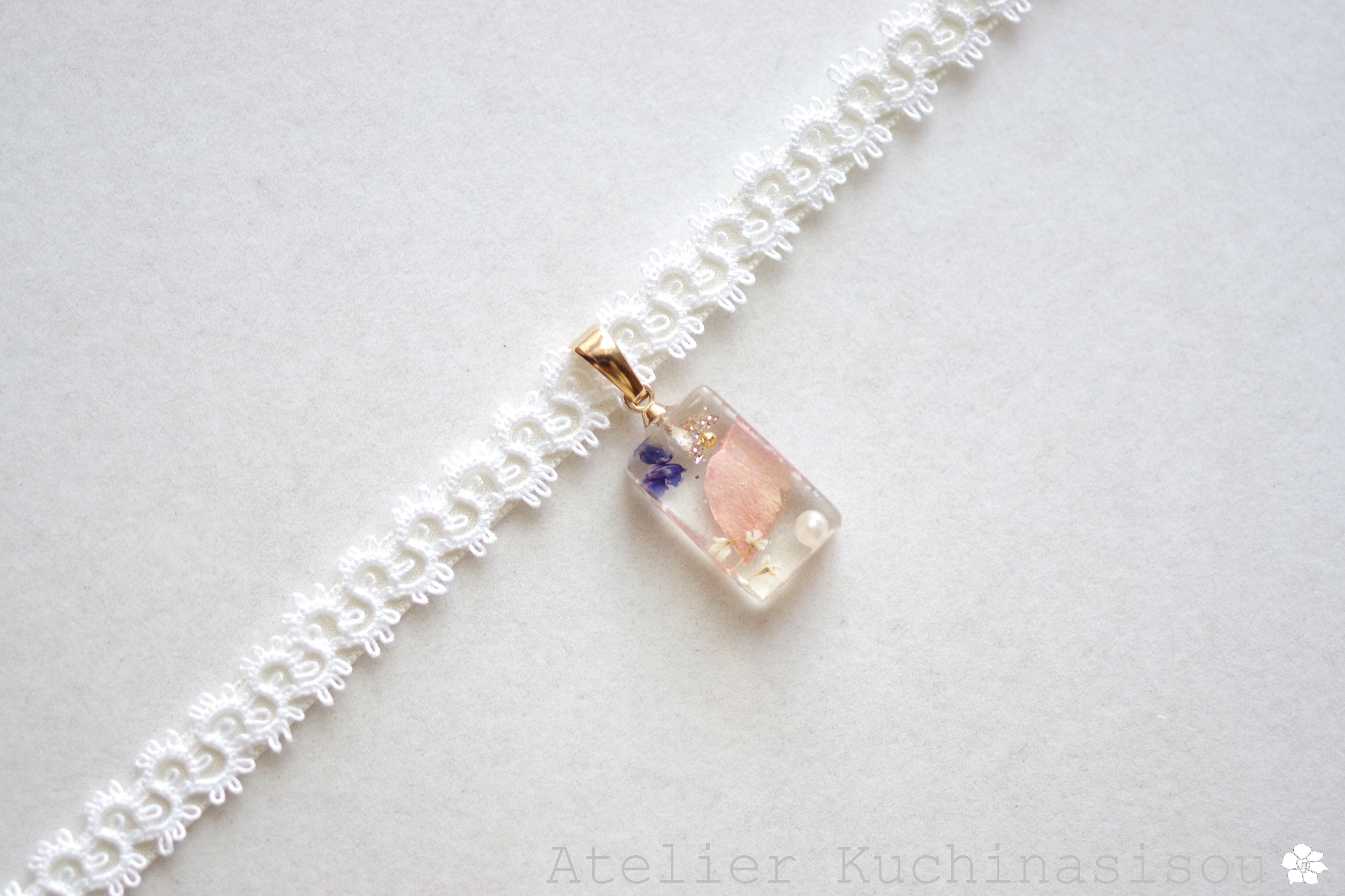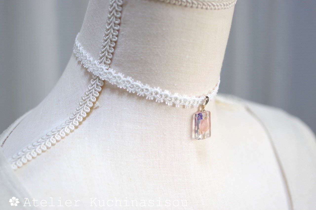 【受注製作】レジンアート 長方形モチーフとタティングレースとサテンリボンのチョーカー〈花びらの行方〉