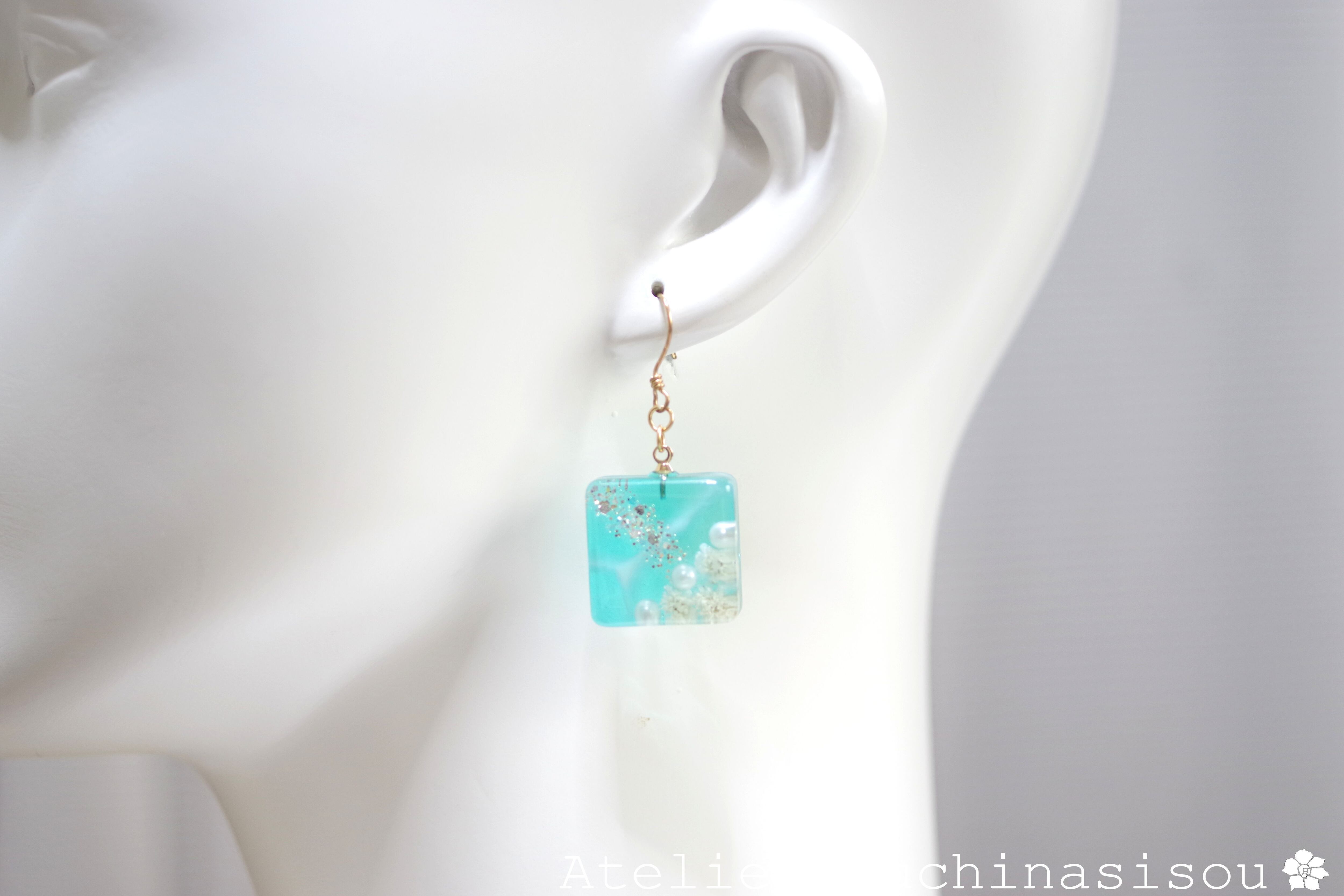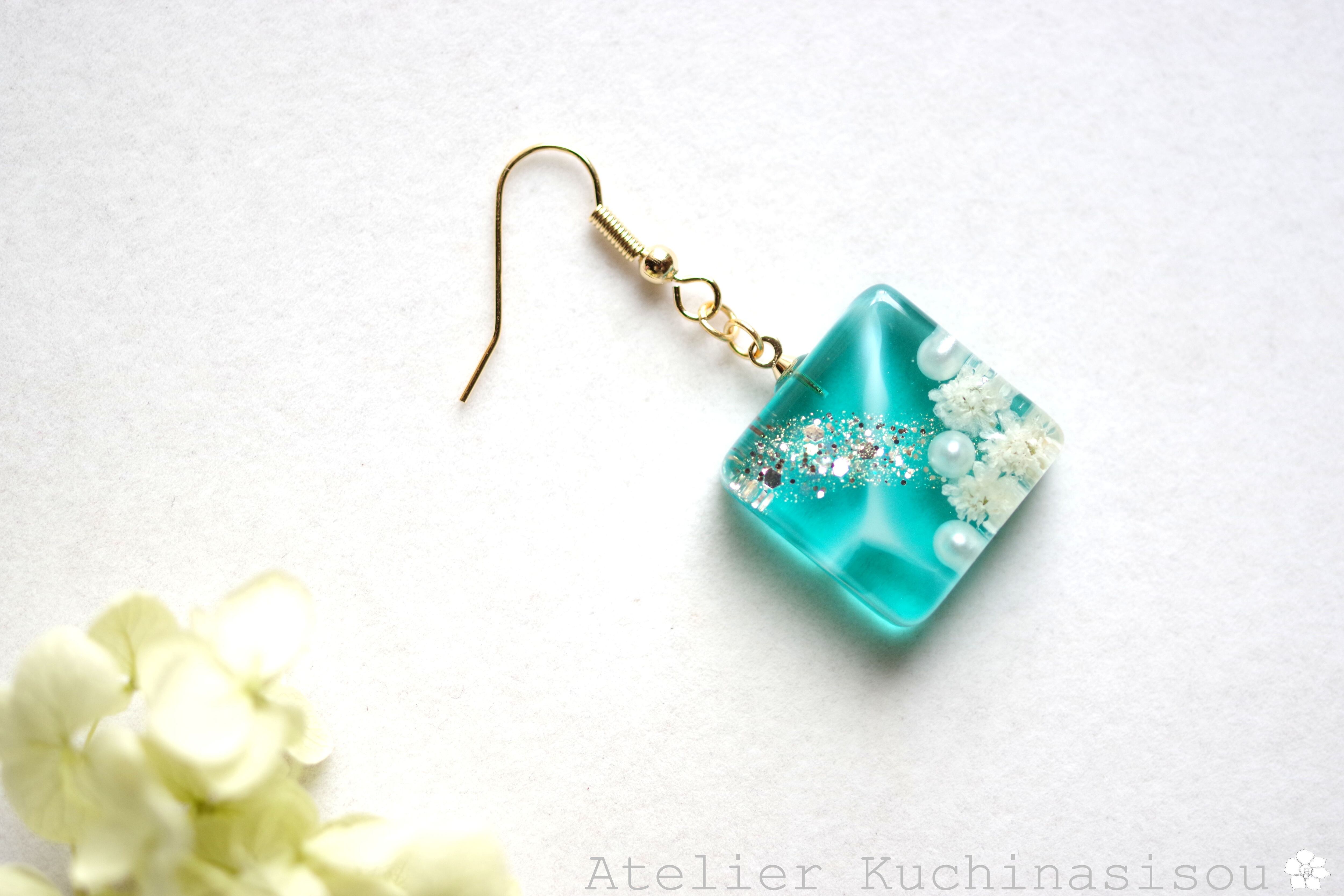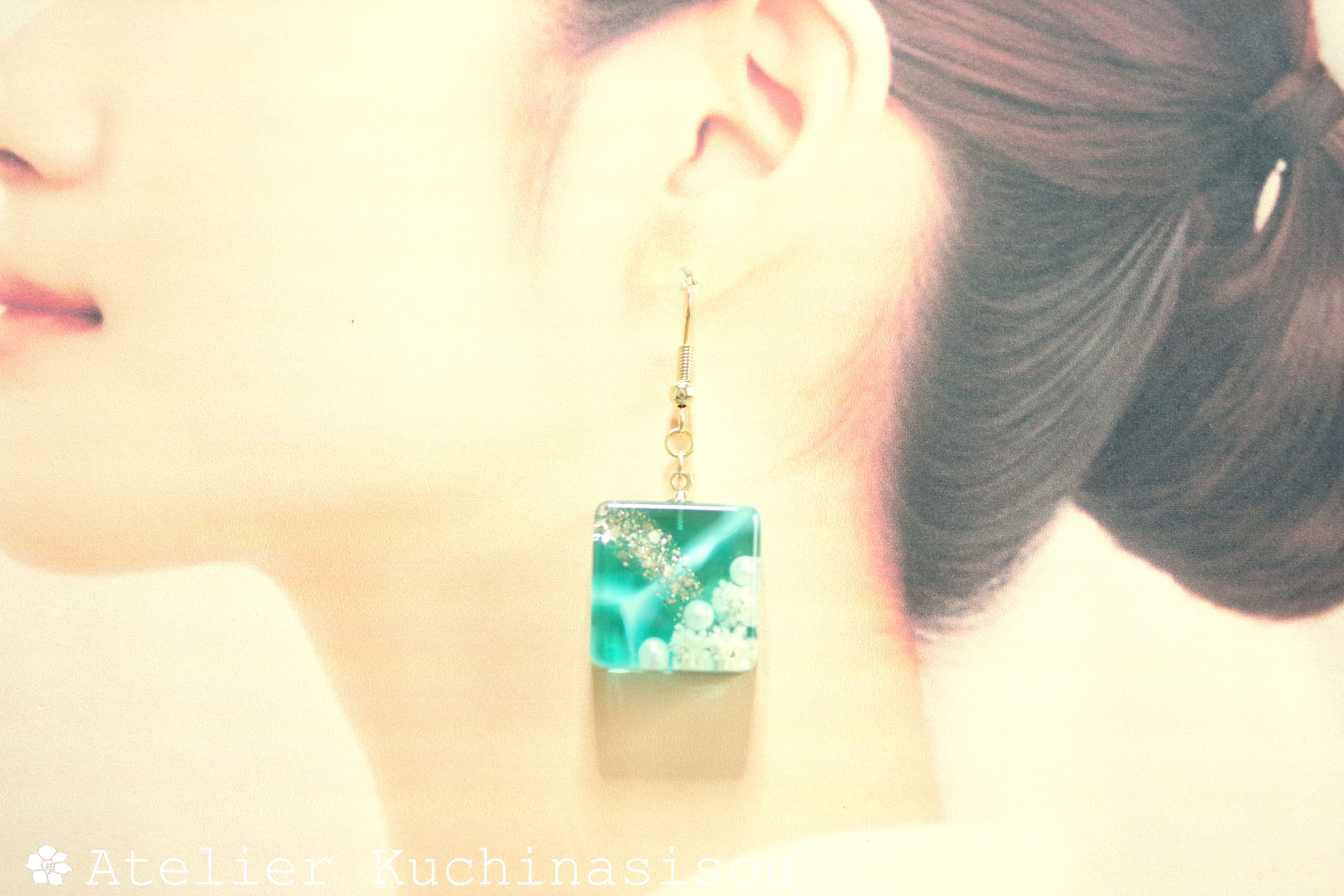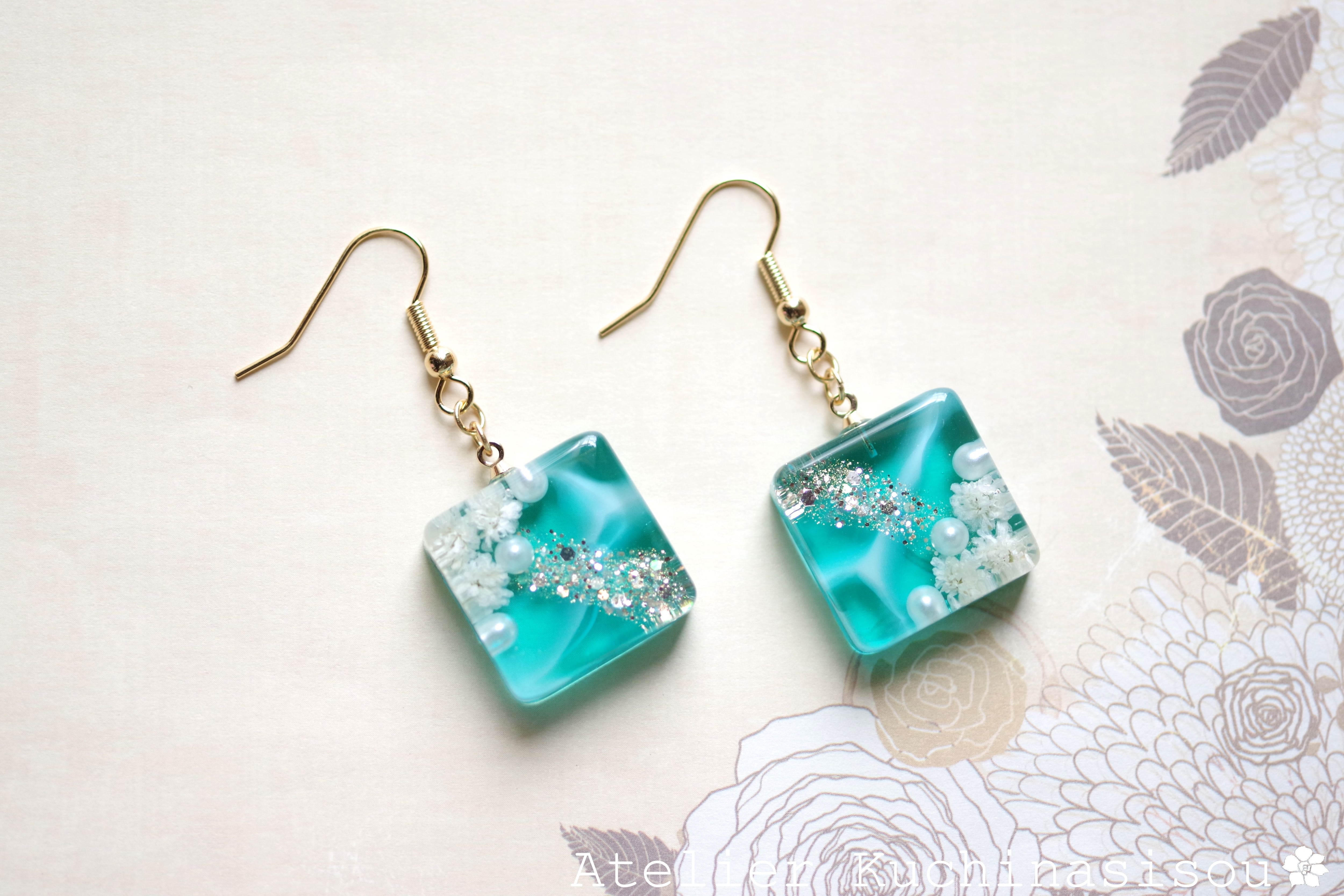 爽やかなグリーンの背景にお花やパールを配置し、ラメと白いラインを置いたデザインが上品なピアス。