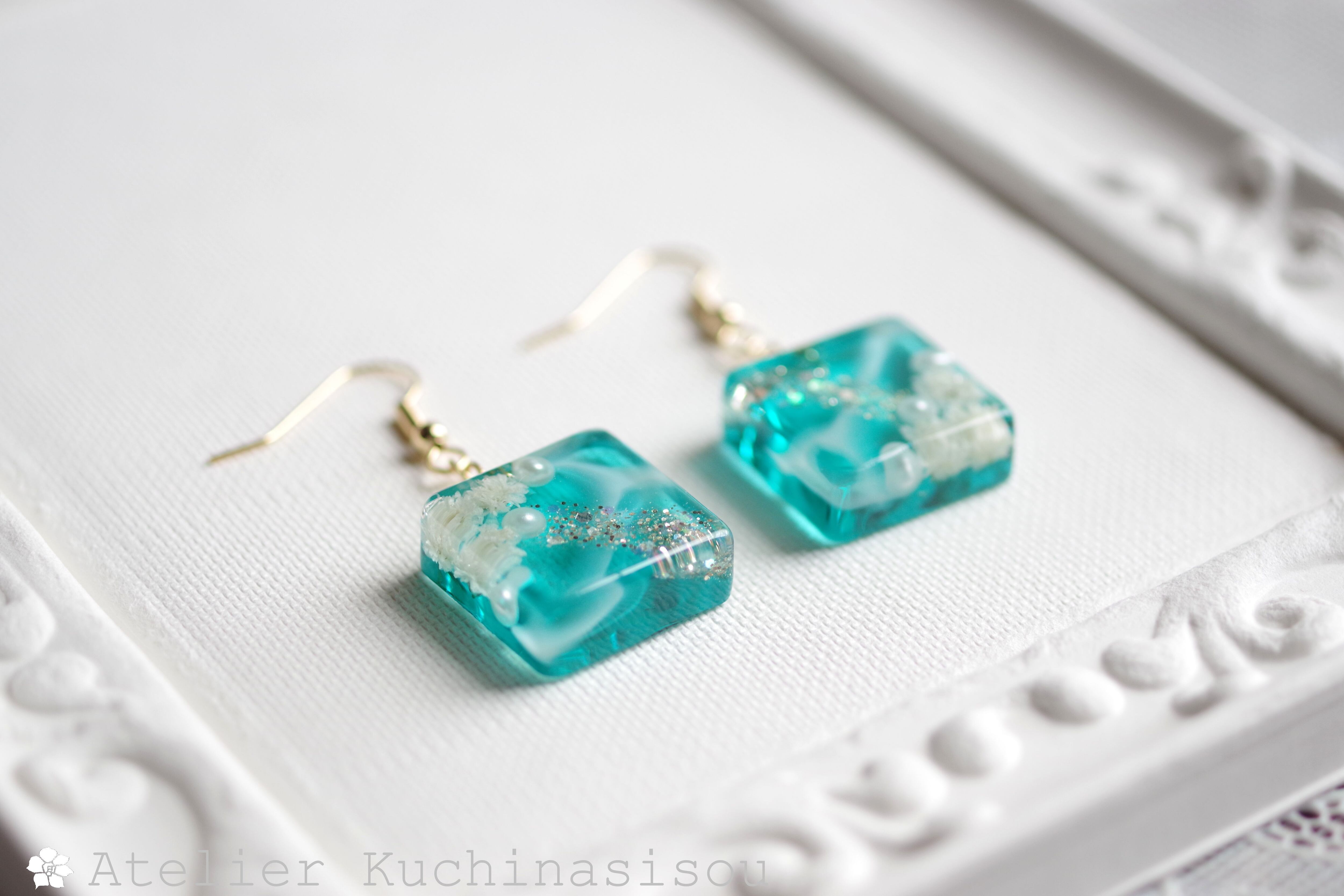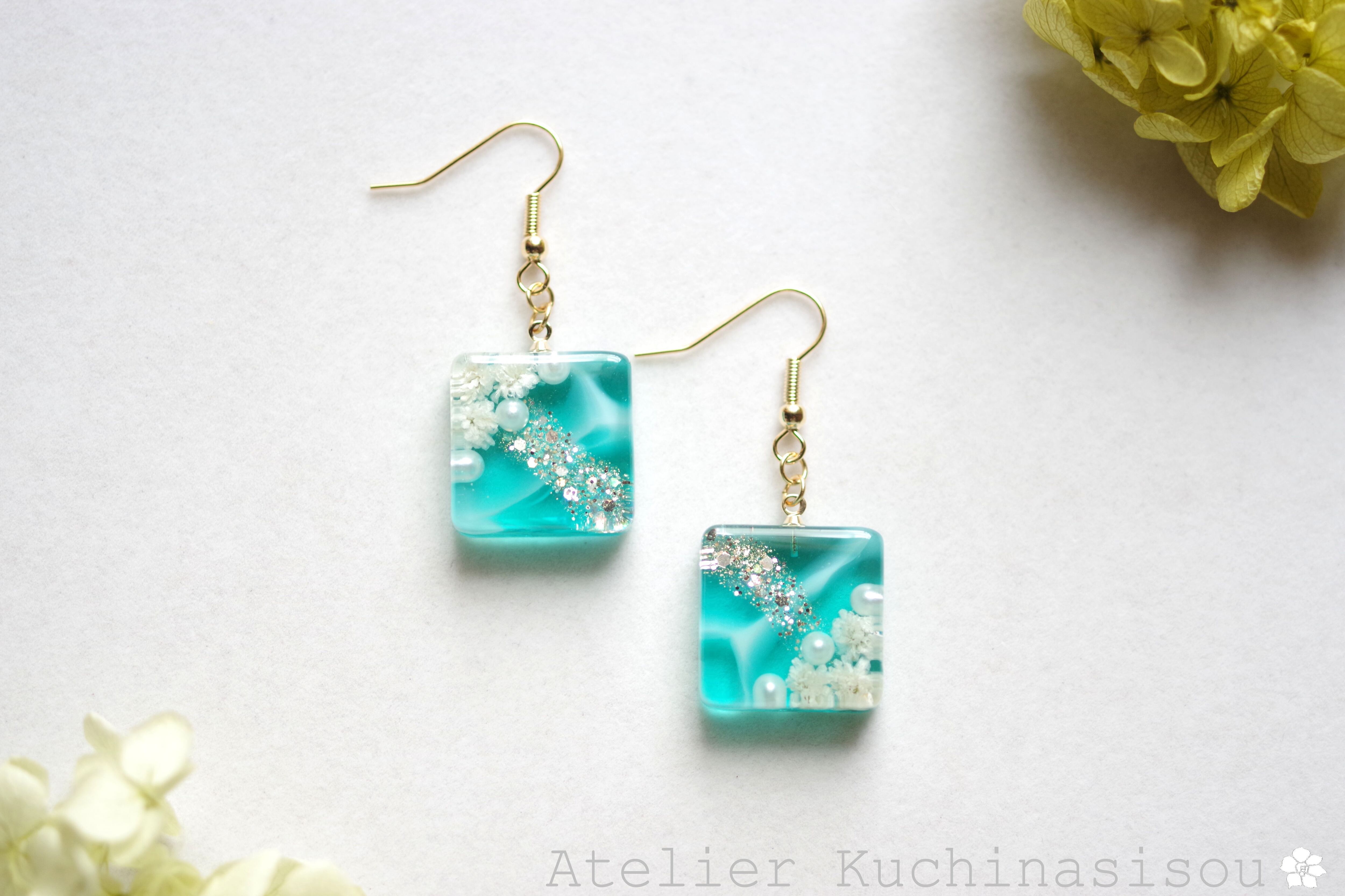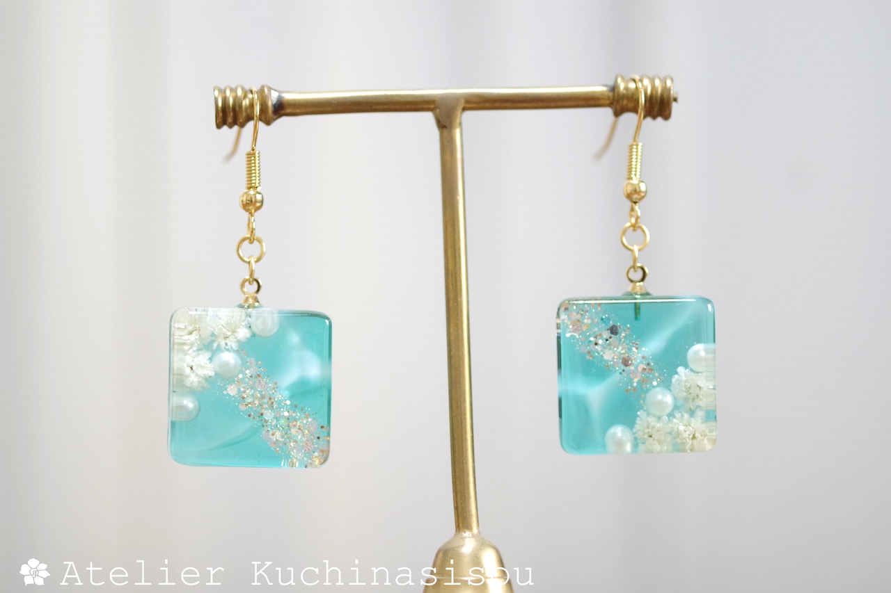 爽やかなグリーンの背景にお花やパールを配置し、ラメと白いラインを置いたデザインが上品なピアス。