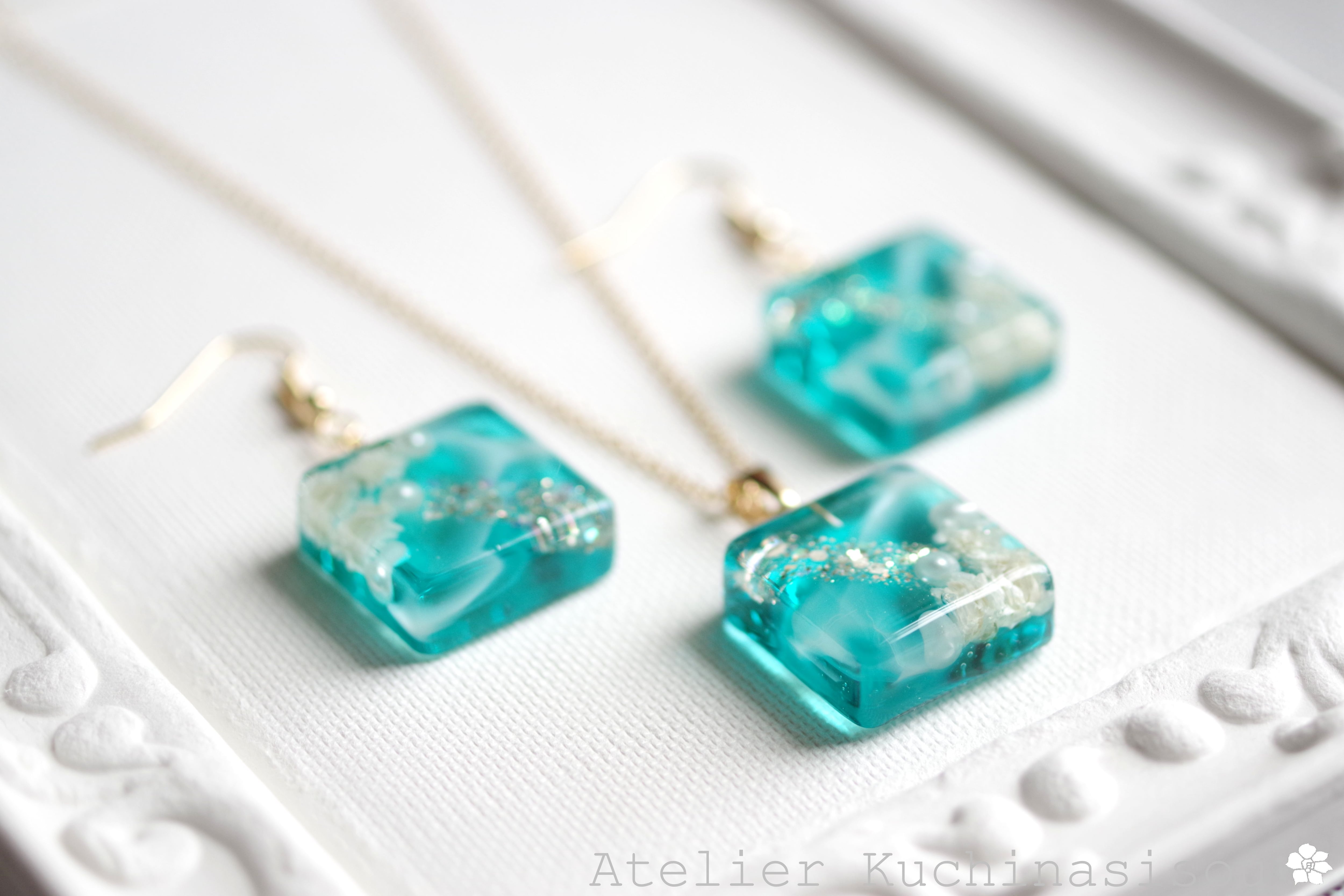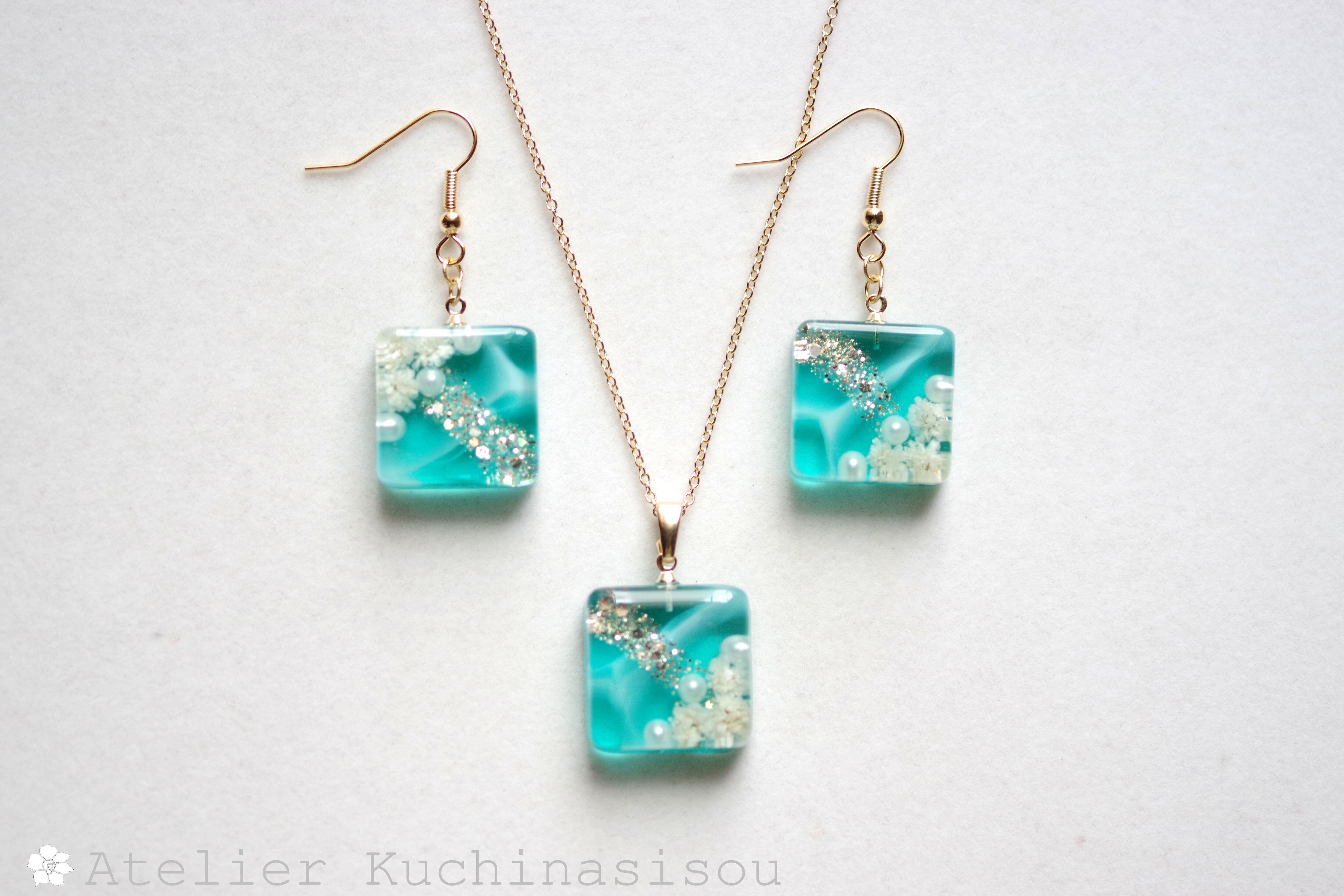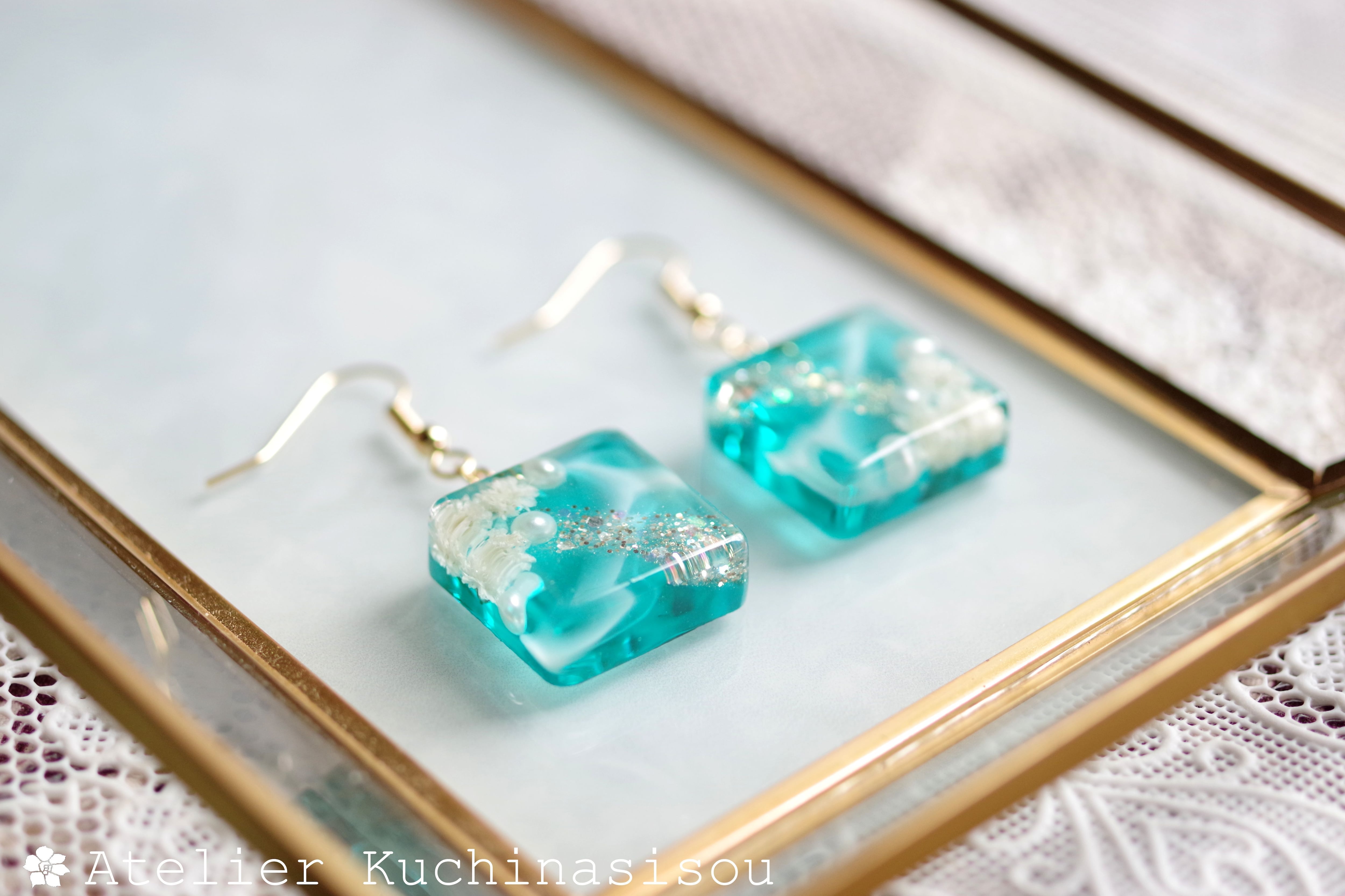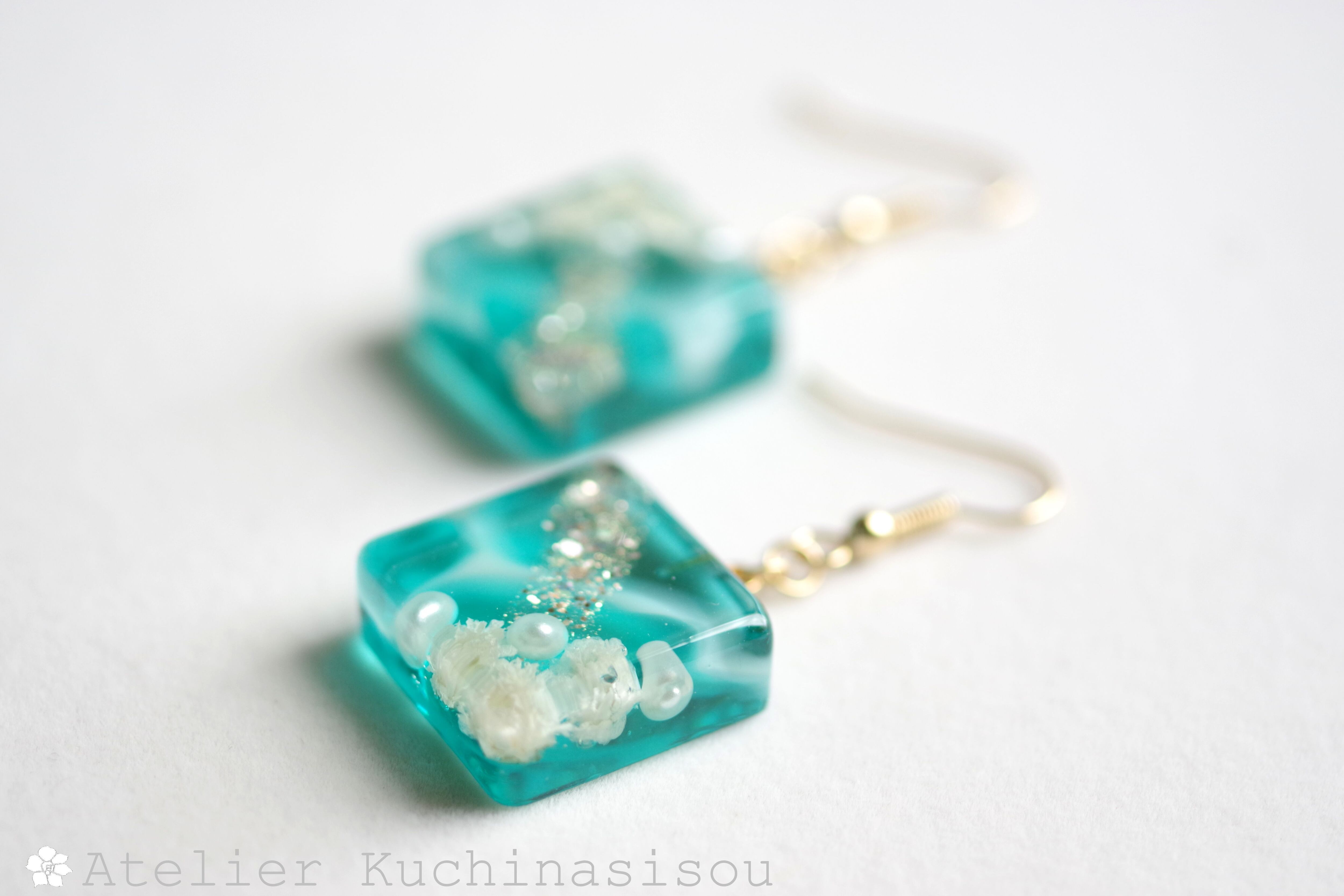 爽やかなグリーンの背景にお花やパールを配置し、ラメと白いラインを置いたデザインが上品なピアス。
