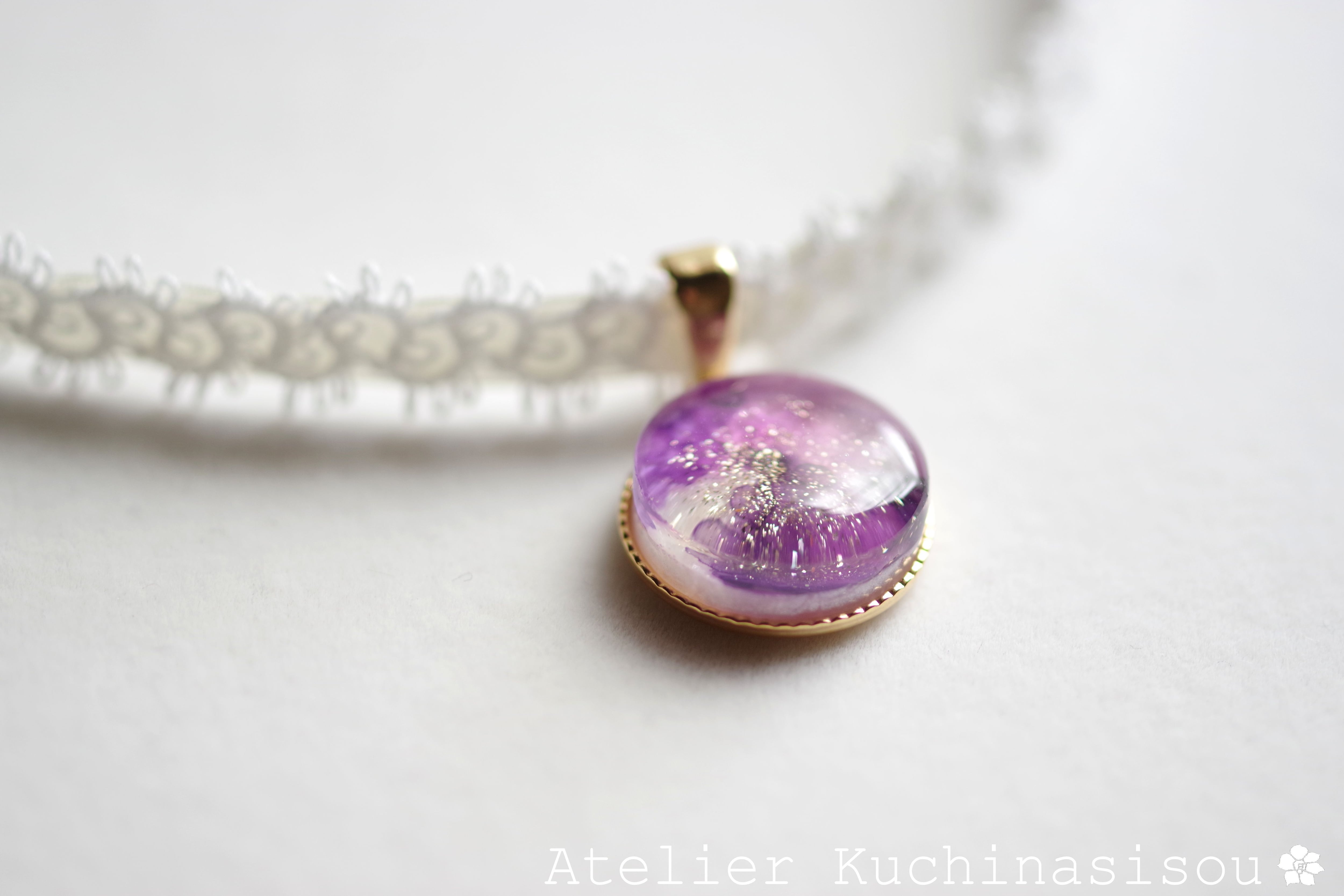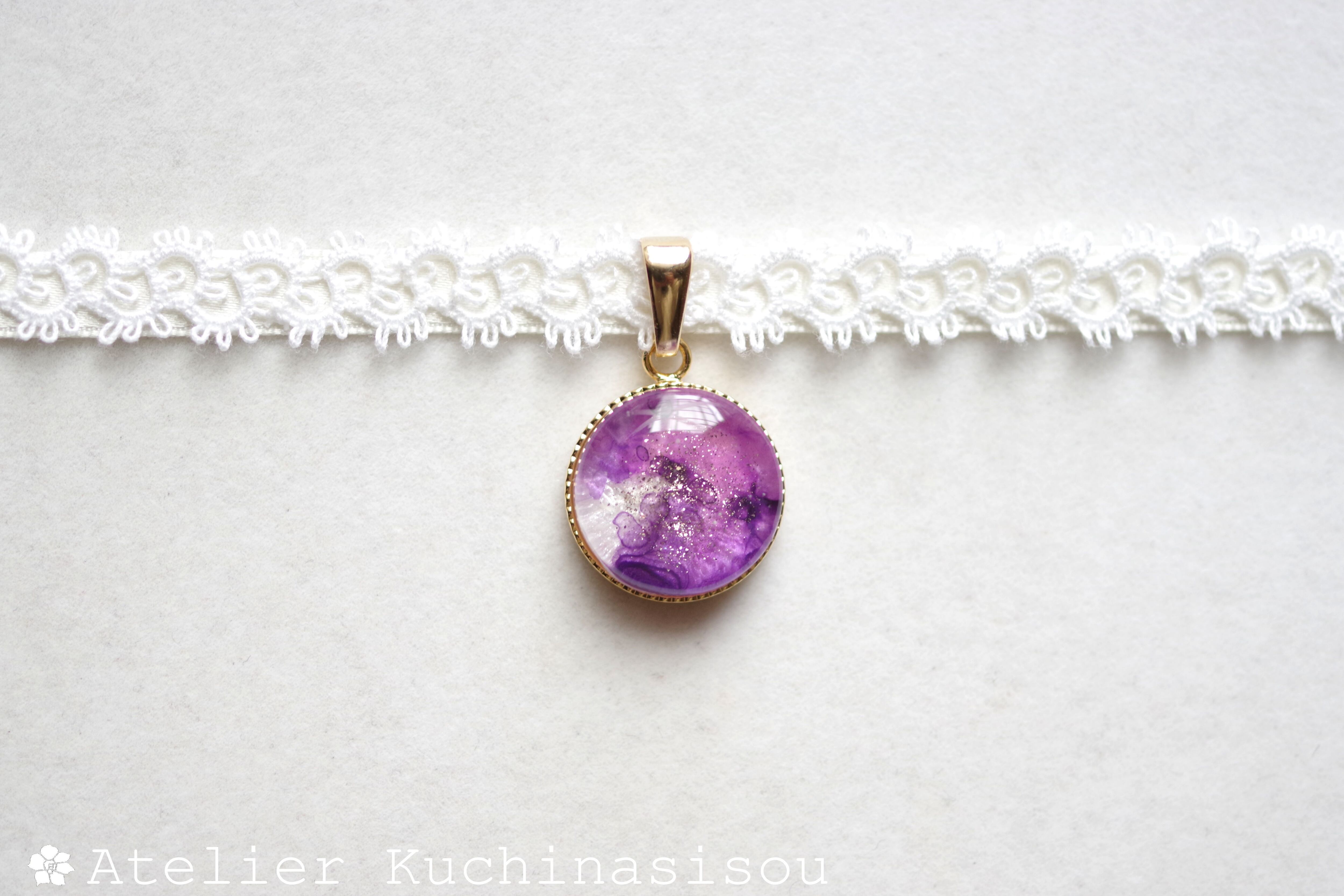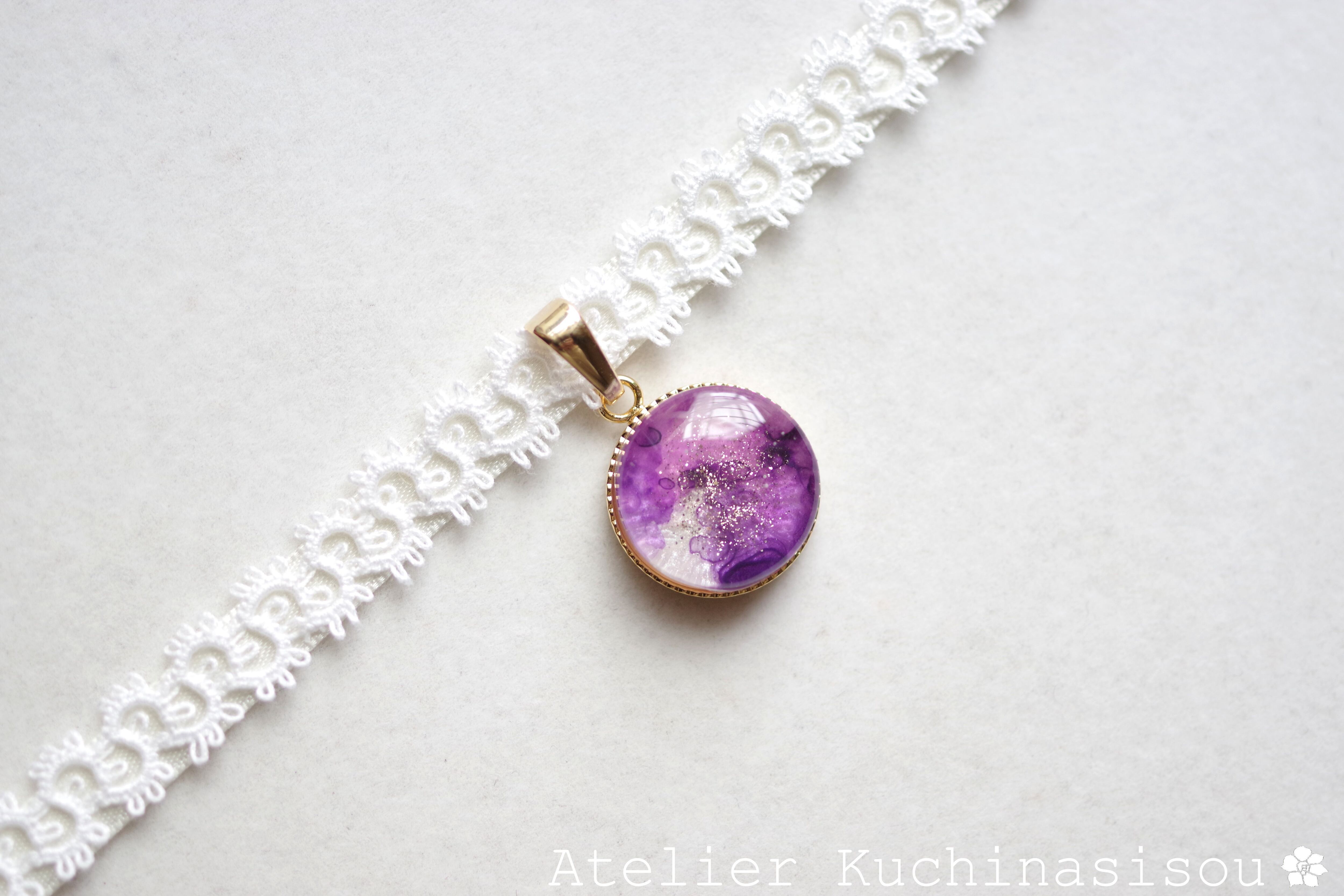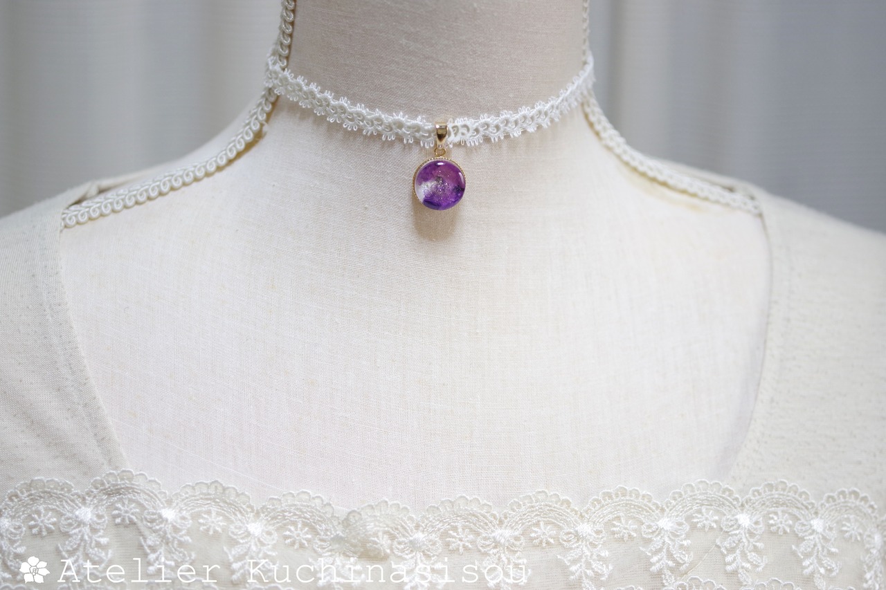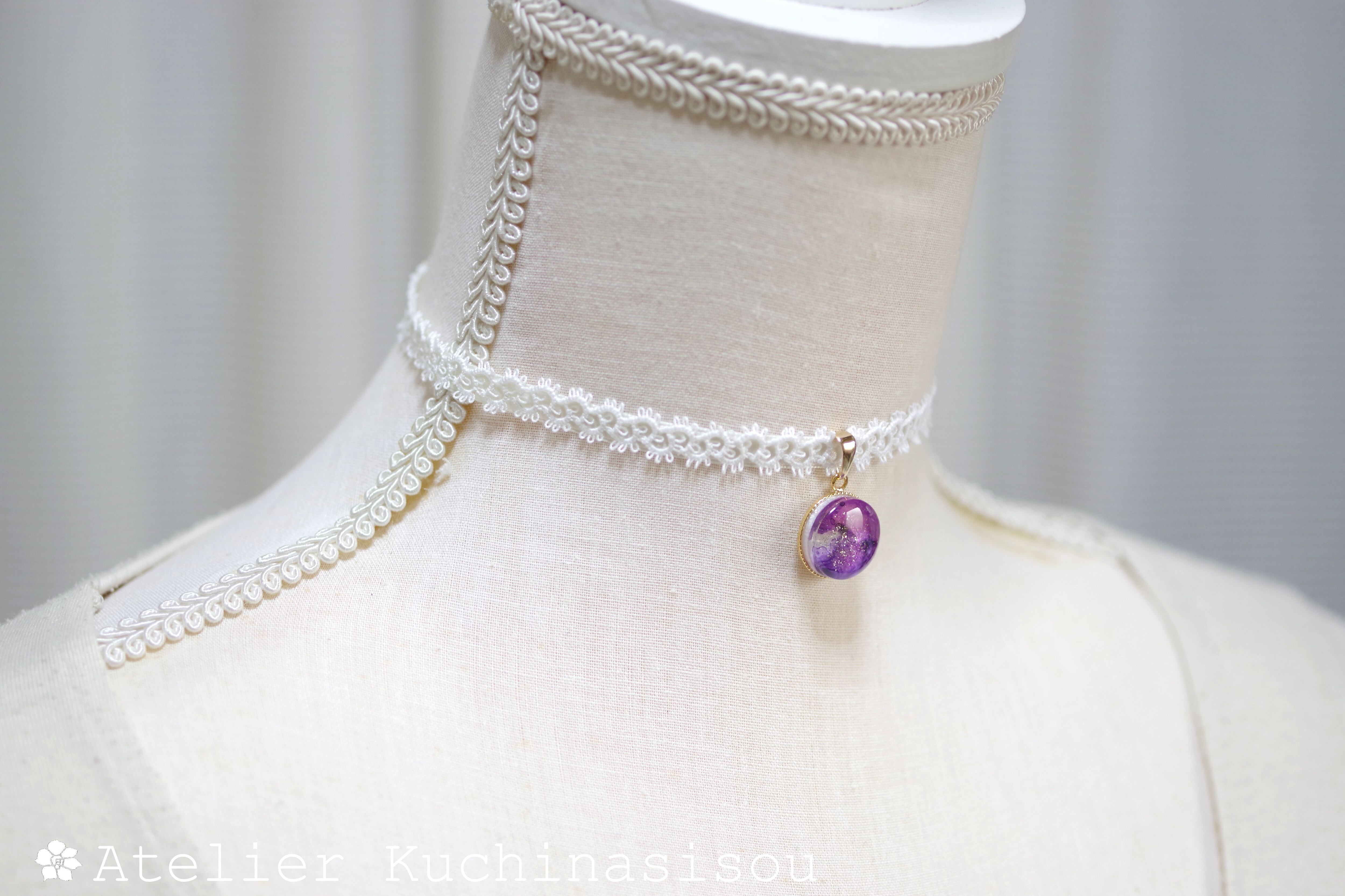 パールホワイトに二種類の紫色を置いた淑やかで上品なレジンを、サテンリボンにタティングレースで装飾を施したチョーカーに仕上げました。