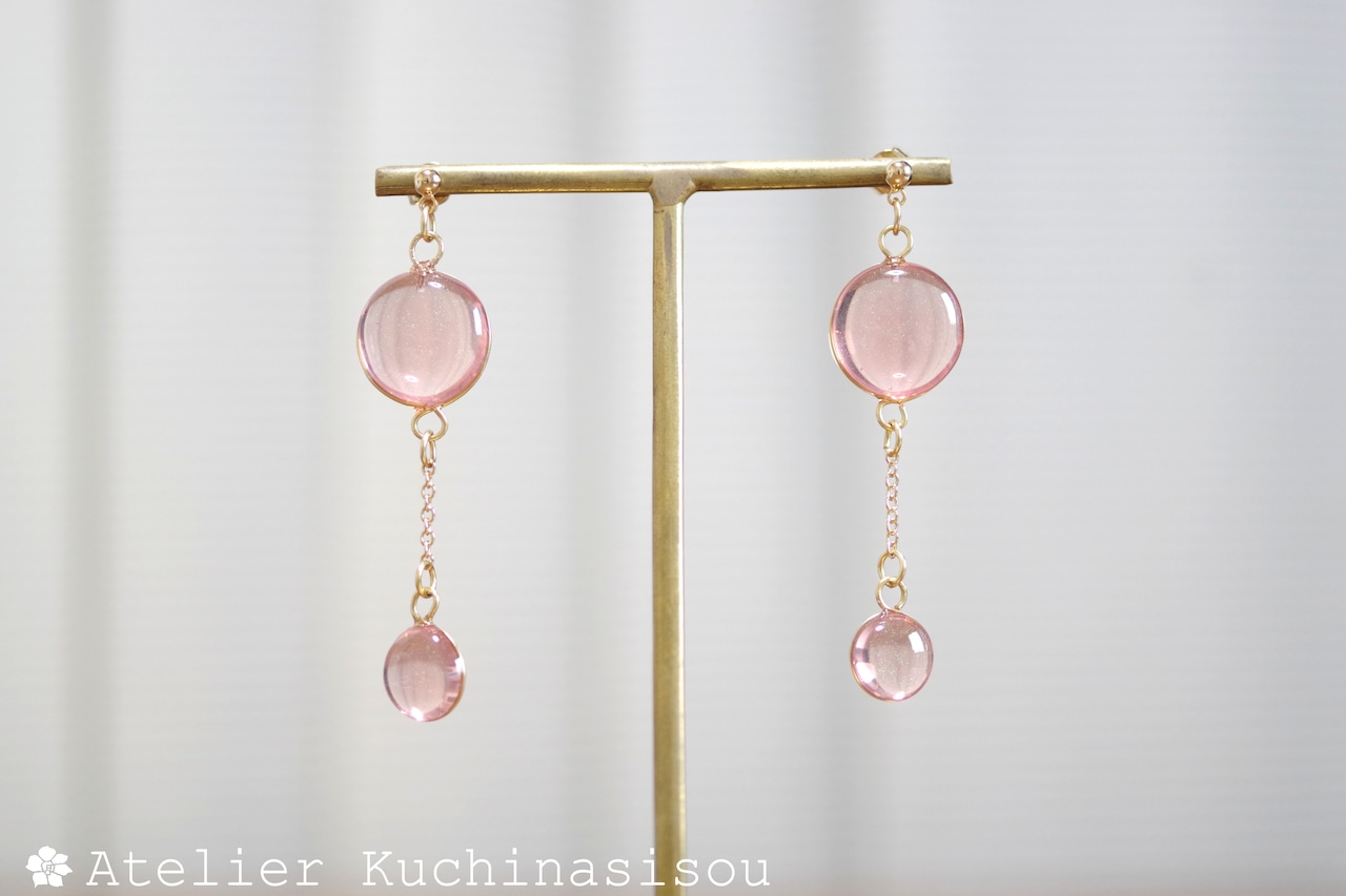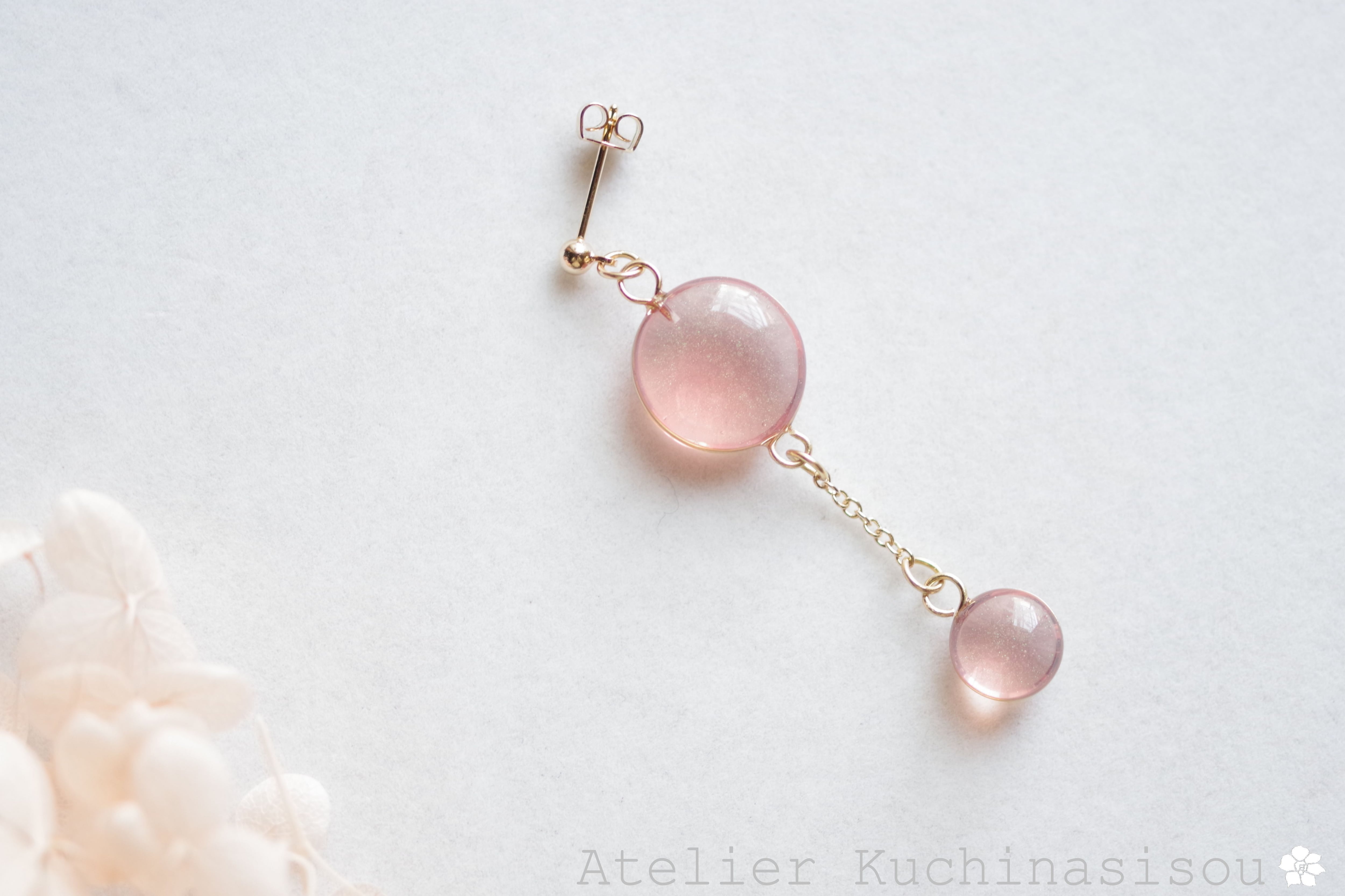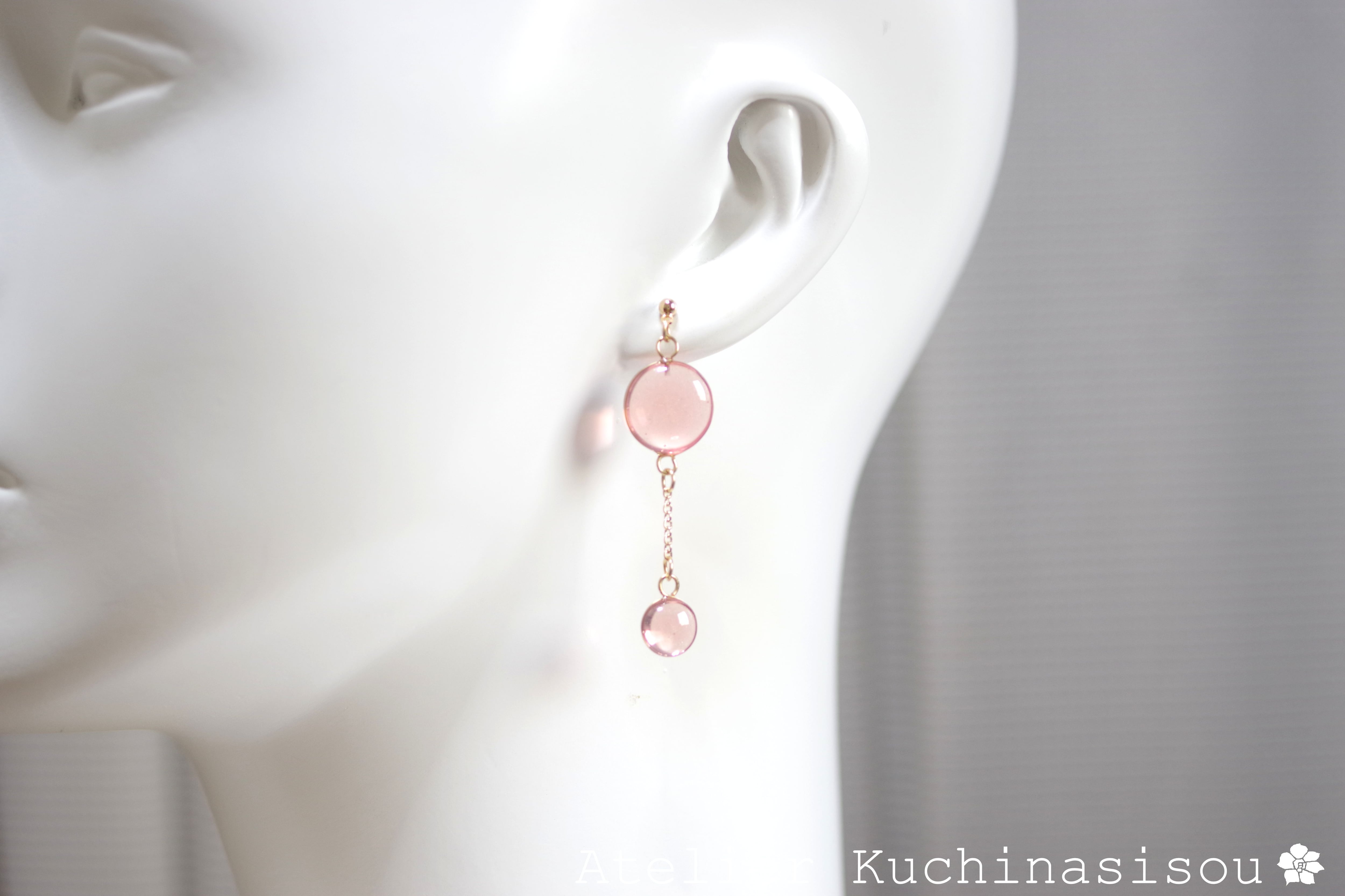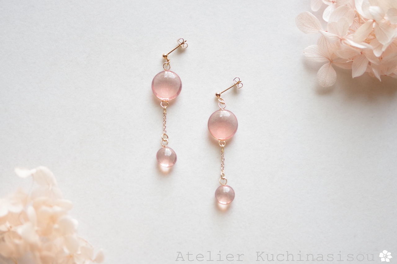 ぷっくり張りつめた大小の水滴のようなレジンの透明感に魅入ってしまうピアス。