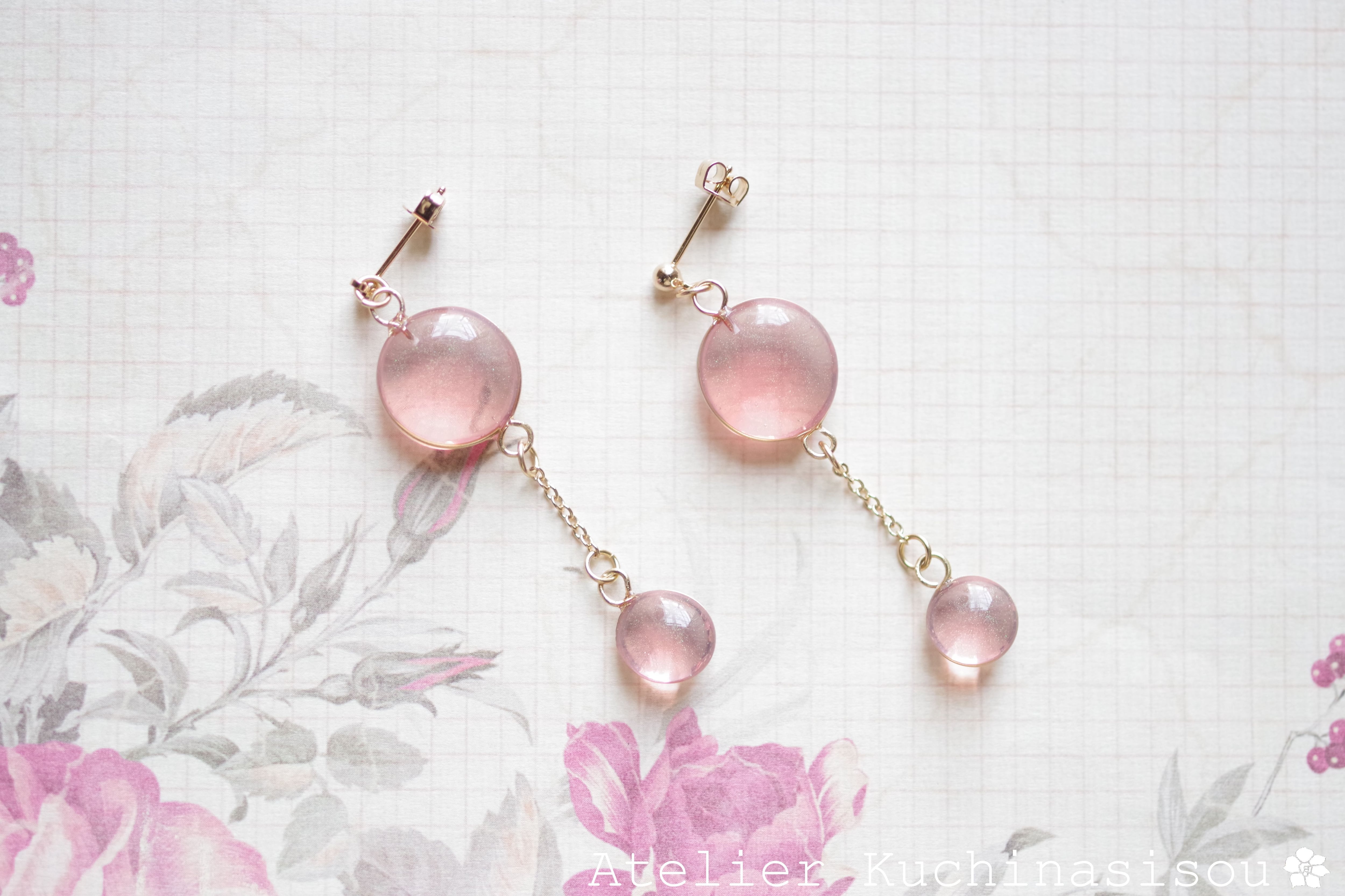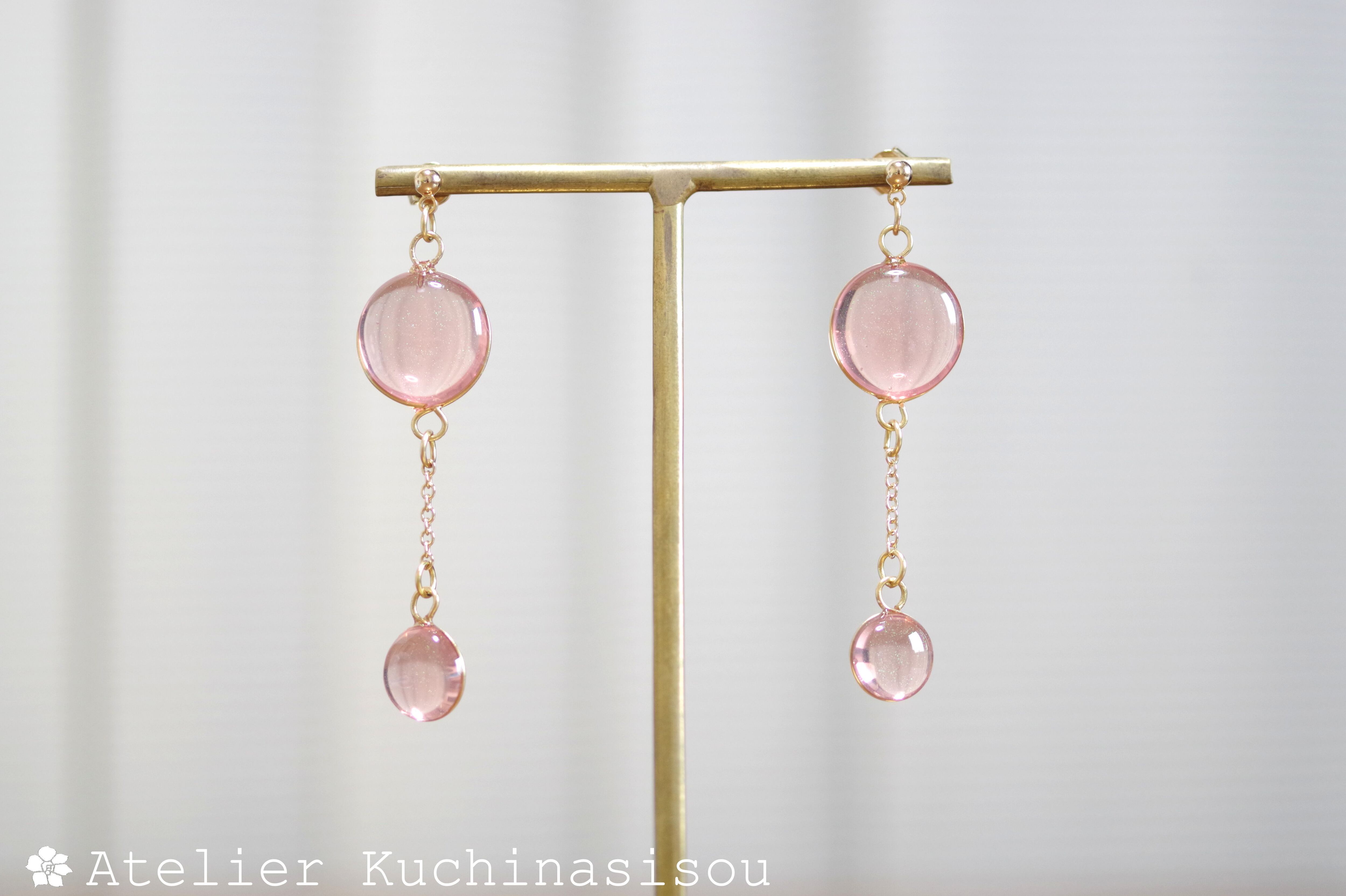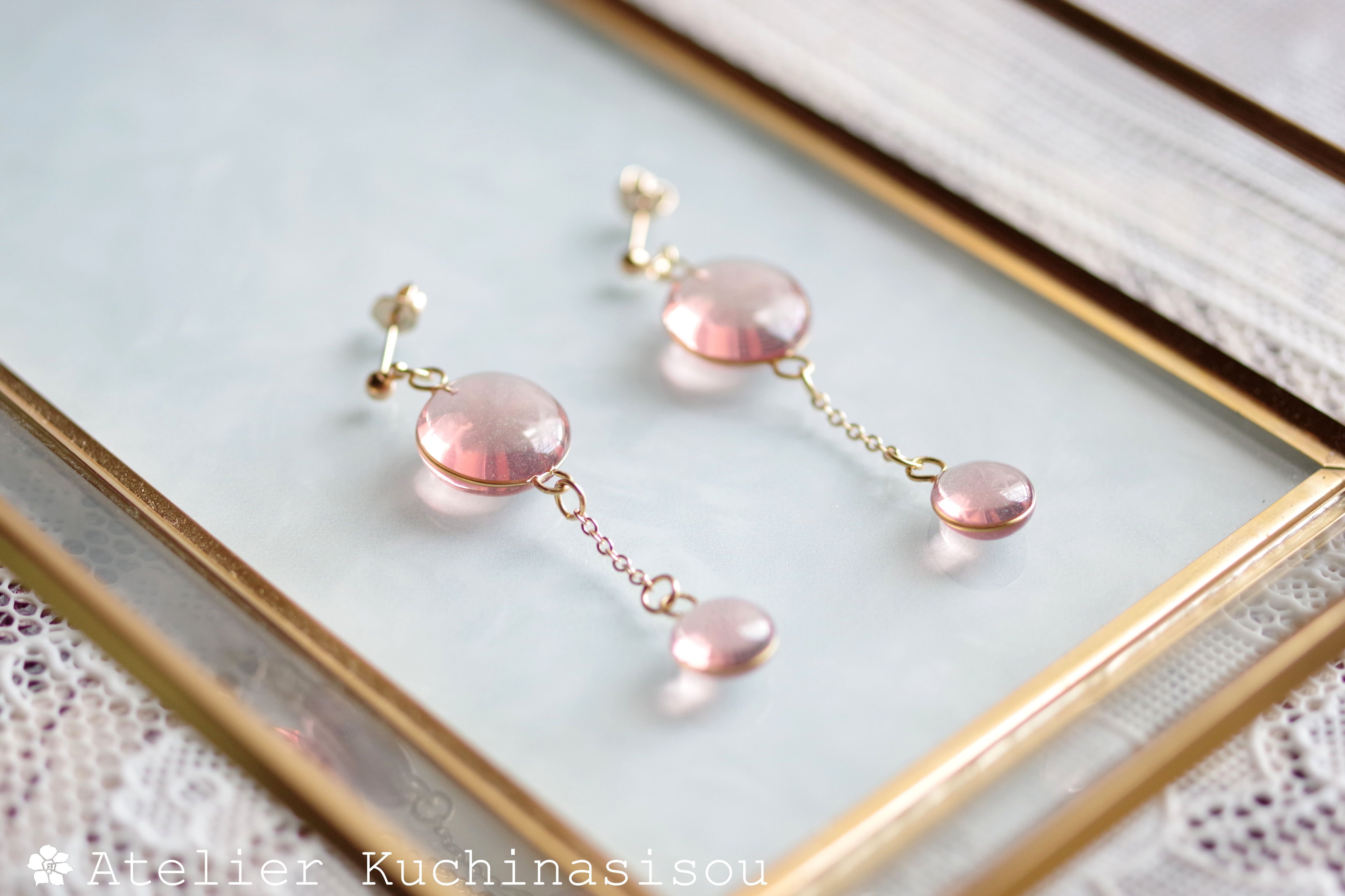 ぷっくり張りつめた大小の水滴のようなレジンの透明感に魅入ってしまうピアス。