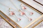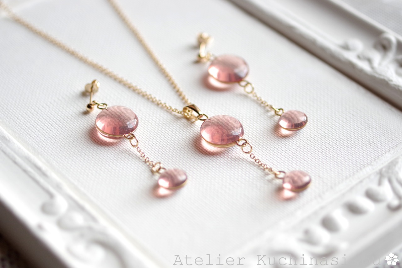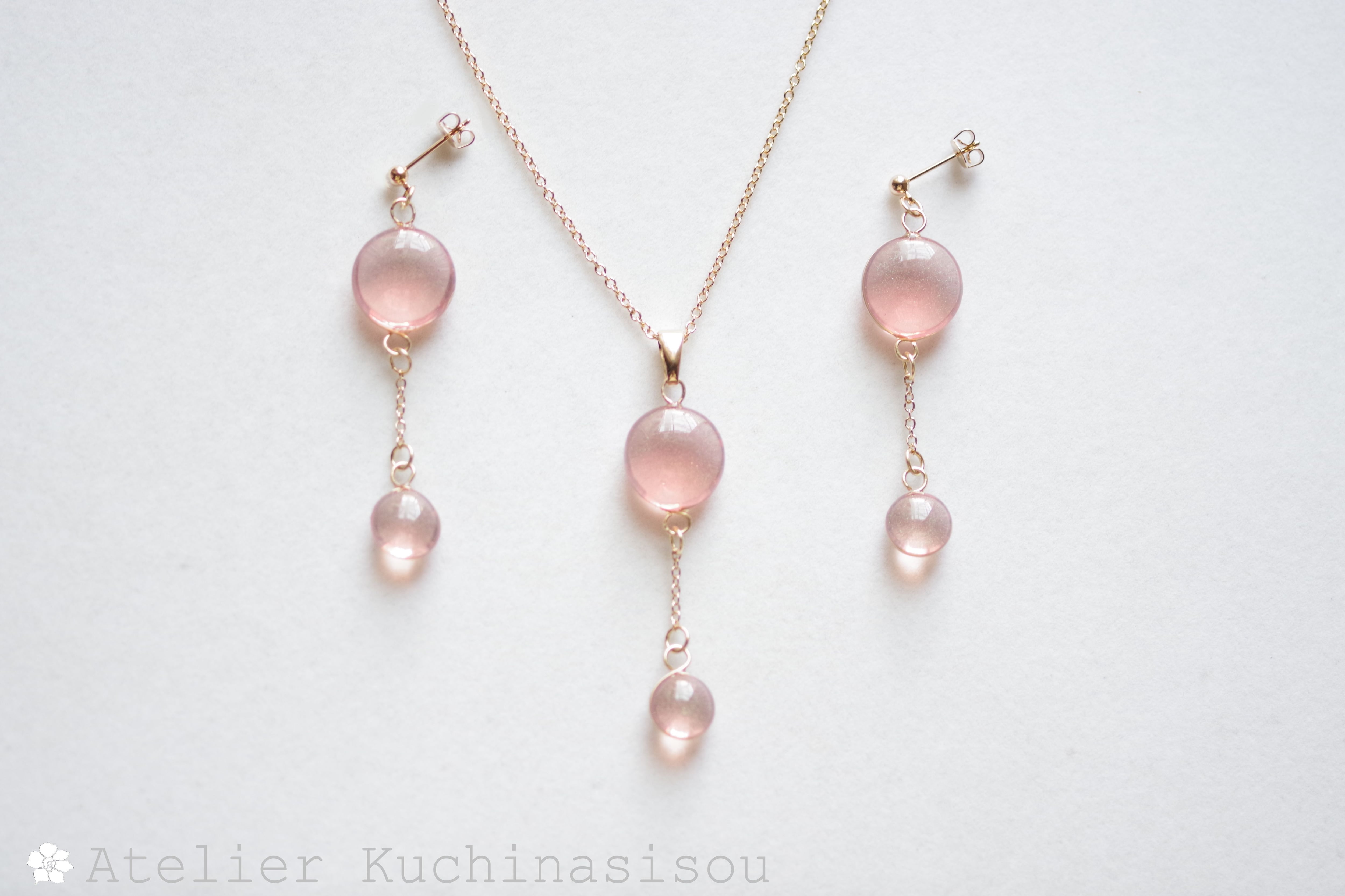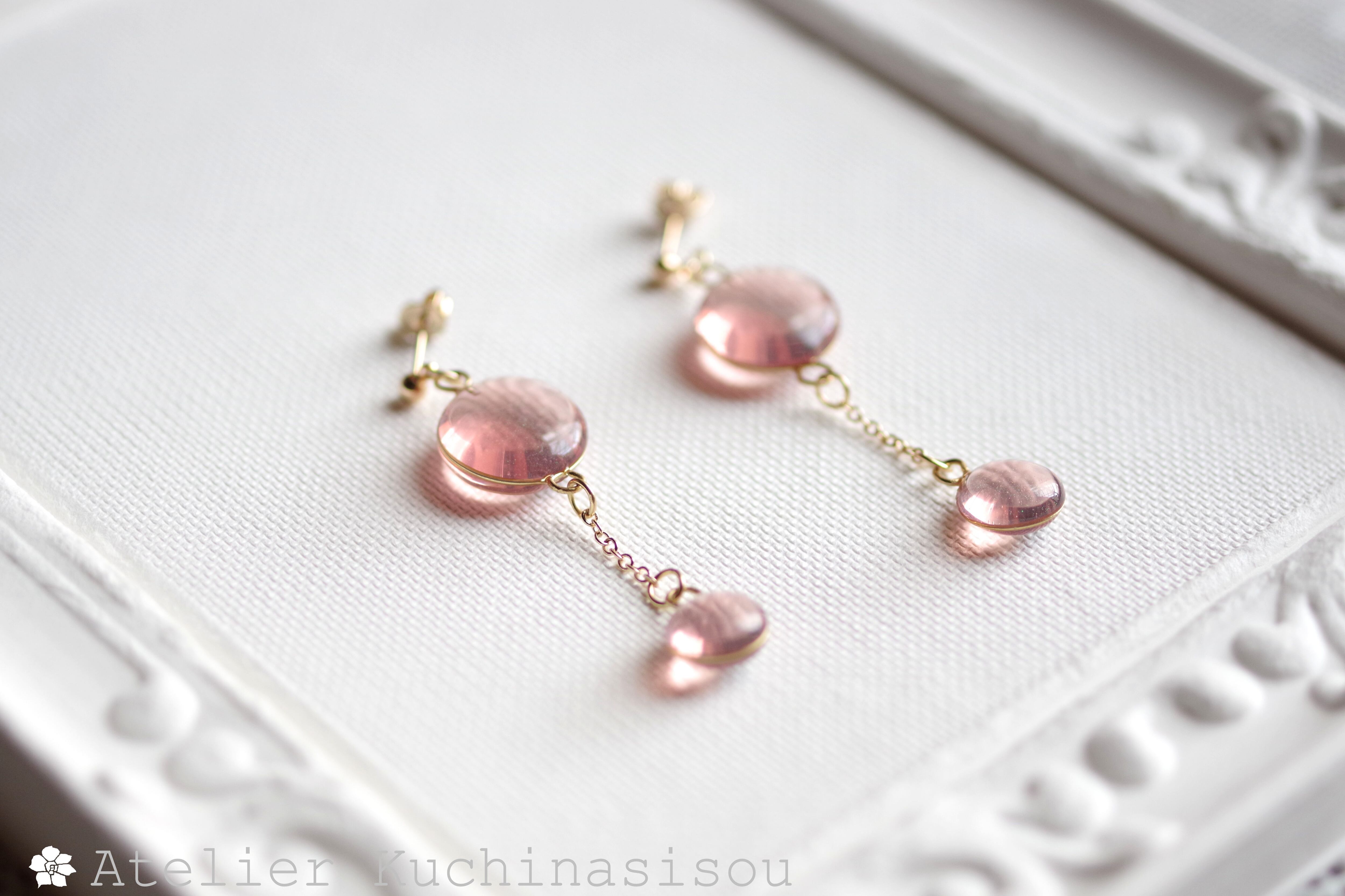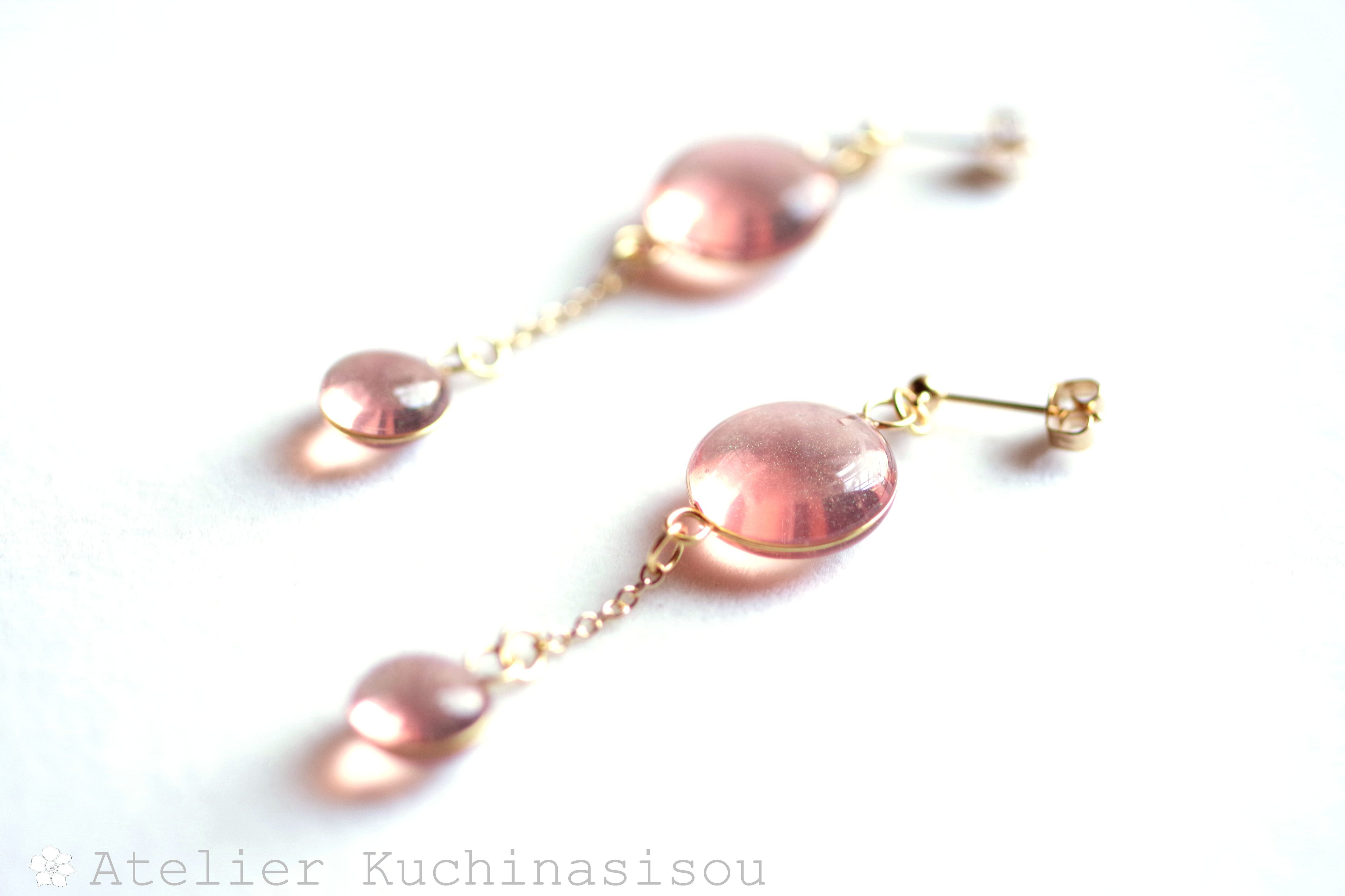 ぷっくり張りつめた大小の水滴のようなレジンの透明感に魅入ってしまうピアス。
