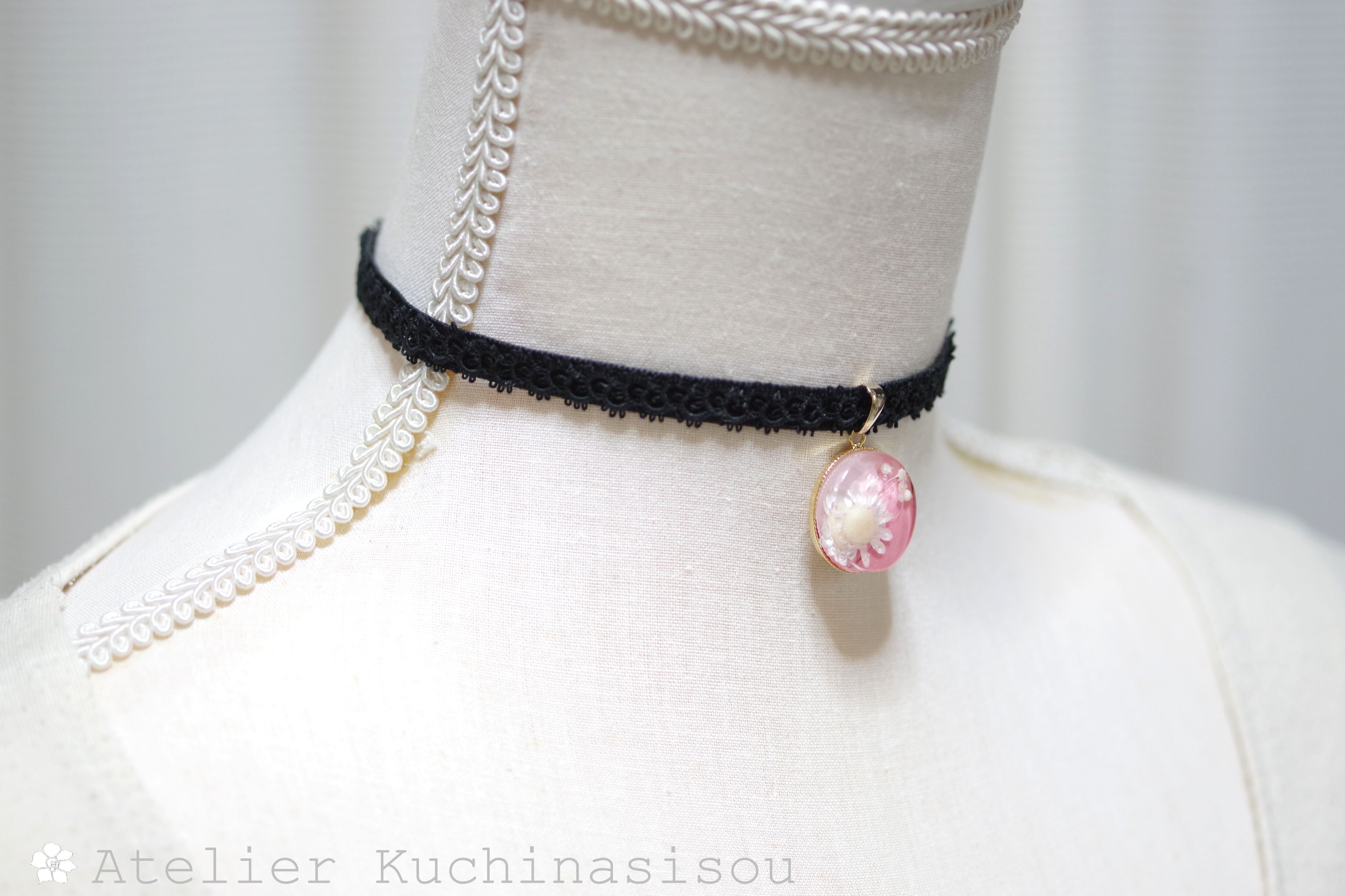 【受注製作】レジンアート ラウンドモチーフとタティングレースとベルベットリボンのチョーカー〈花の刻〉