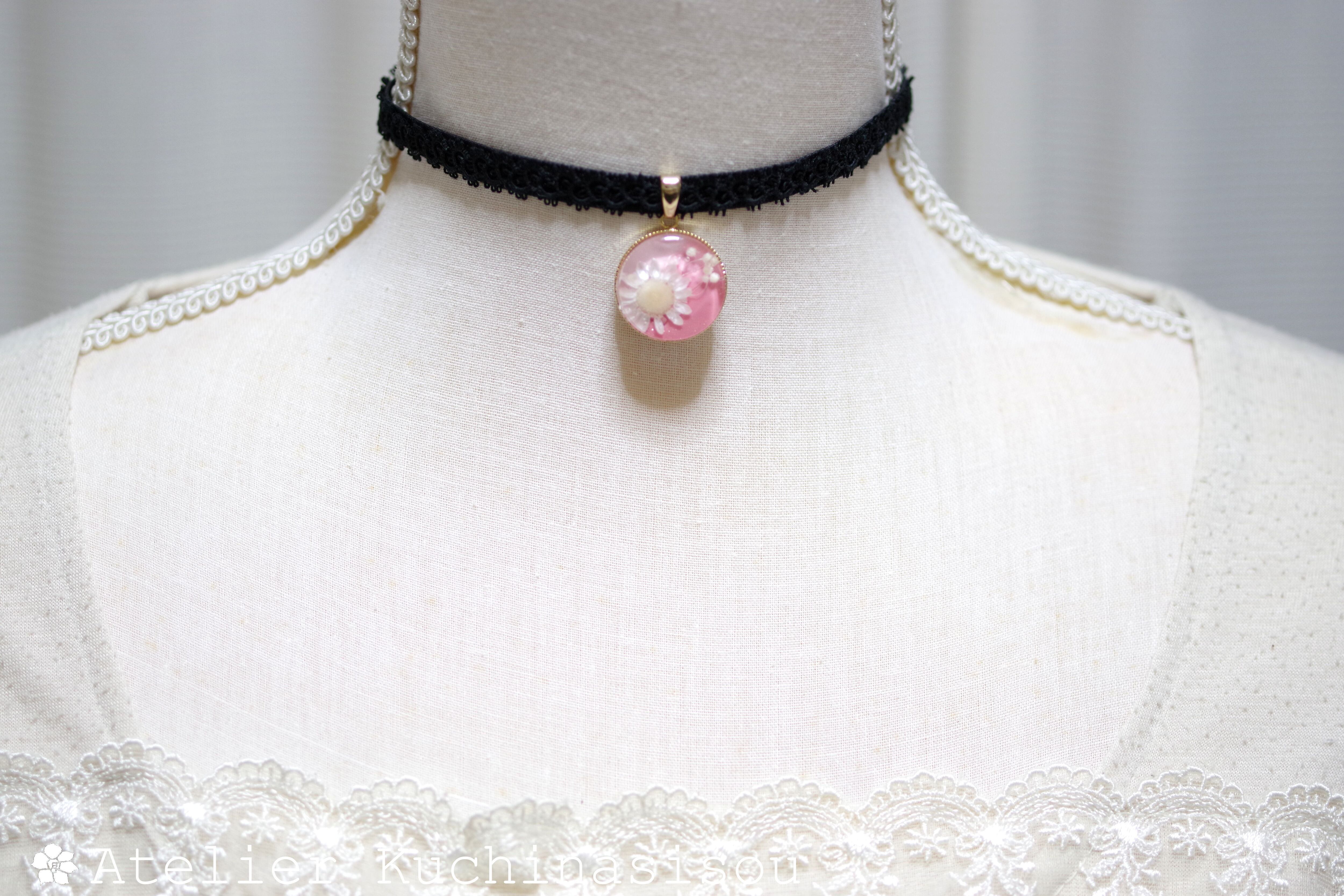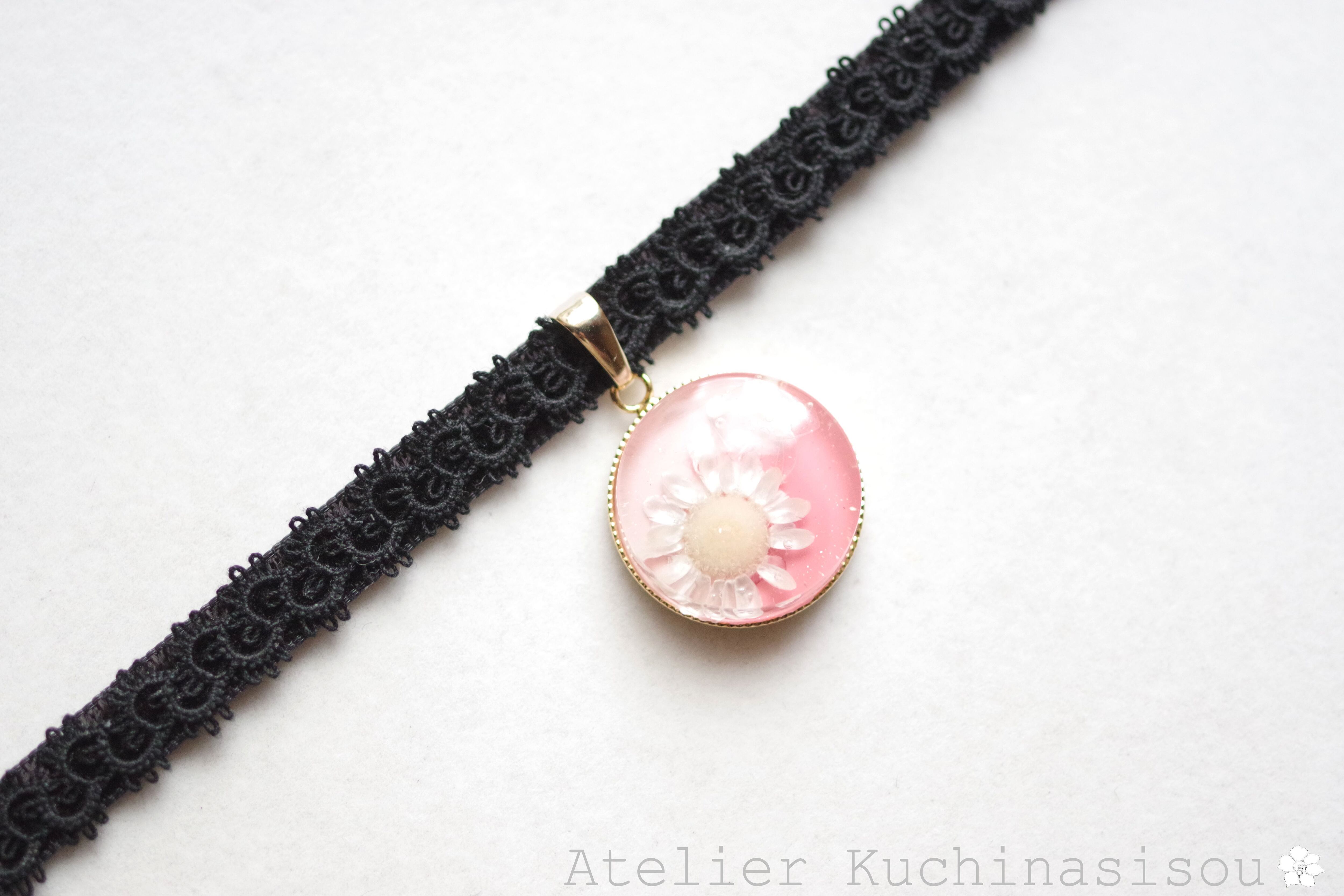 うららかなピンクのグラデーションを背景に一輪花を咲かせたレジンを、ベルベットリボンにタティングレースで装飾を施したチョーカーに仕上げました。