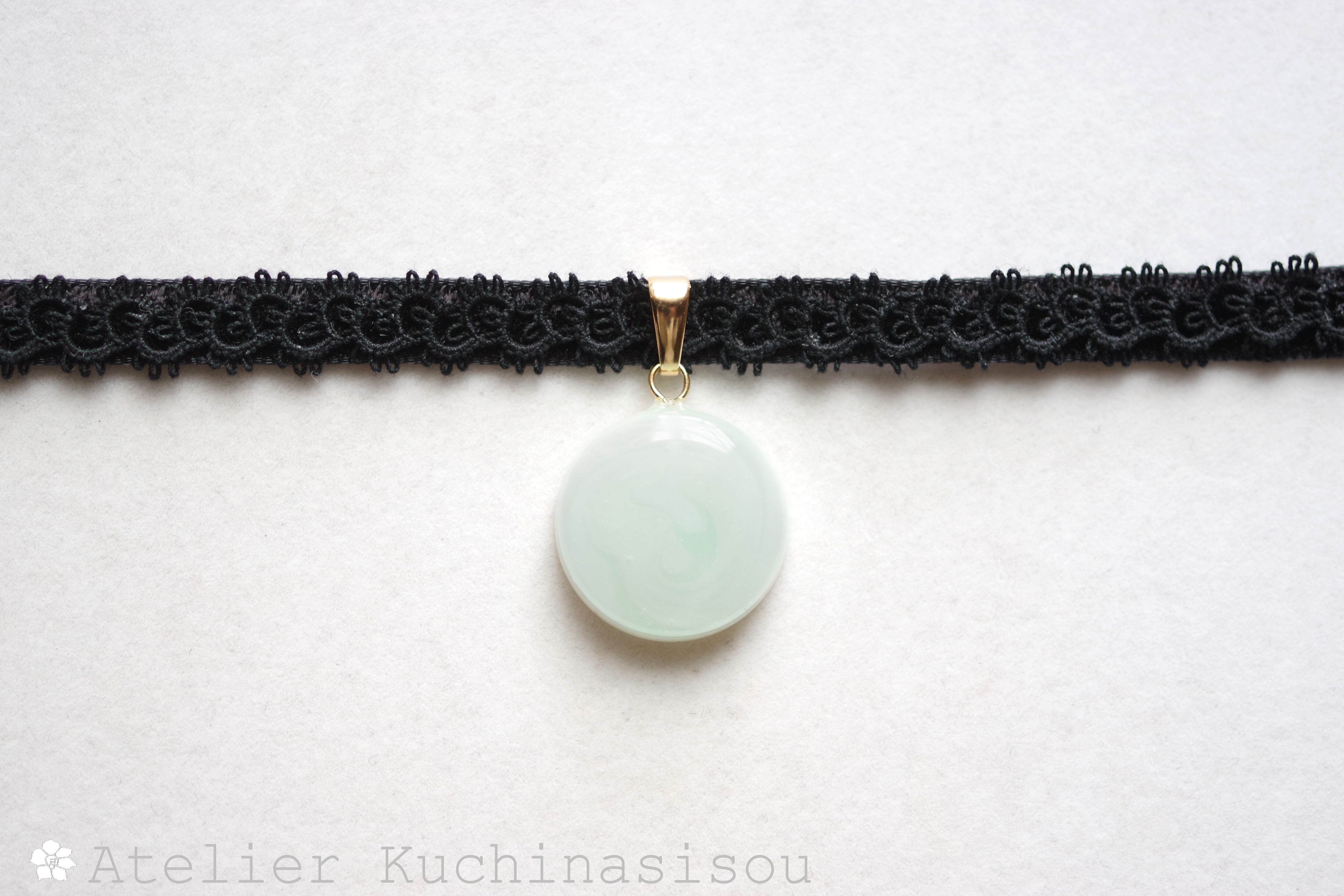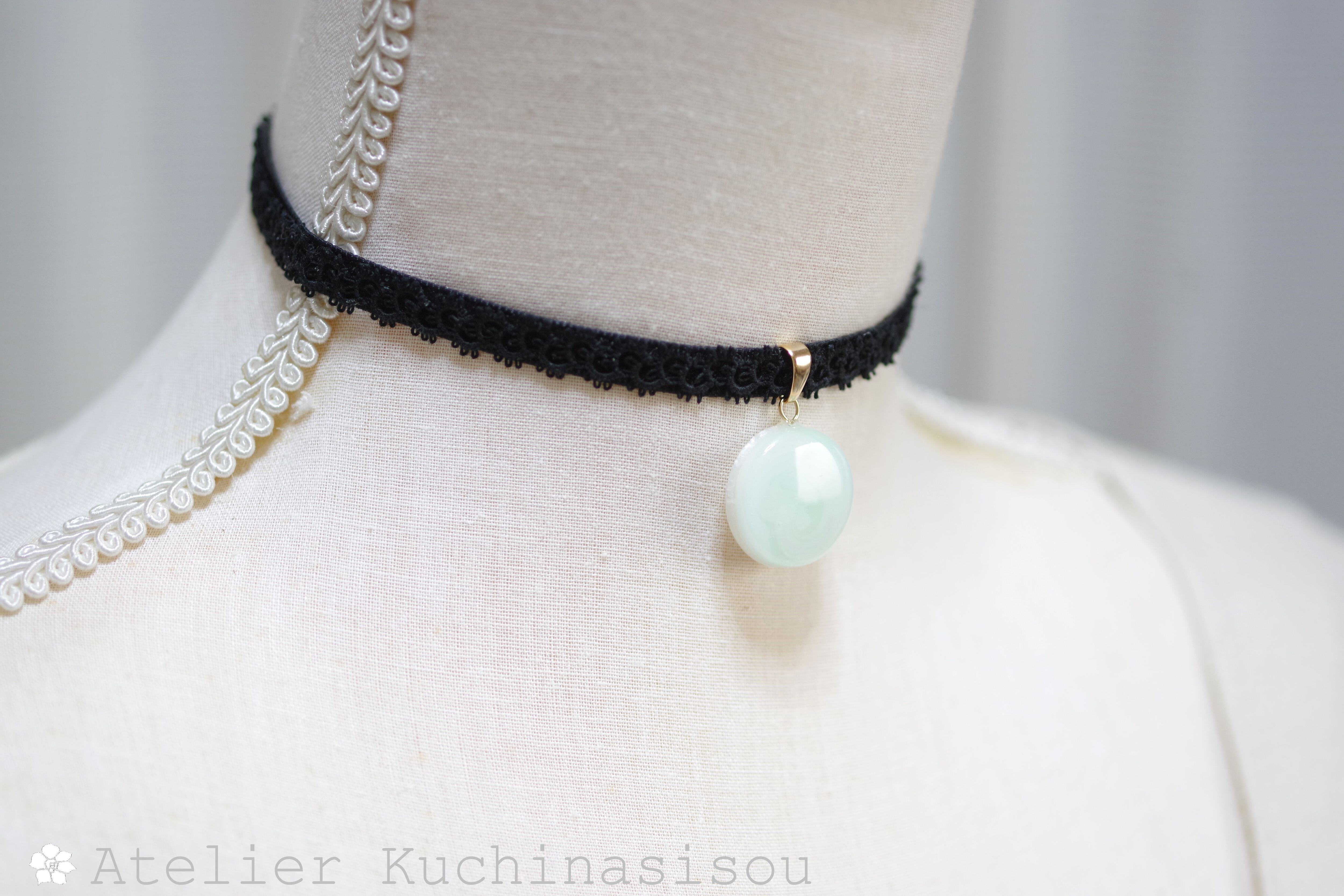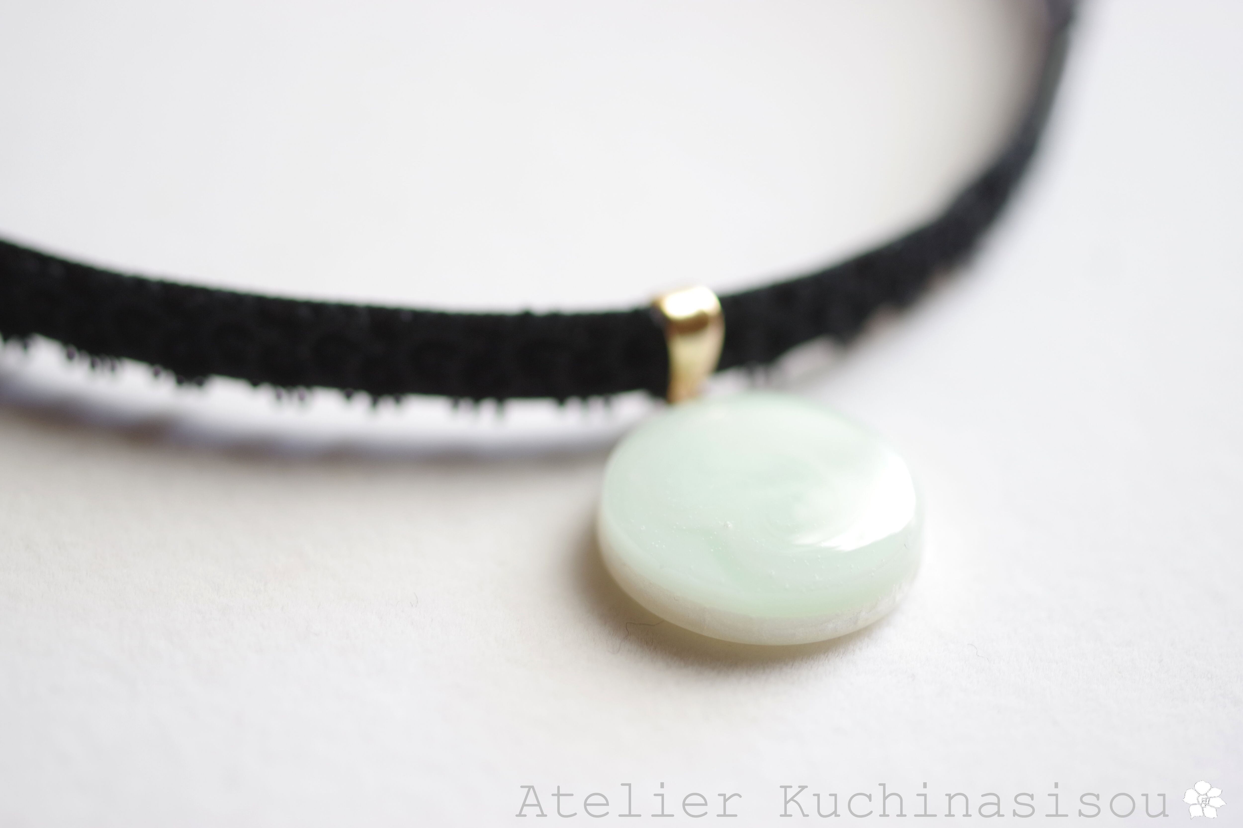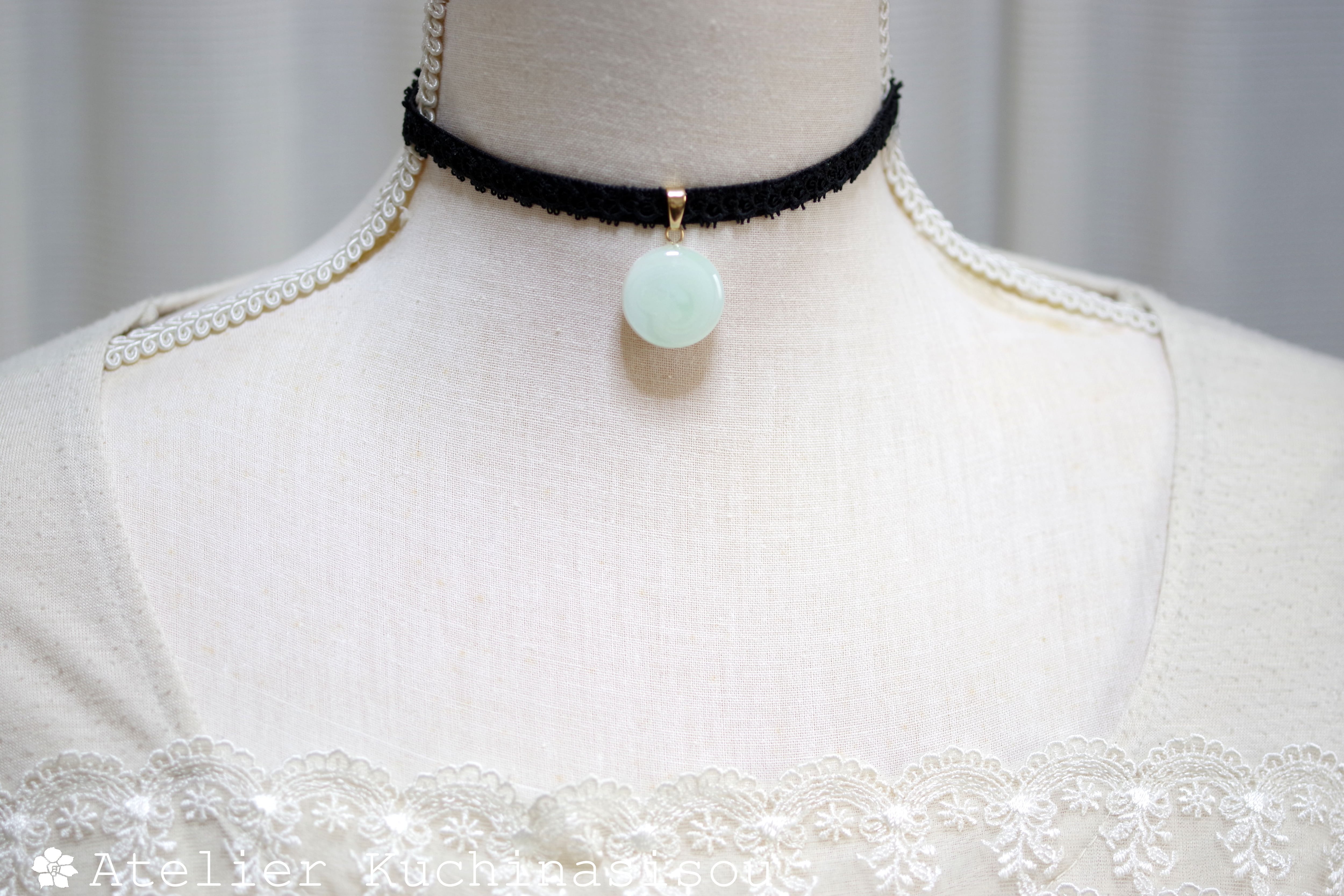 三種類の淡い淡いグリーンのマーブル模様が、まるでなめらかな陶器を思わせるレジンを、ベルベットリボンにタティングレースで装飾を施したチョーカーに仕上げました。