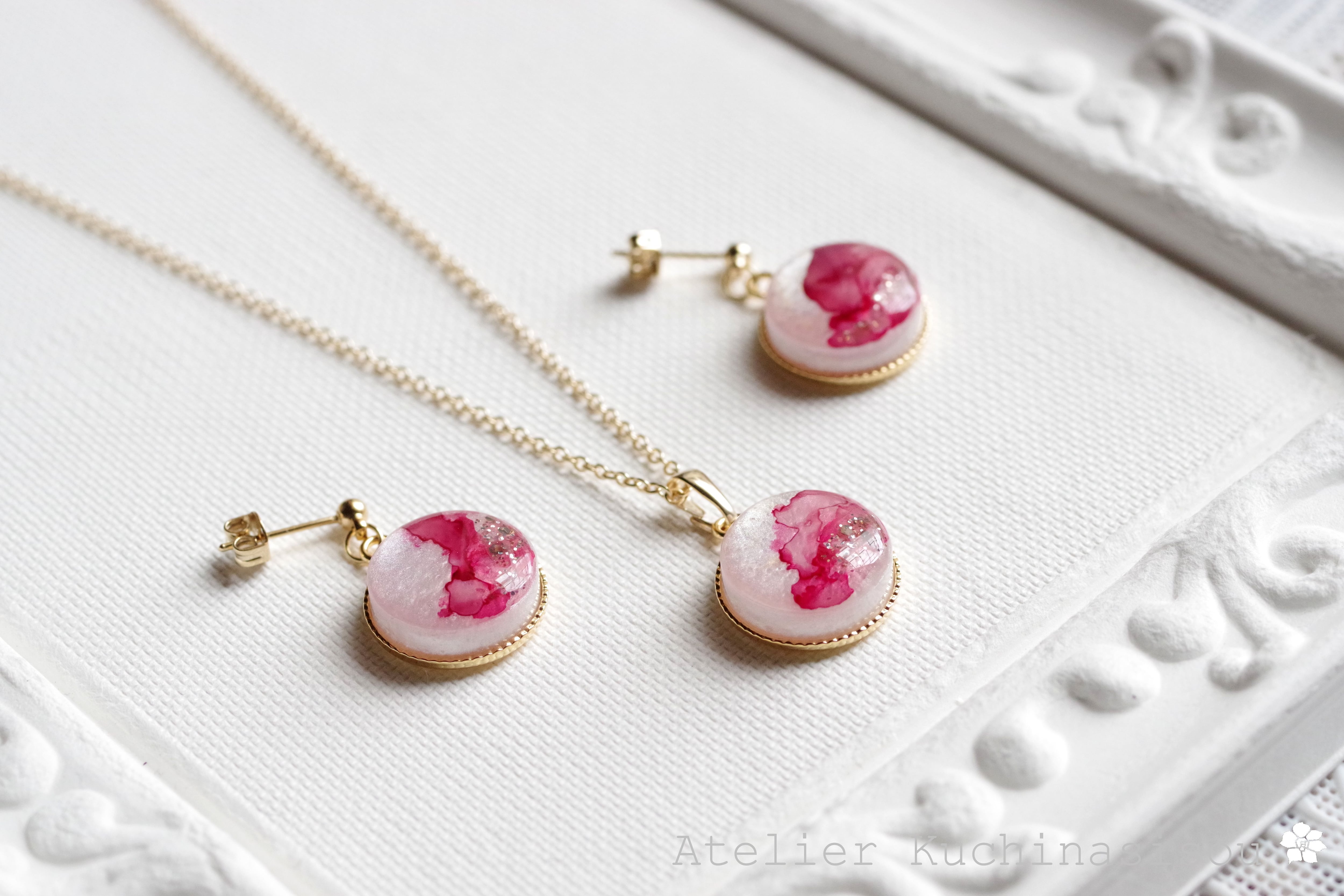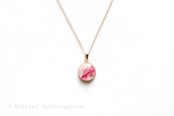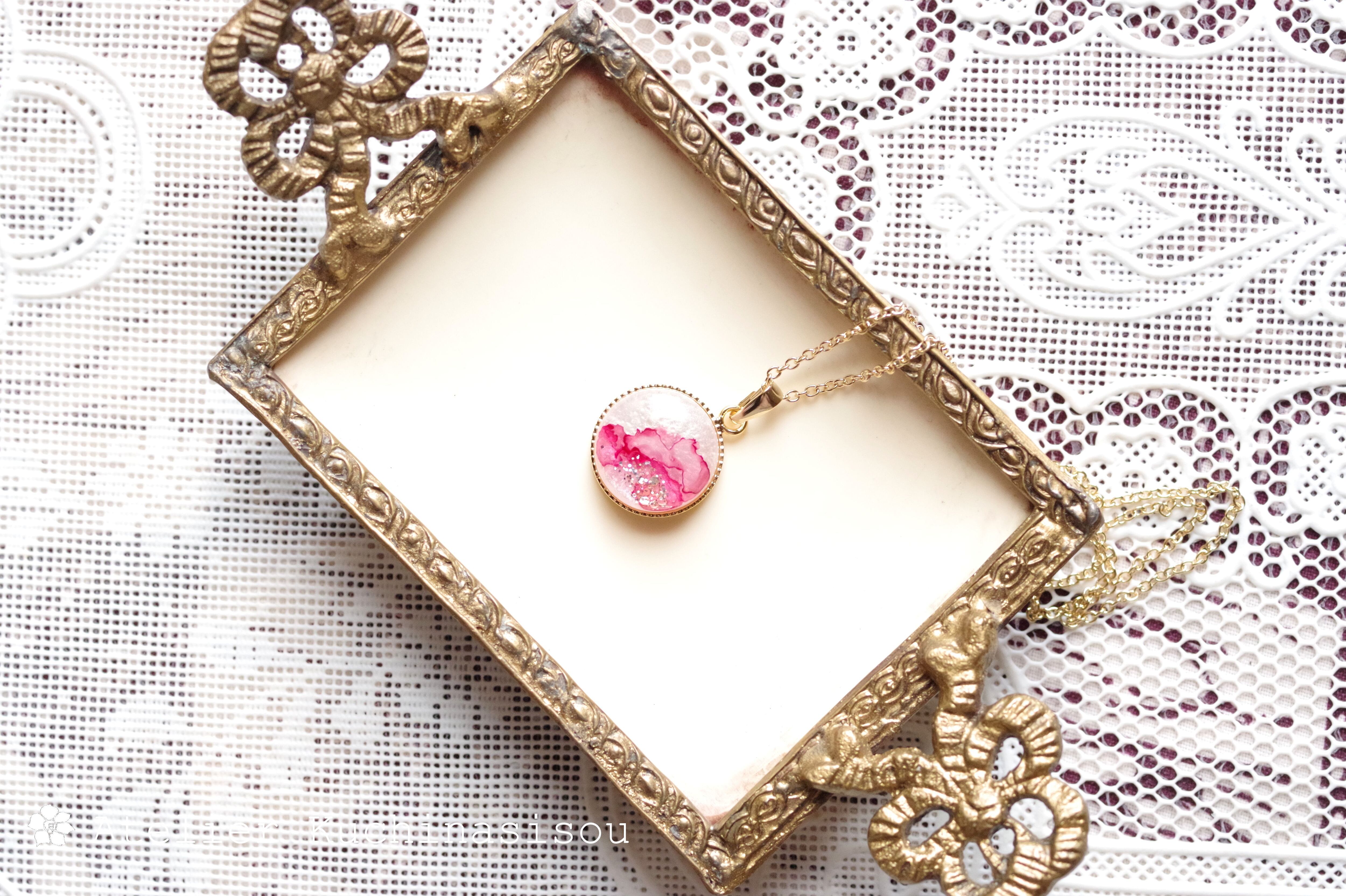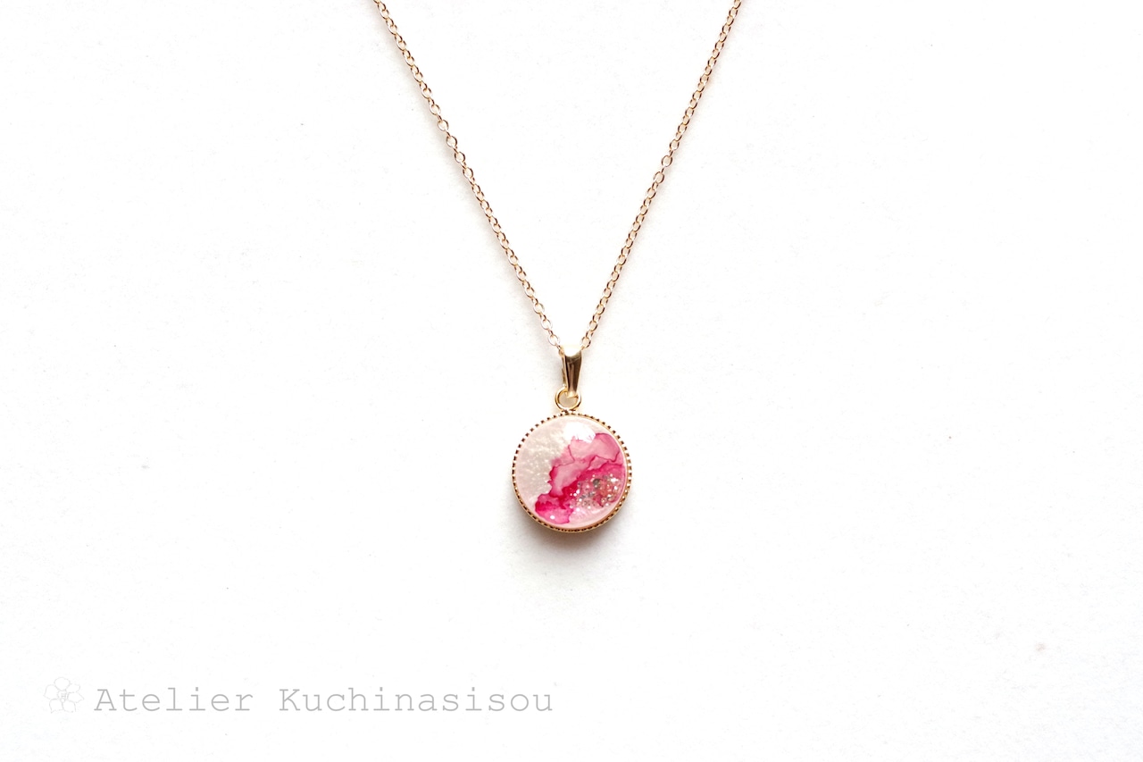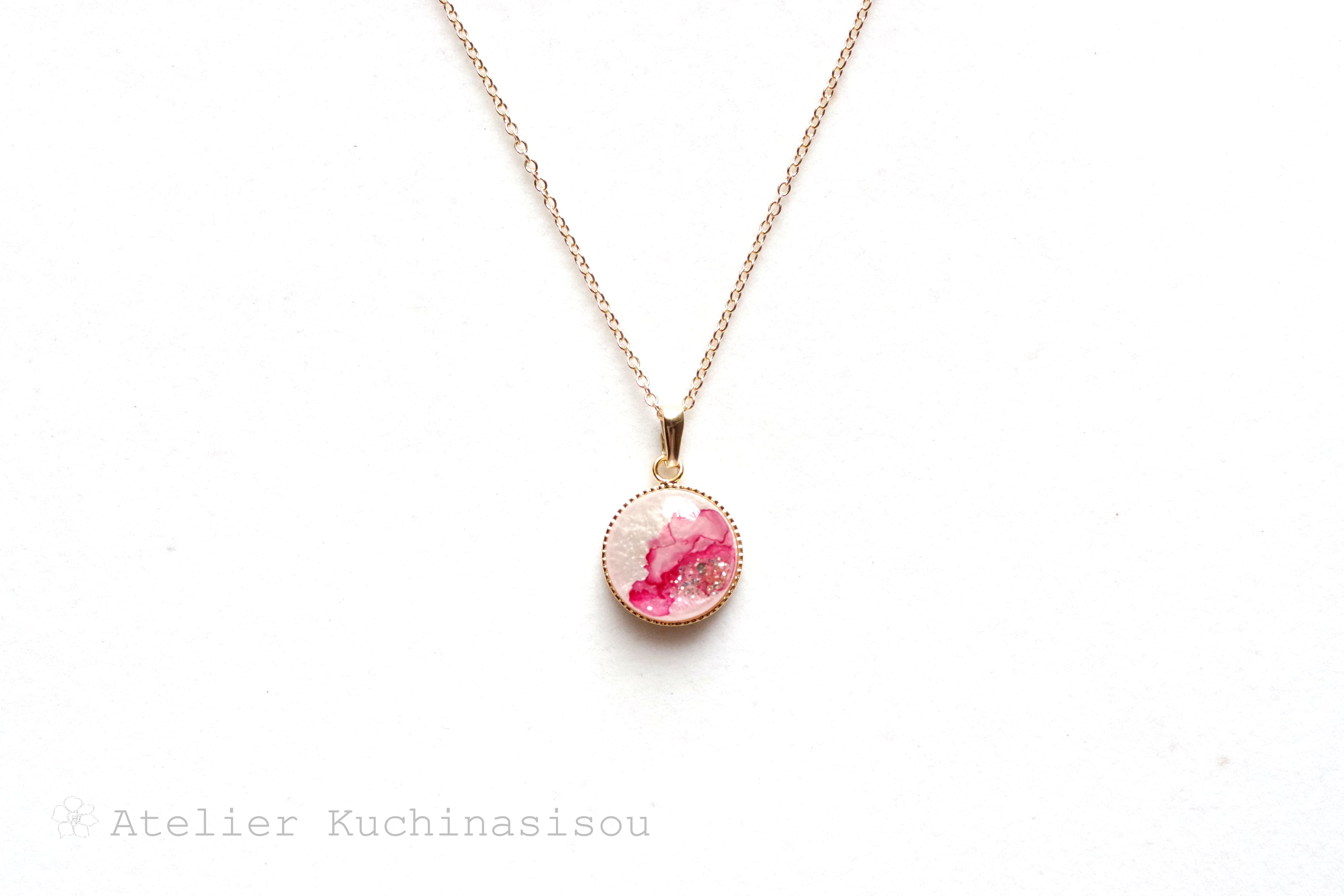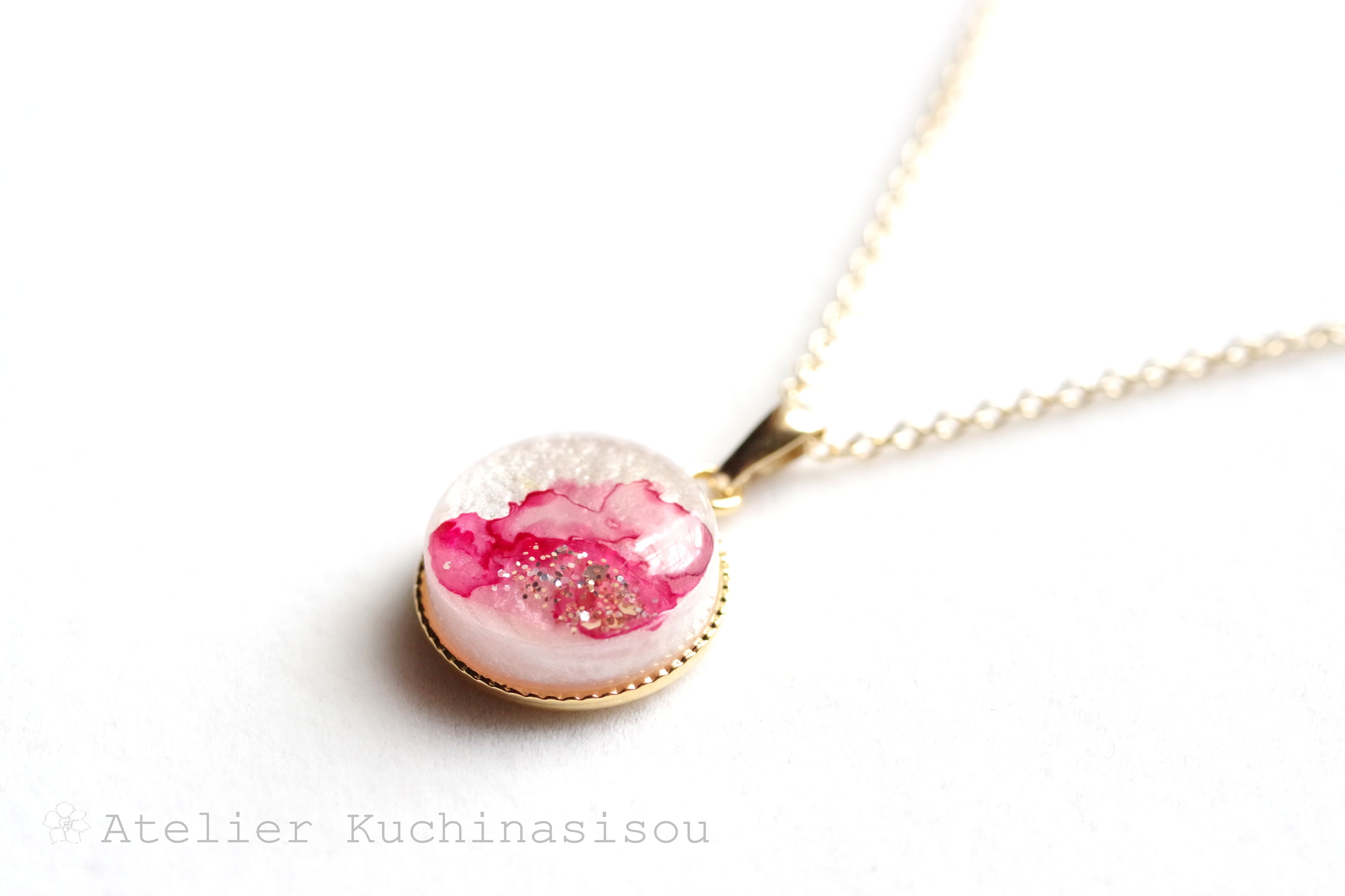 真珠色のレジンをピンク色で着色し、控えめにラメを乗せた、小粒ながらも可憐なペンダント。
