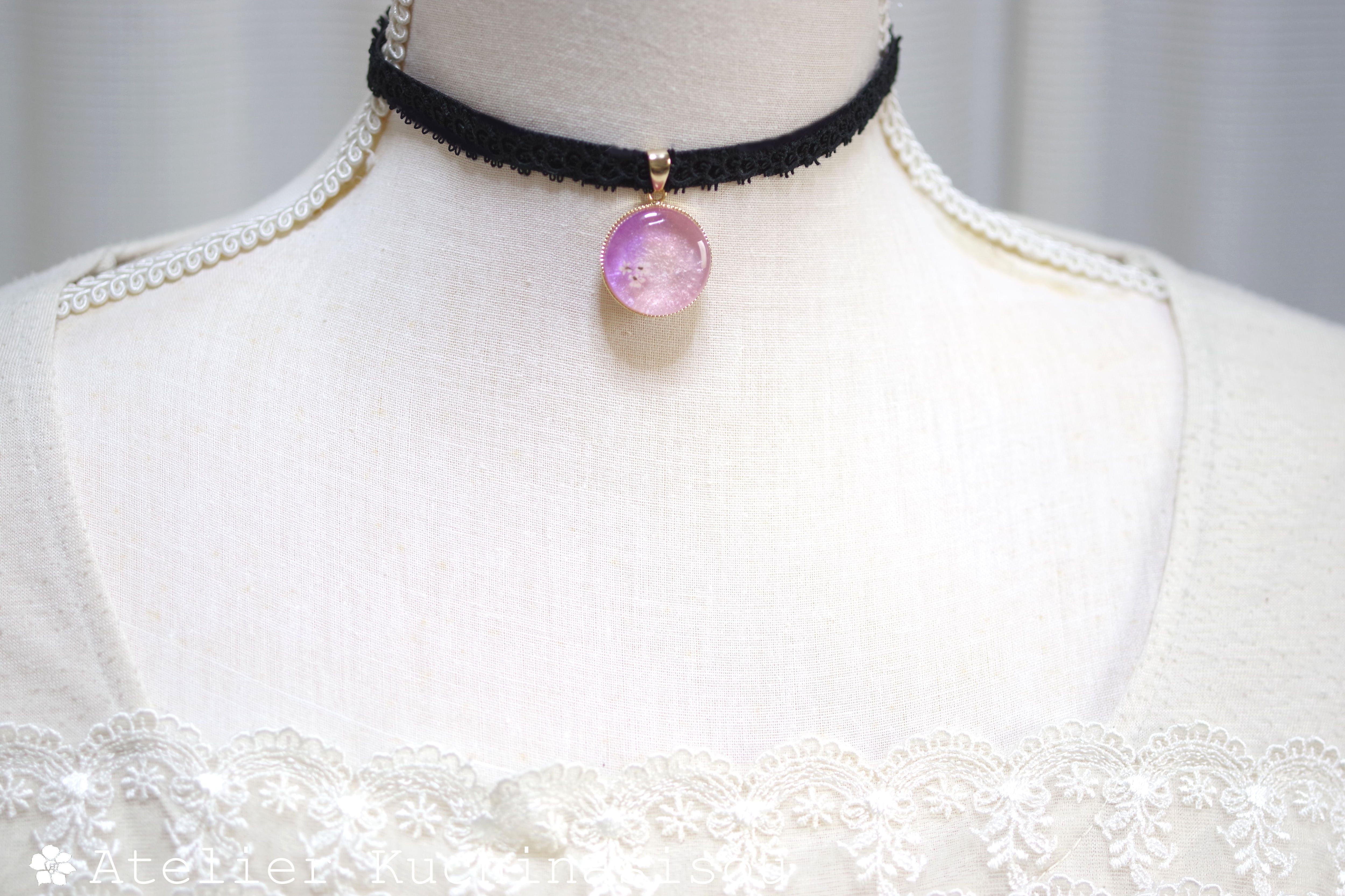黄昏の空をイメージした紫とピンクを背景に、小さく可憐なお花を三輪添わせたレジンを、ベルベットリボンにタティングレースで装飾を施したチョーカーに仕上げました。