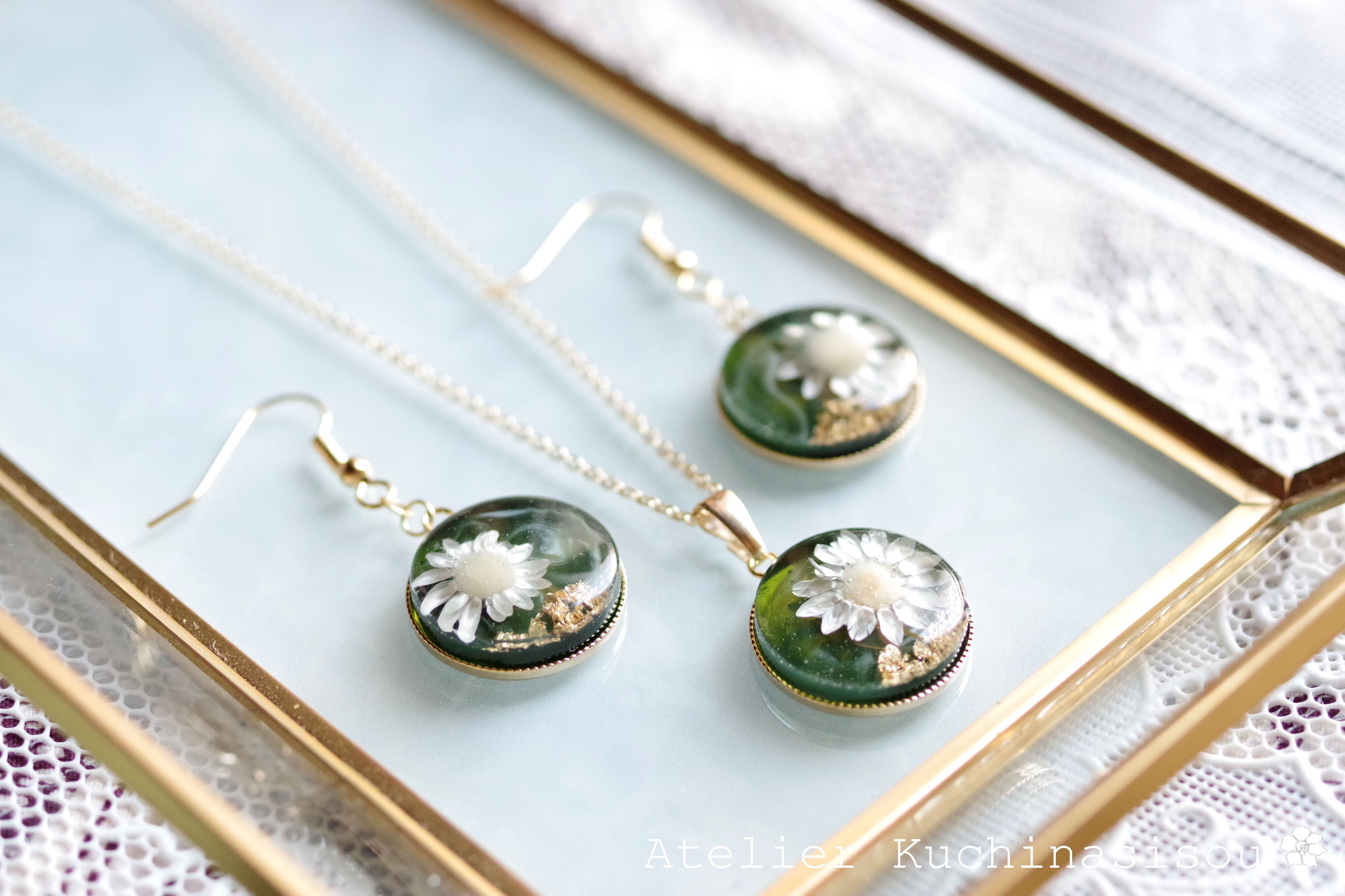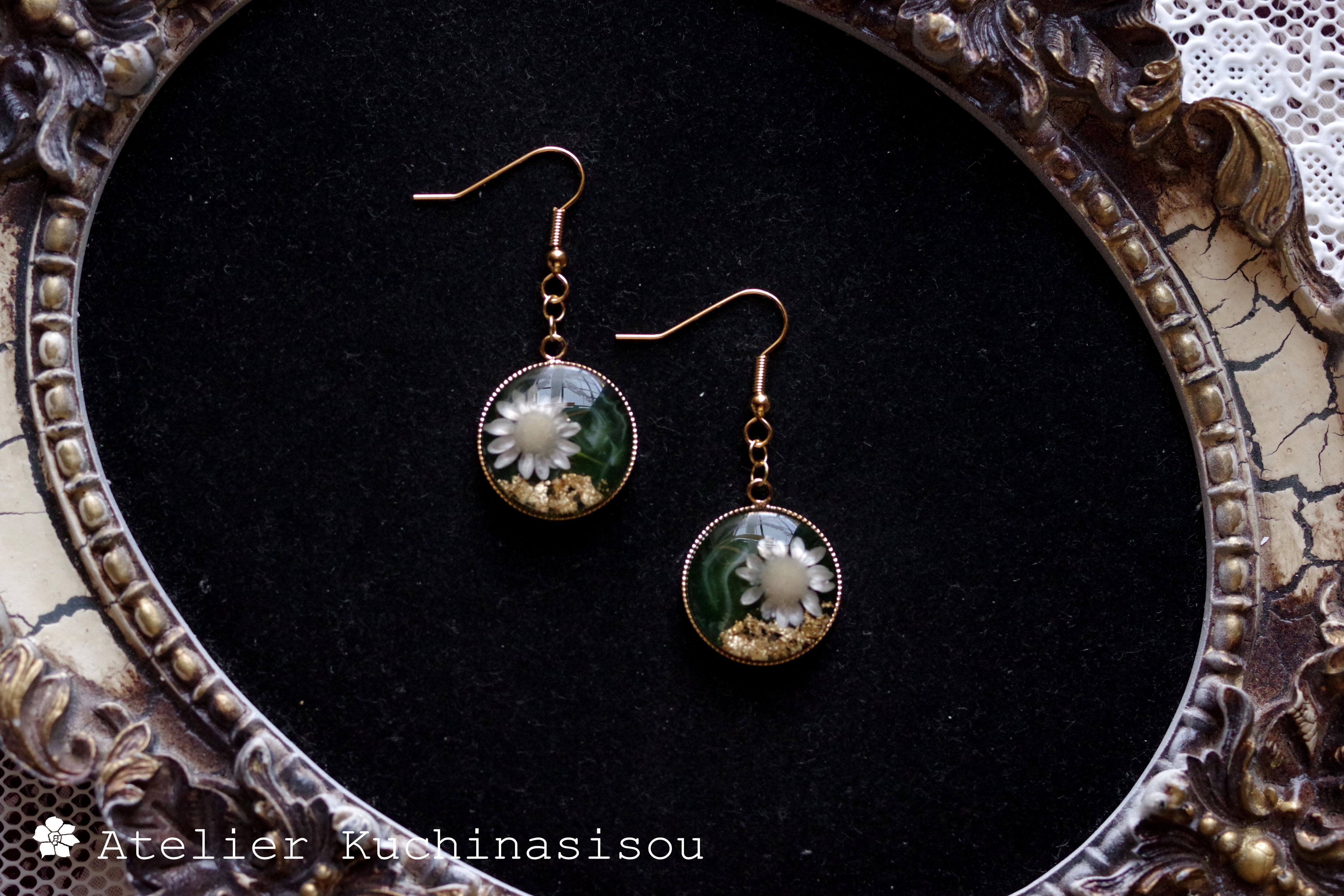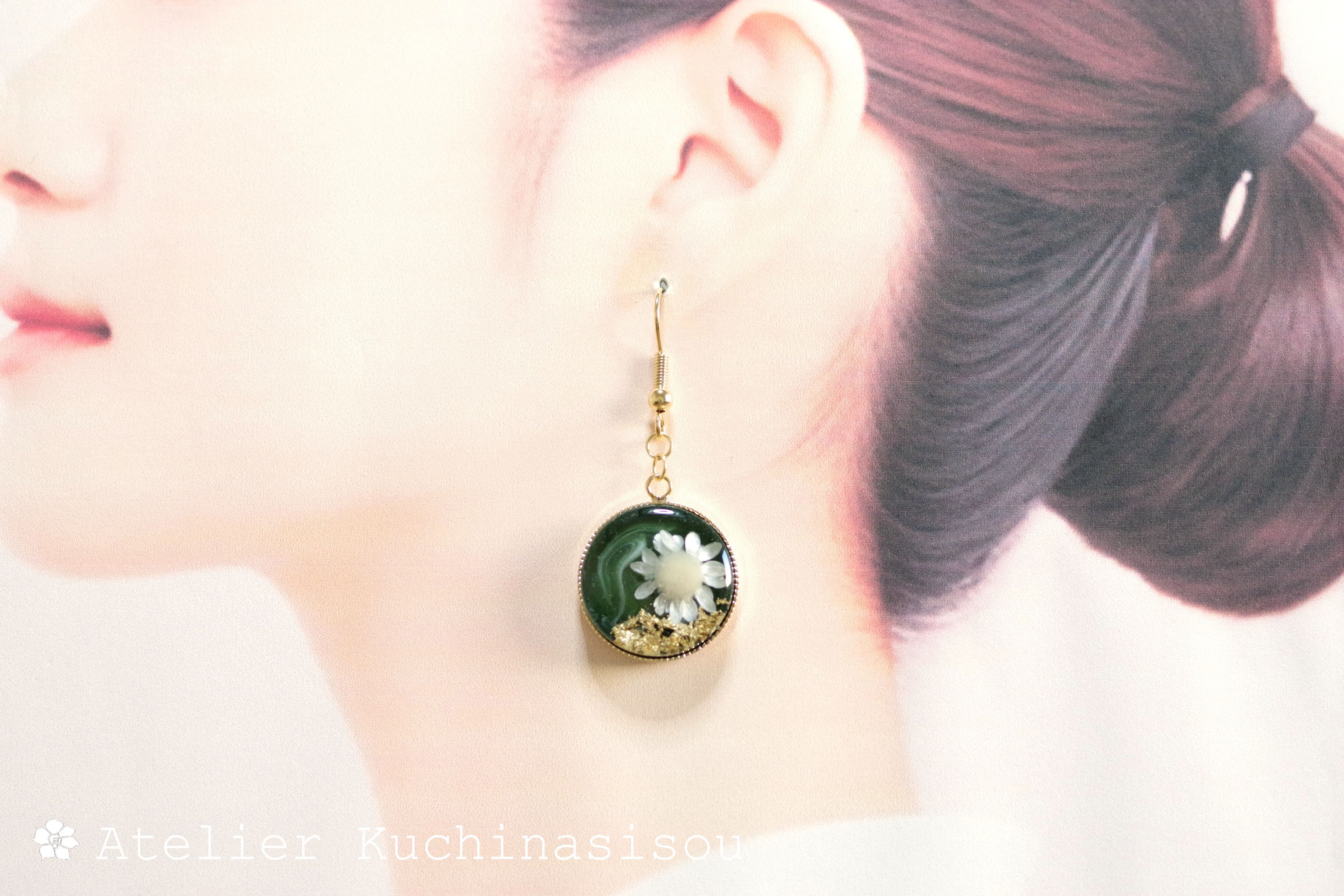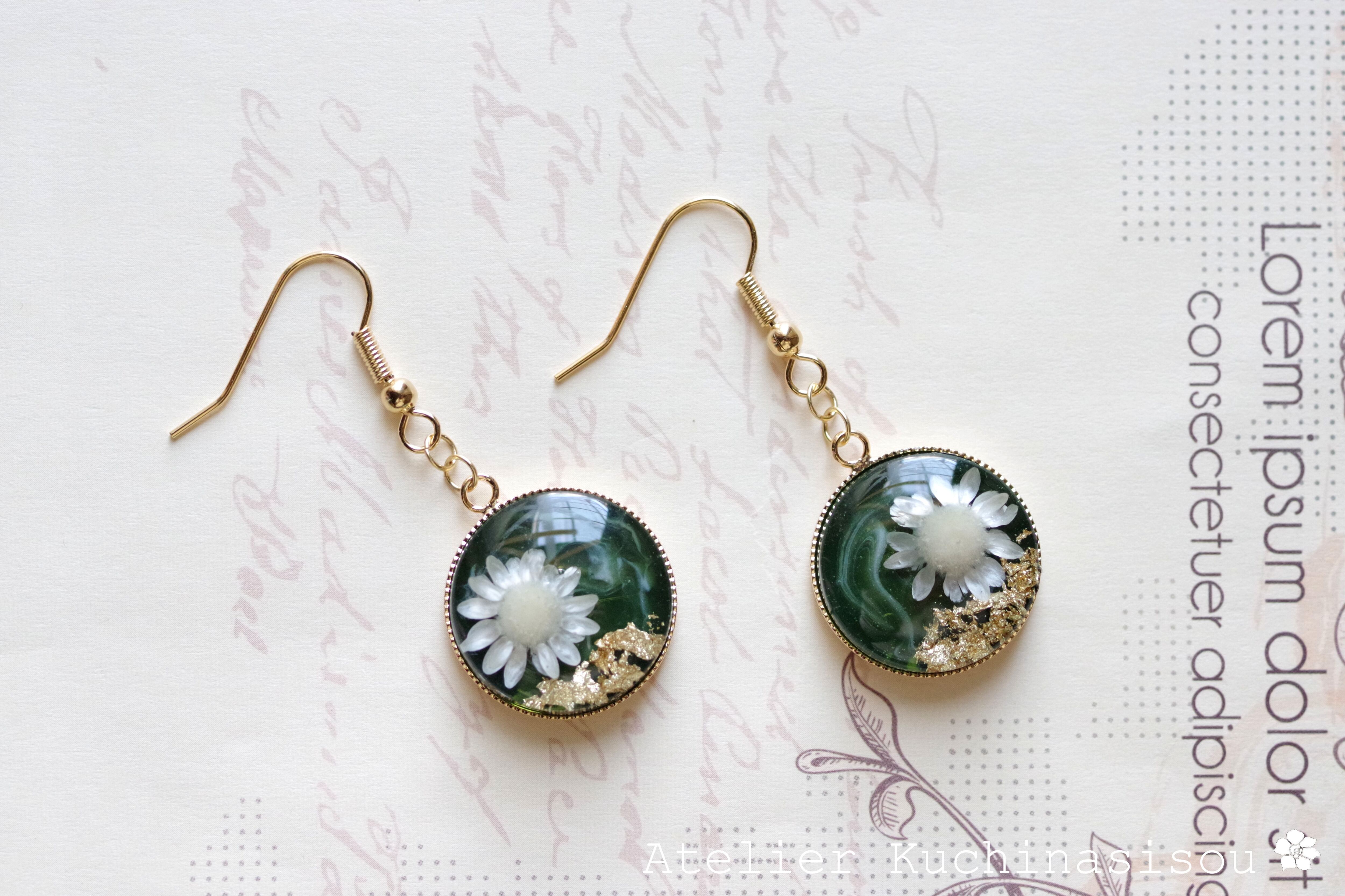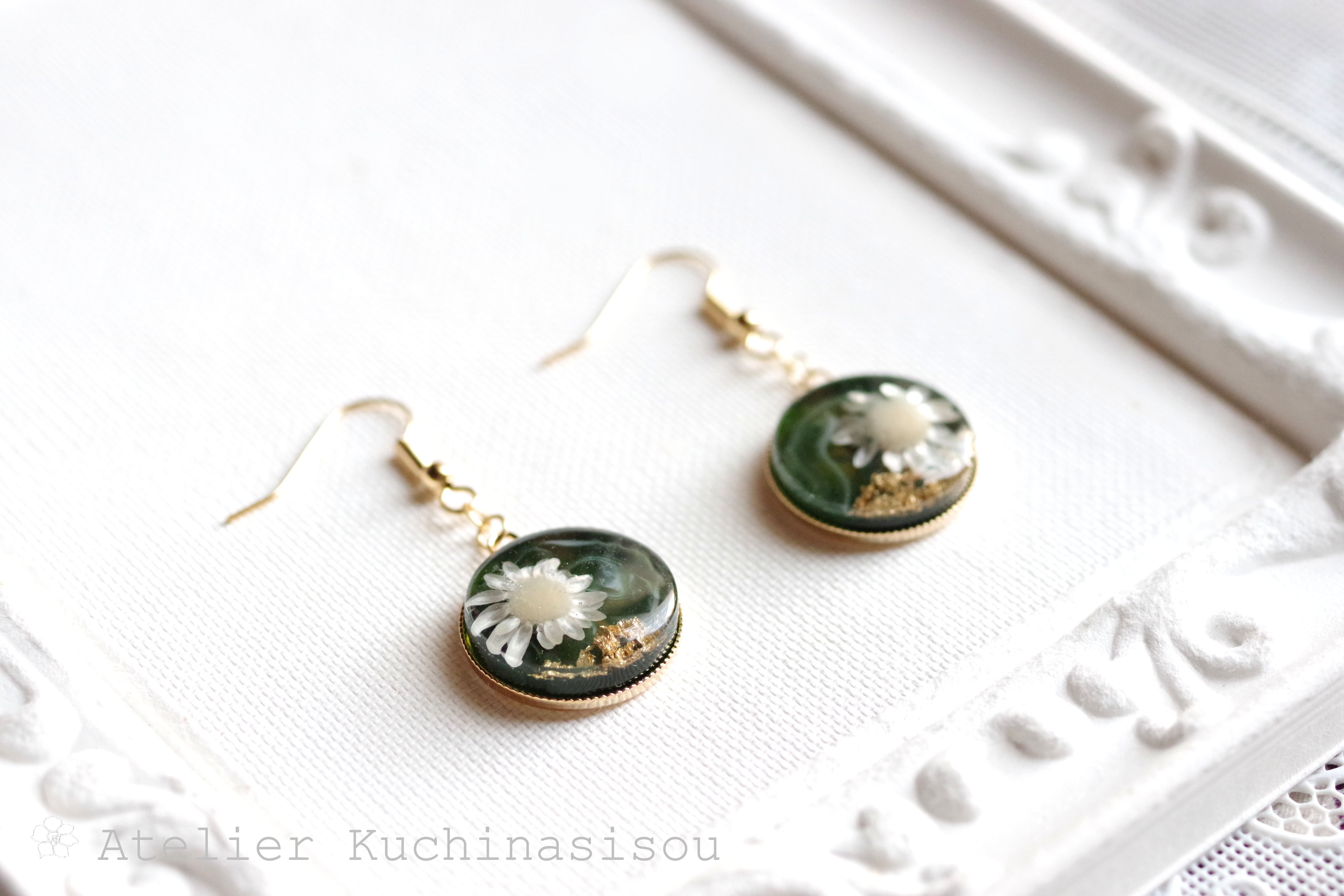 深い緑のレジンに、白いお花をあしらったナチュラルで愛らしいピアス。