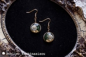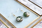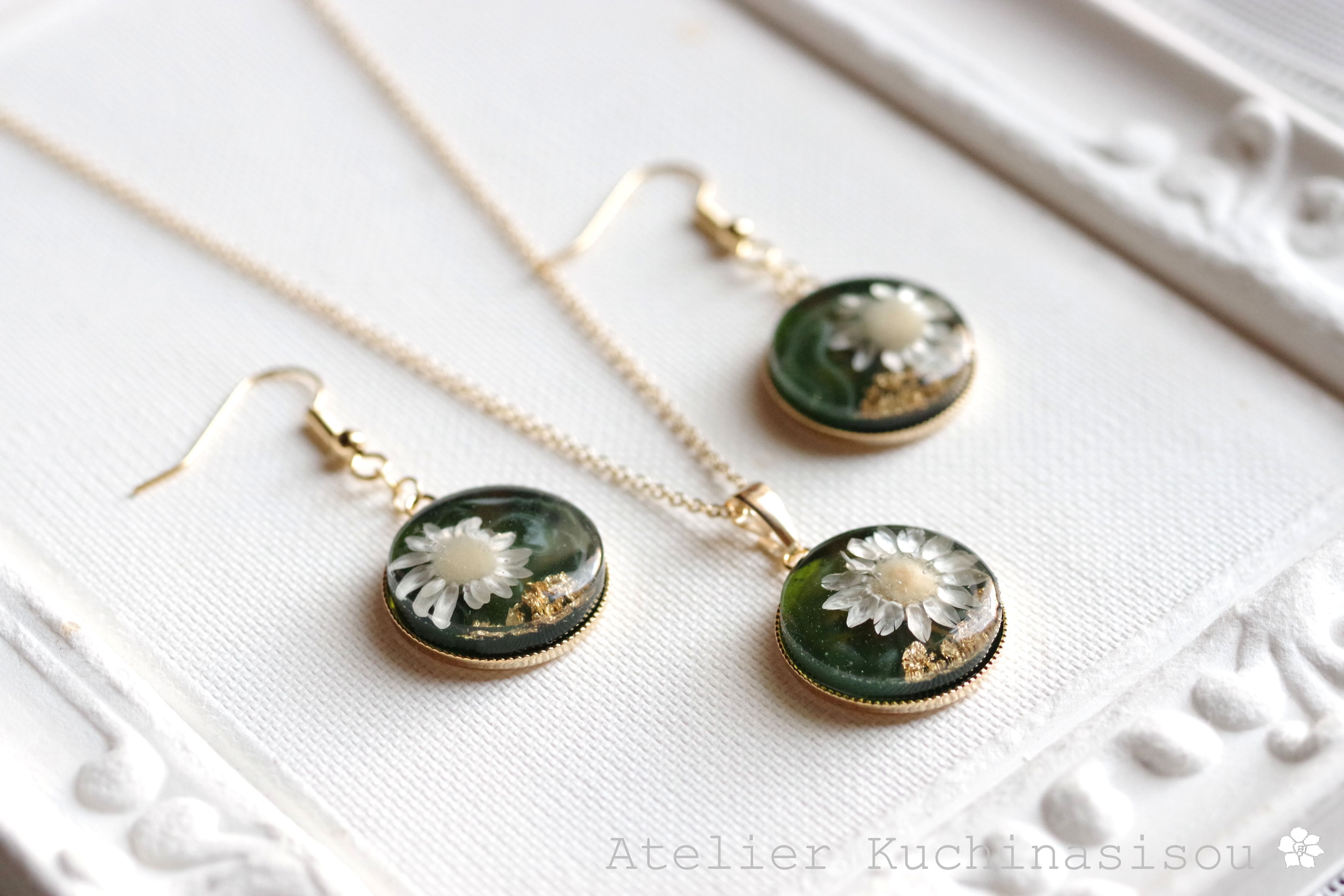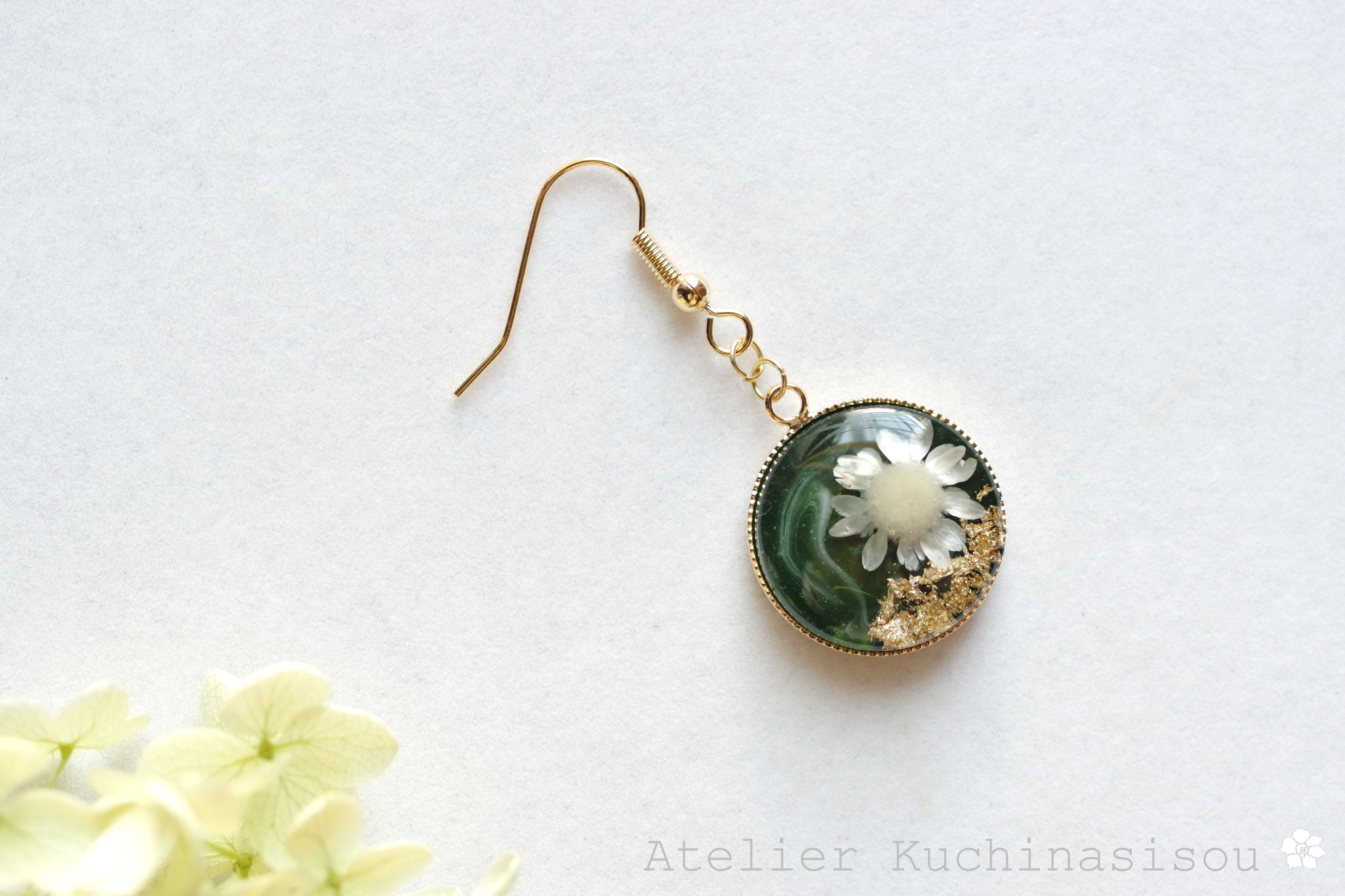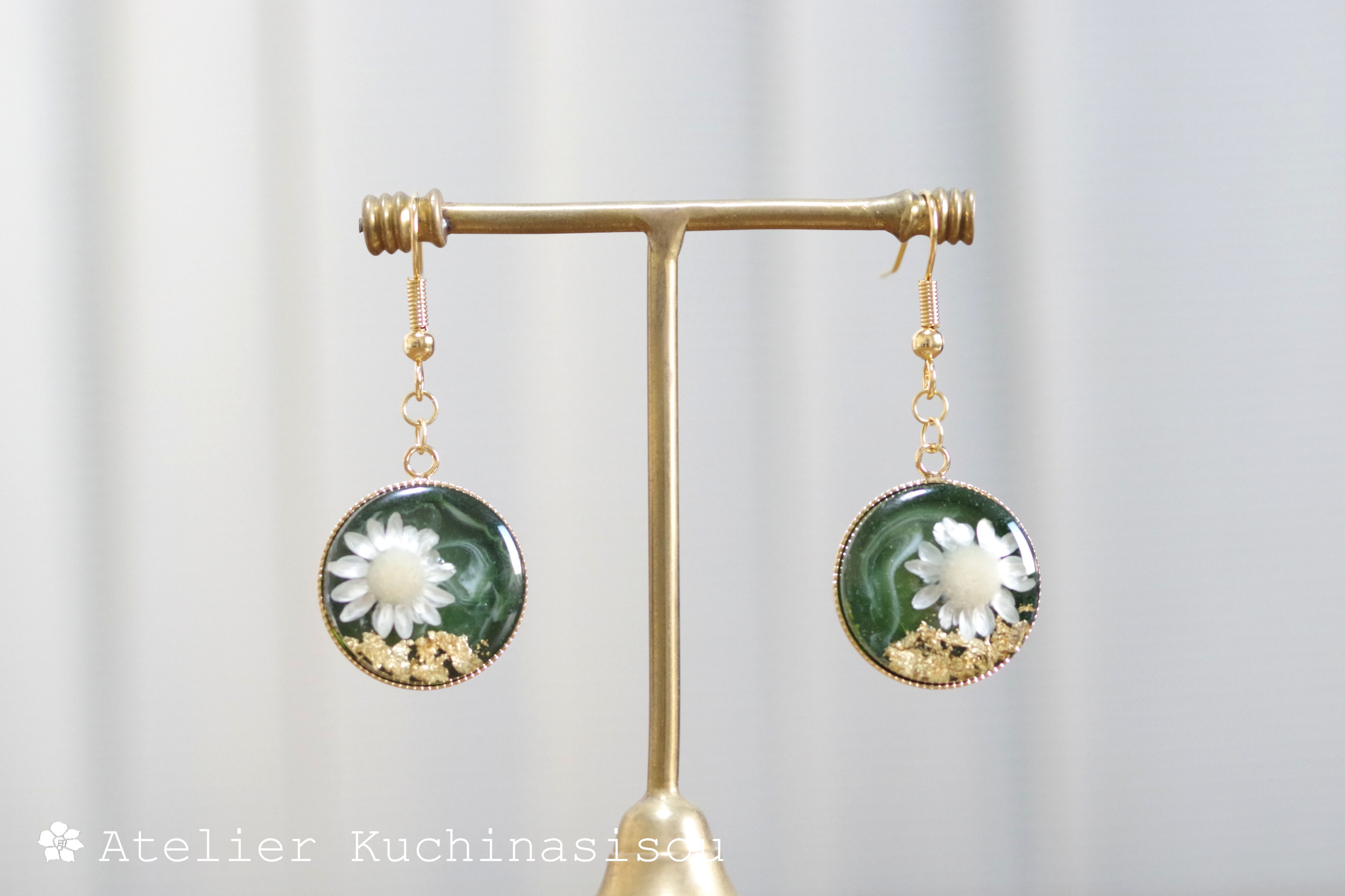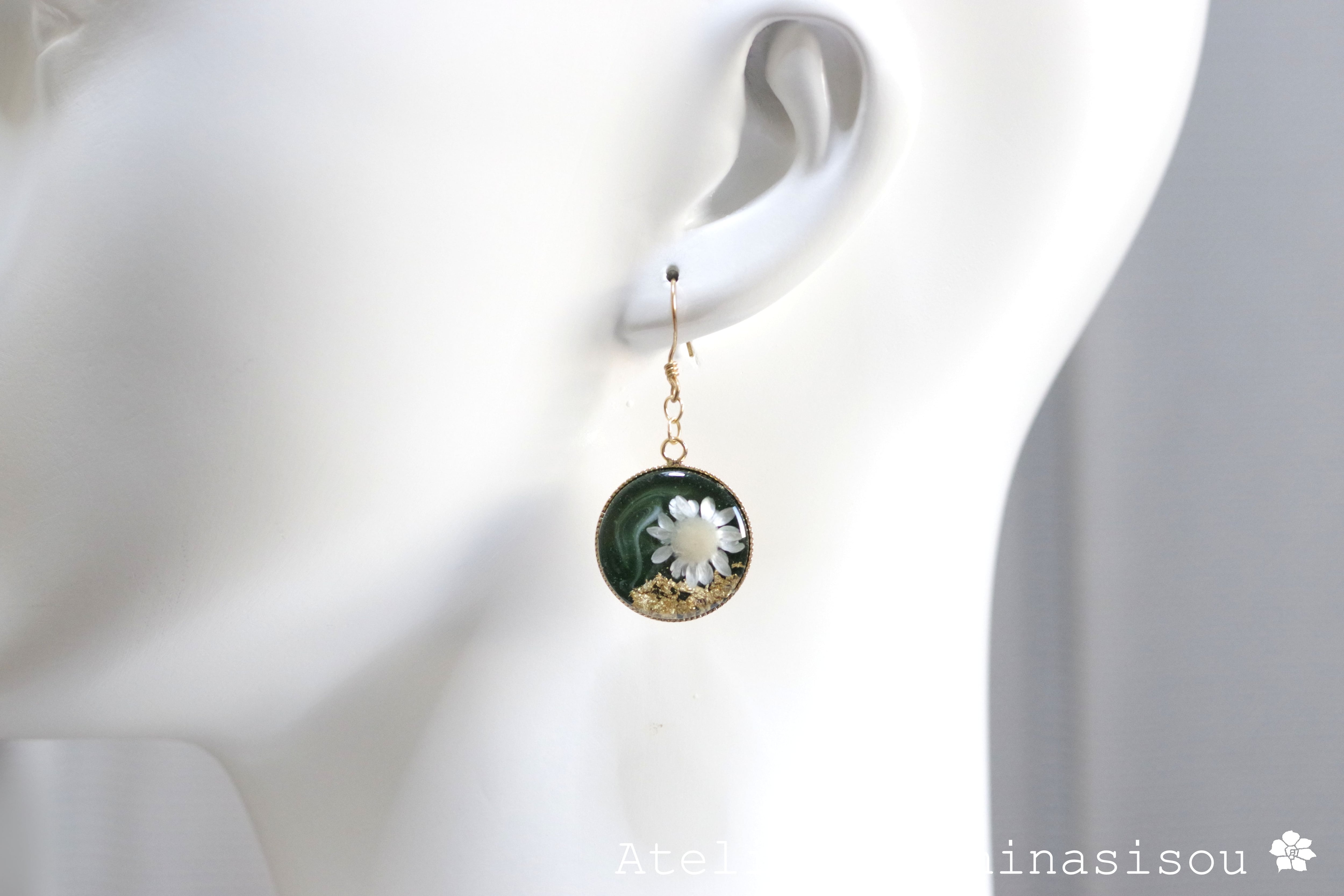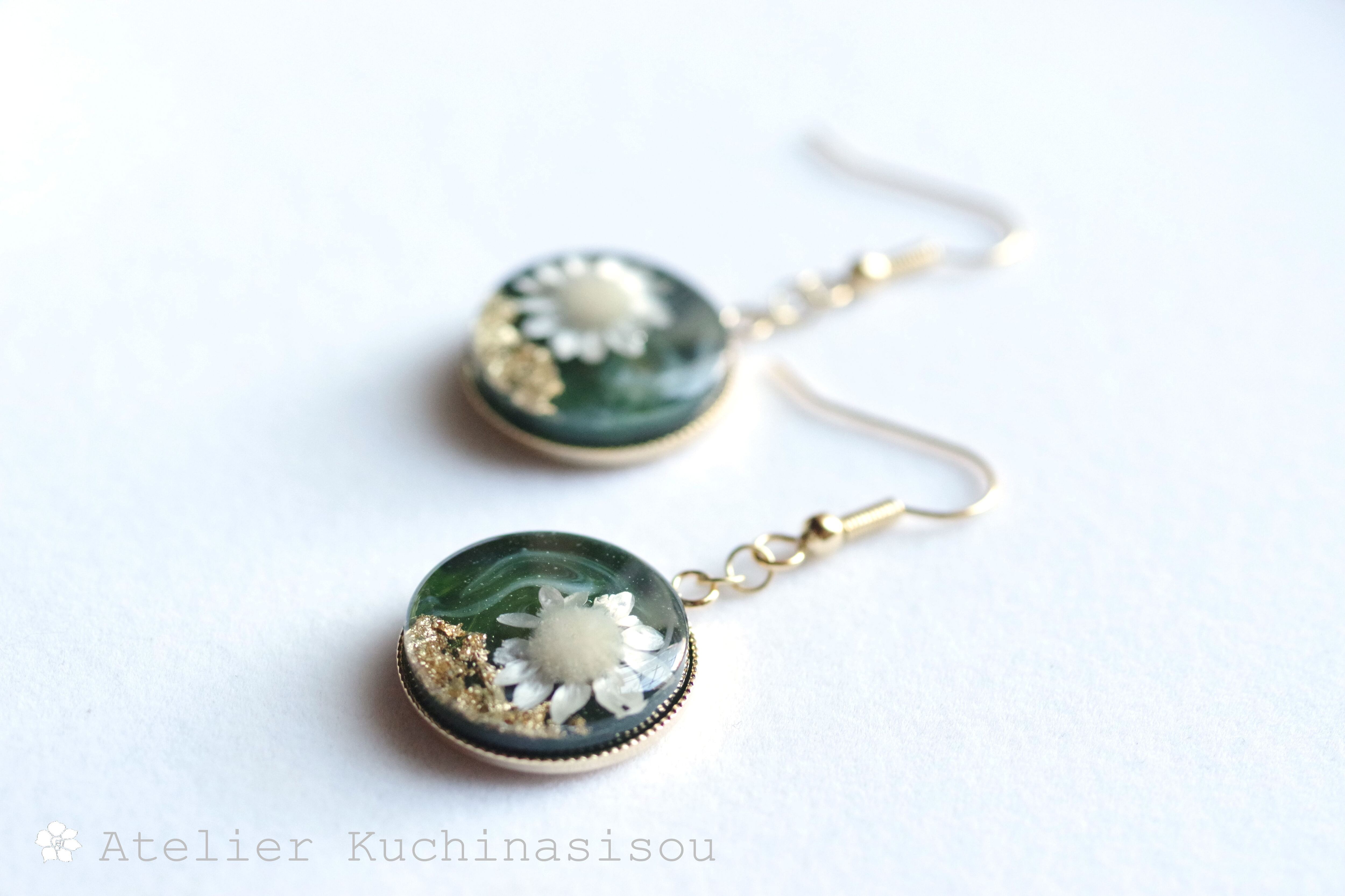 深い緑のレジンに、白いお花をあしらったナチュラルで愛らしいピアス。