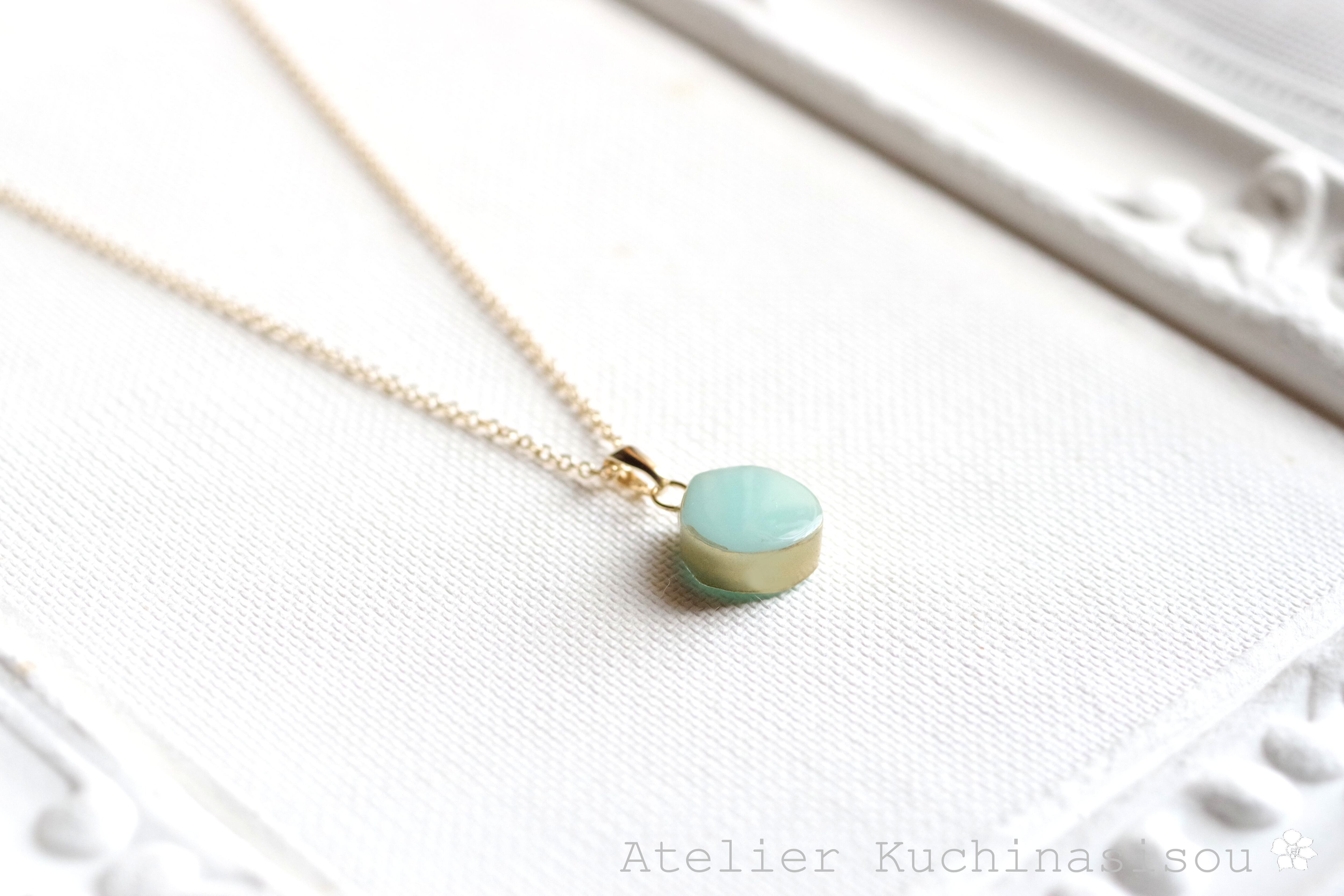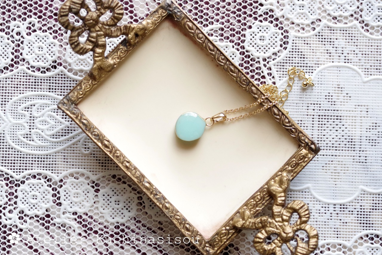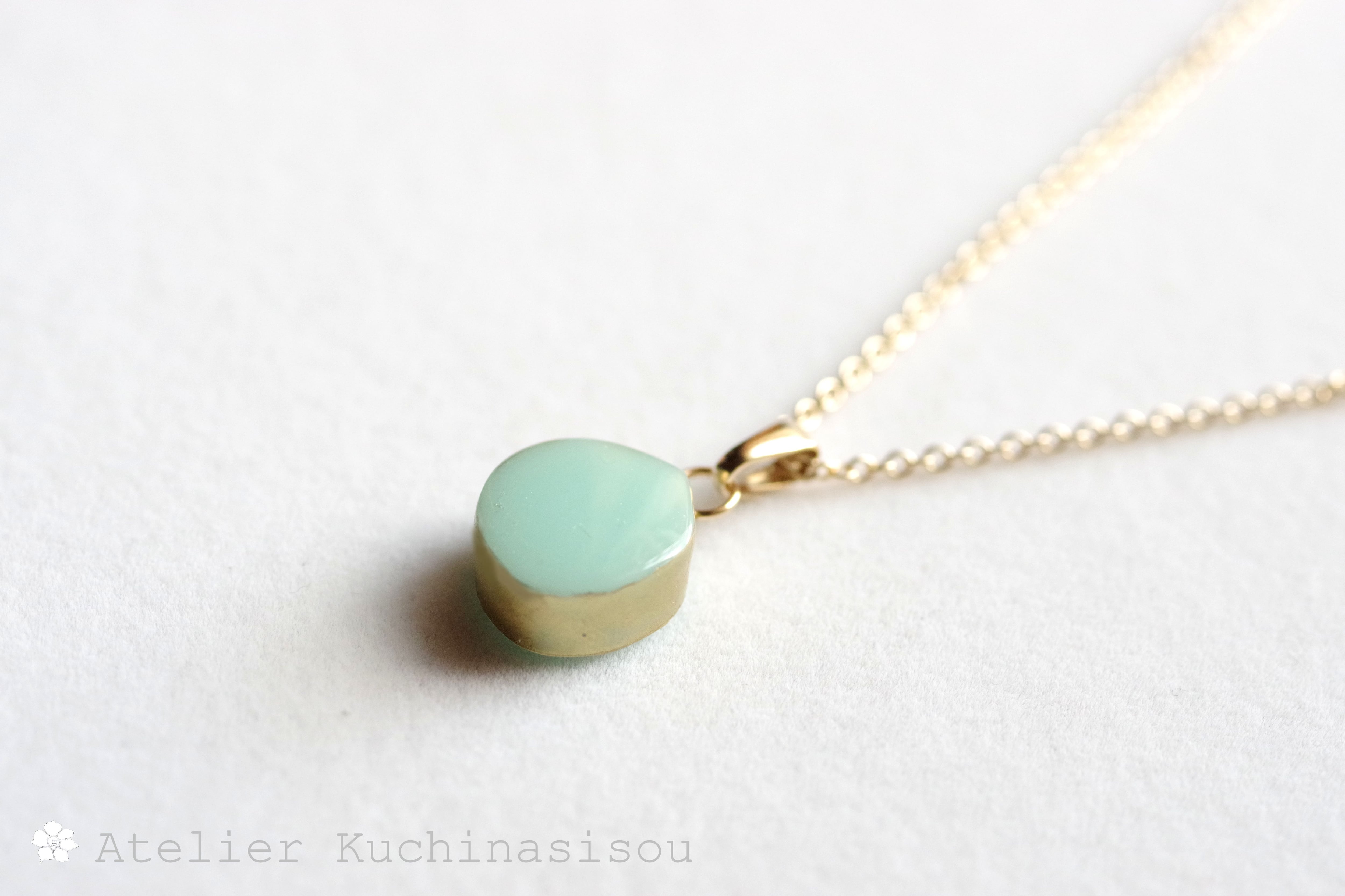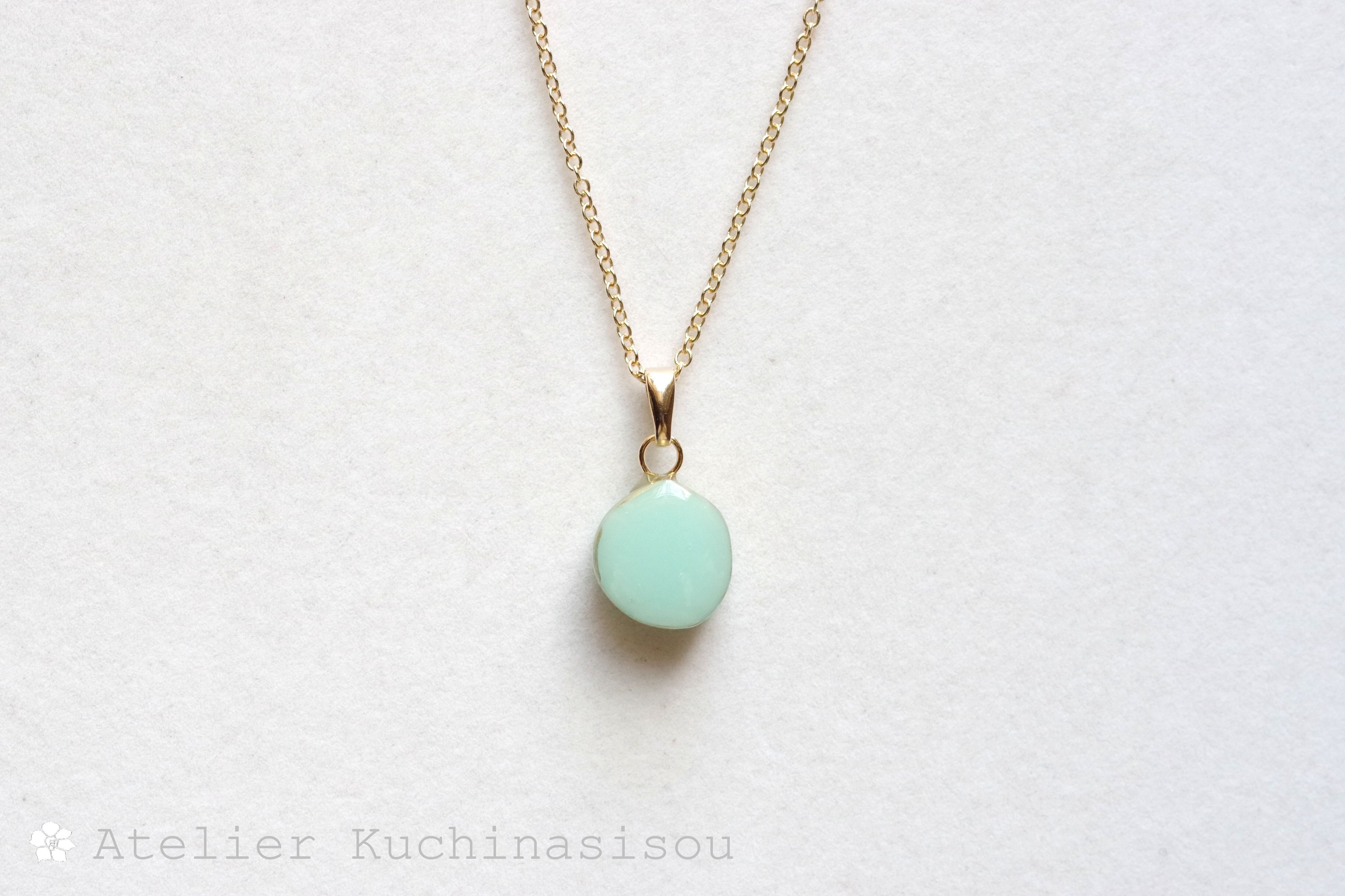 優しいグリーンに側面のゴールドが映えるペンダント。