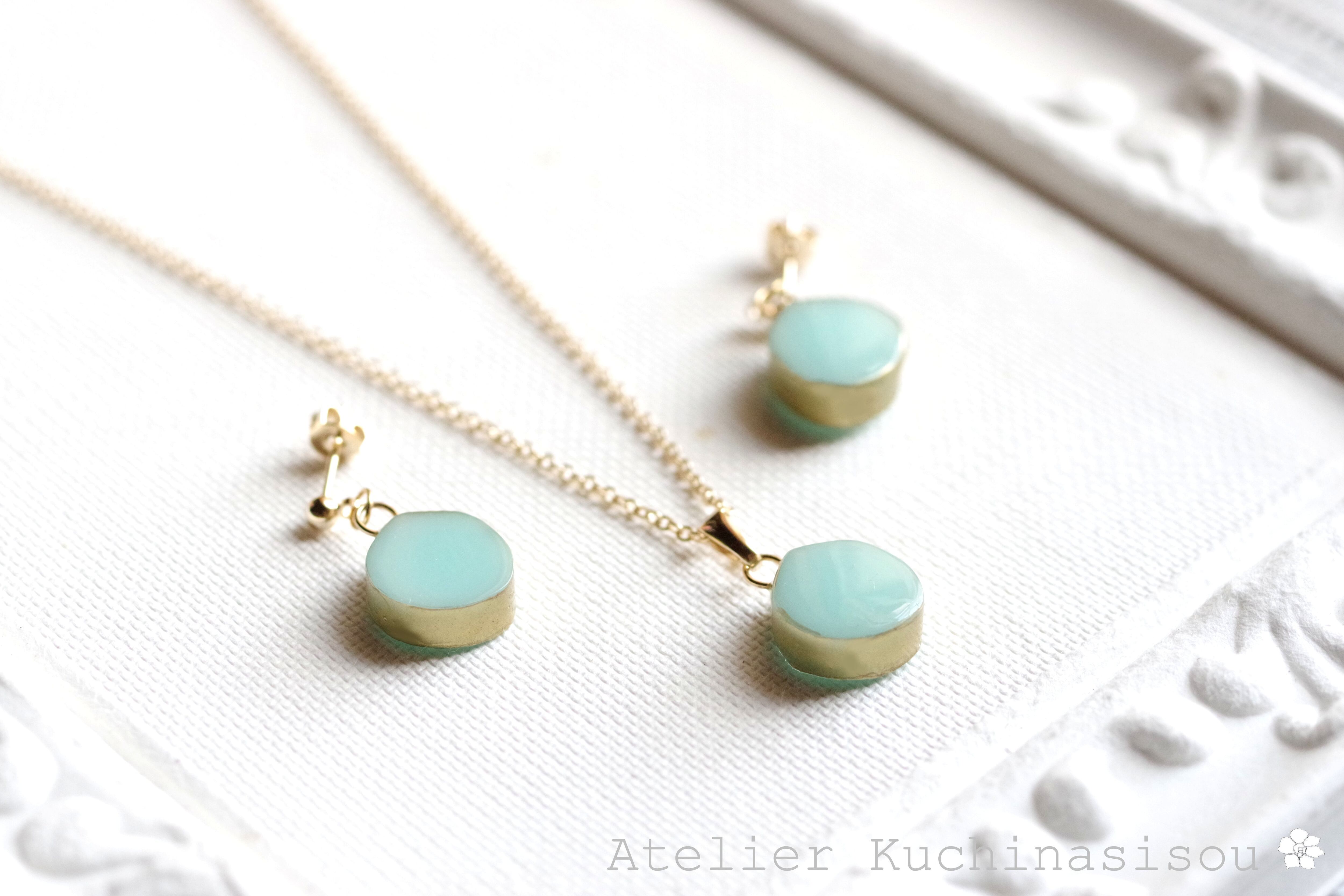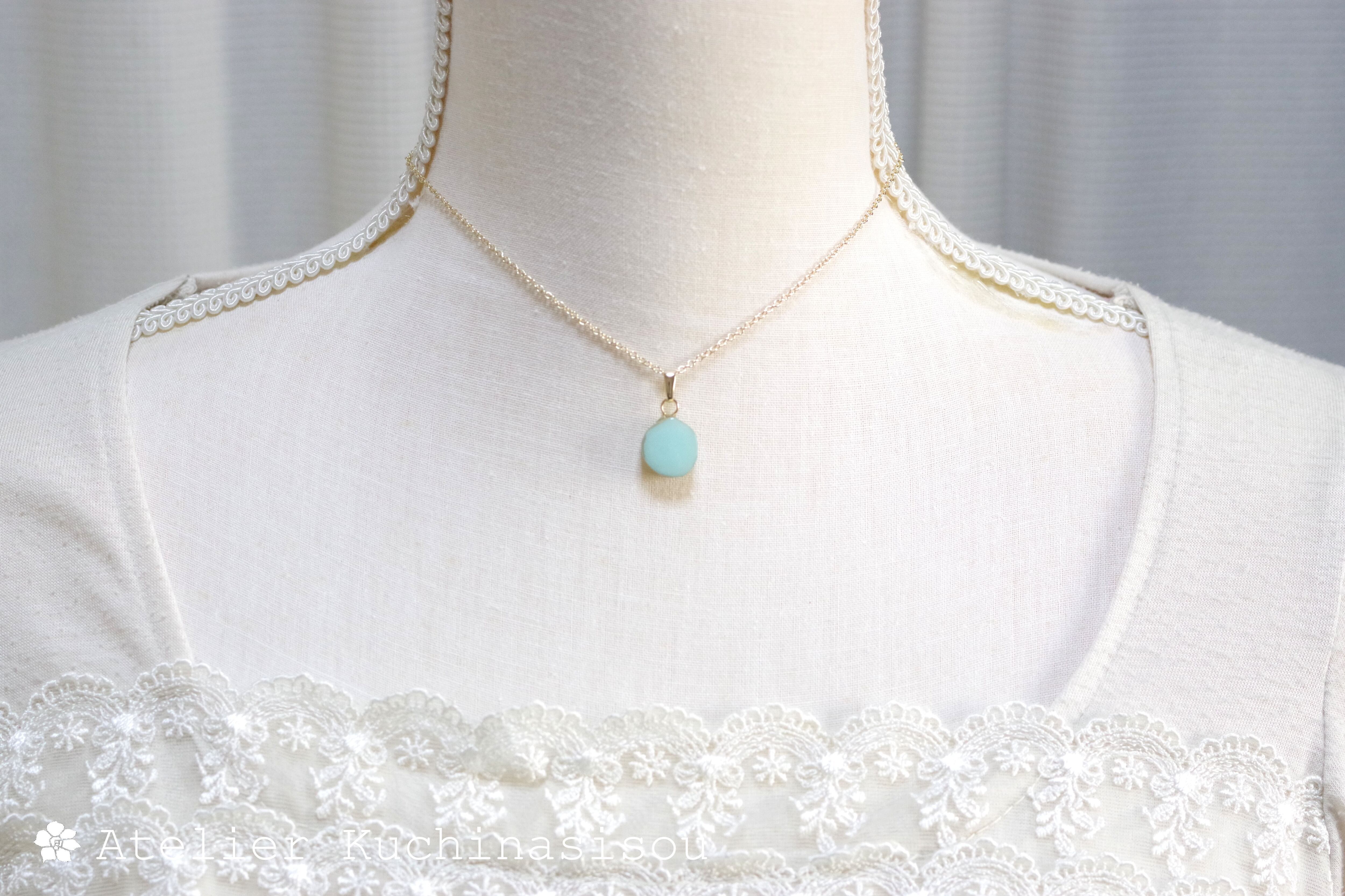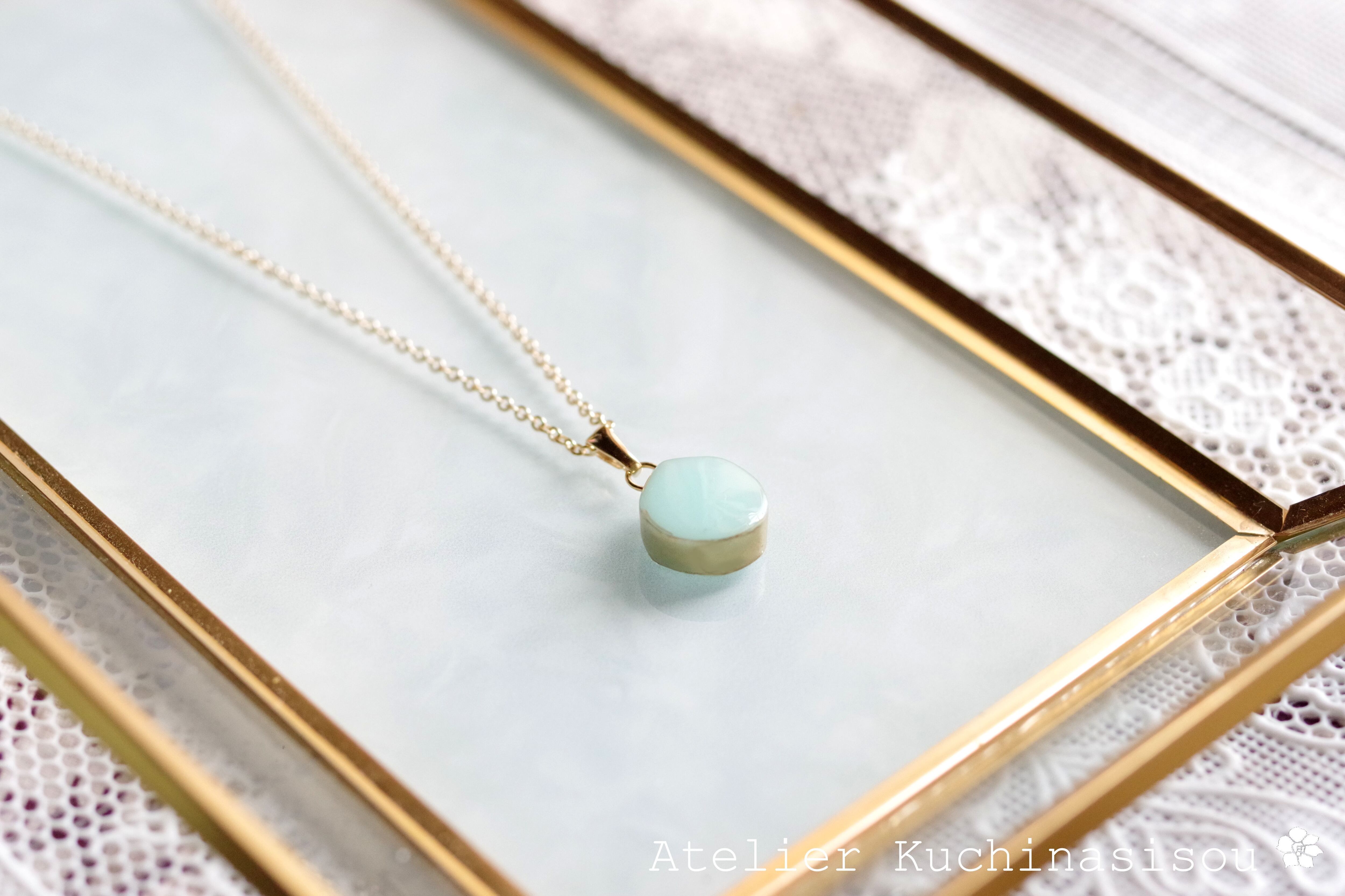 優しいグリーンに側面のゴールドが映えるペンダント。