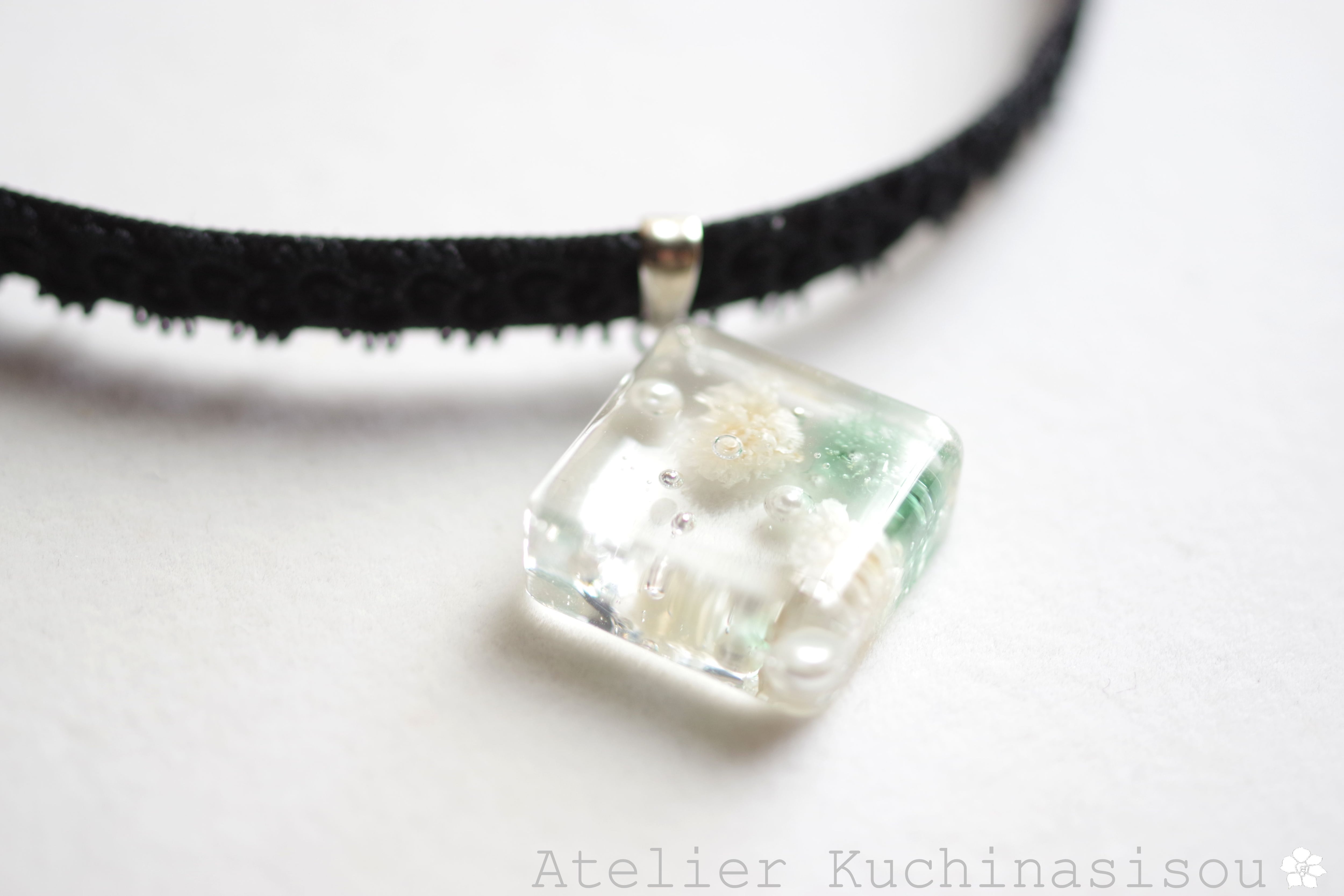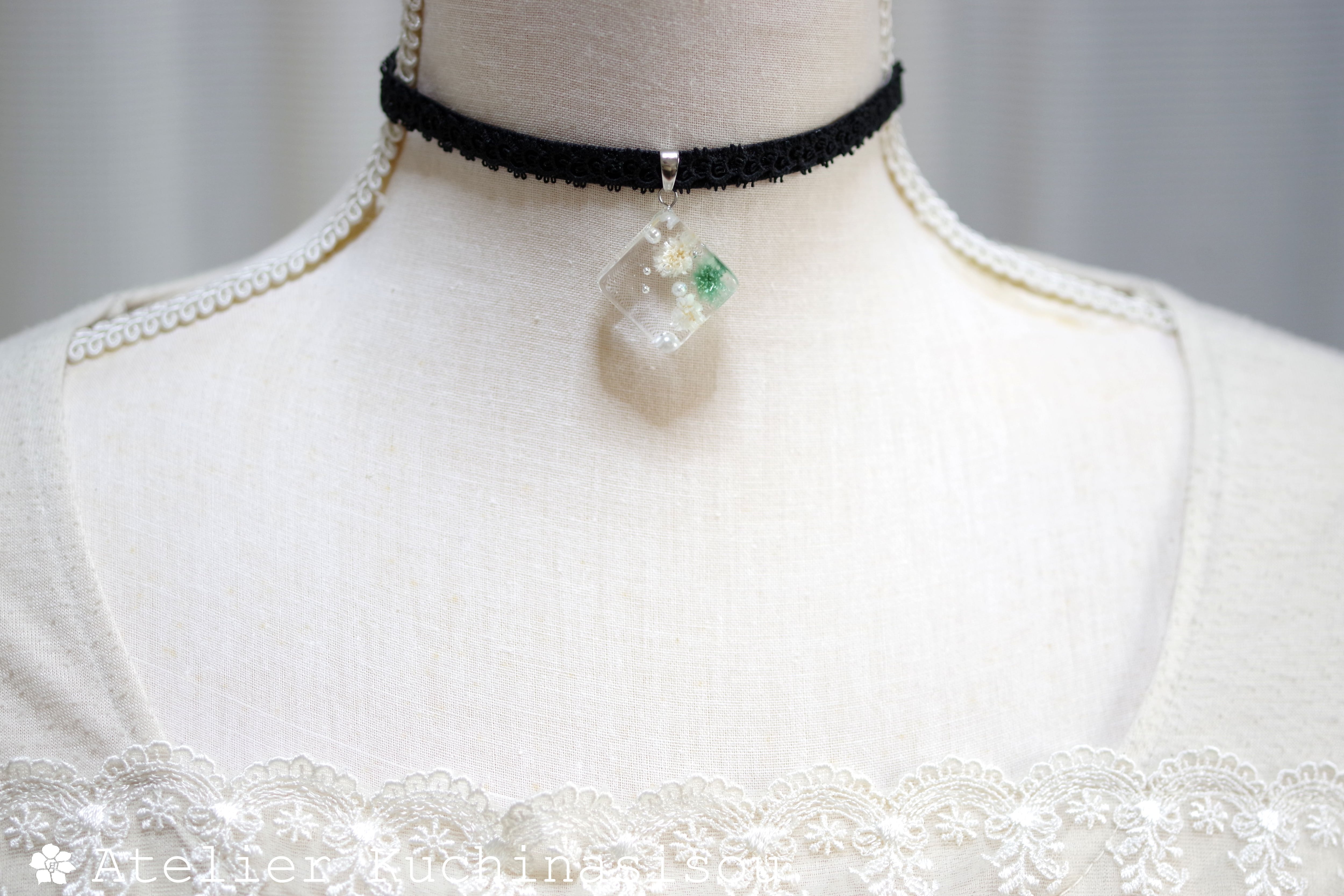 青緑とオフホワイトのお花、パール、ブリオンを沈めた四角いレジンを、ベルベットリボンにタティングレースで装飾を施したチョーカーに仕上げました。