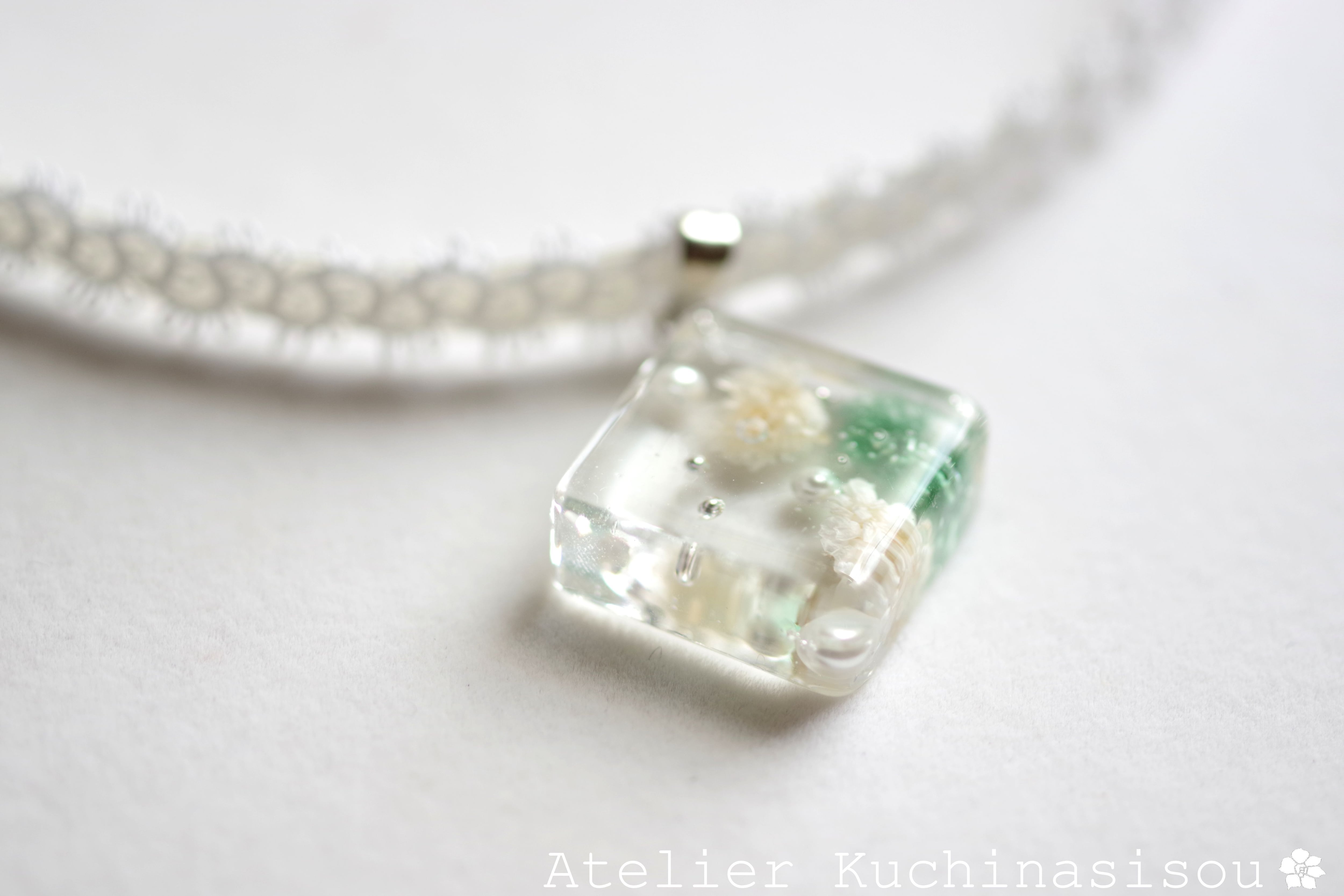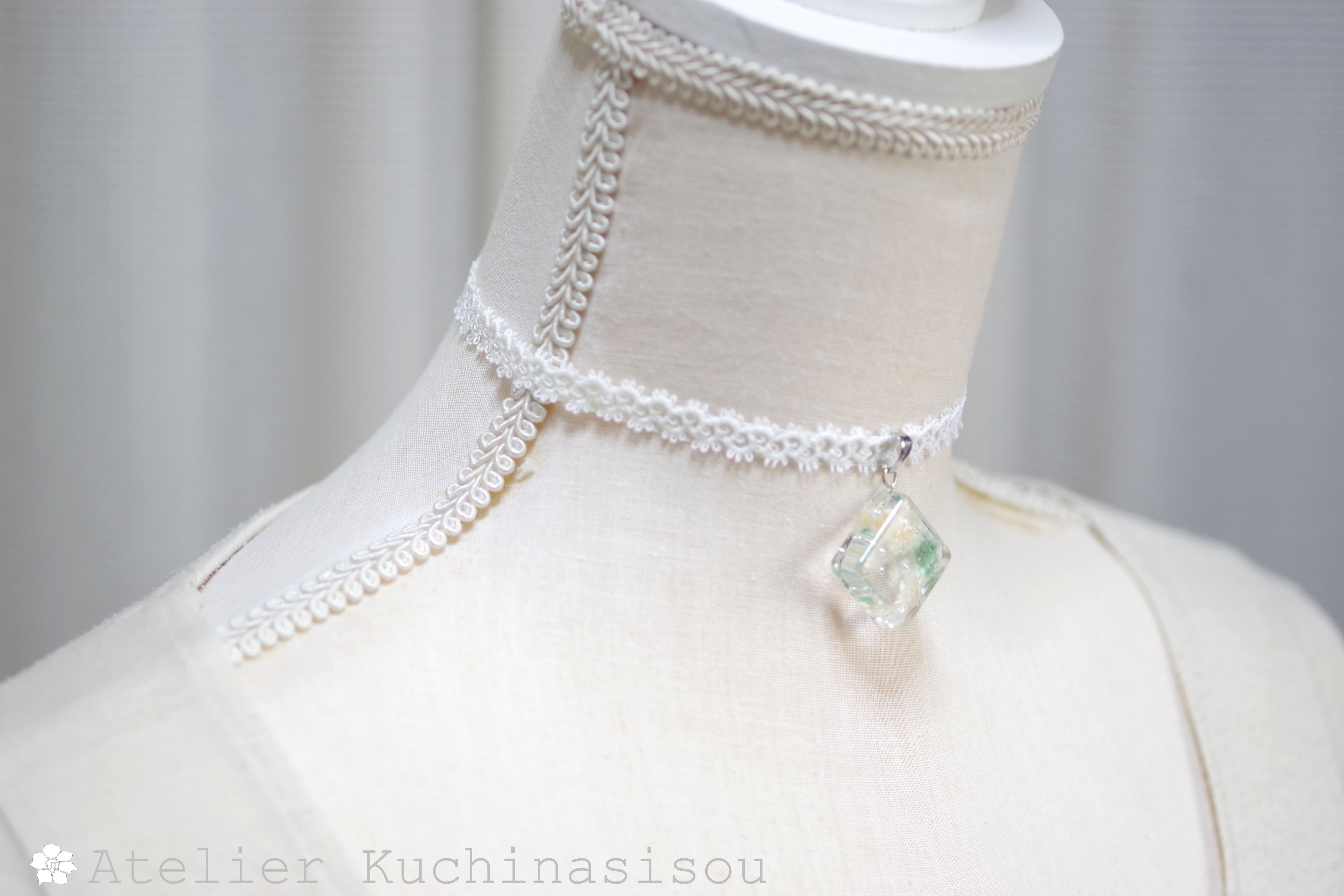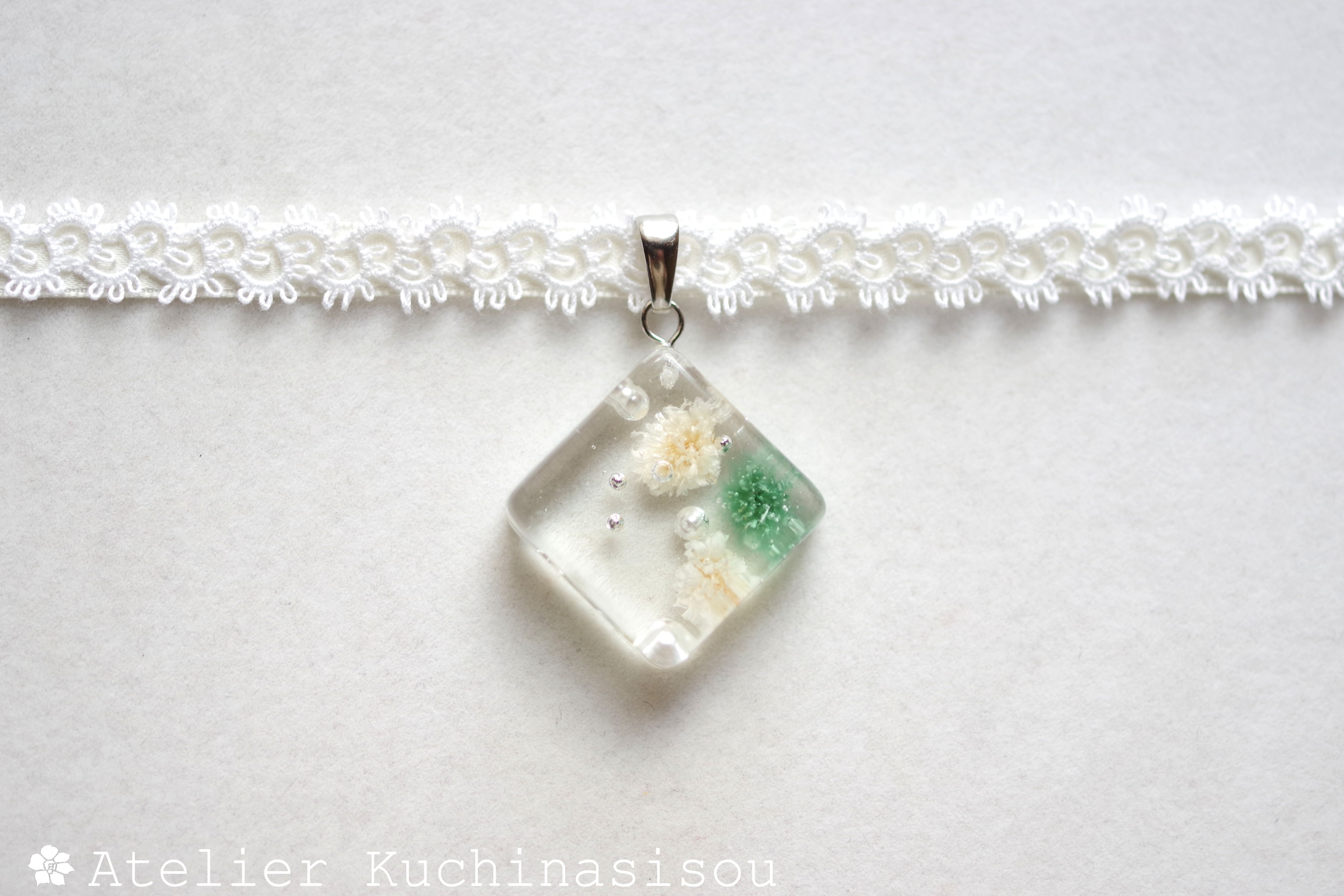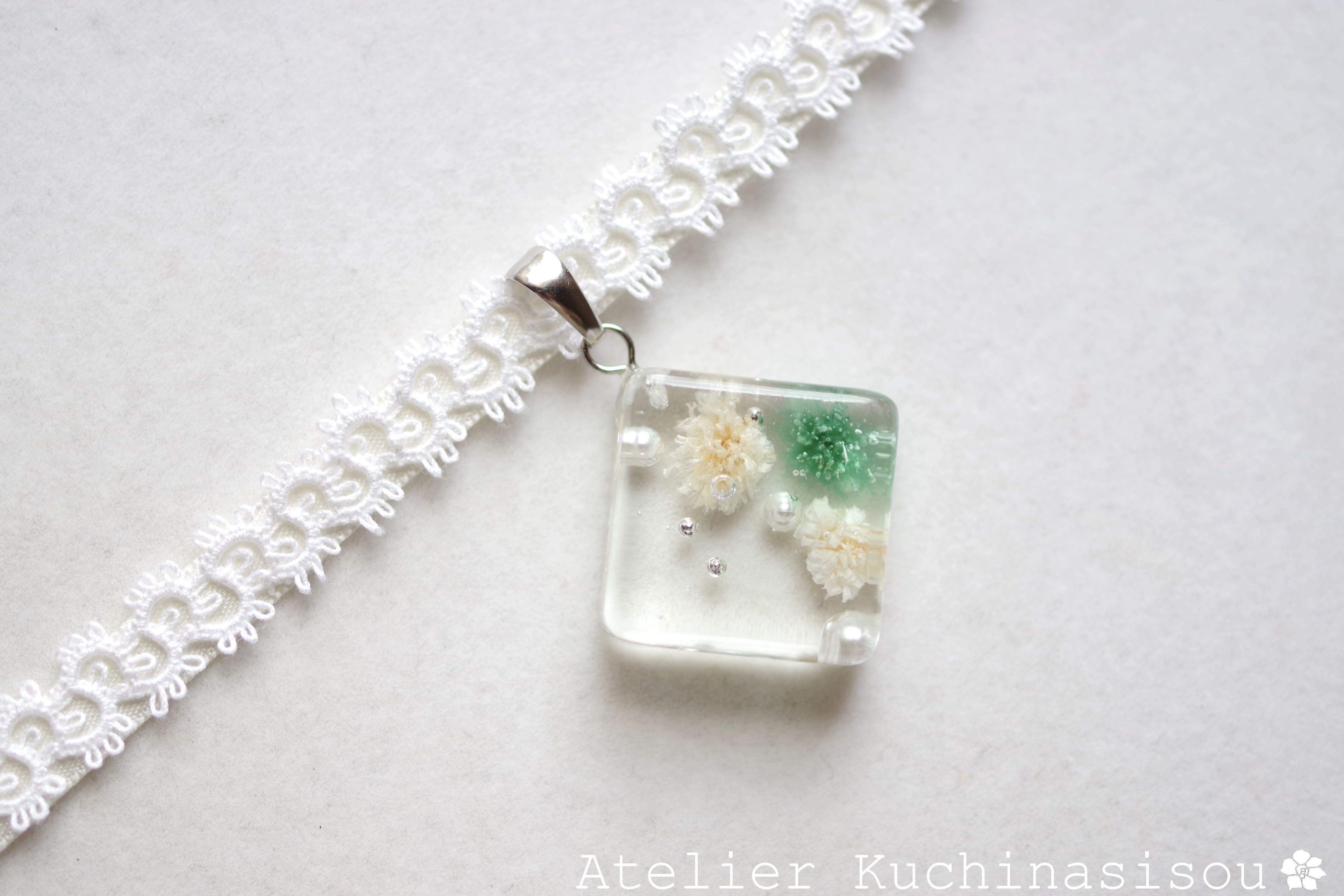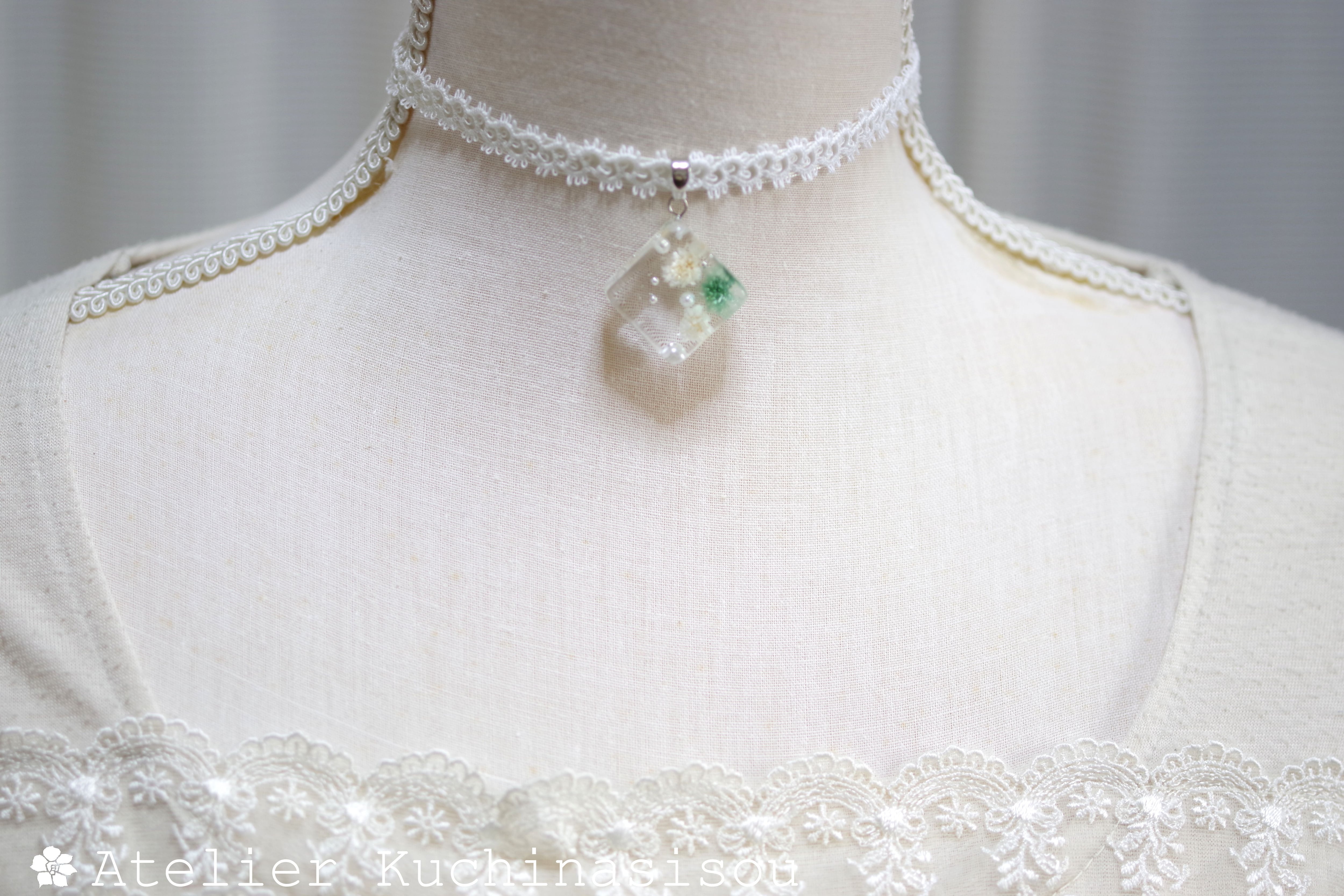 青緑とオフホワイトのお花、パール、ブリオンを沈めた四角いレジンを、サテンリボンにタティングレースで装飾を施したチョーカーに仕上げました。