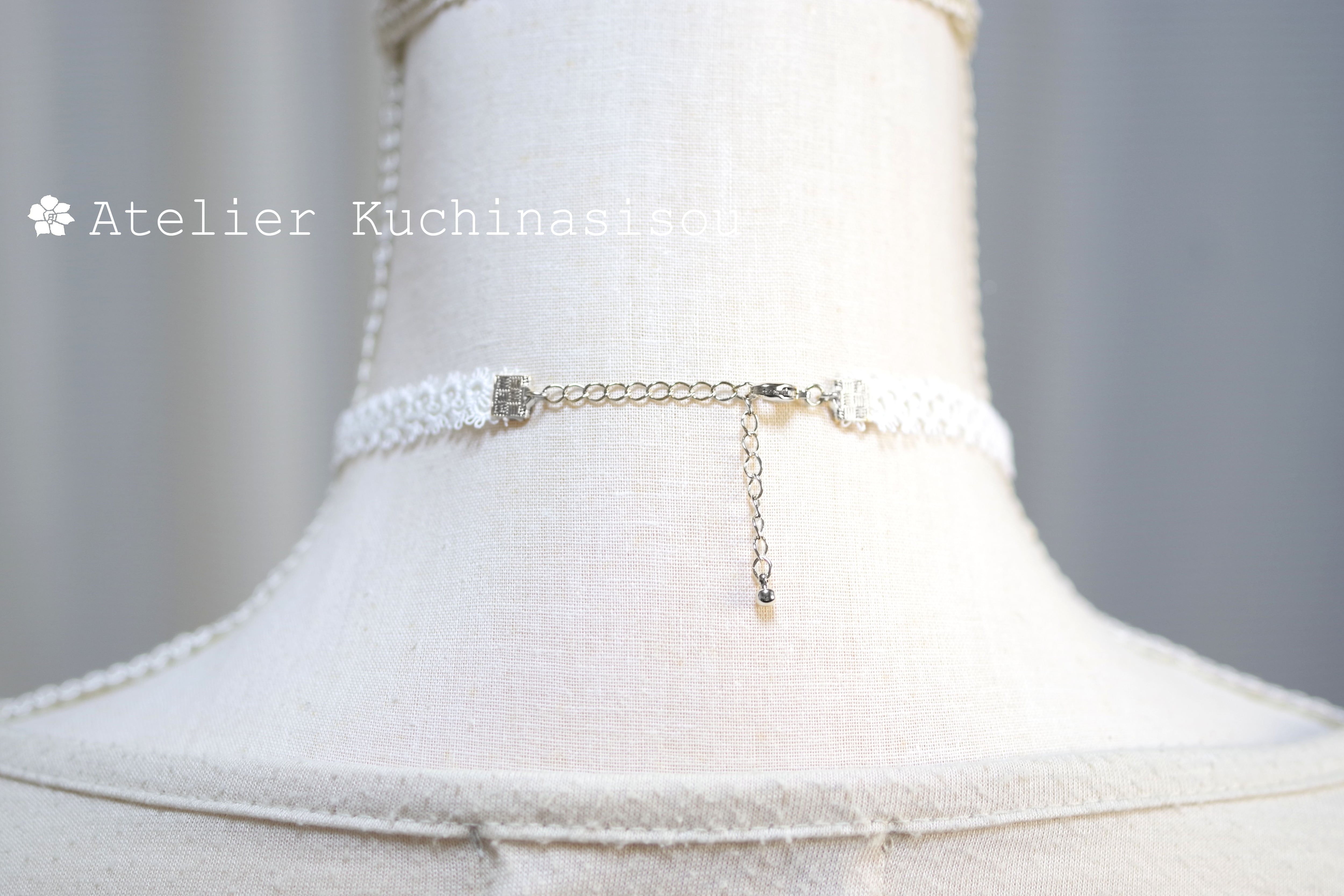 白のレースとリボンが上品で清楚な印象を与えるチョーカー。