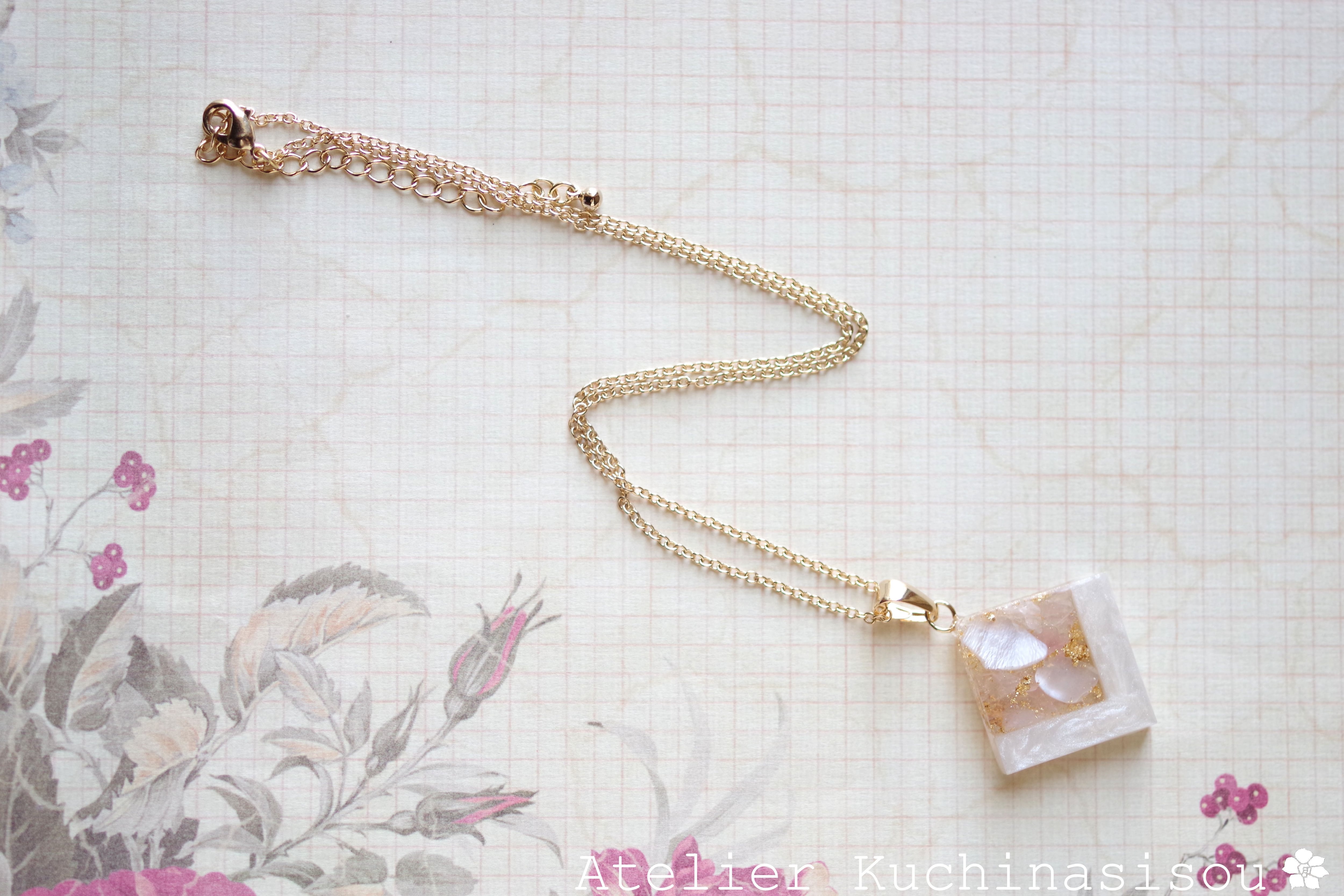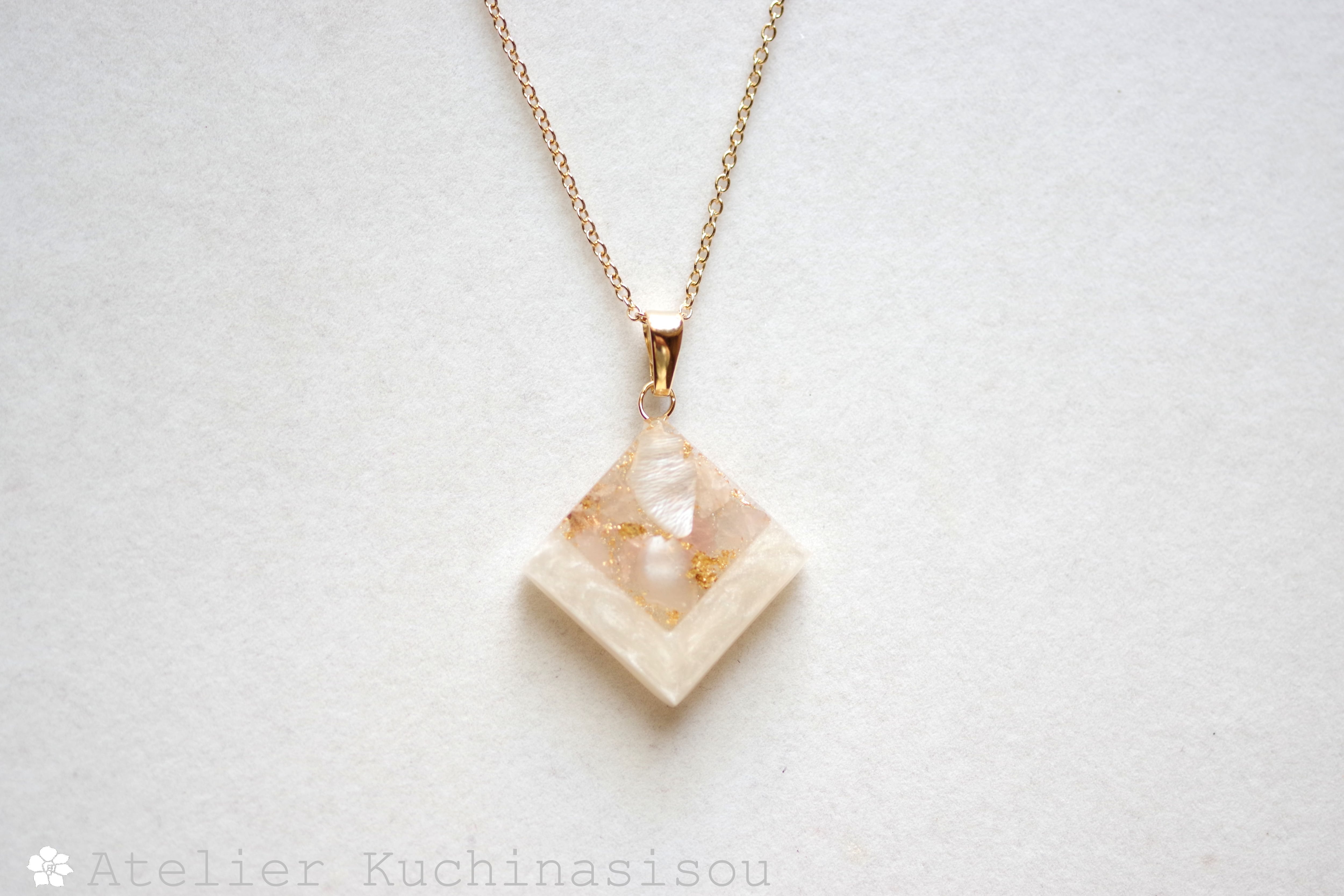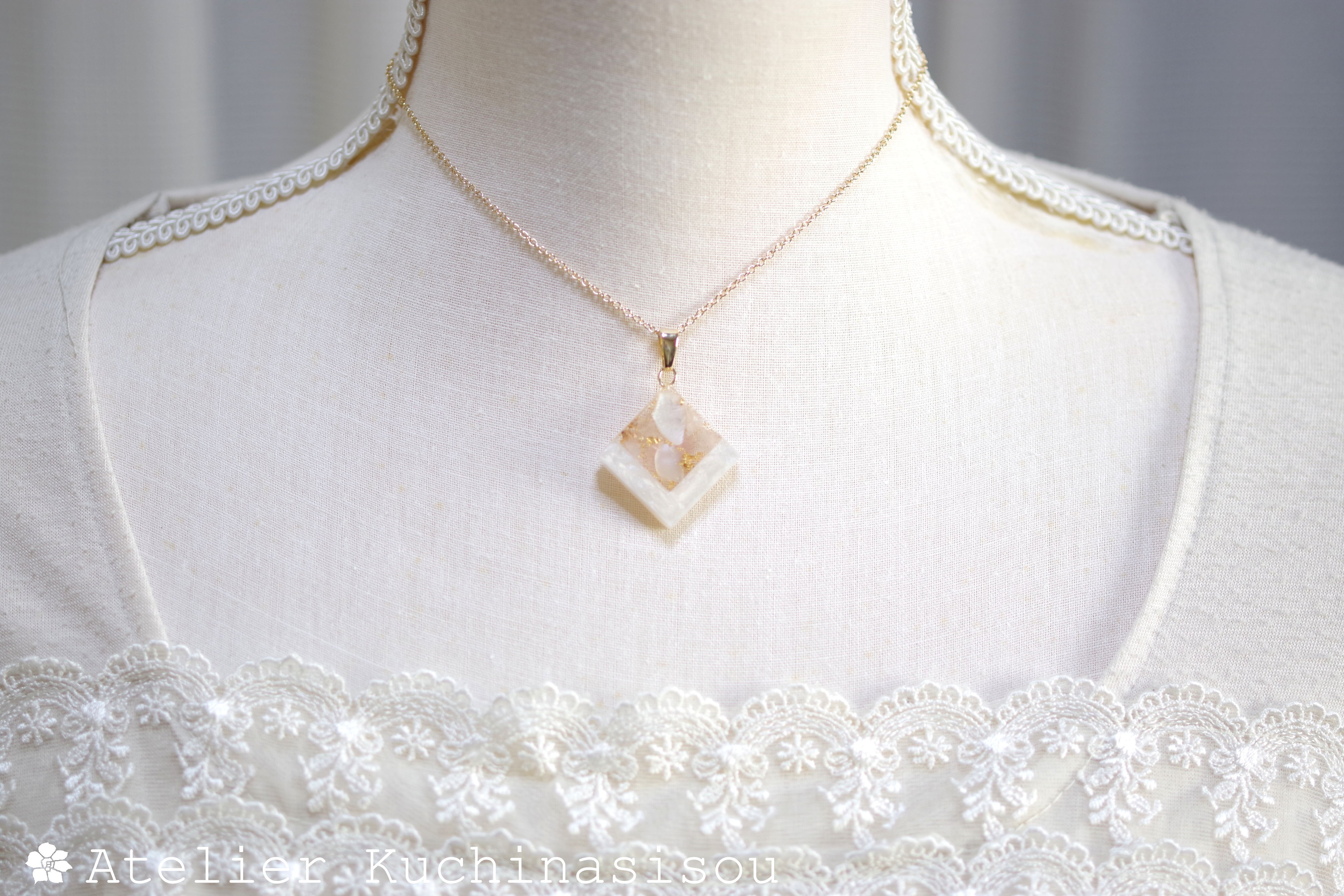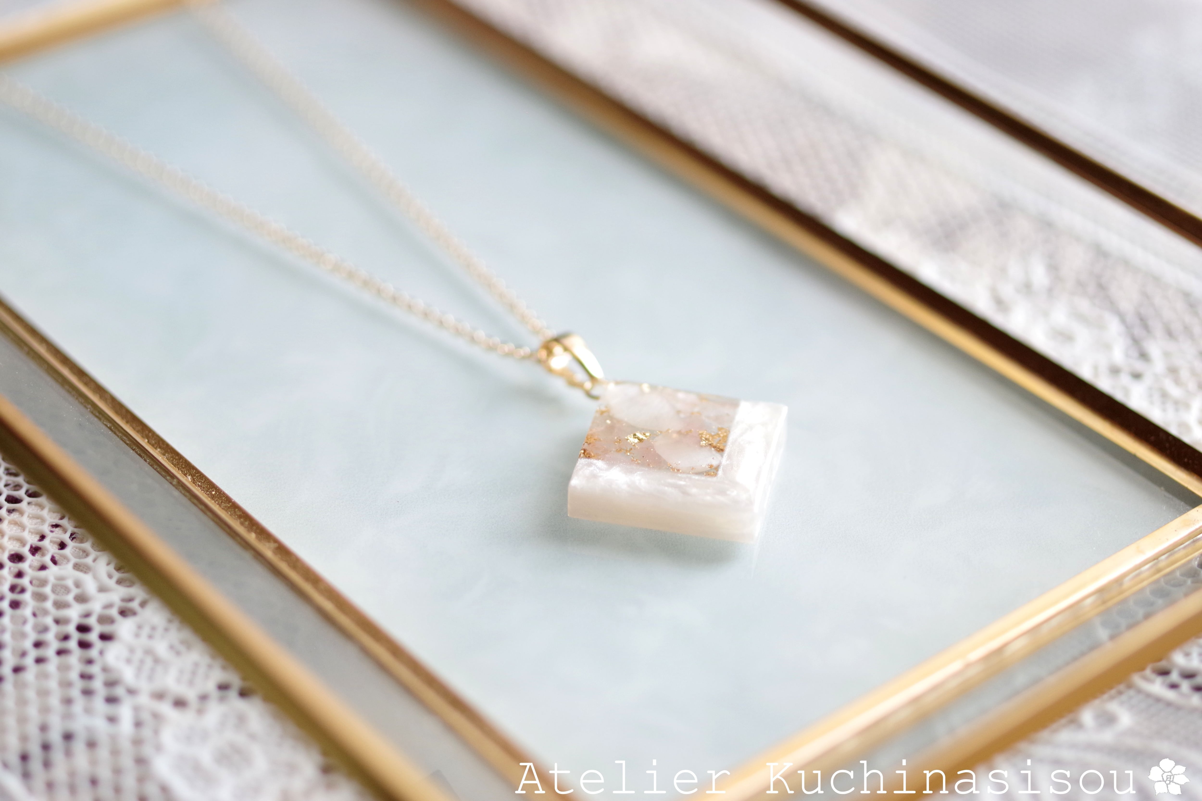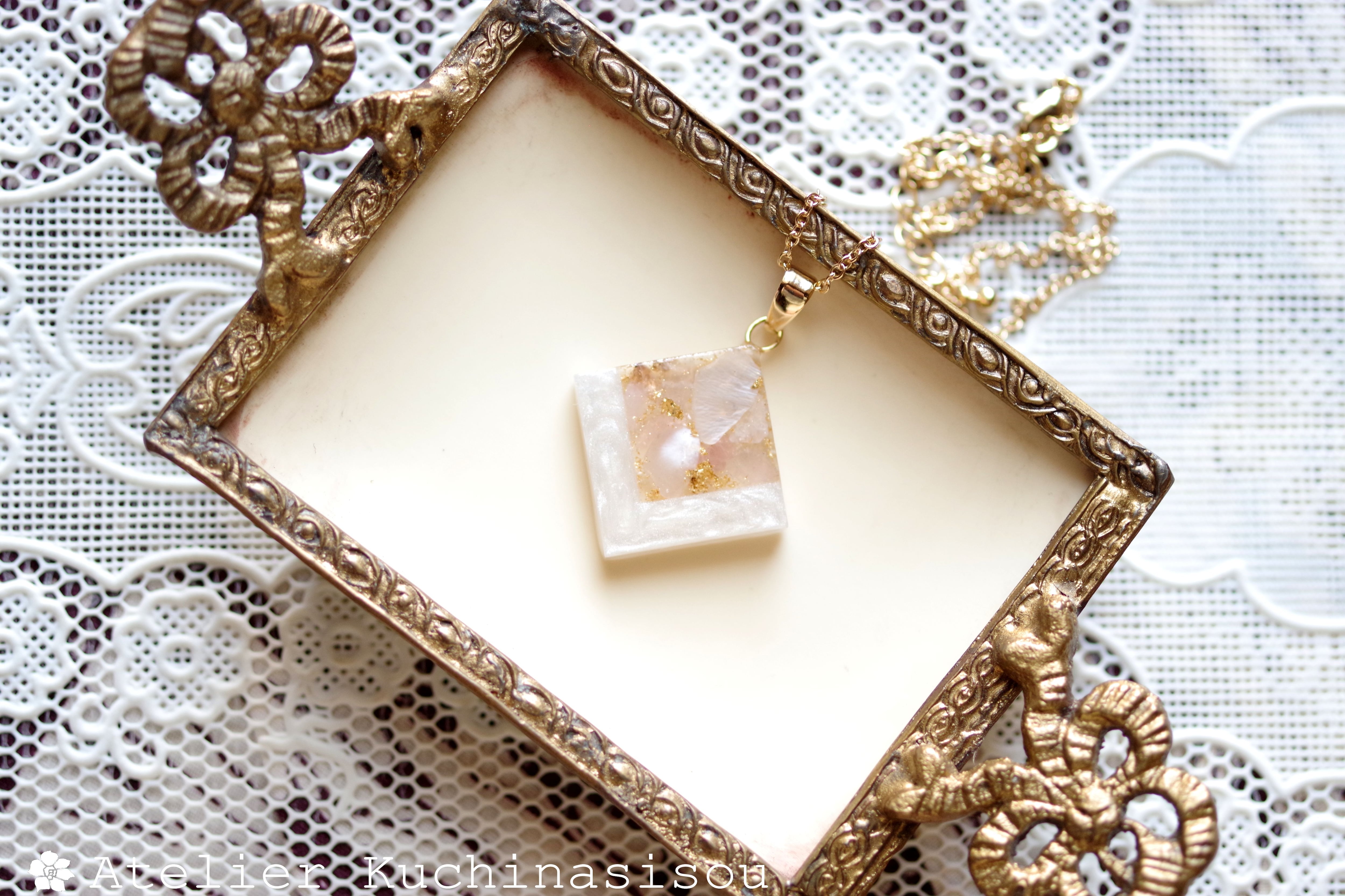 透明のレジンにホワイトシェルとローズクォーツのさざれを沈め、光沢のあるホワイトで囲ったペンダント。