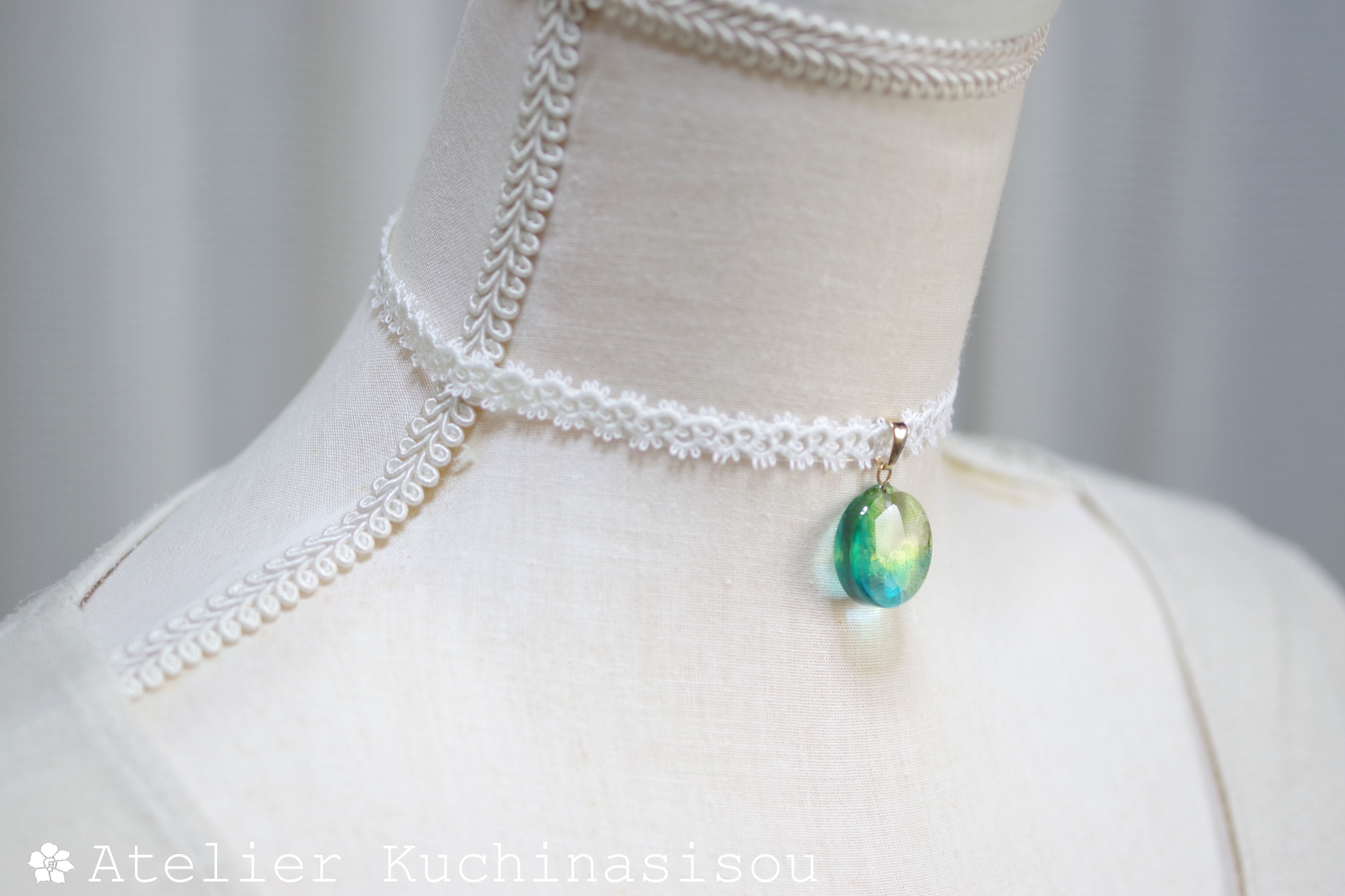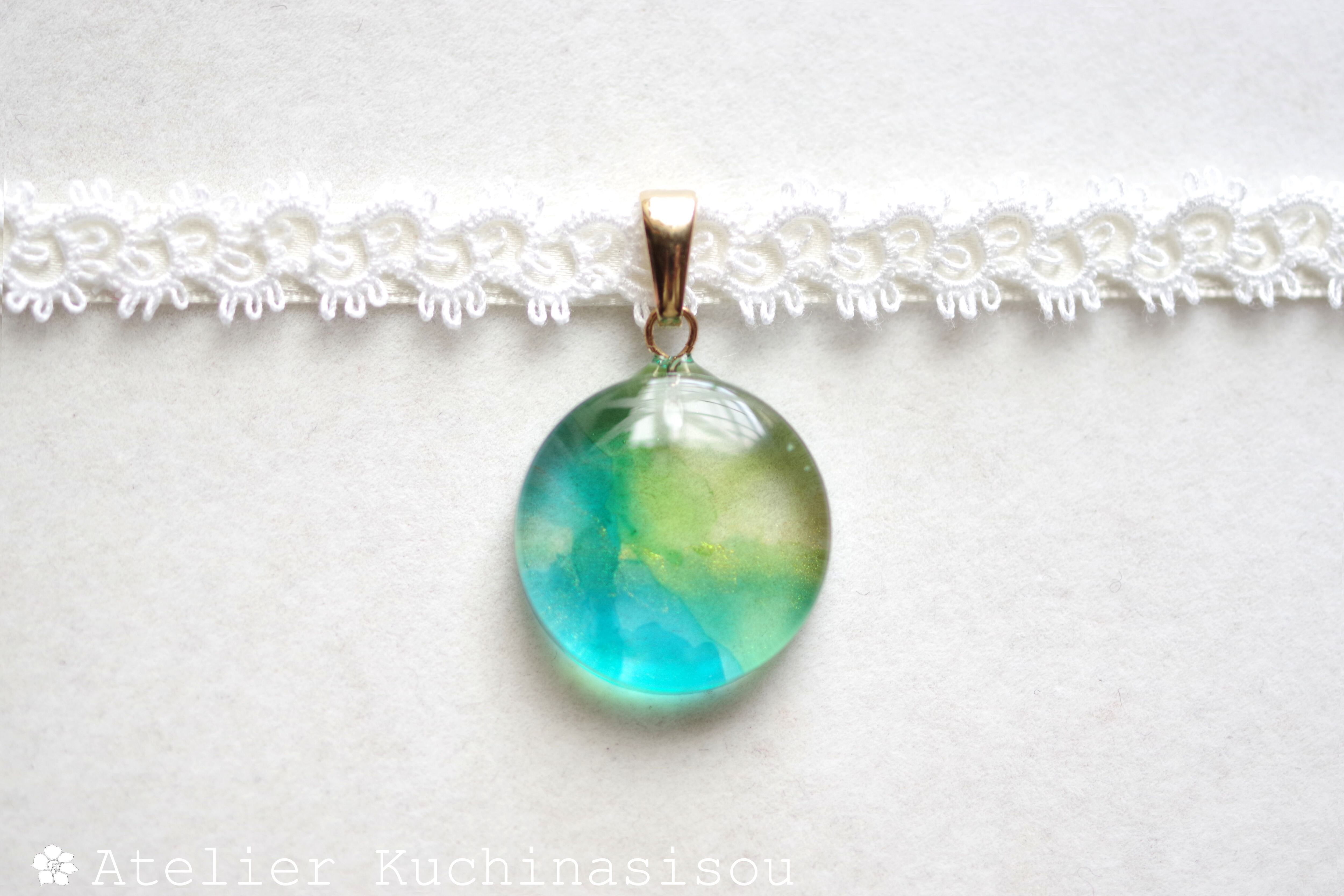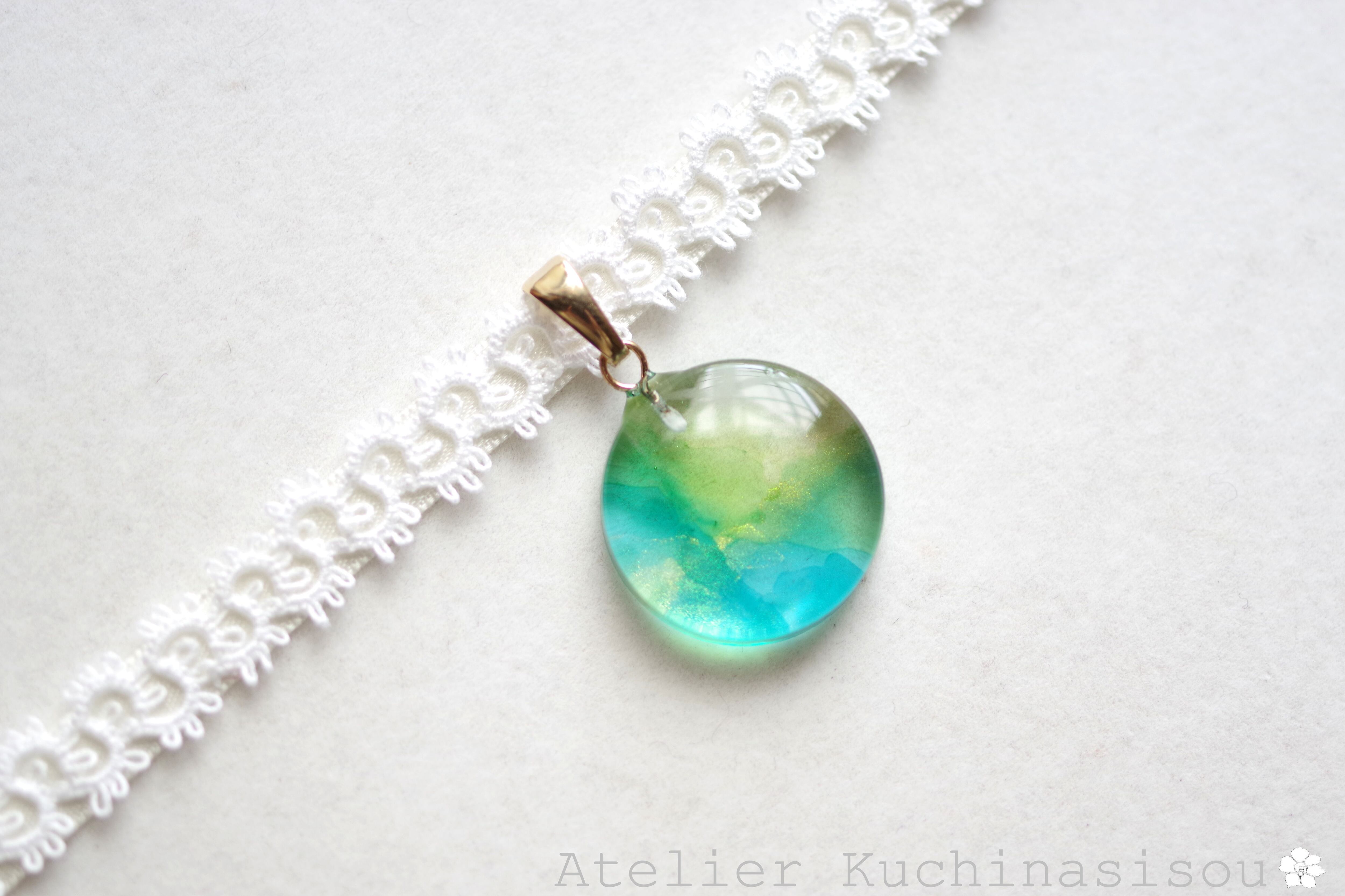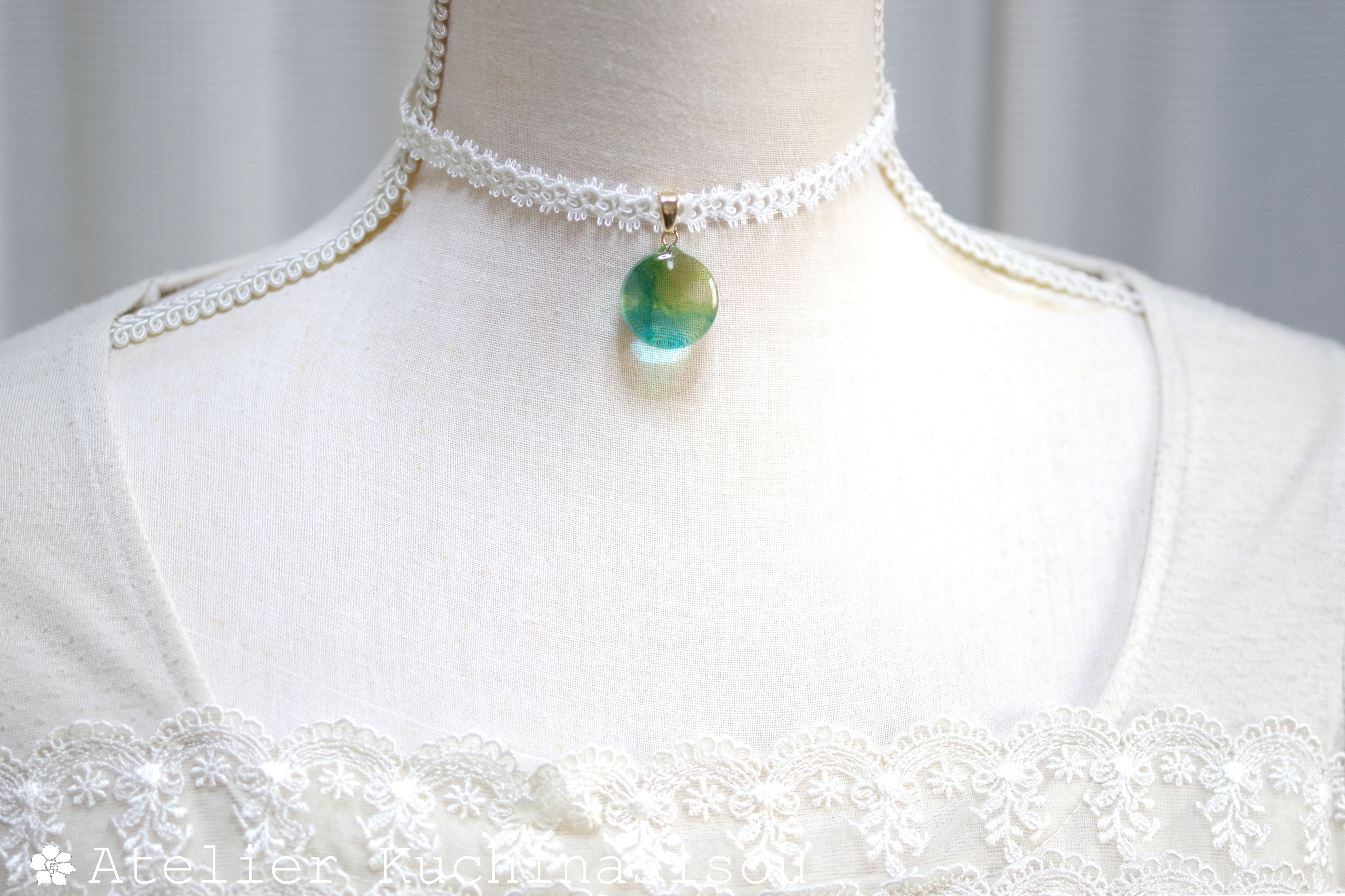 水彩絵の具で描いたような涼やかな濃淡あるブルーとグリーンのニュアンスが爽やかなレジンを、サテンリボンにタティングレースで装飾を施したチョーカーに仕上げました。