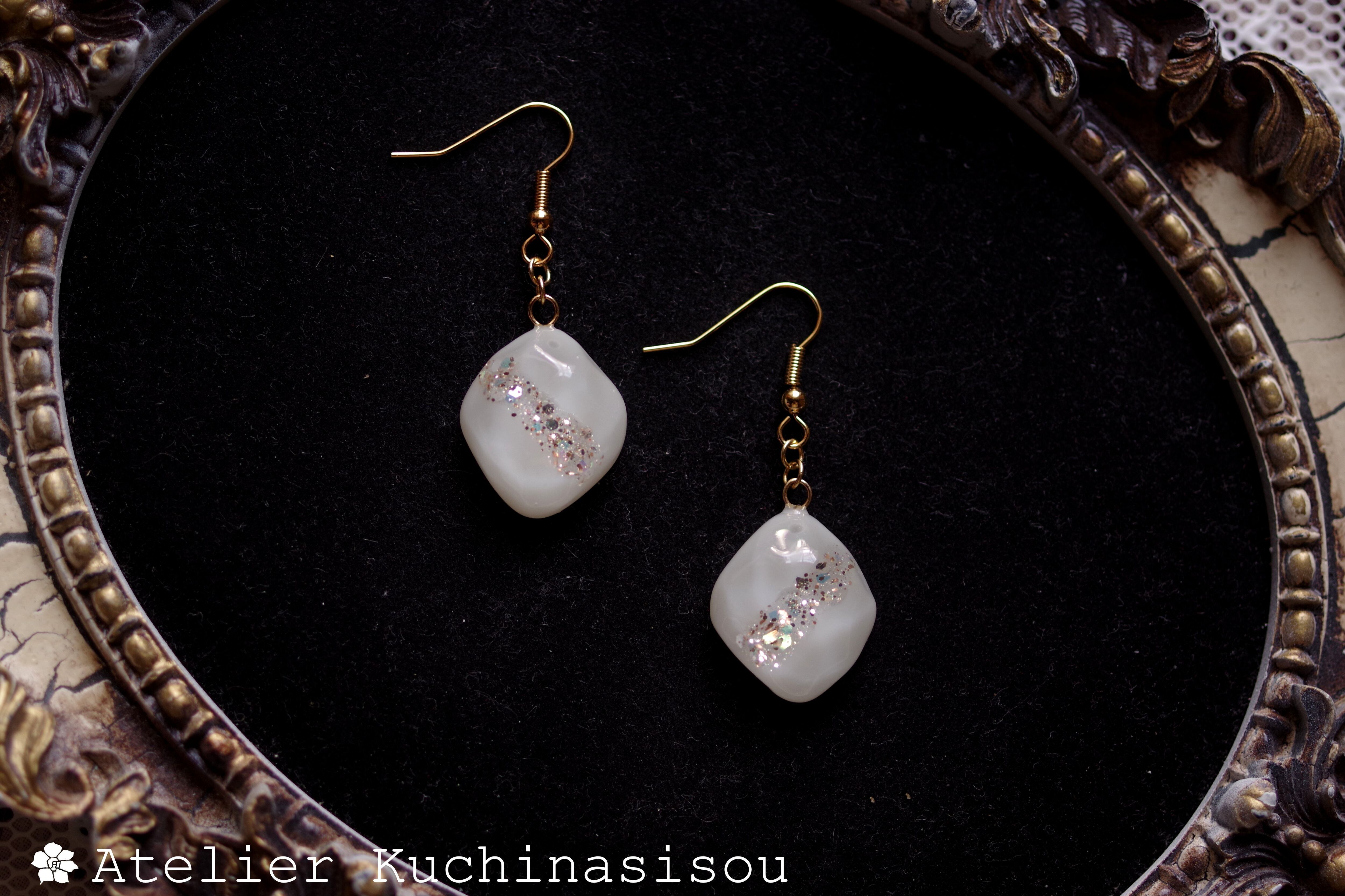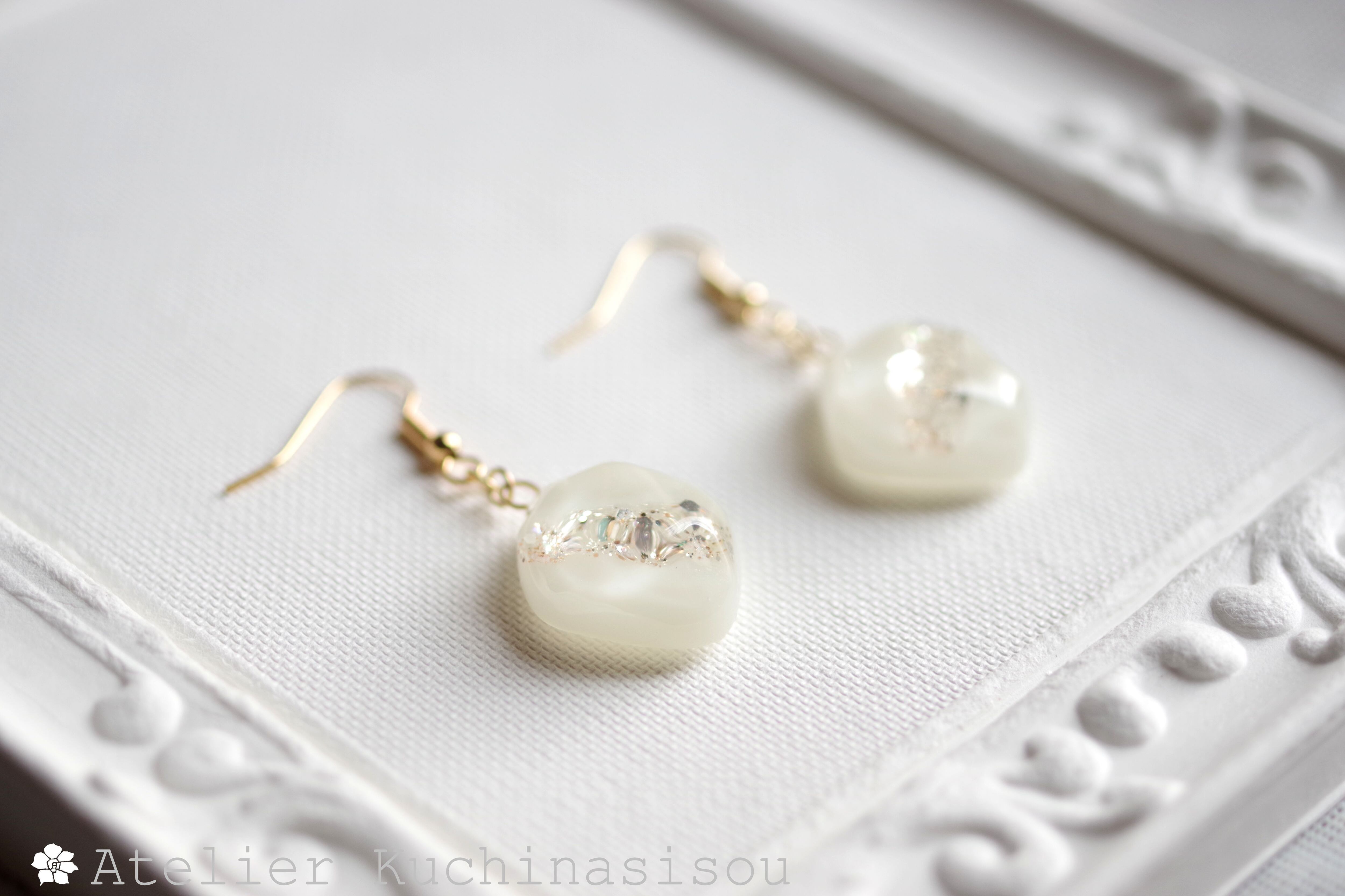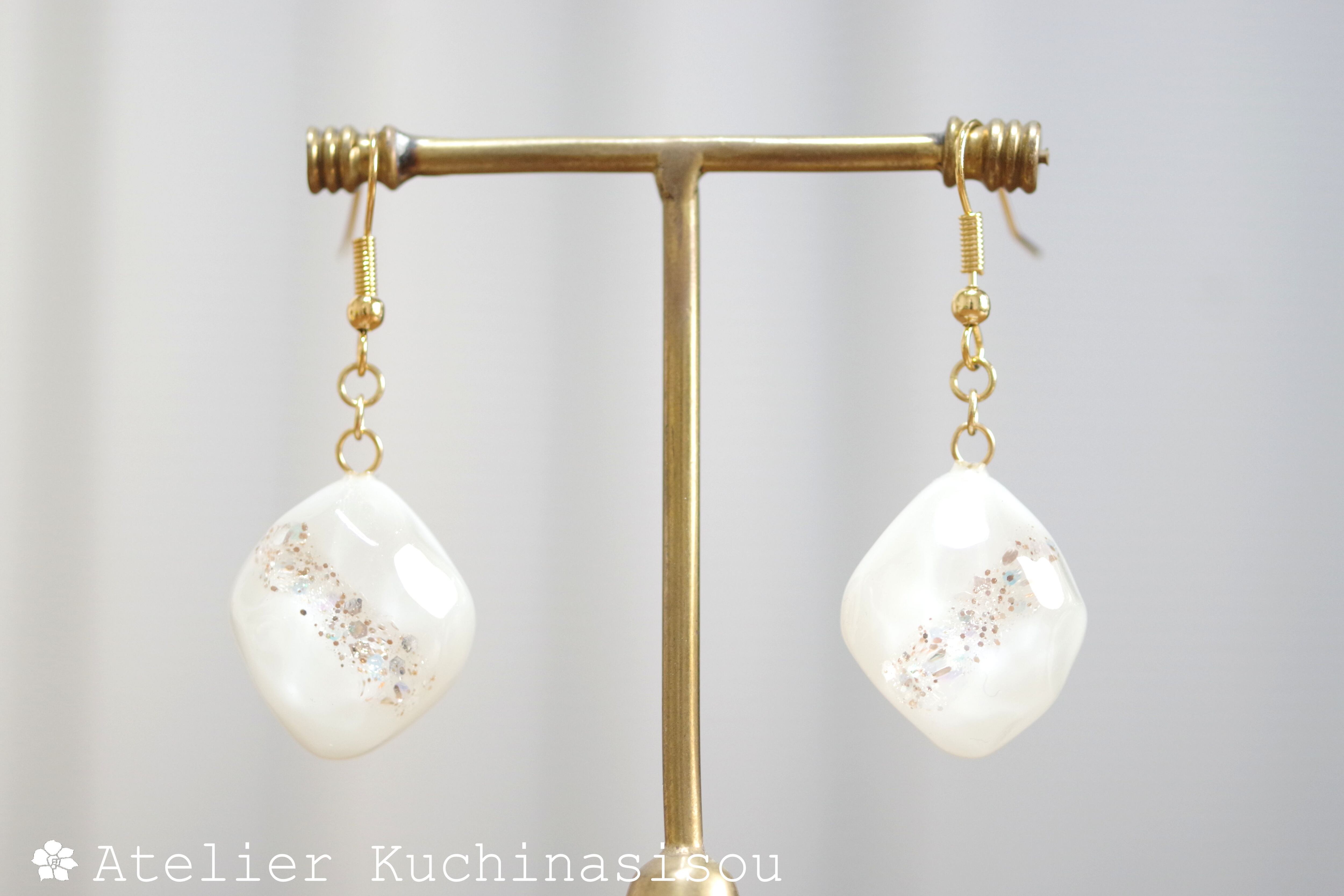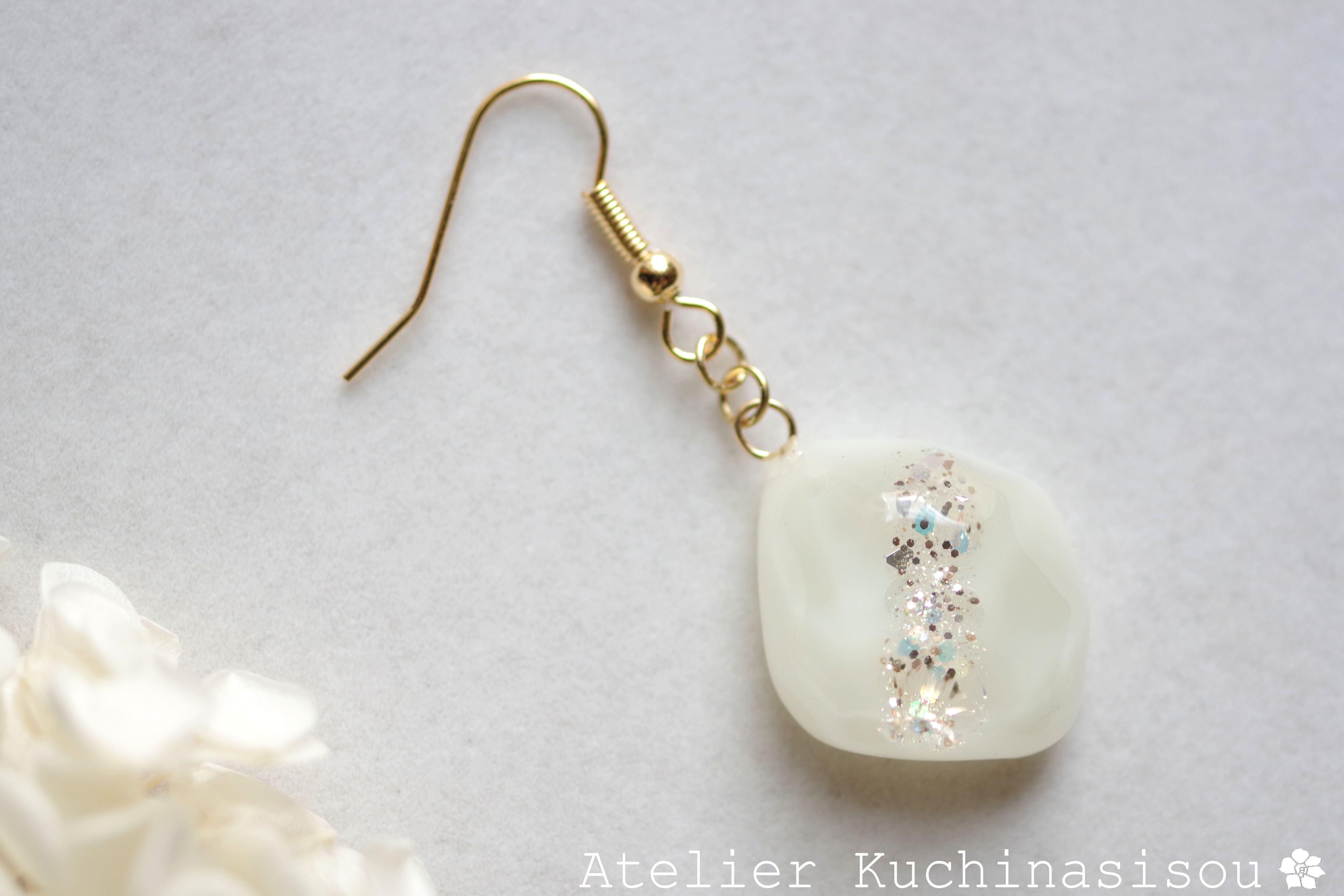 あたたかみのあるオフホワイトを背景に天の川のようにラメを一筋走らせた、シンプルなピアス。