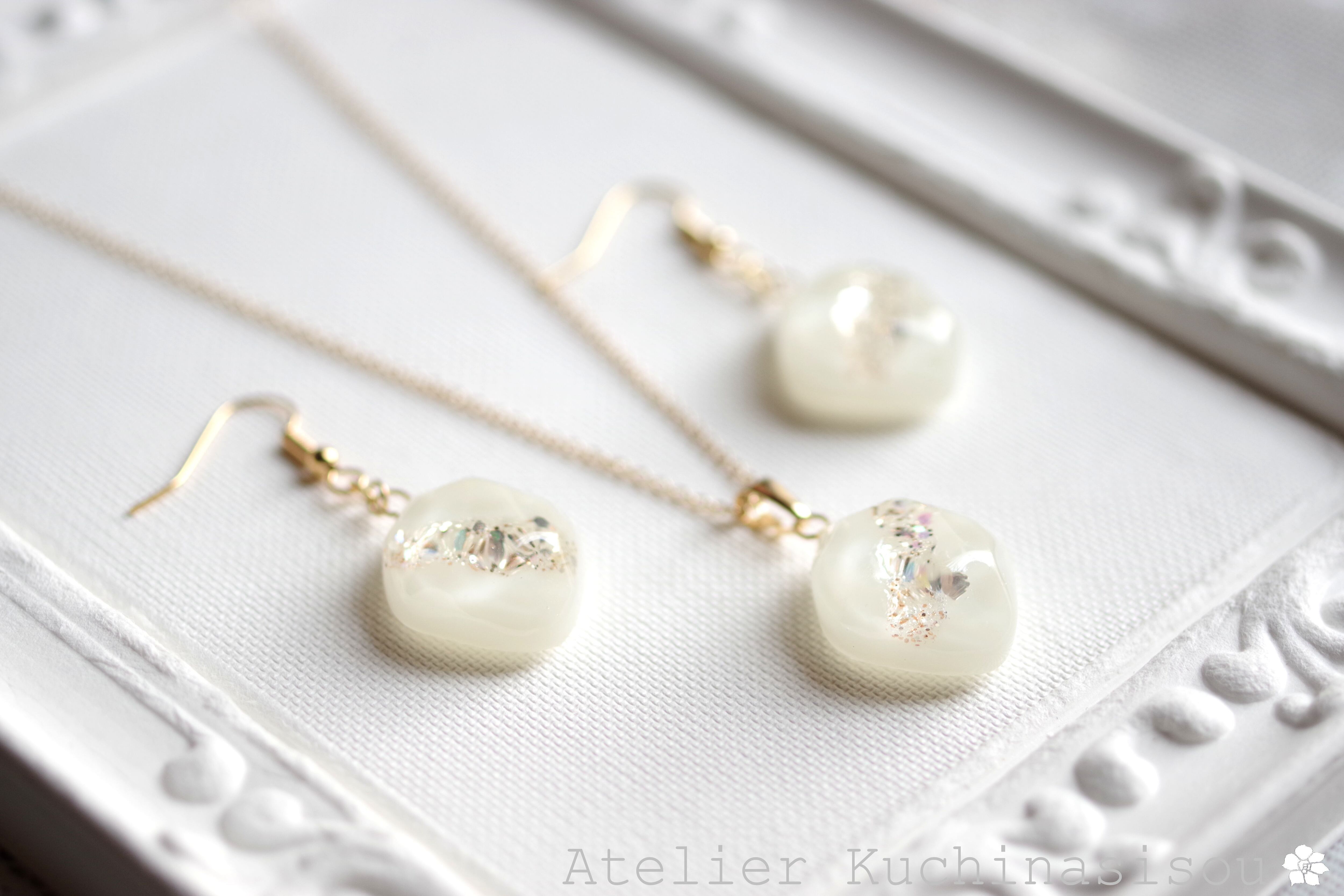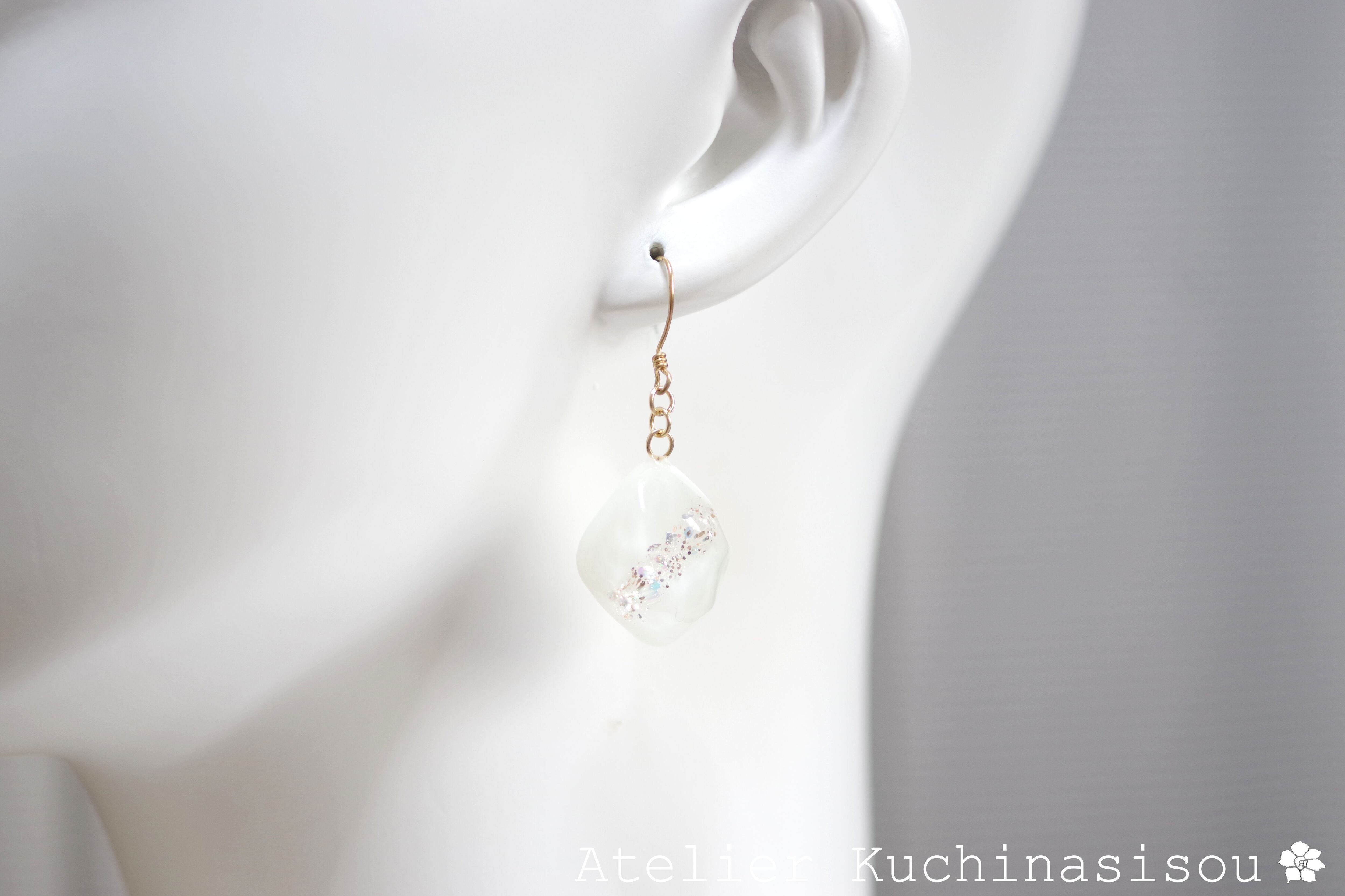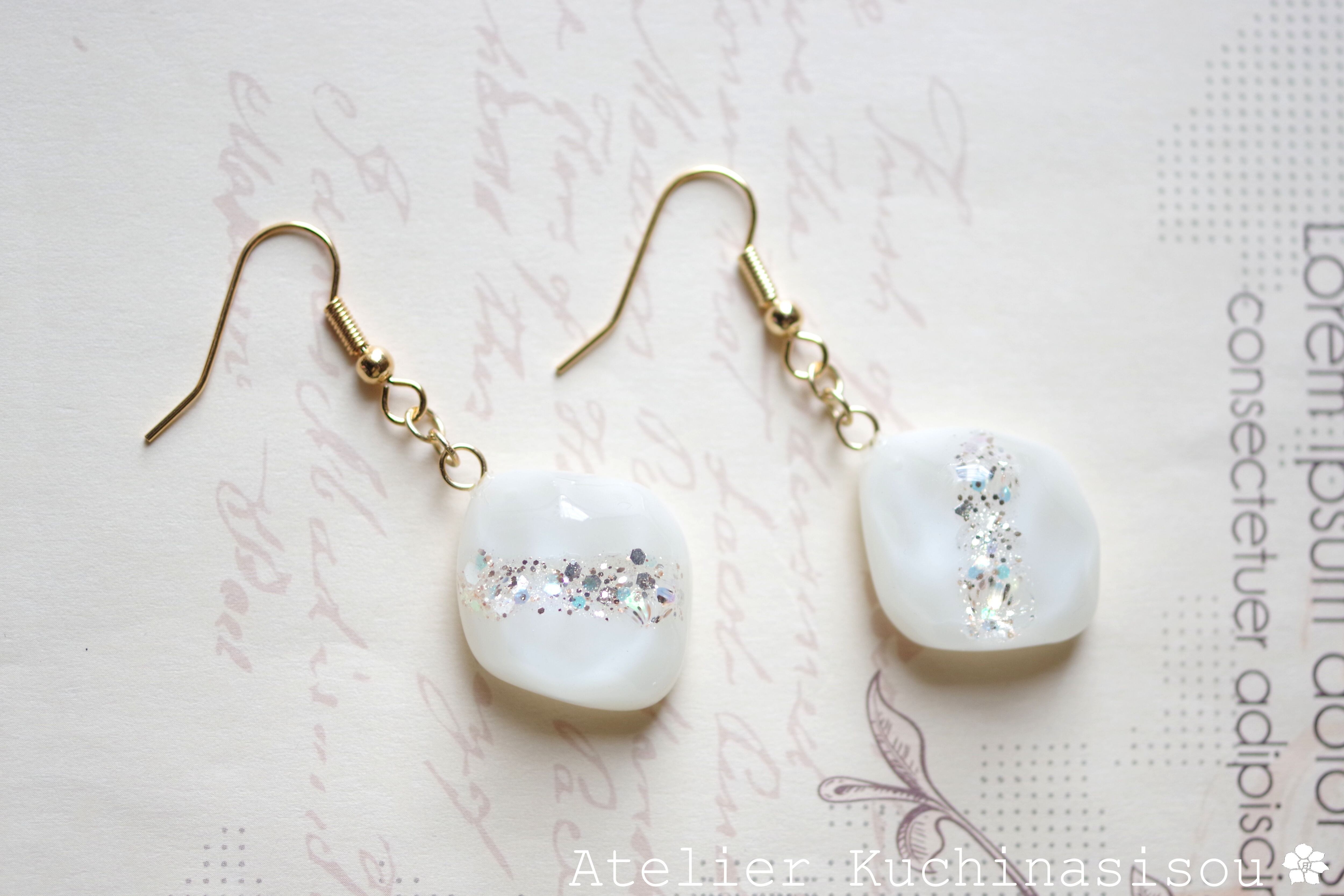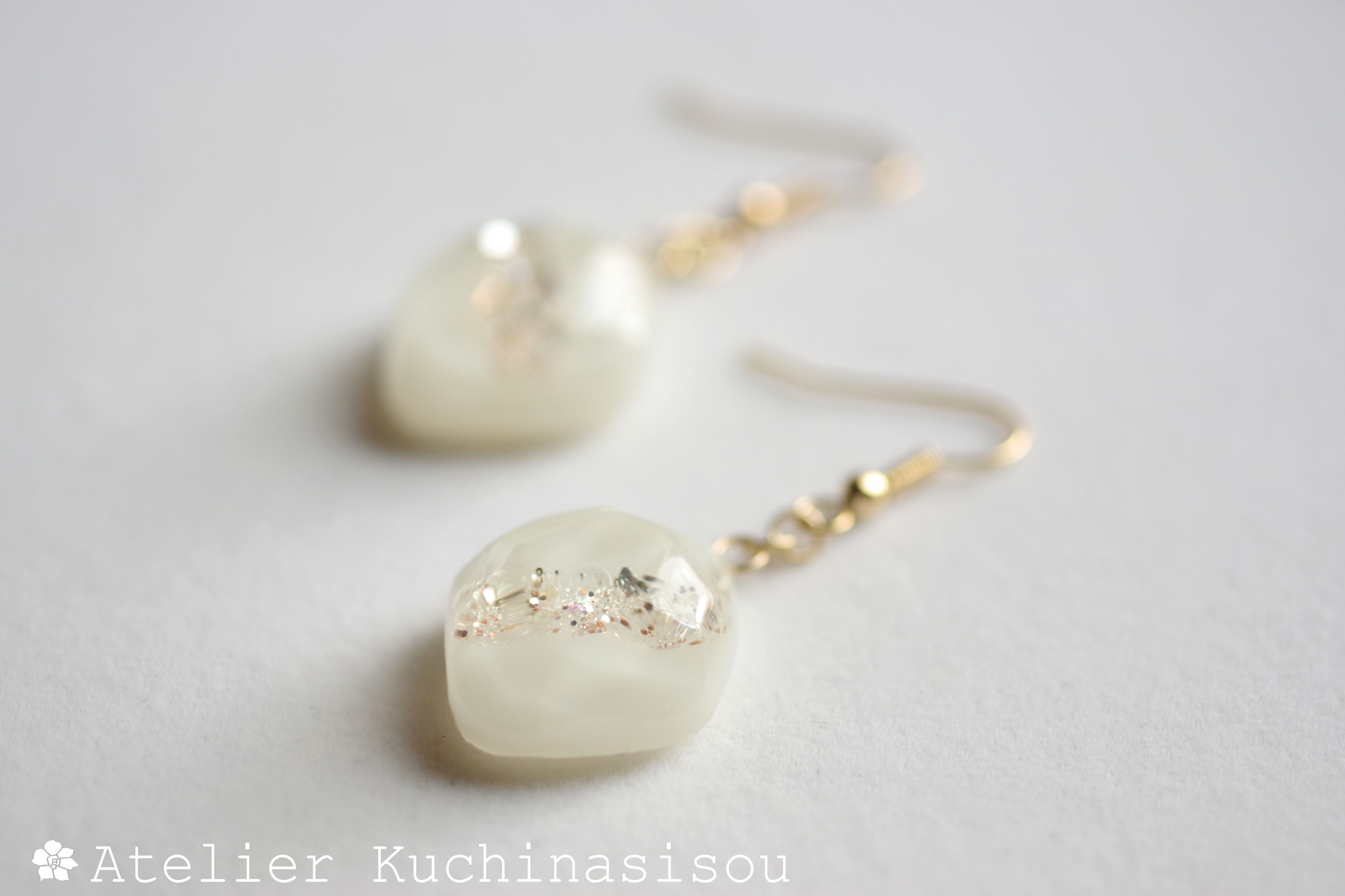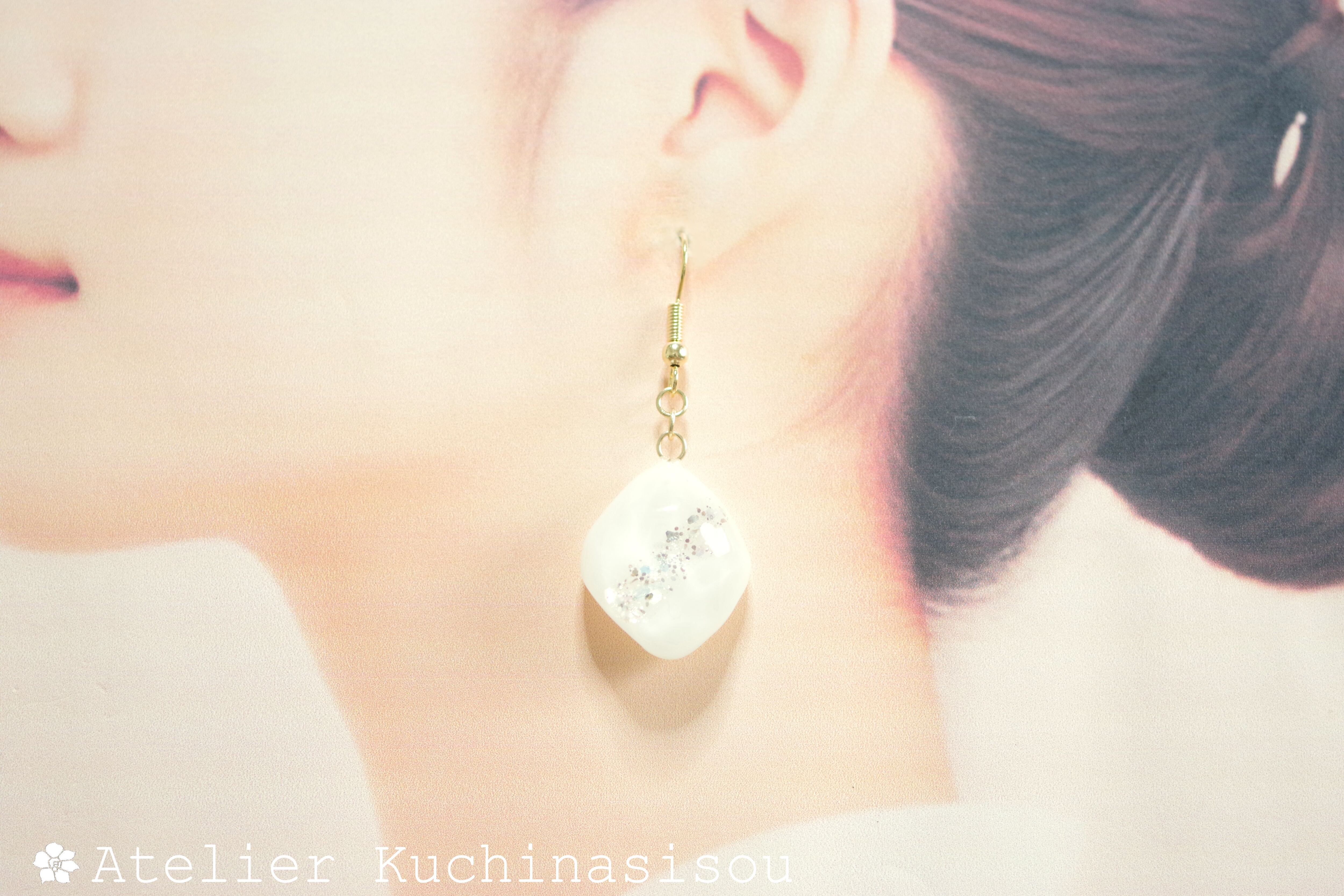 あたたかみのあるオフホワイトを背景に天の川のようにラメを一筋走らせた、シンプルなピアス。