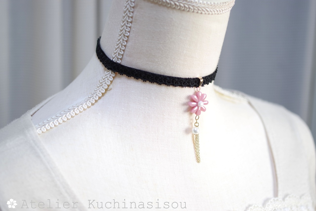 中心の花芯とコットンパールの光沢のある輝きが上品なチョーカー。