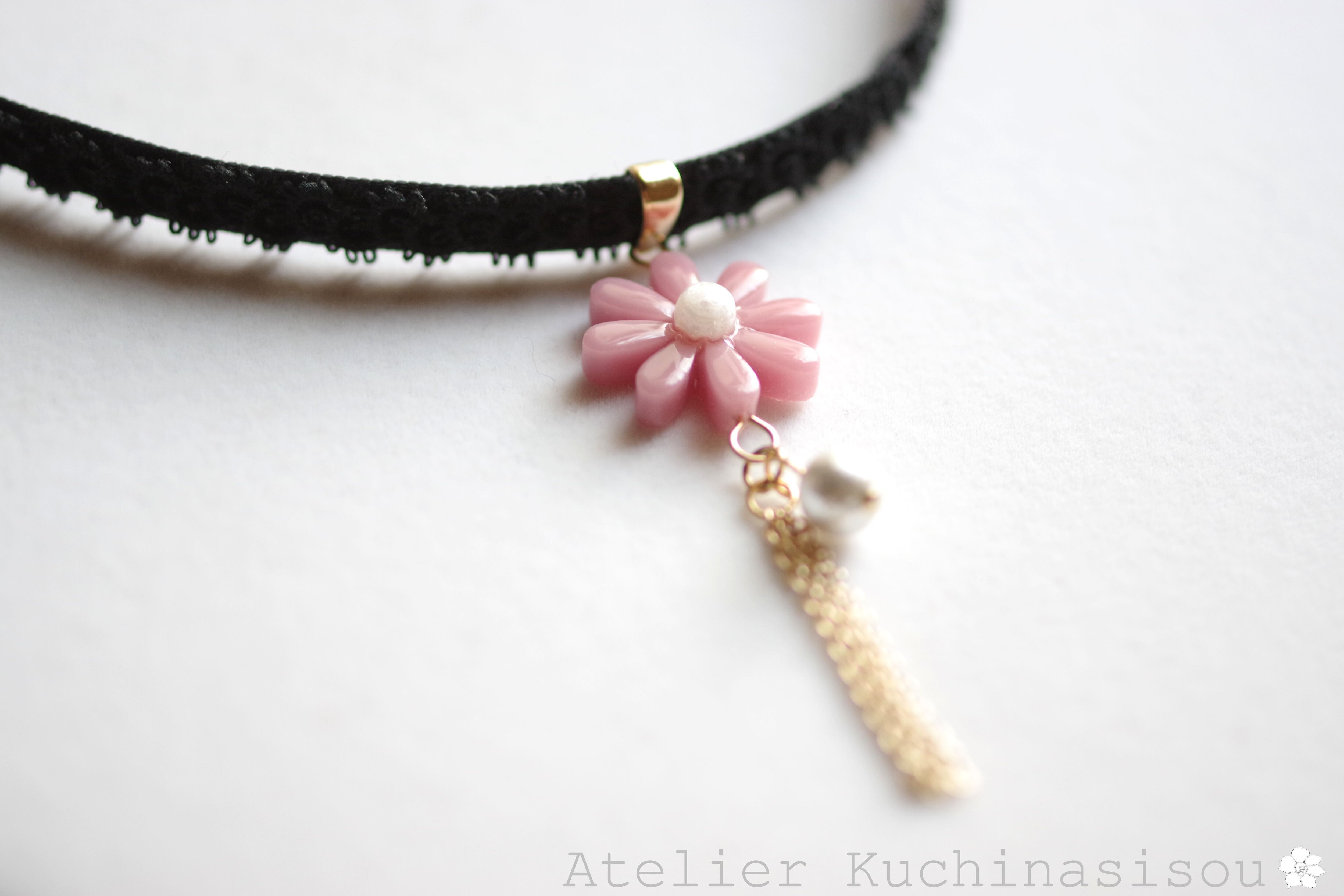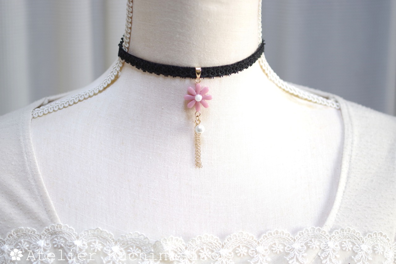 こっくりしたピンクのお花モチーフのレジンを、ベルベットリボンにタティングレースで装飾を施したチョーカーに仕上げました。