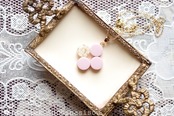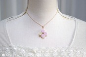 不透明なピンクの粒を三つ、そしてお花にパール、ブリオンを沈めた透明の粒を一つアクセントに連ねた、可憐なペンダントです。