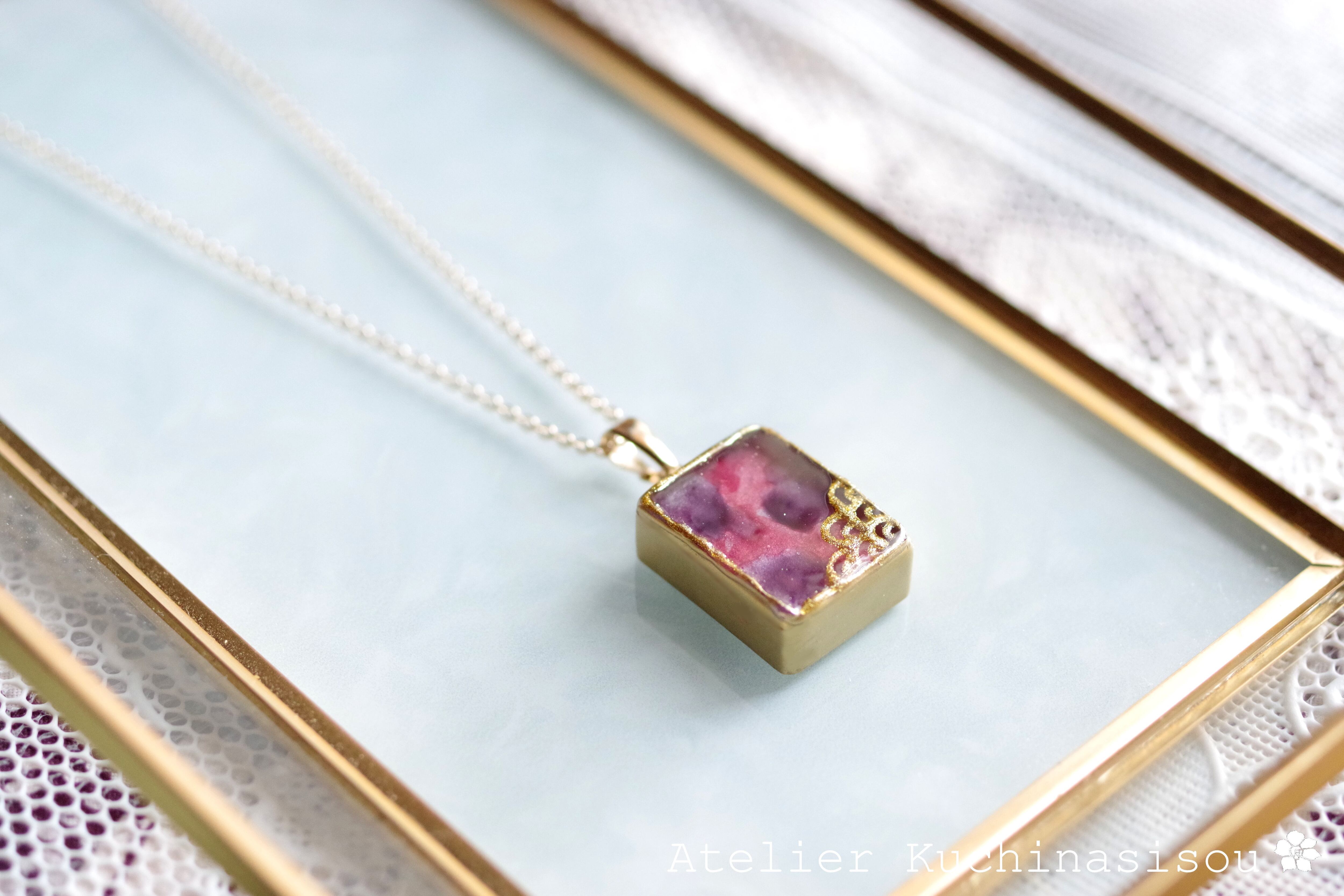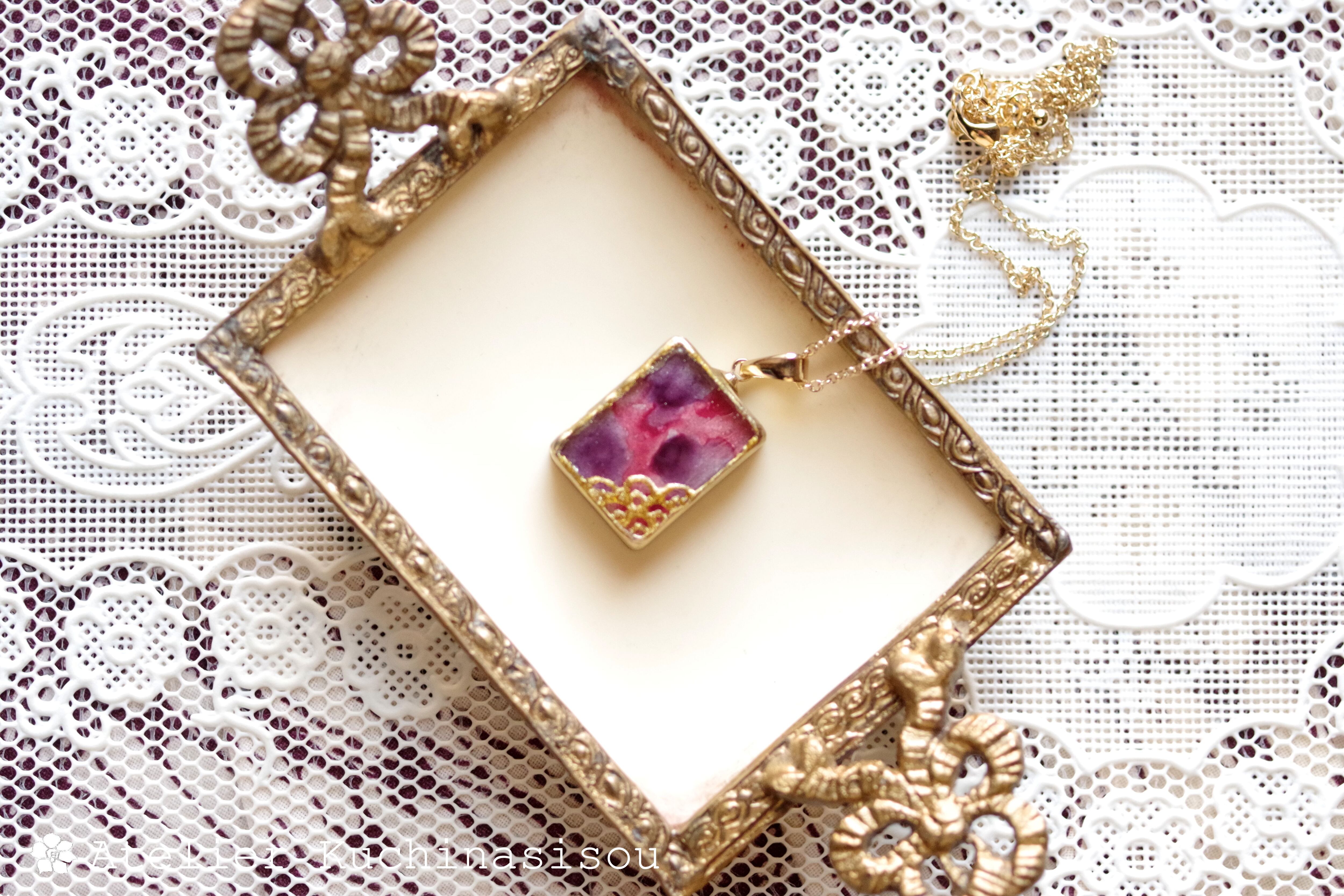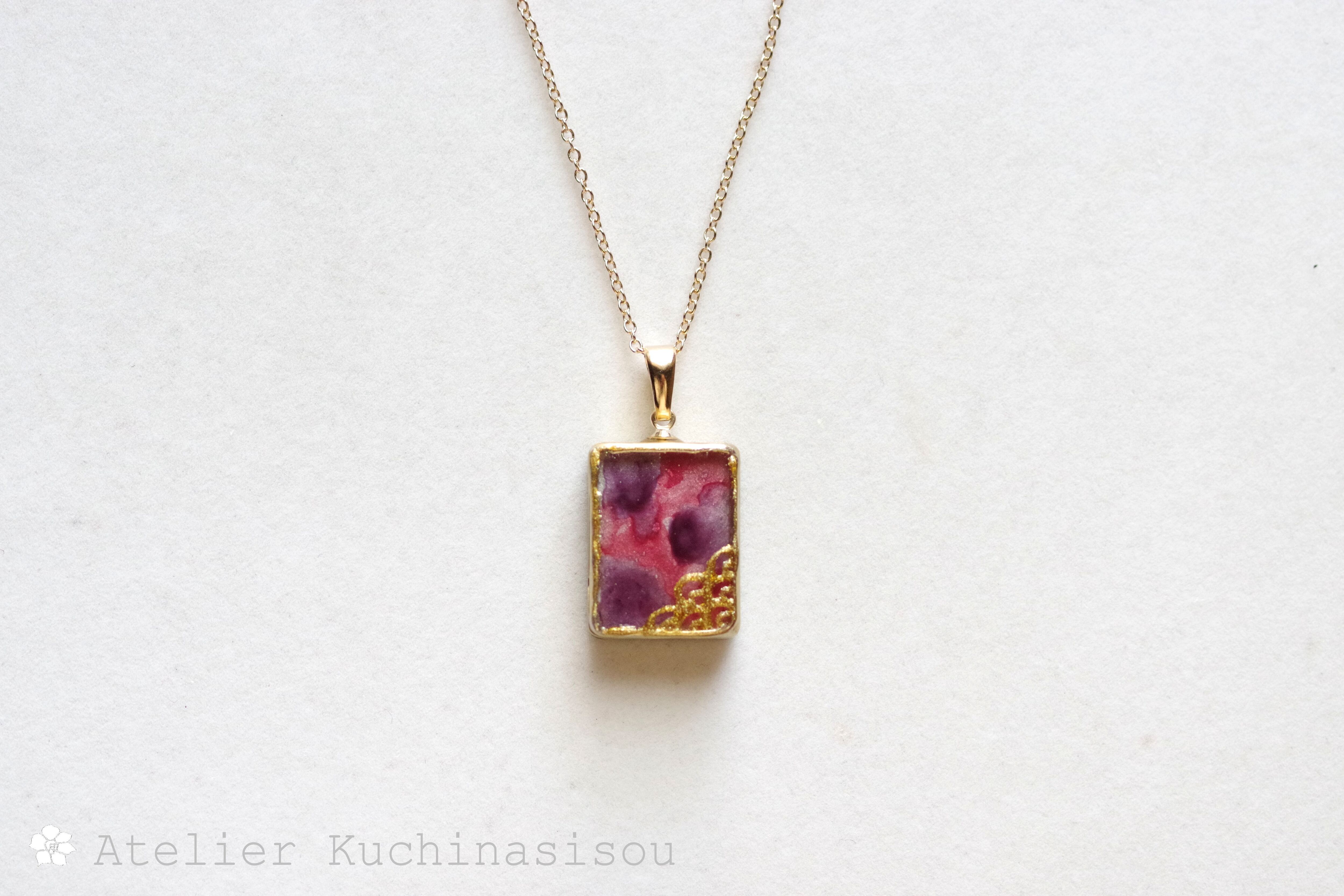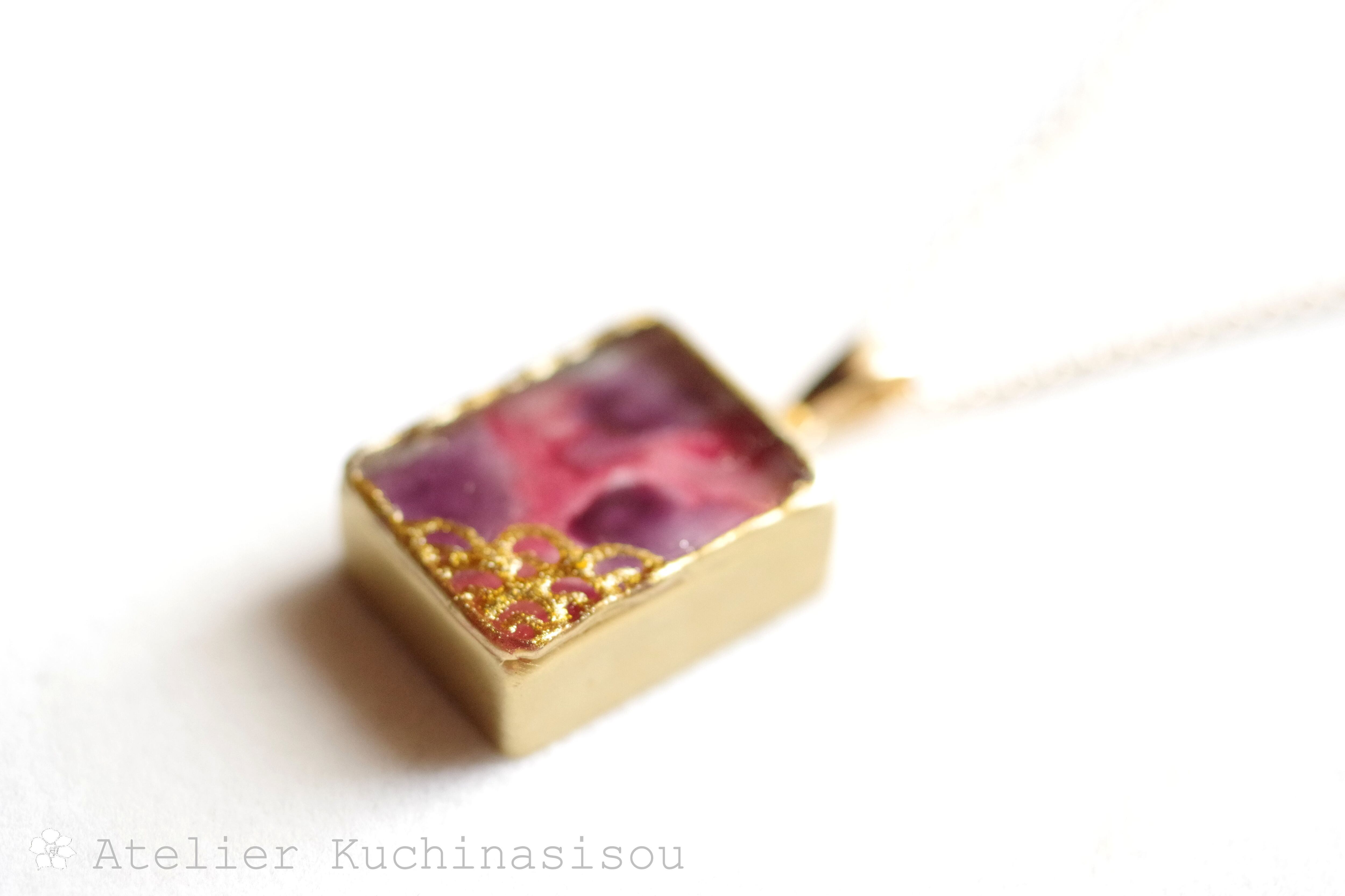 ピンクと紫が滲みあうレジンを金色で縁取り、青海波模様を描いた、小さな玉手箱のようなペンダント。
