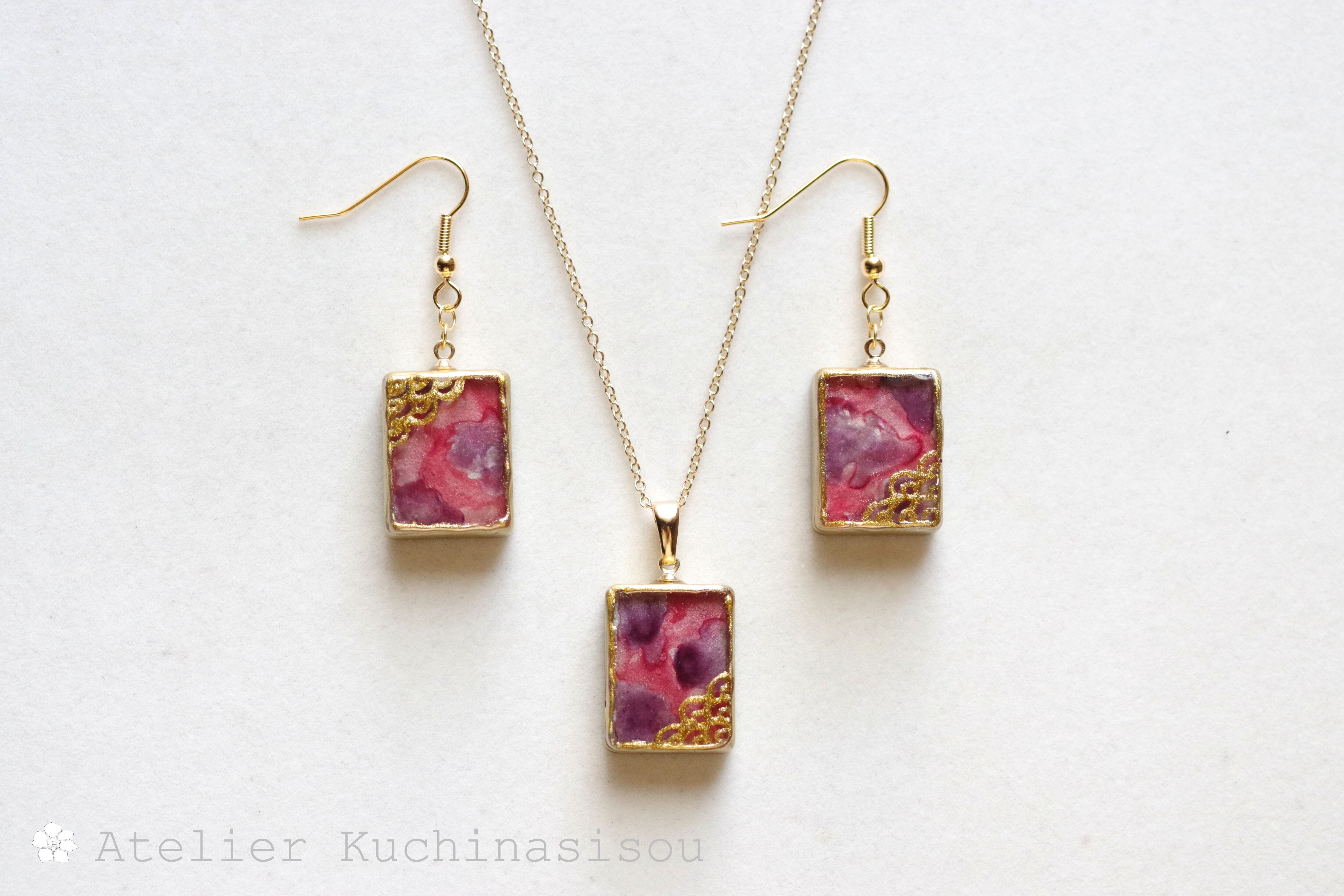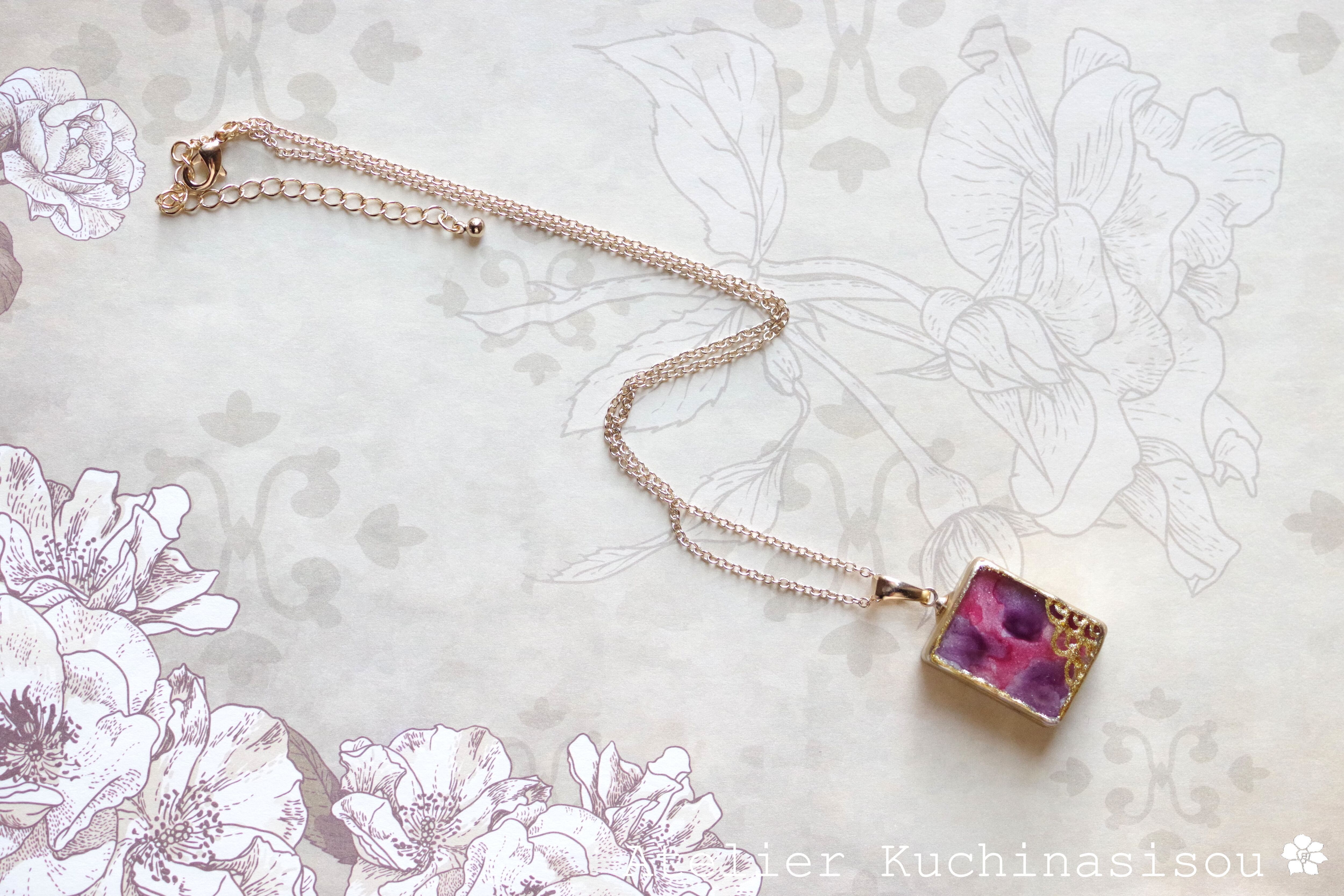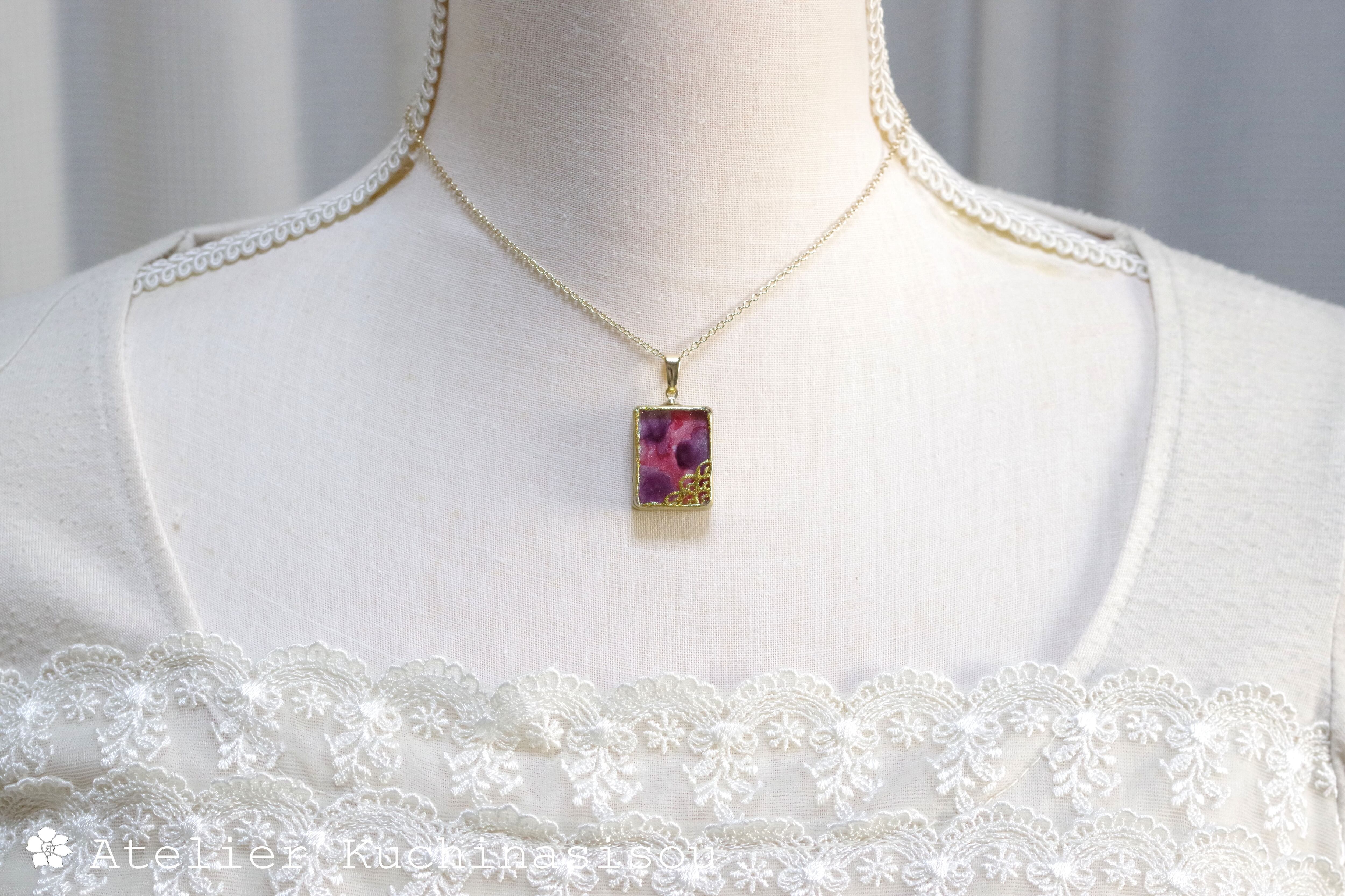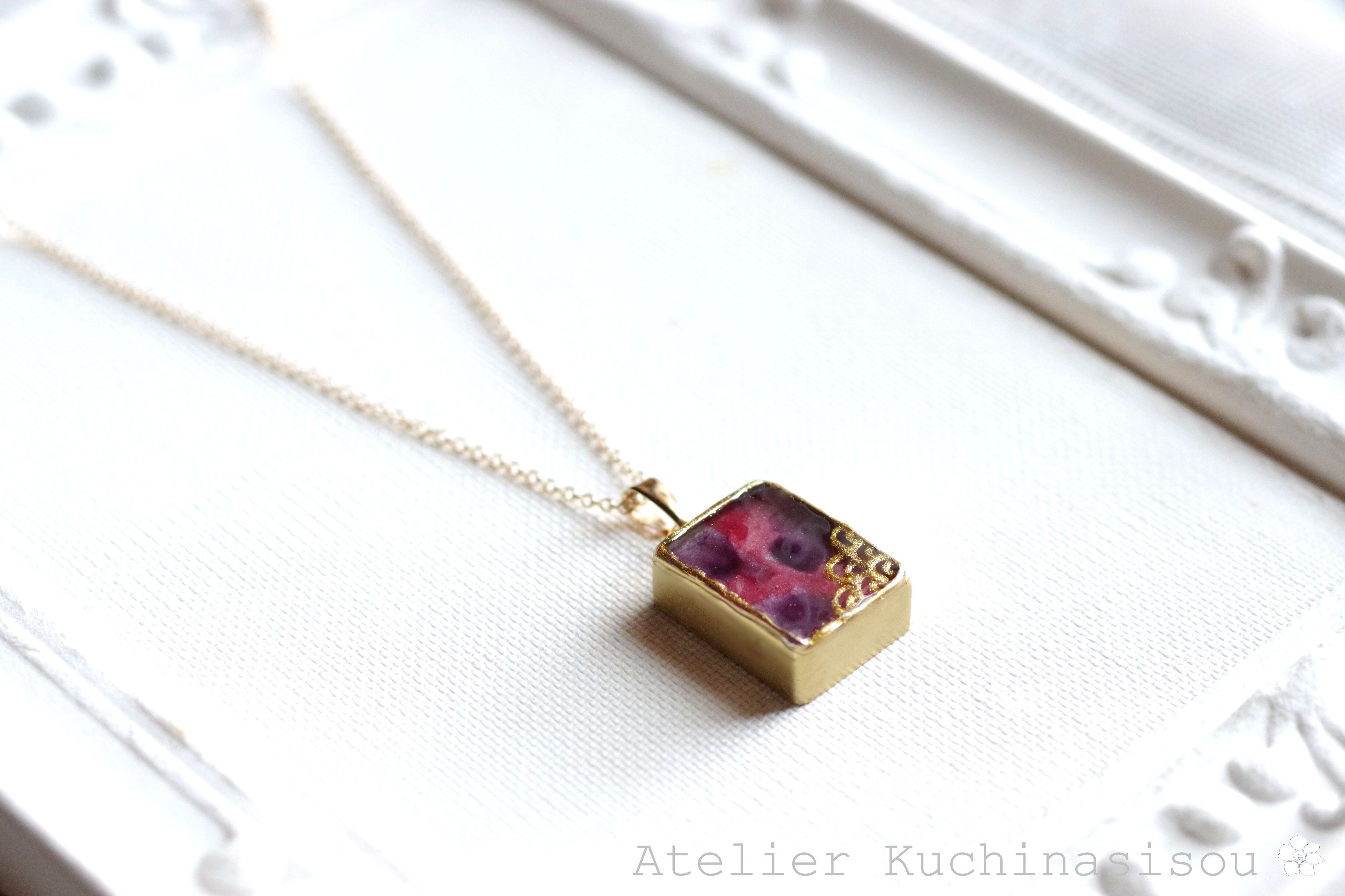 ピンクと紫が滲みあうレジンを金色で縁取り、青海波模様を描いた、小さな玉手箱のようなペンダント。