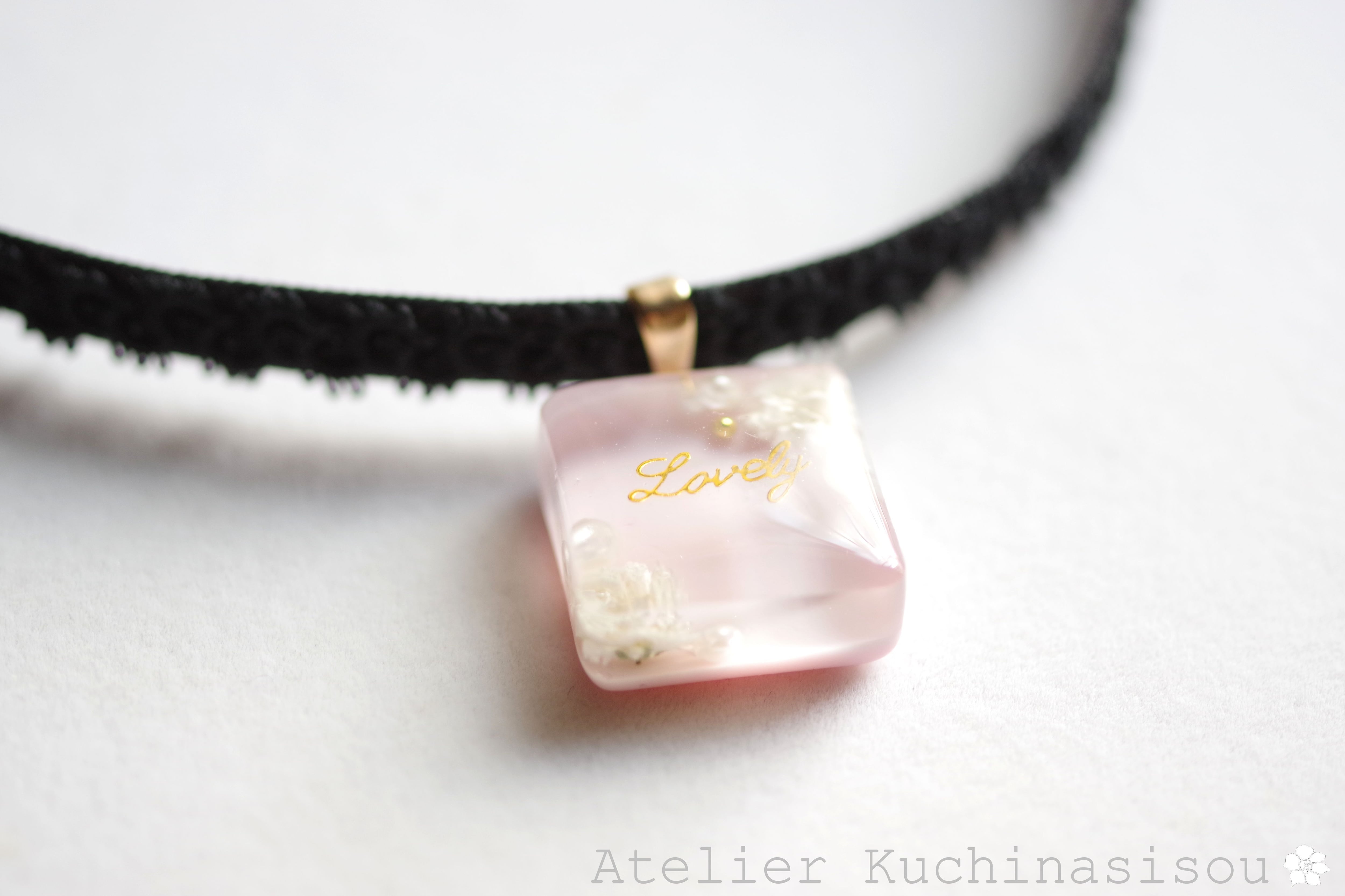 優しいピンクの背景にお花やパールを配置し、中央に文字を置いたデザインが可憐なレジンを、ベルベットリボンにタティングレースで装飾を施したチョーカーに仕上げました。(中央の文字は予告なく変更されることがあります)