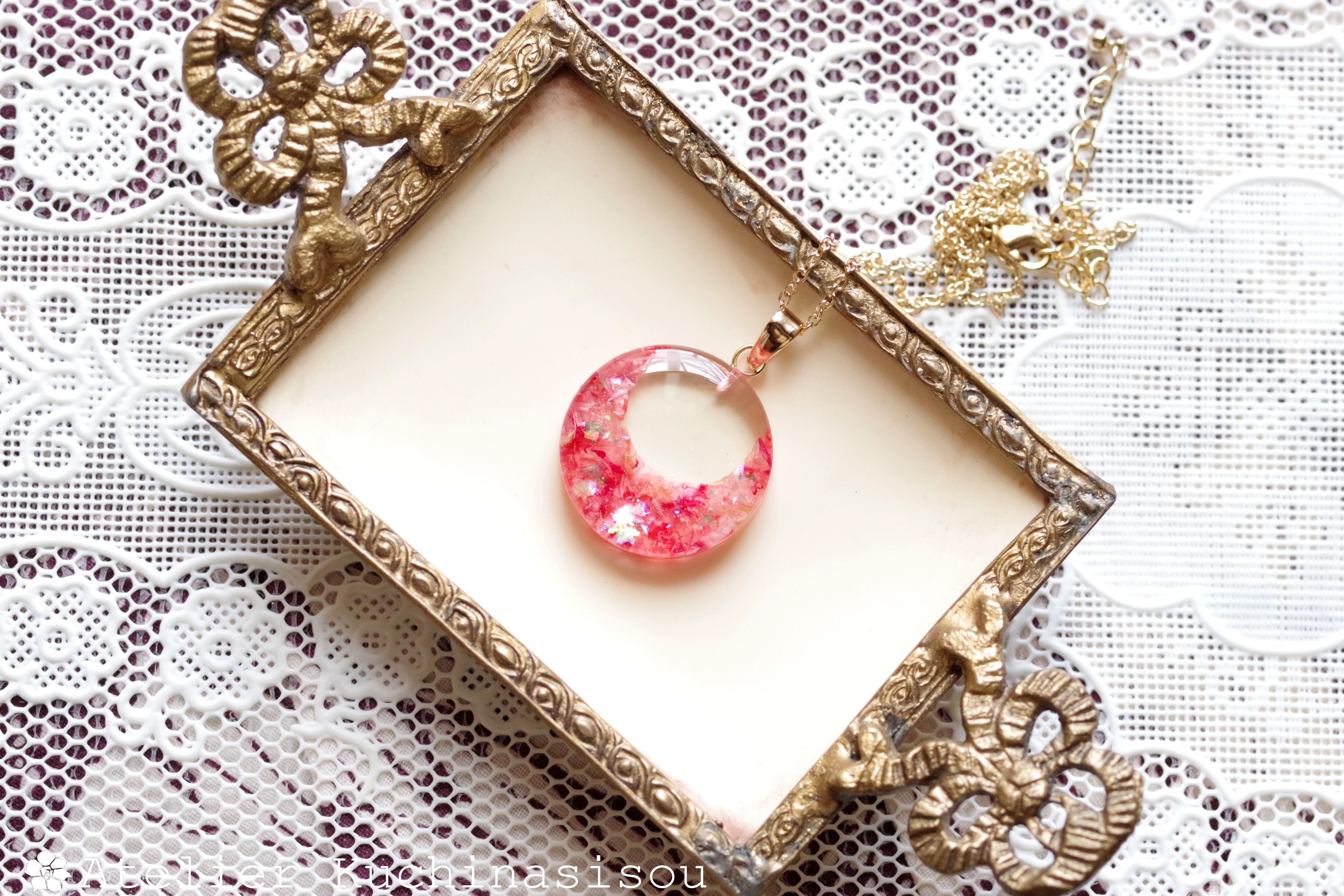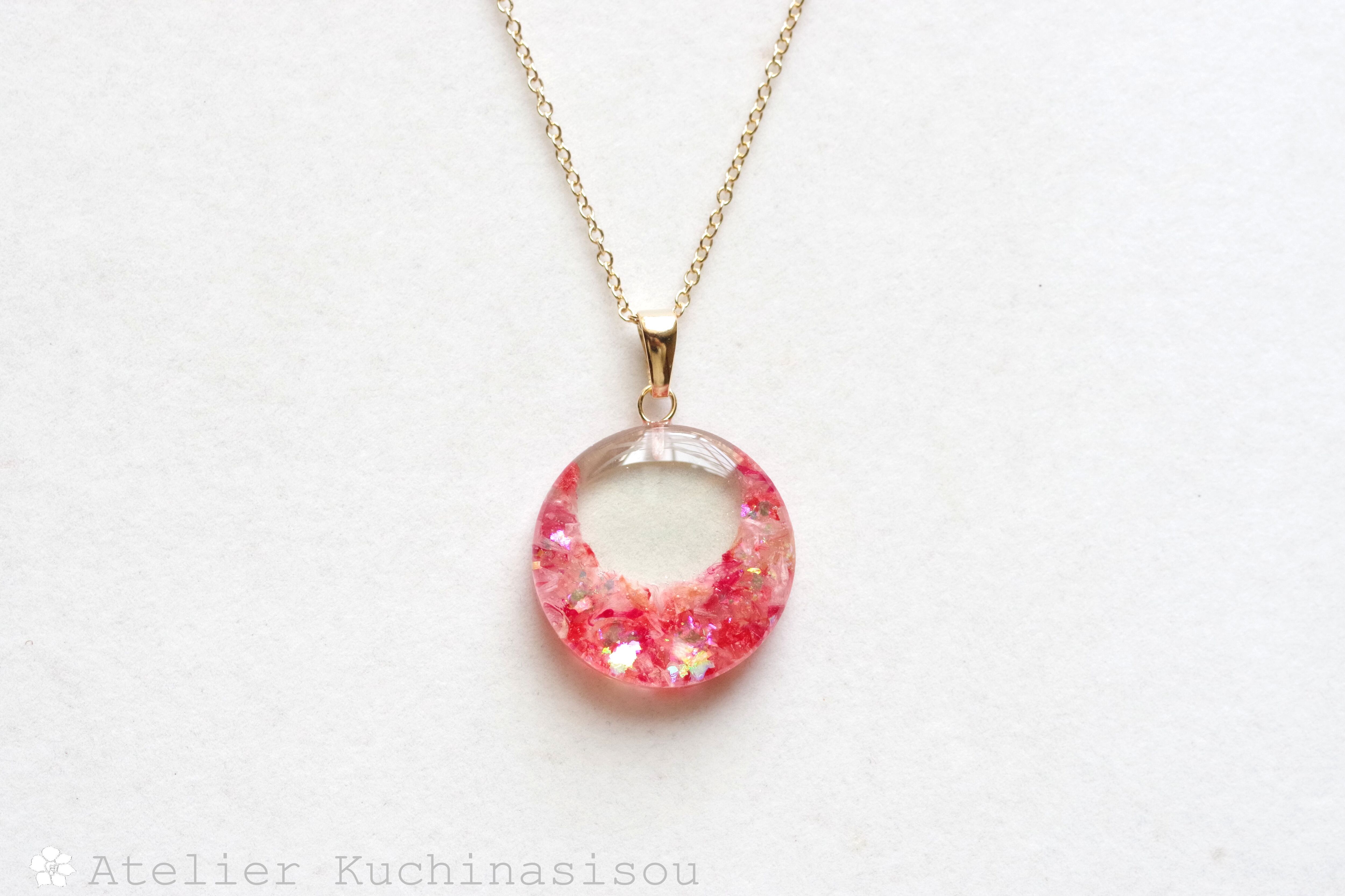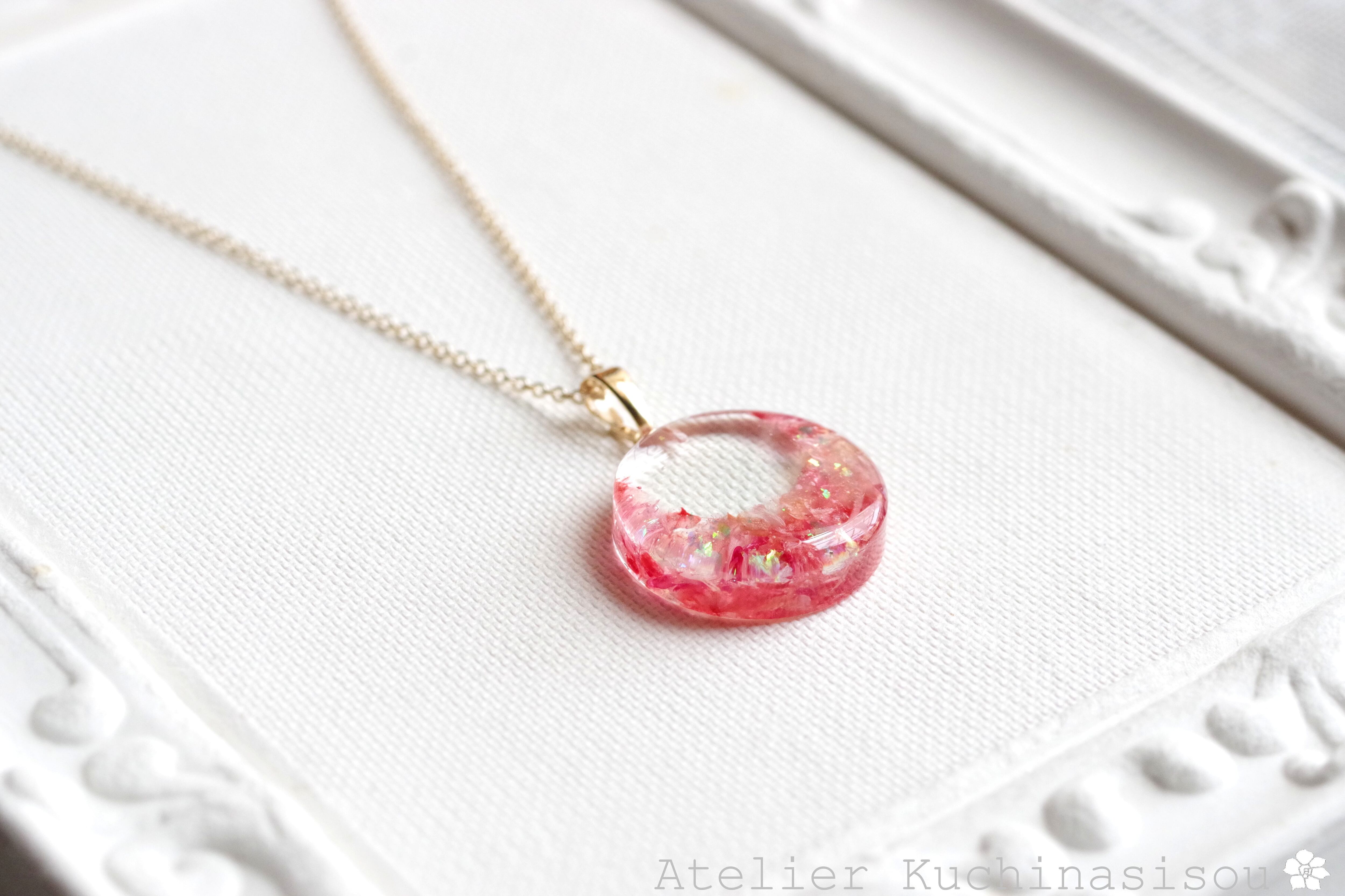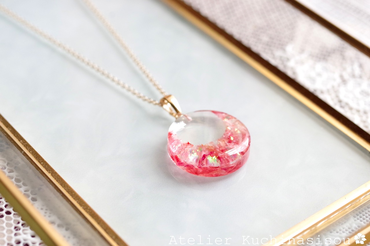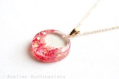 ピンクと赤のお花の花びらを敷き詰め、ピンクのラメを乗せたペンダント。
