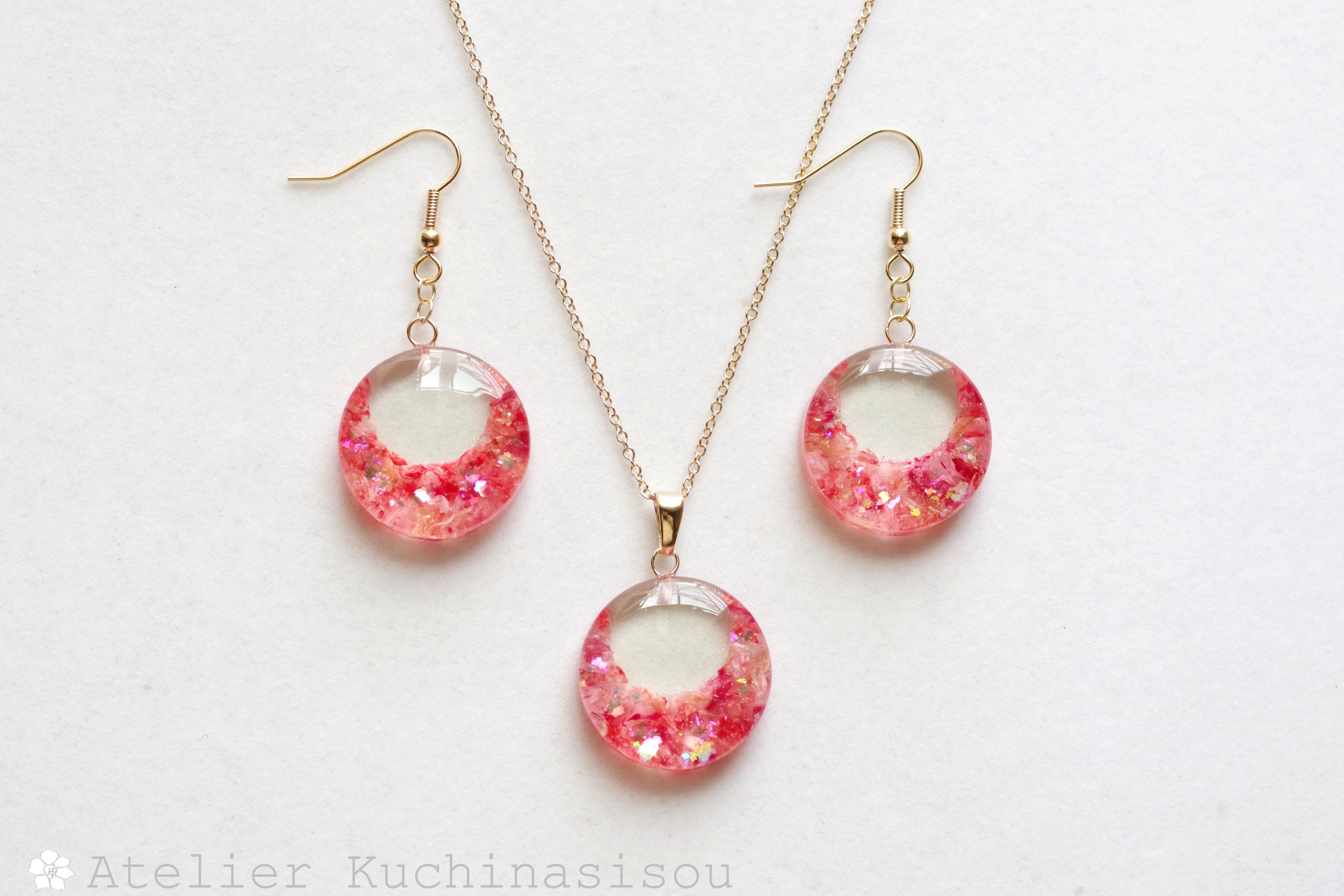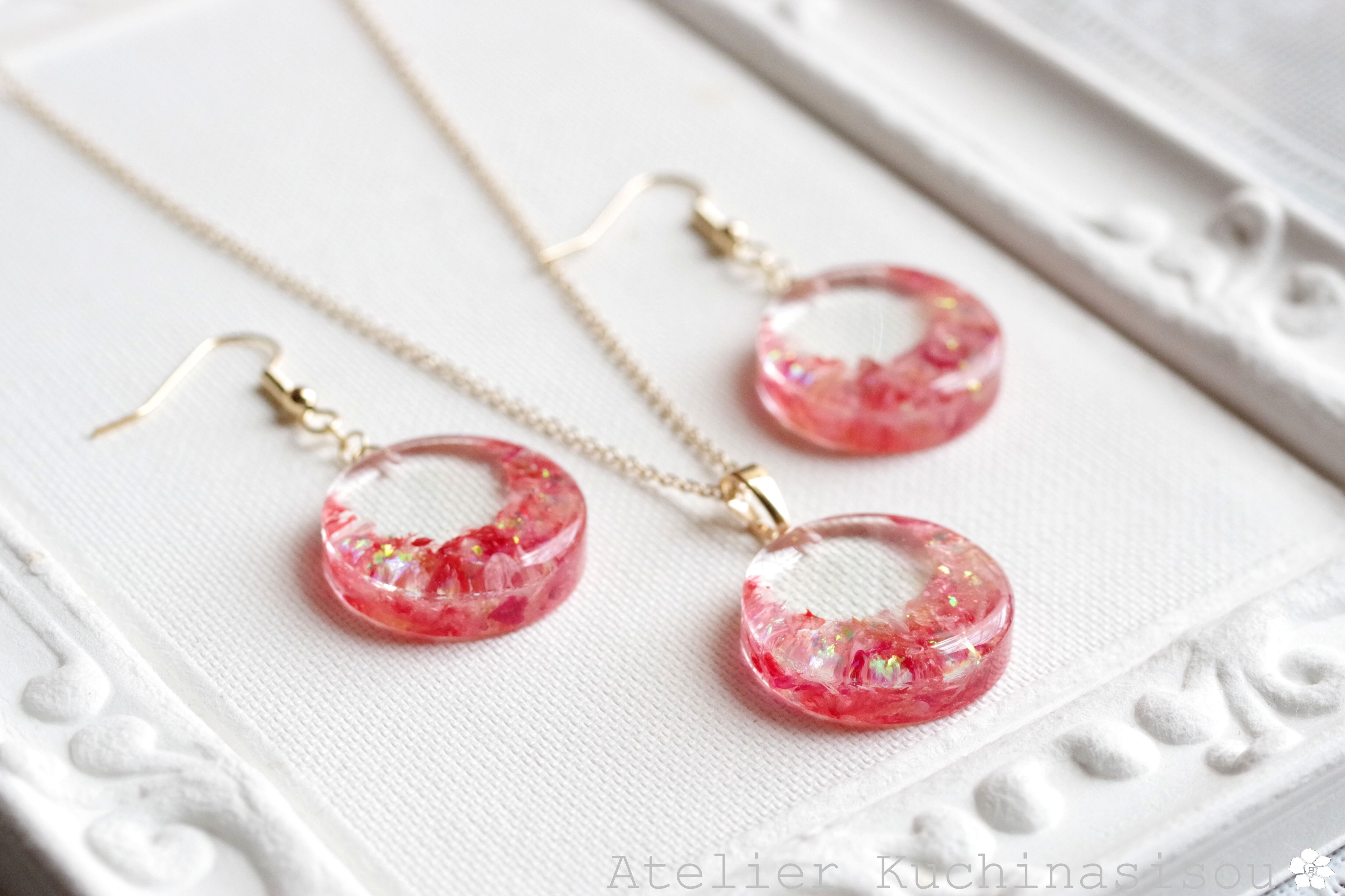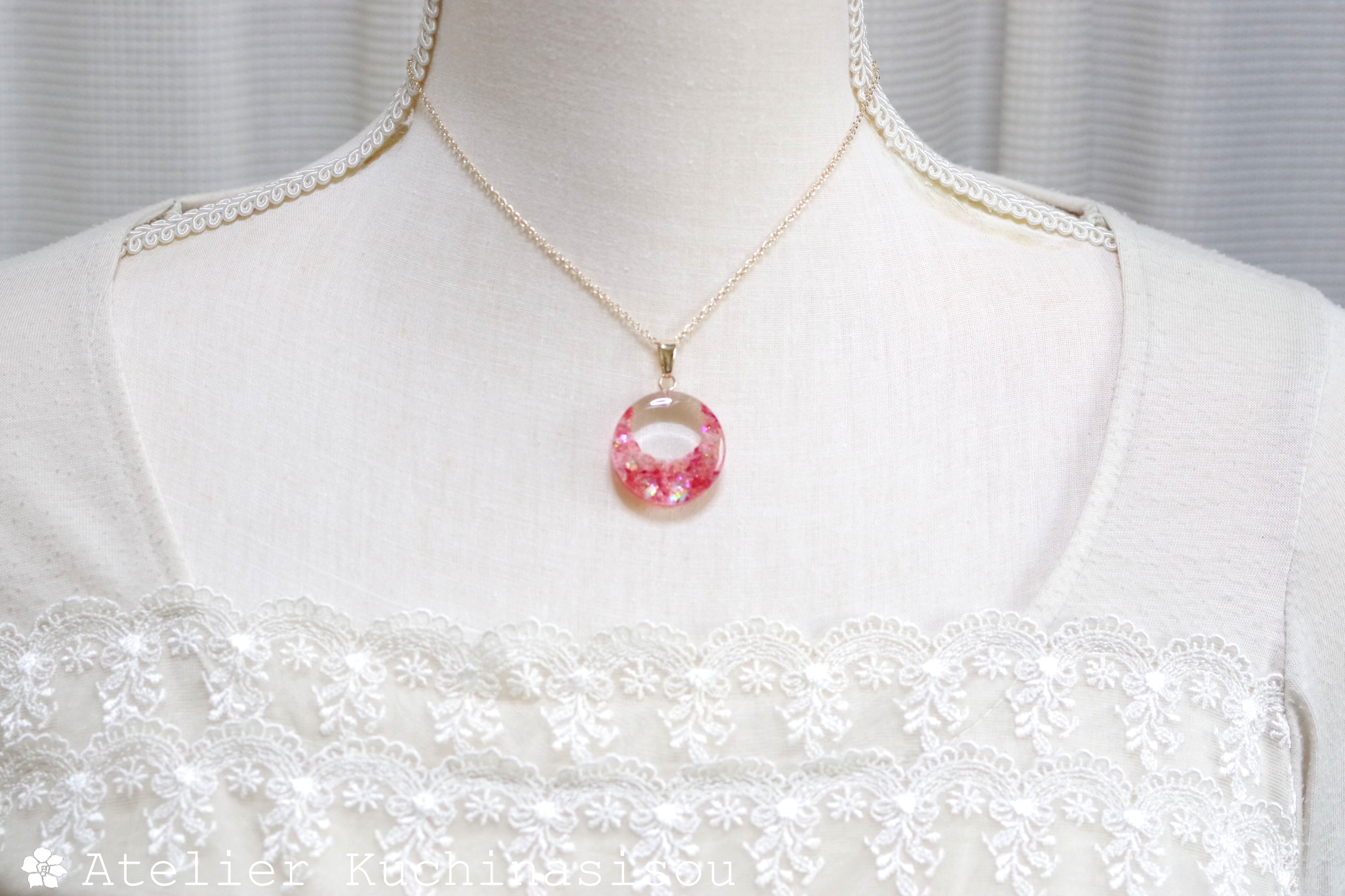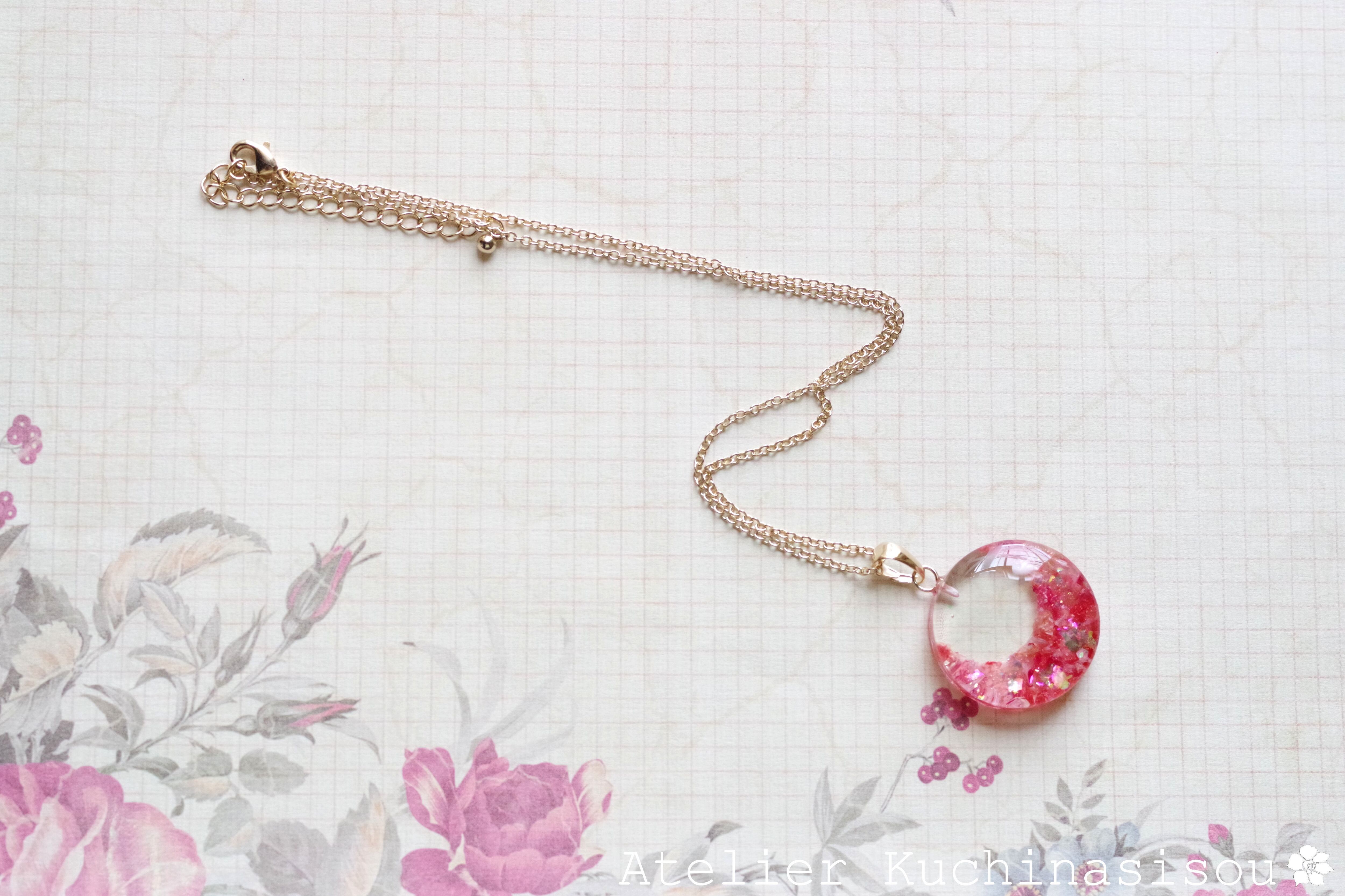 ピンクと赤のお花の花びらを敷き詰め、ピンクのラメを乗せたペンダント。