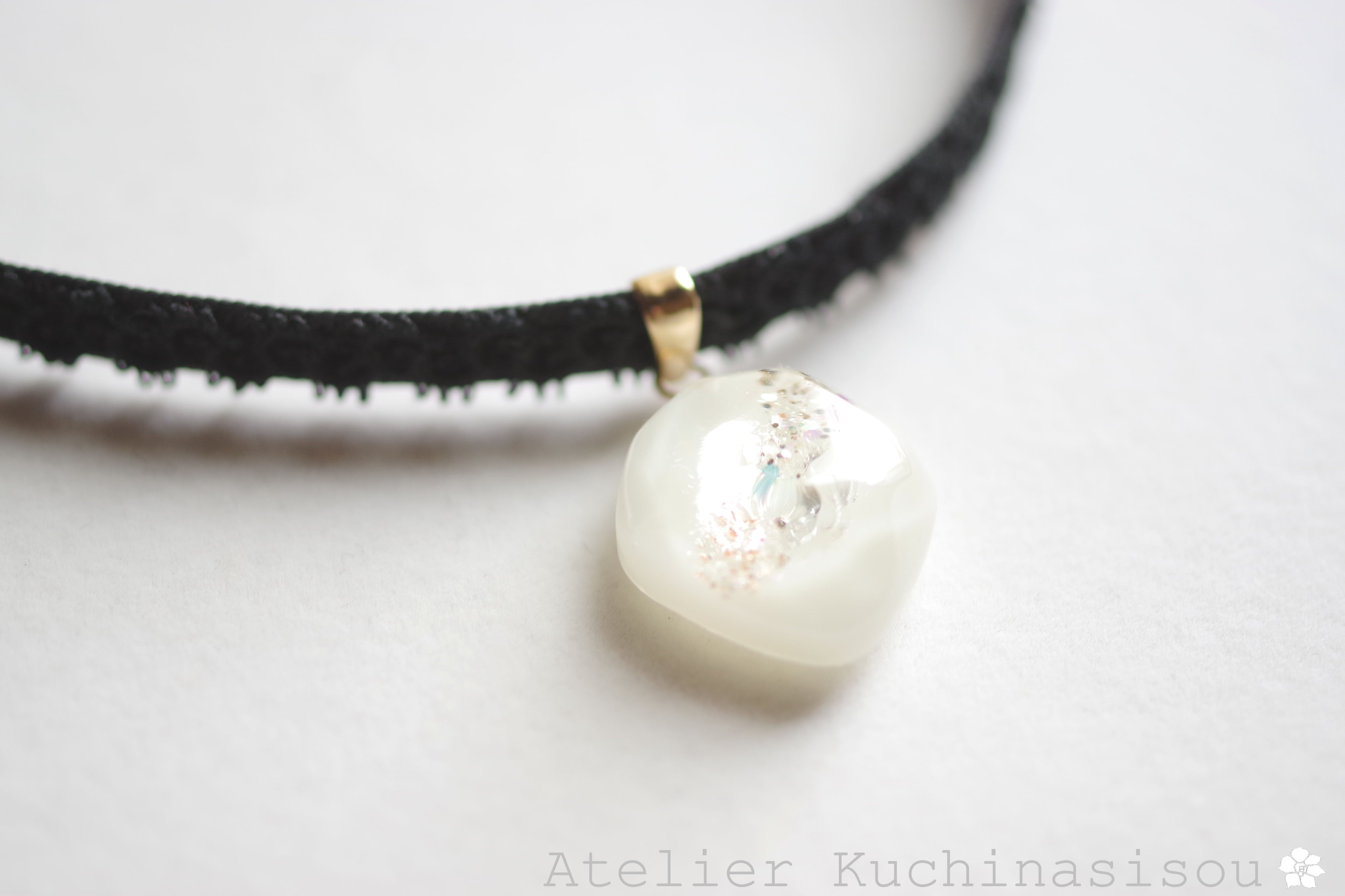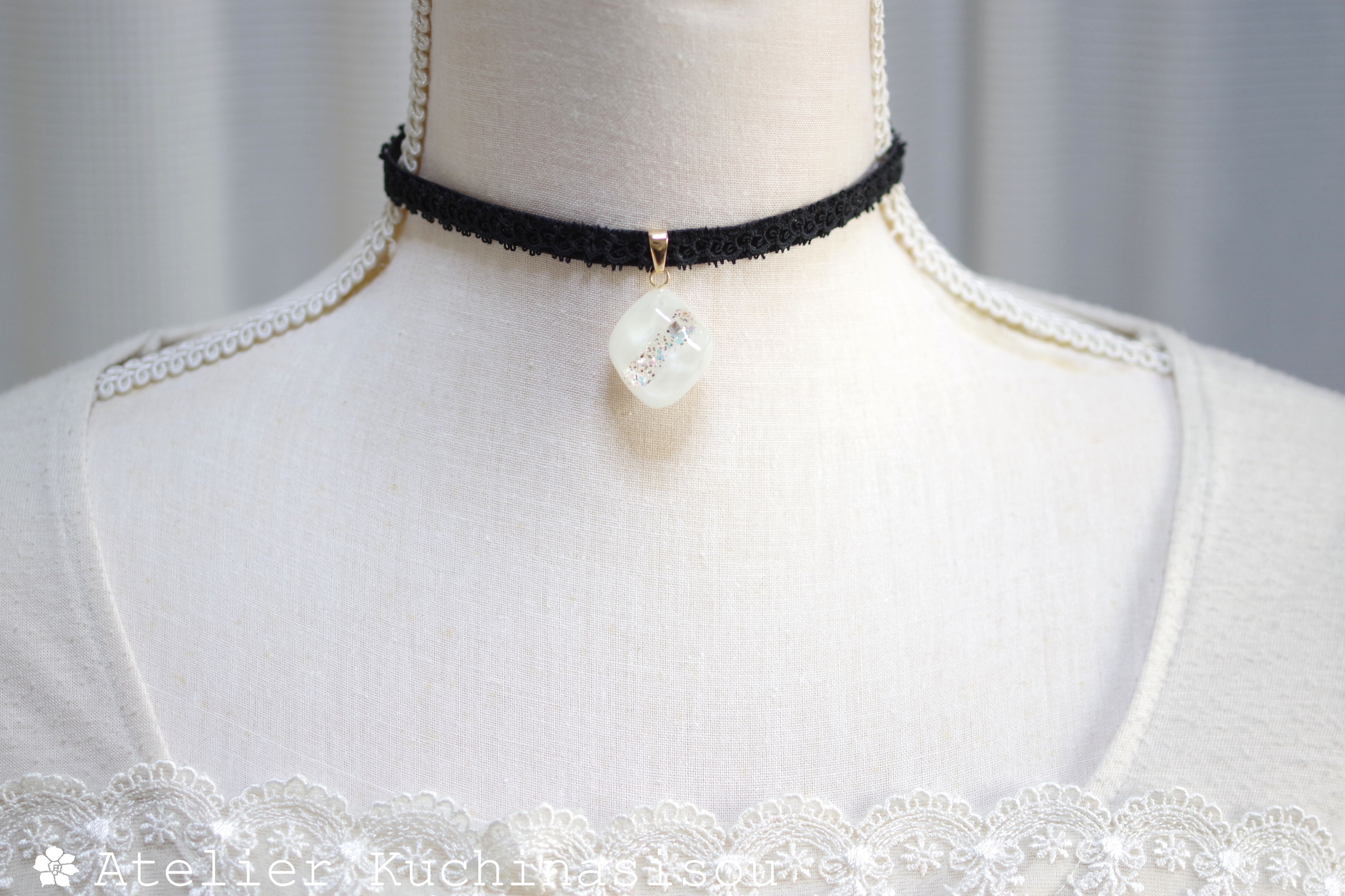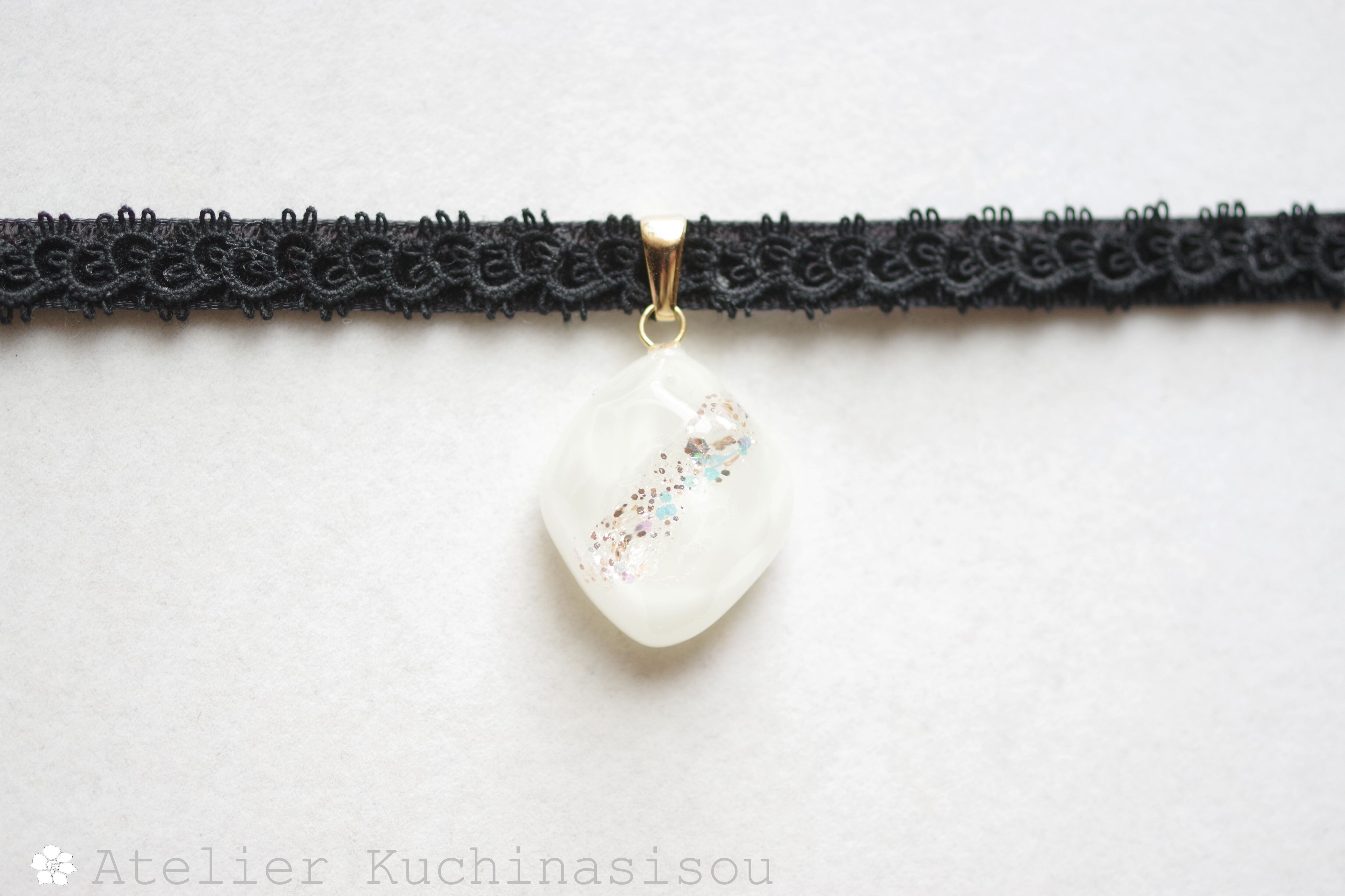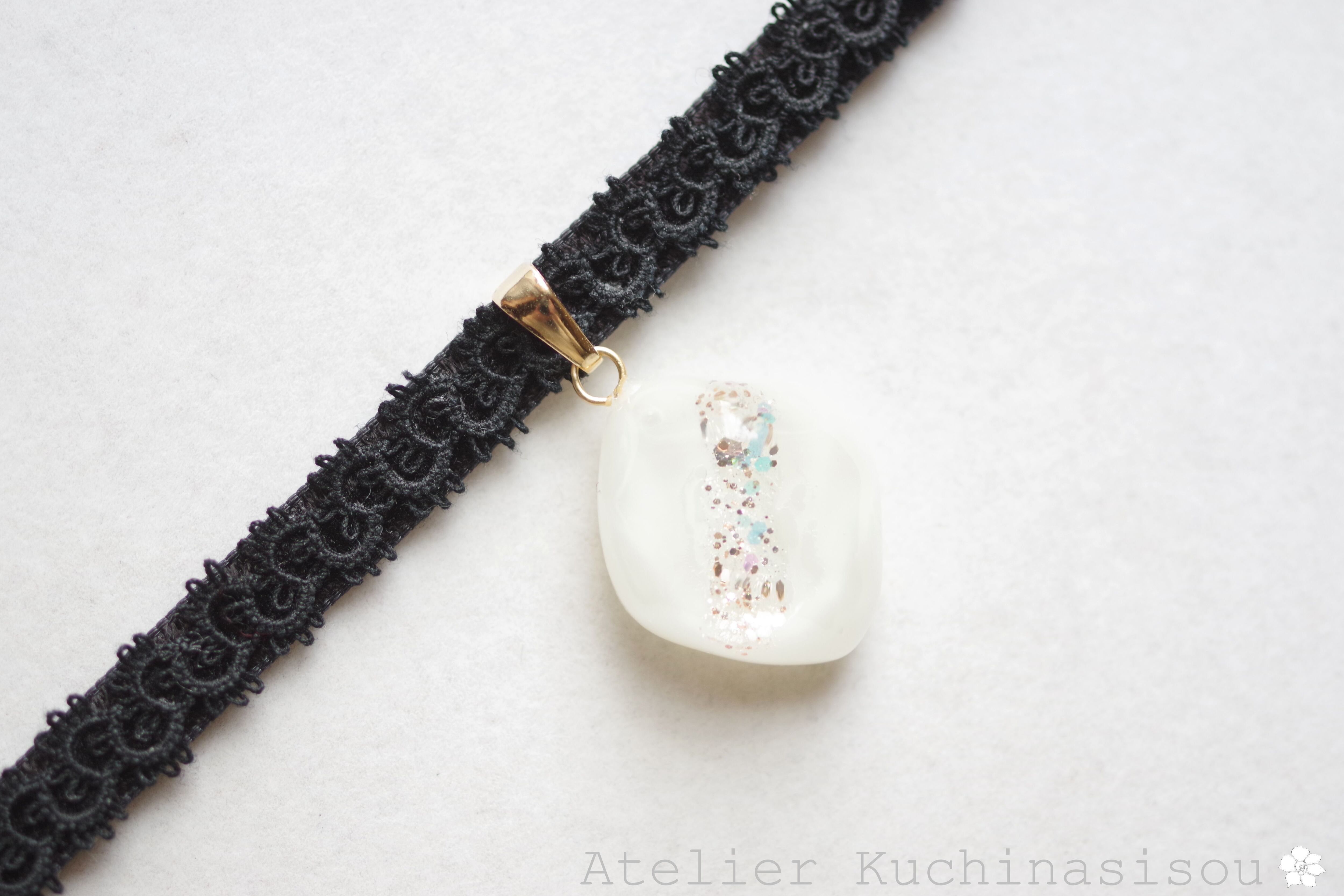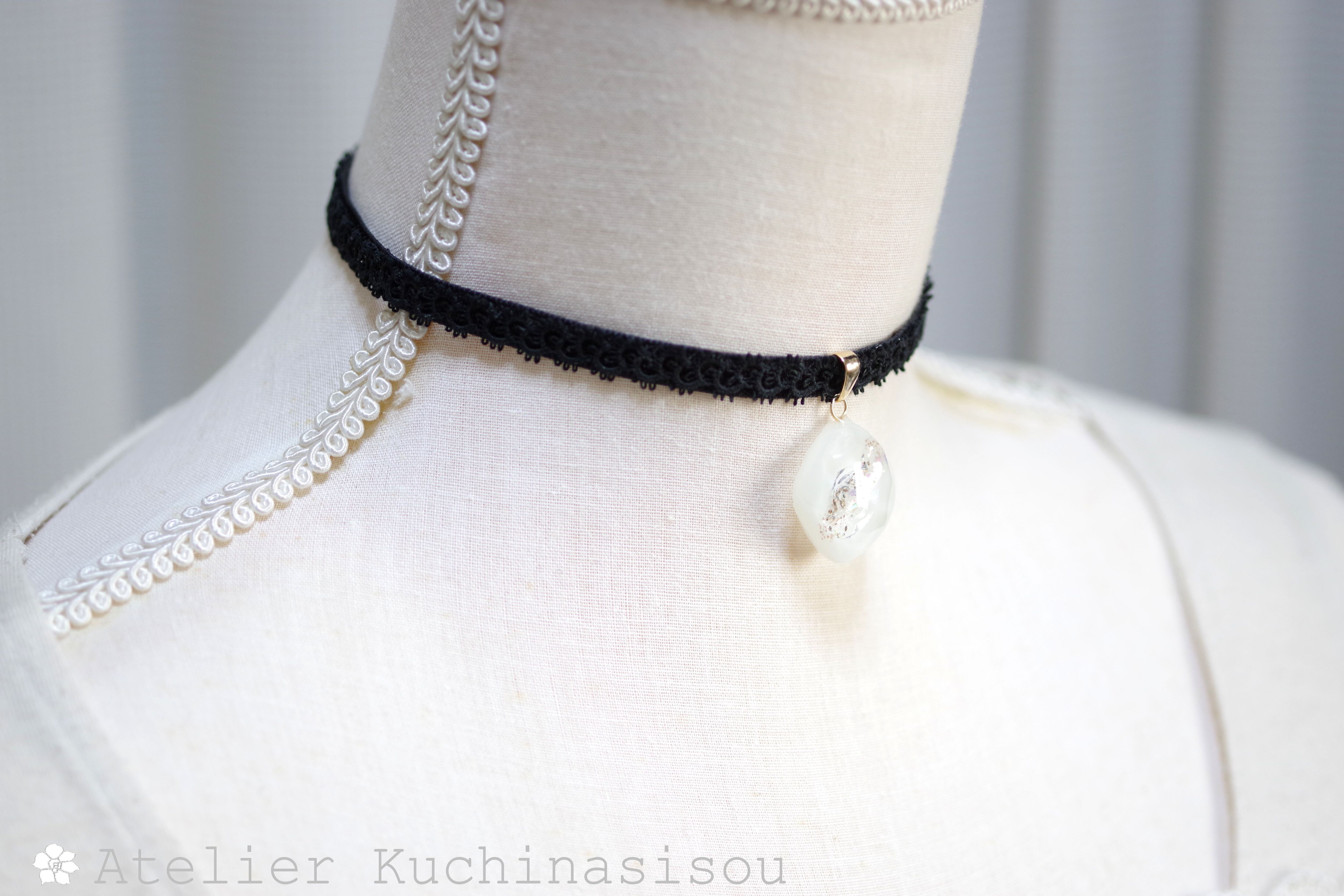 あたたかみのあるオフホワイトを背景に天の川のようにラメを一筋走らせたシンプルなレジンを、ベルベットリボンにタティングレースで装飾を施したチョーカーに仕上げました。
