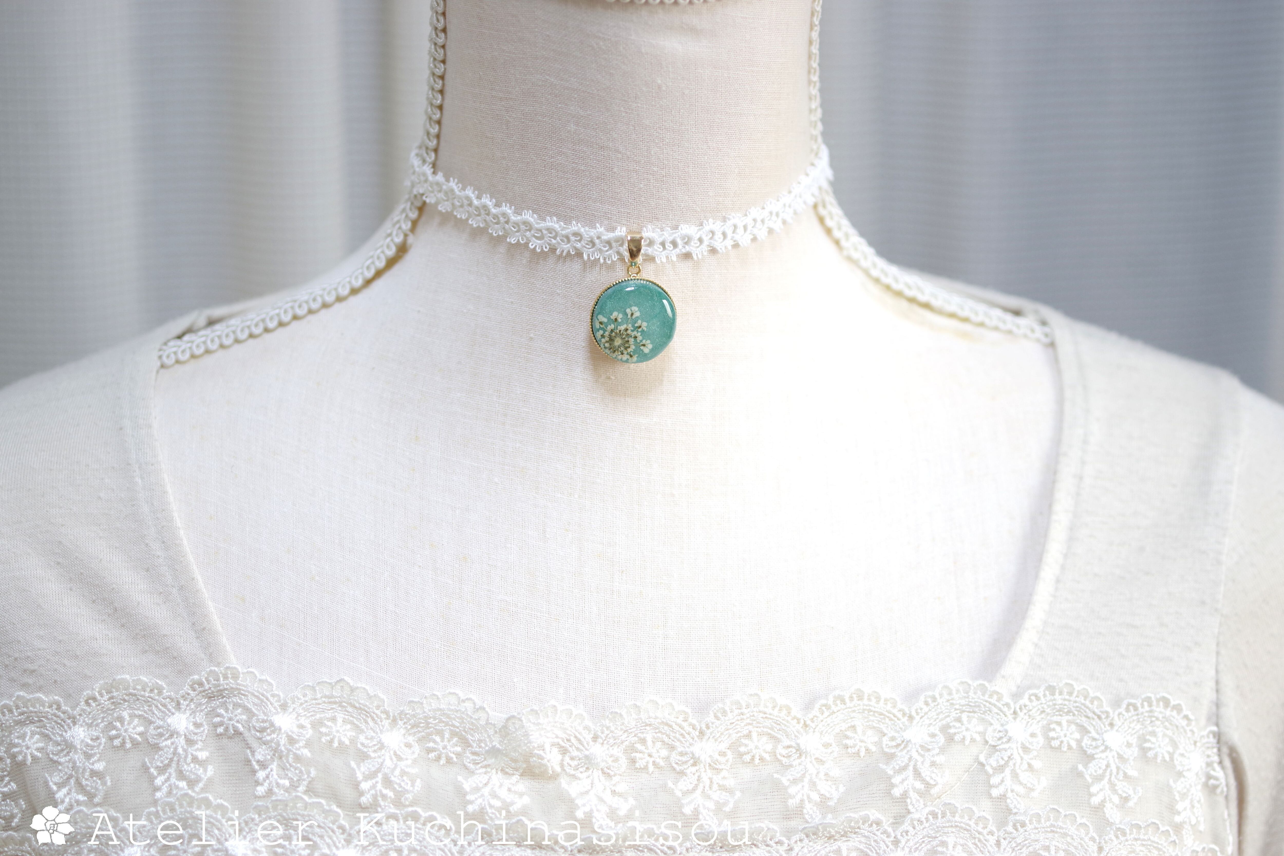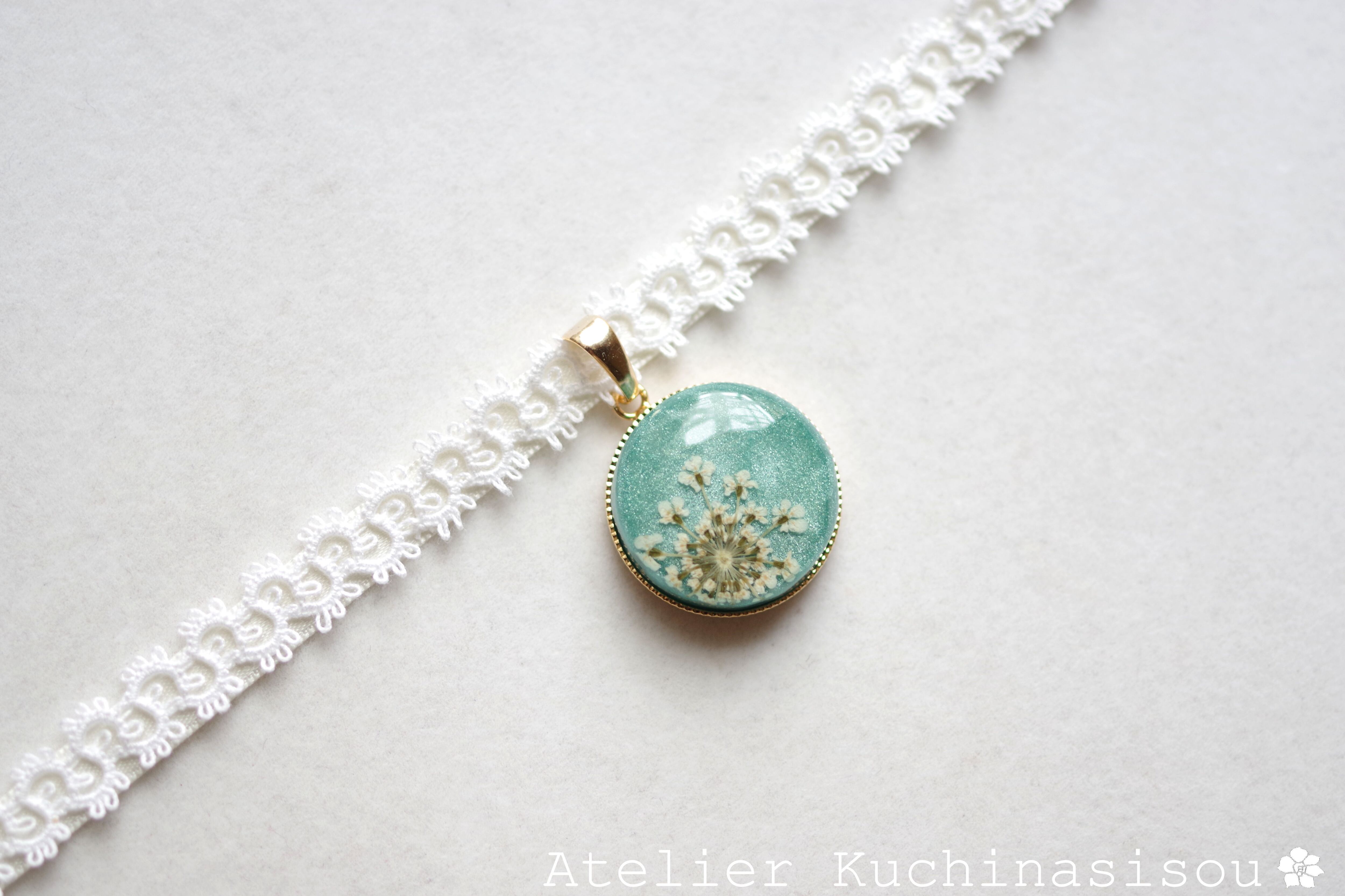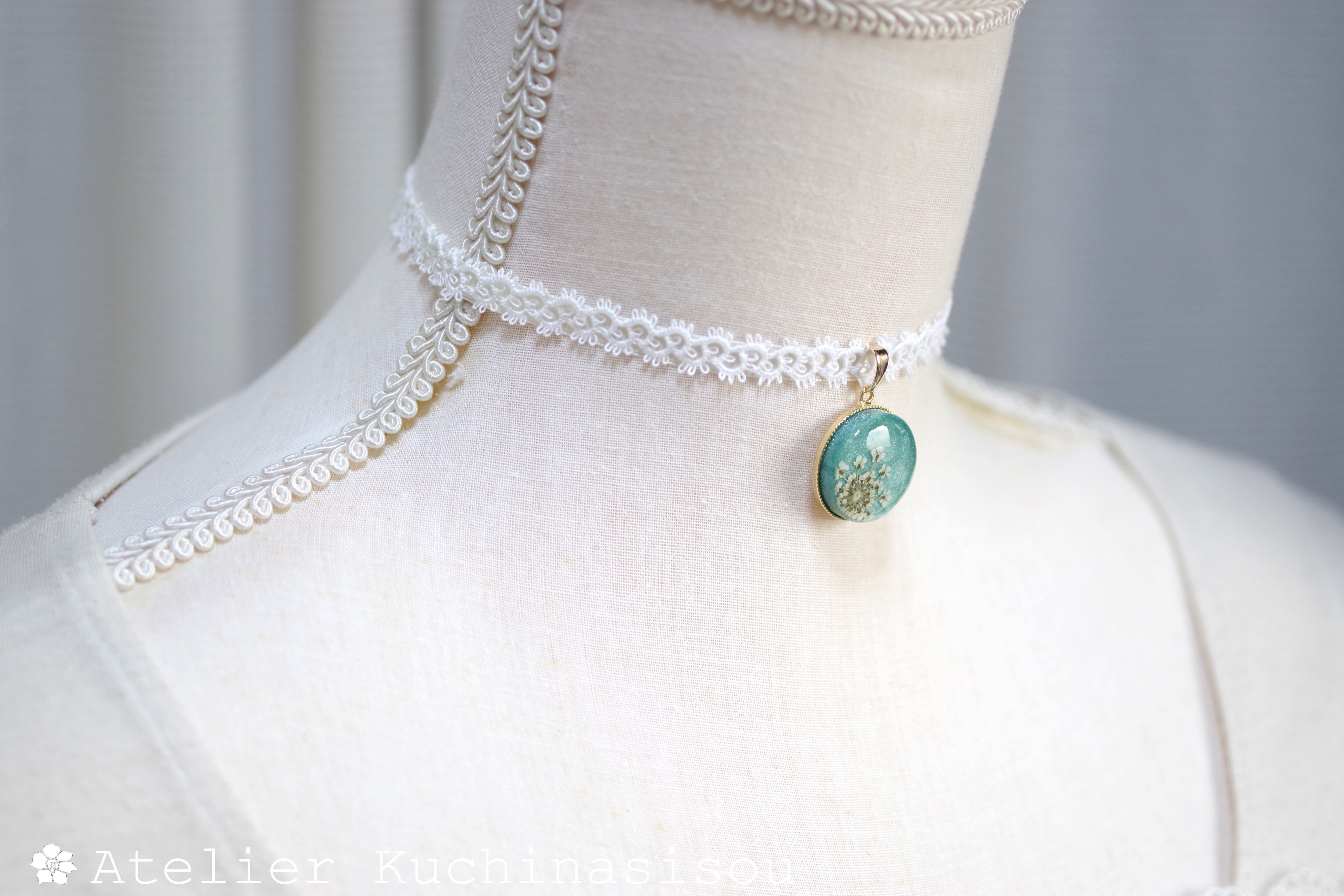 【受注製作】レジンアート ラウンドモチーフとタティングレースとサテンリボンのチョーカー〈緑色の丘〉