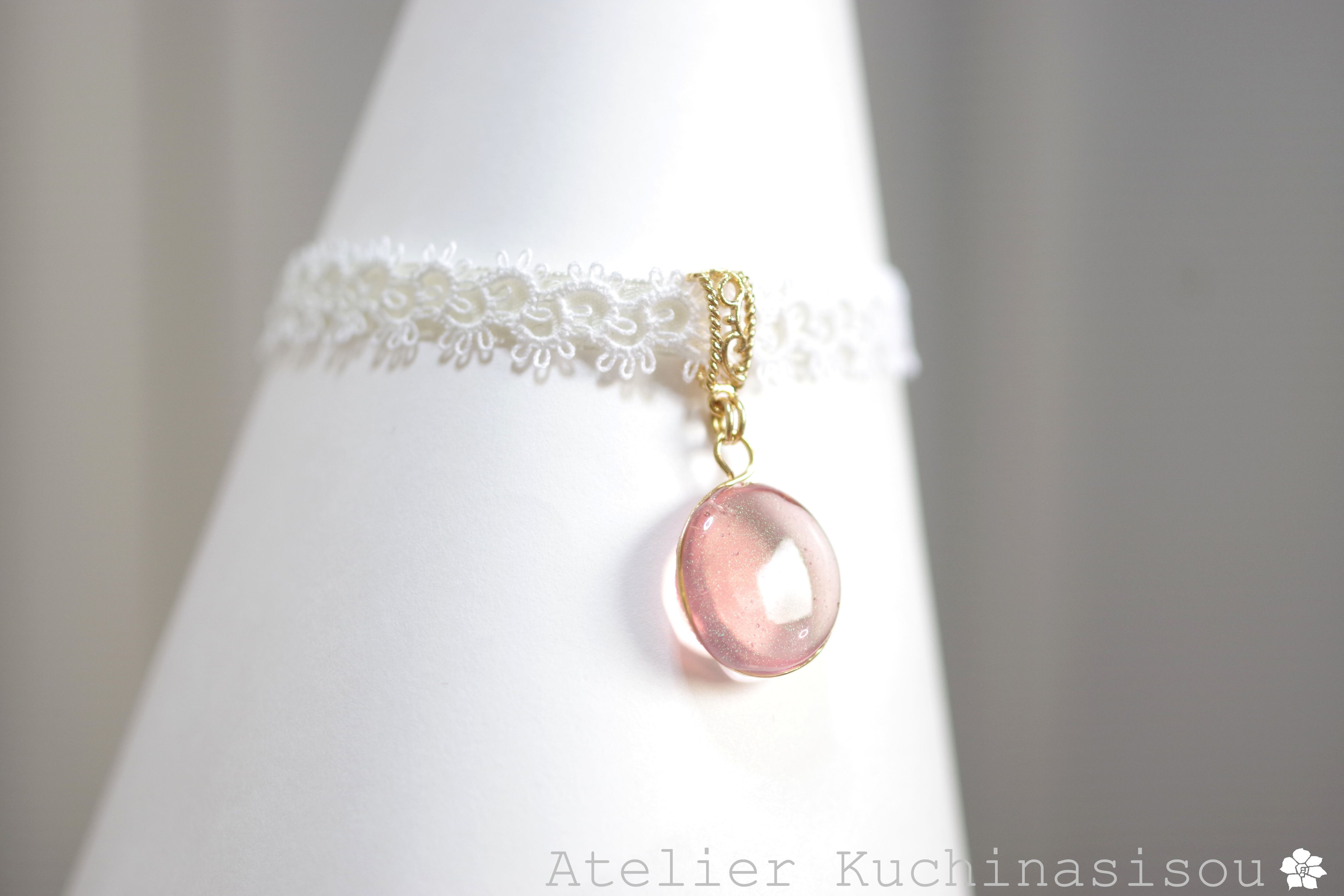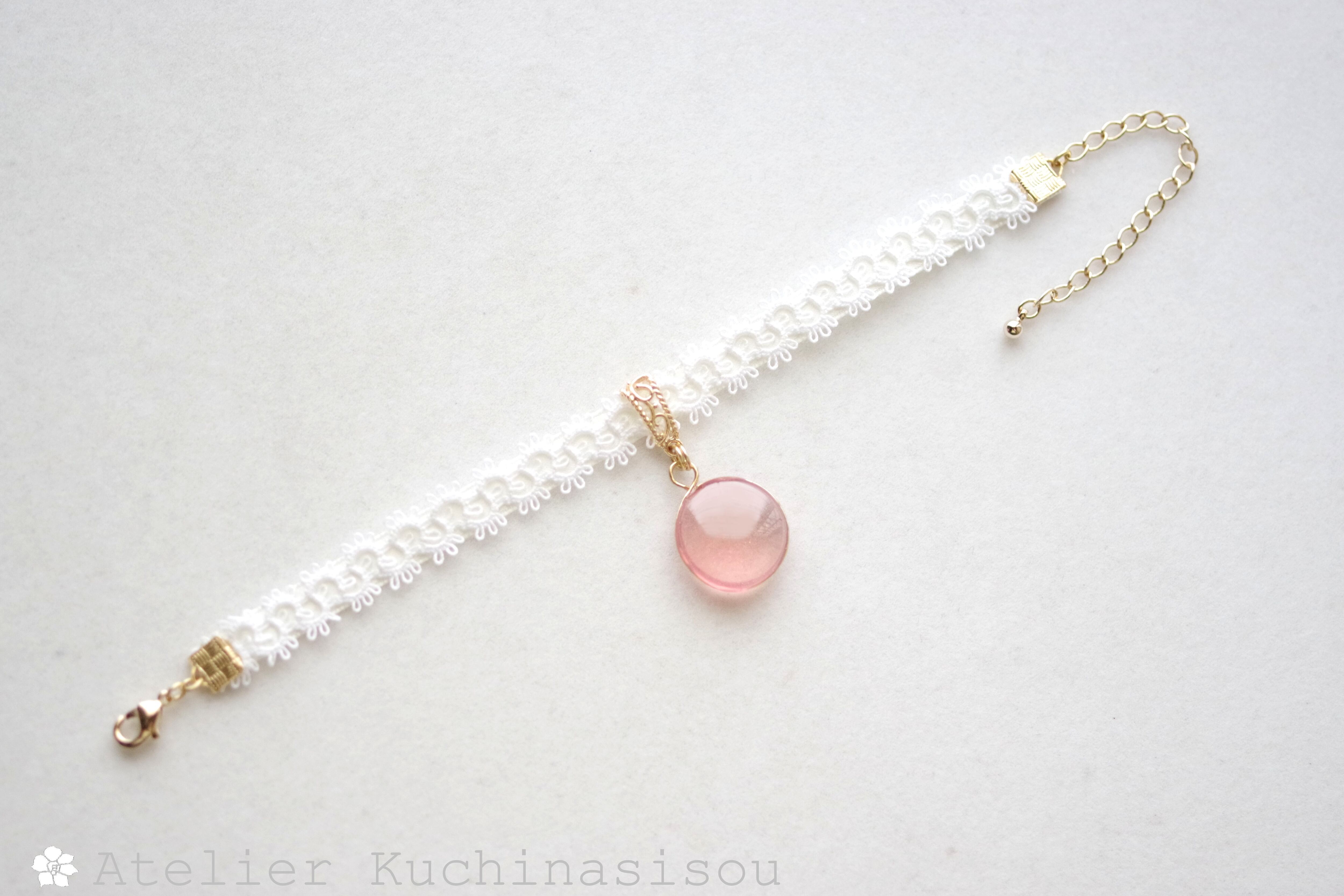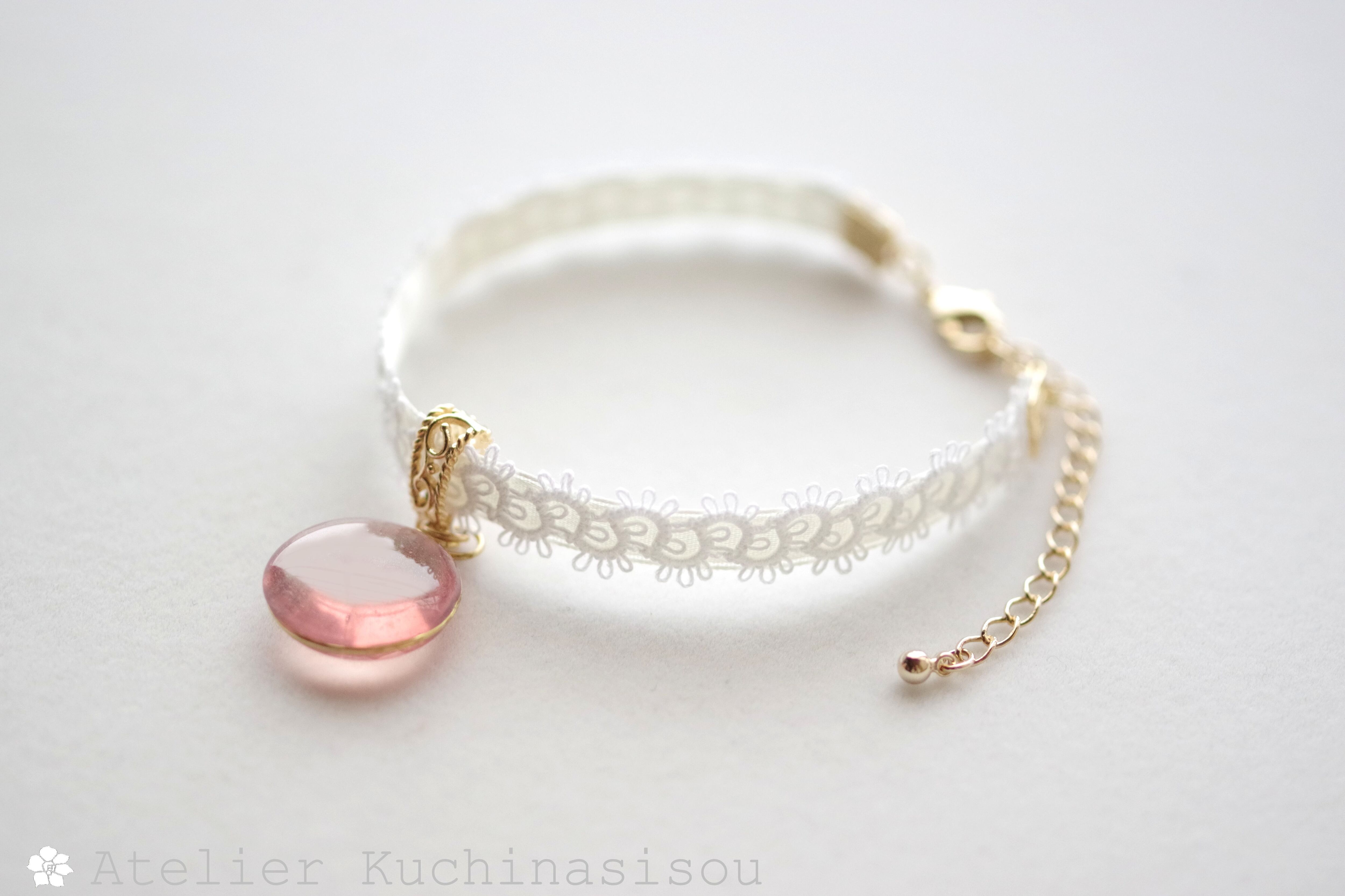 零れ落ちた一粒の水滴のようなレジンを、サテンリボンにタティングレースで装飾を施したブレスレットに仕上げました。