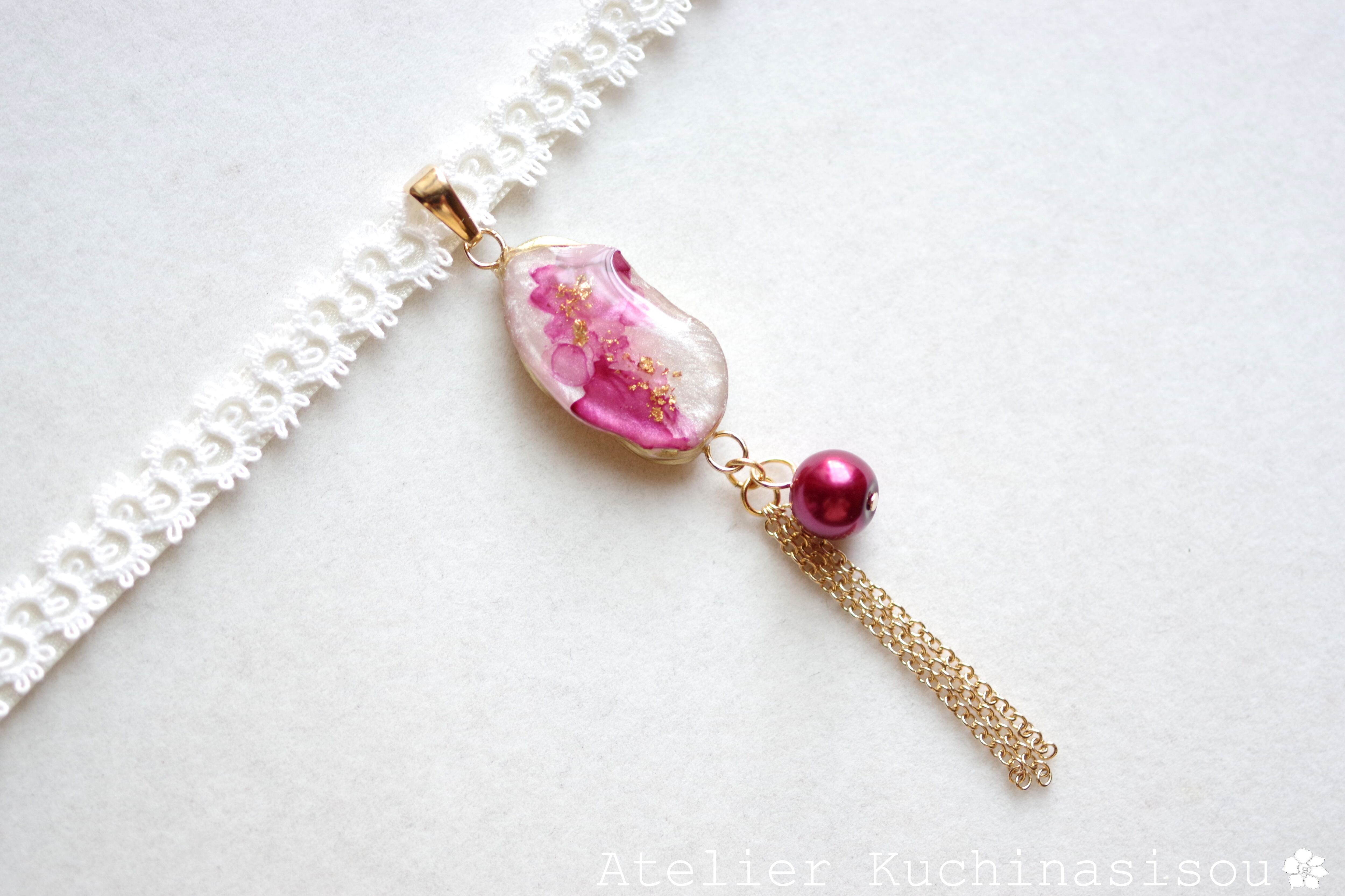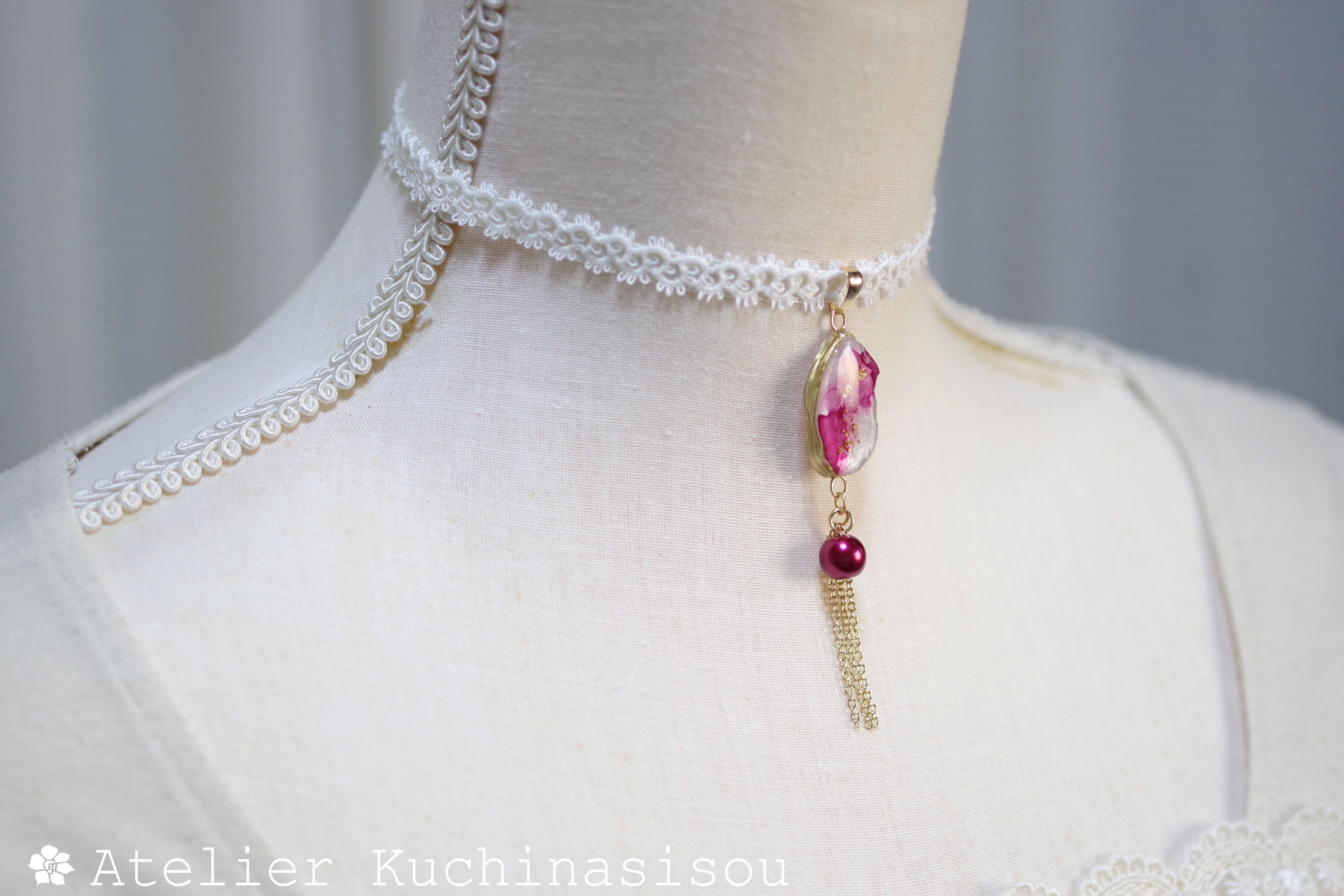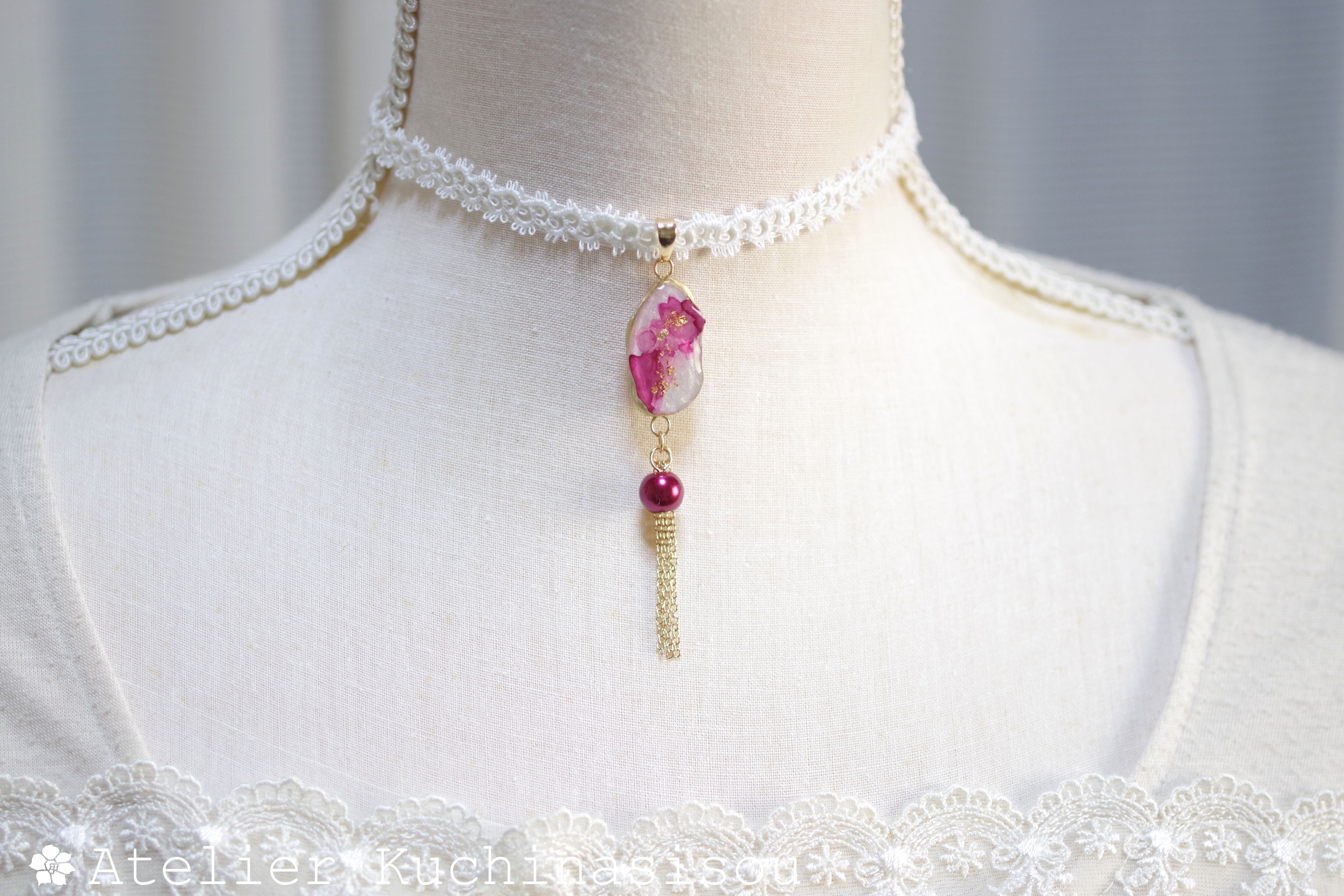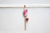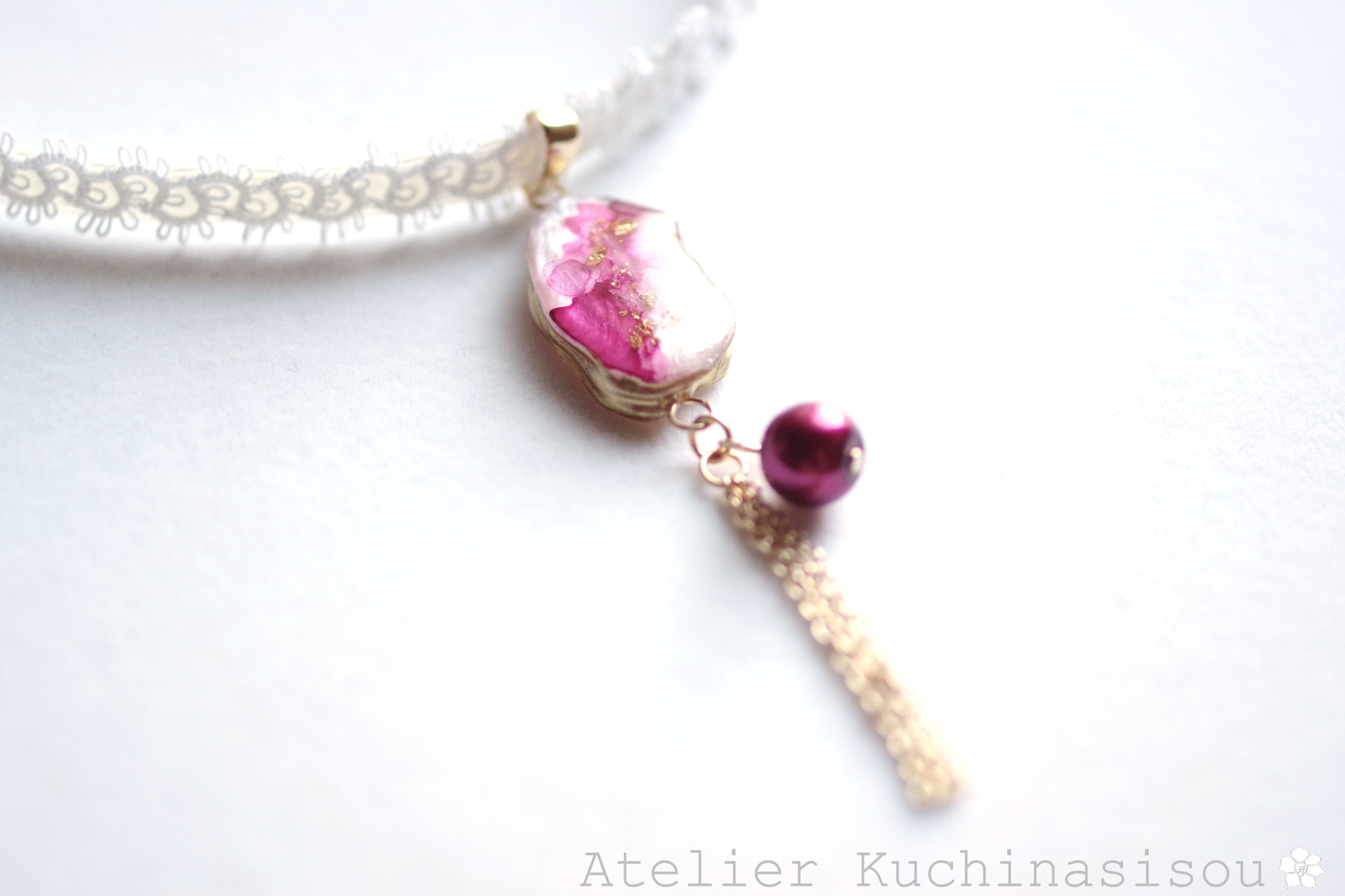 スライスアゲートのような光沢のある白いレジンにピンクの模様を描き、ガラスパールとフリンジを添え、サテンリボンにタティングレースで装飾を施したチョーカーに仕上げました。
