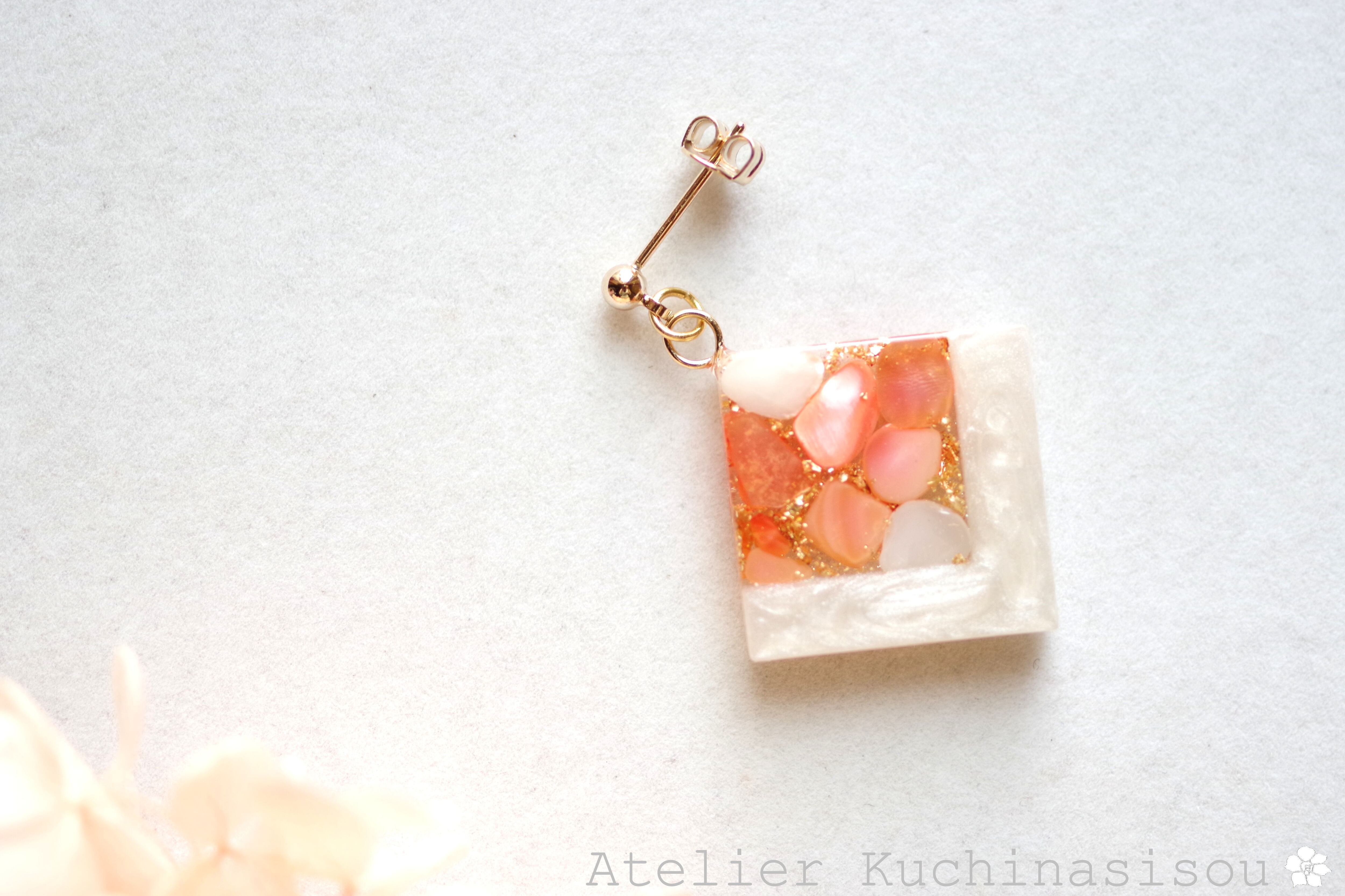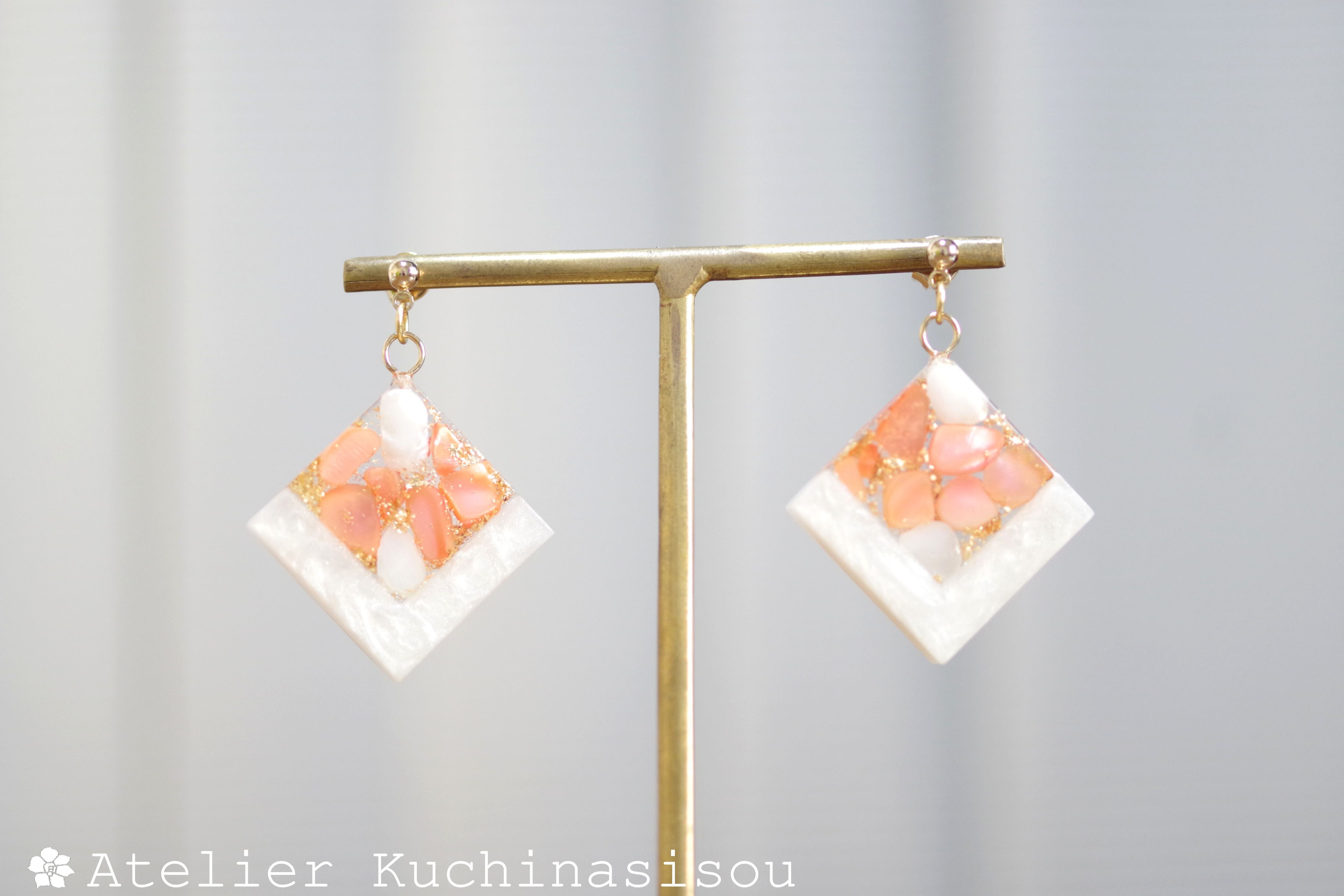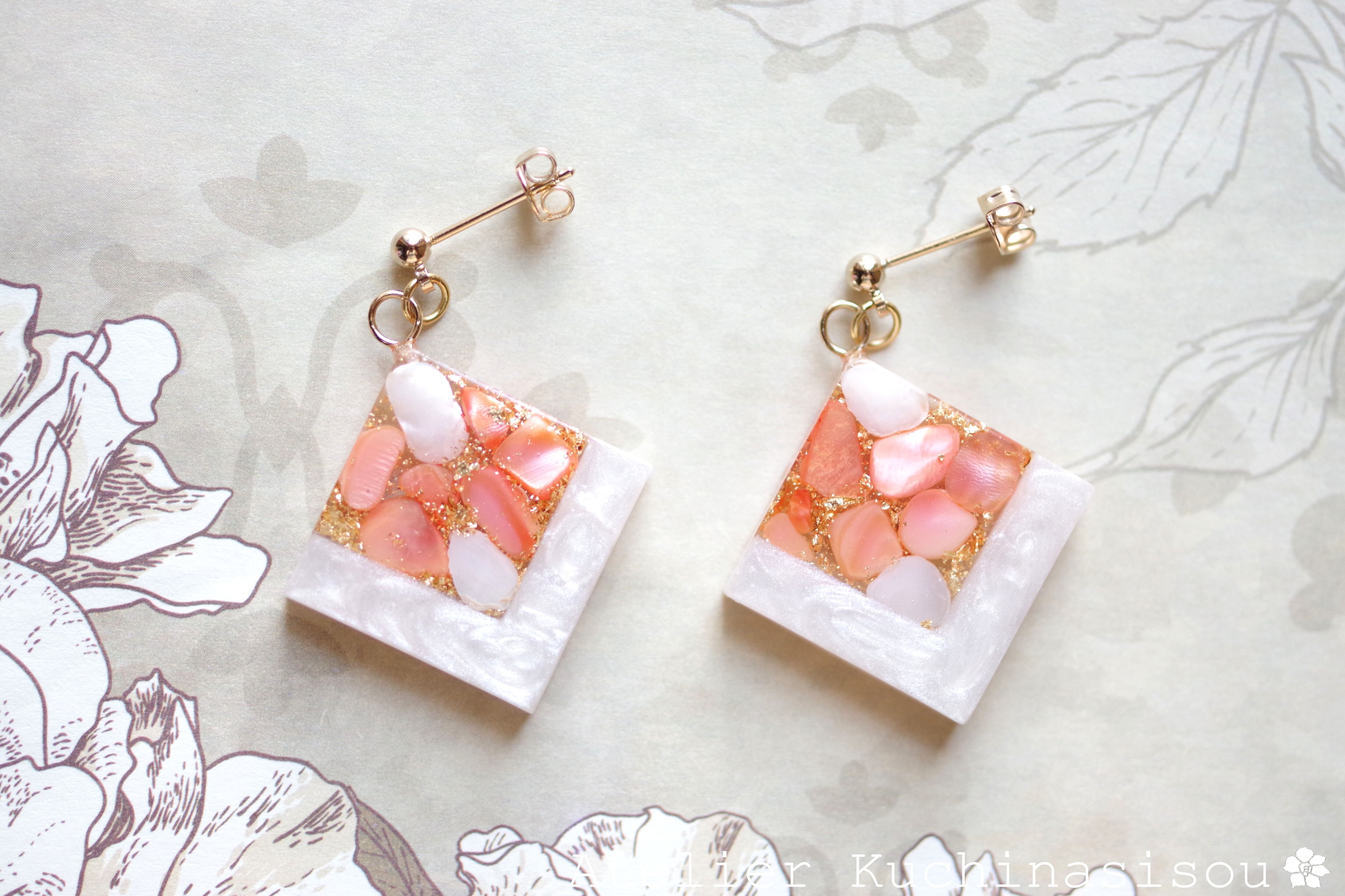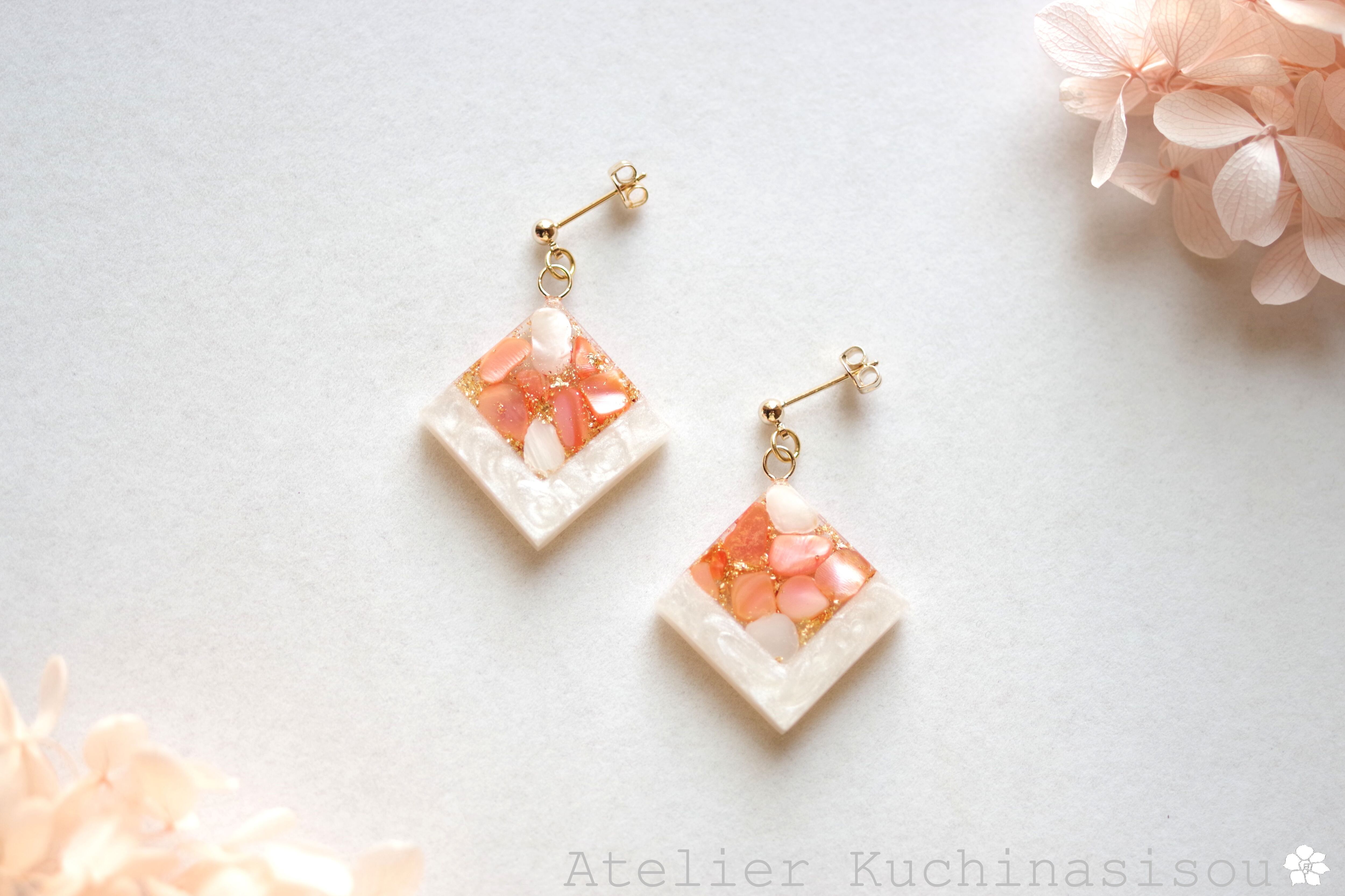レジンアート スクエアピアス〈囁き貝・コーラル〉