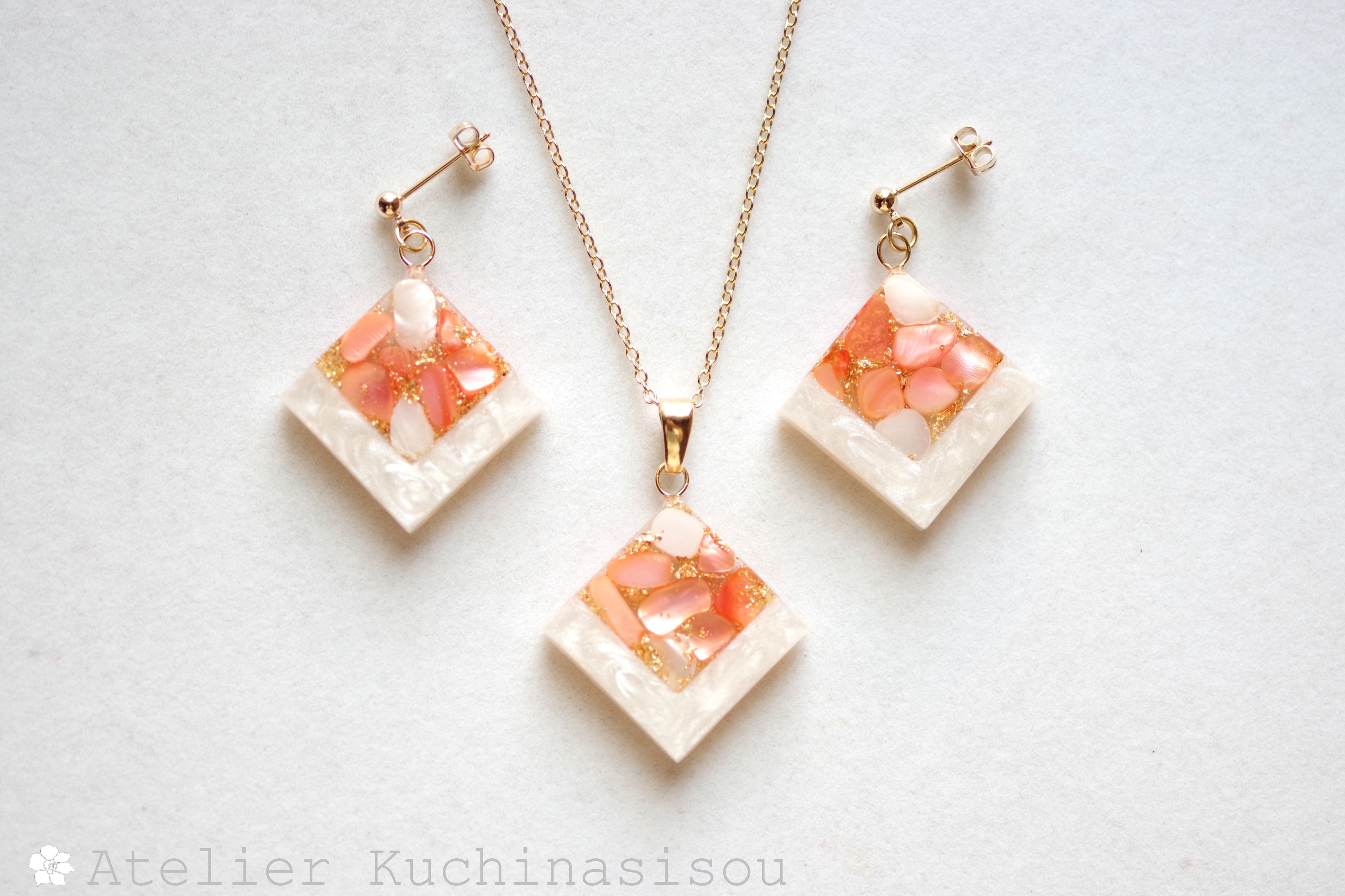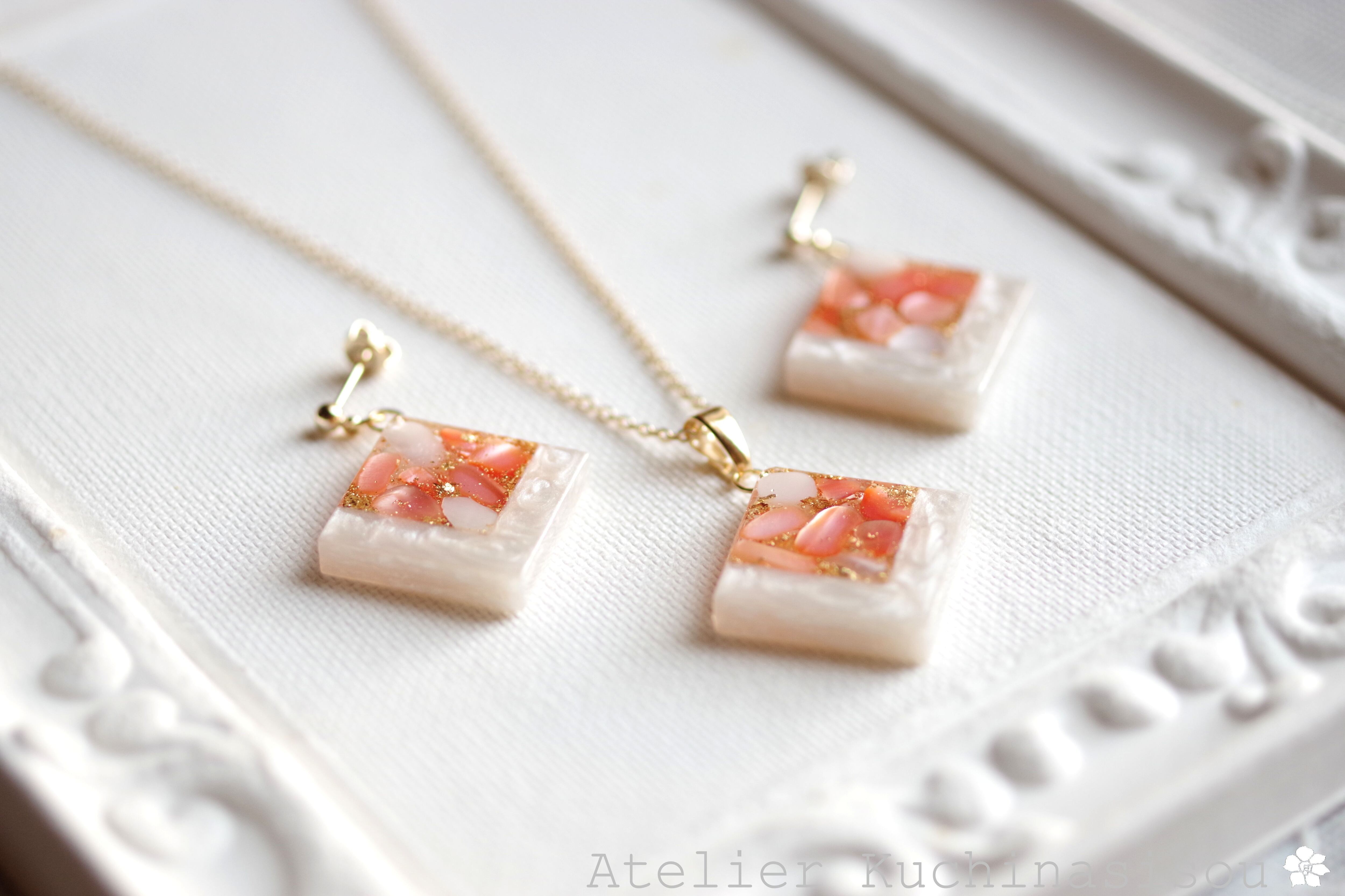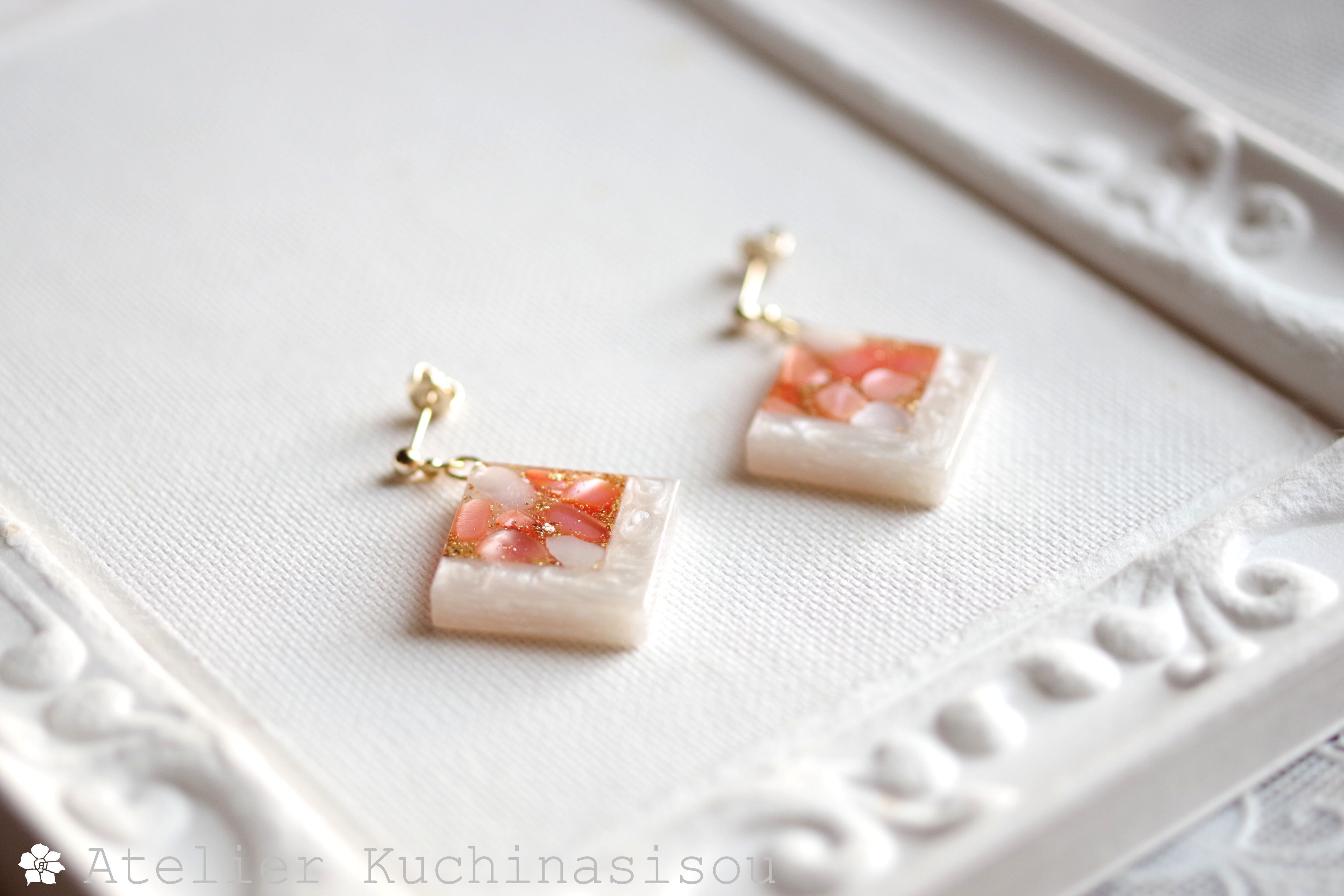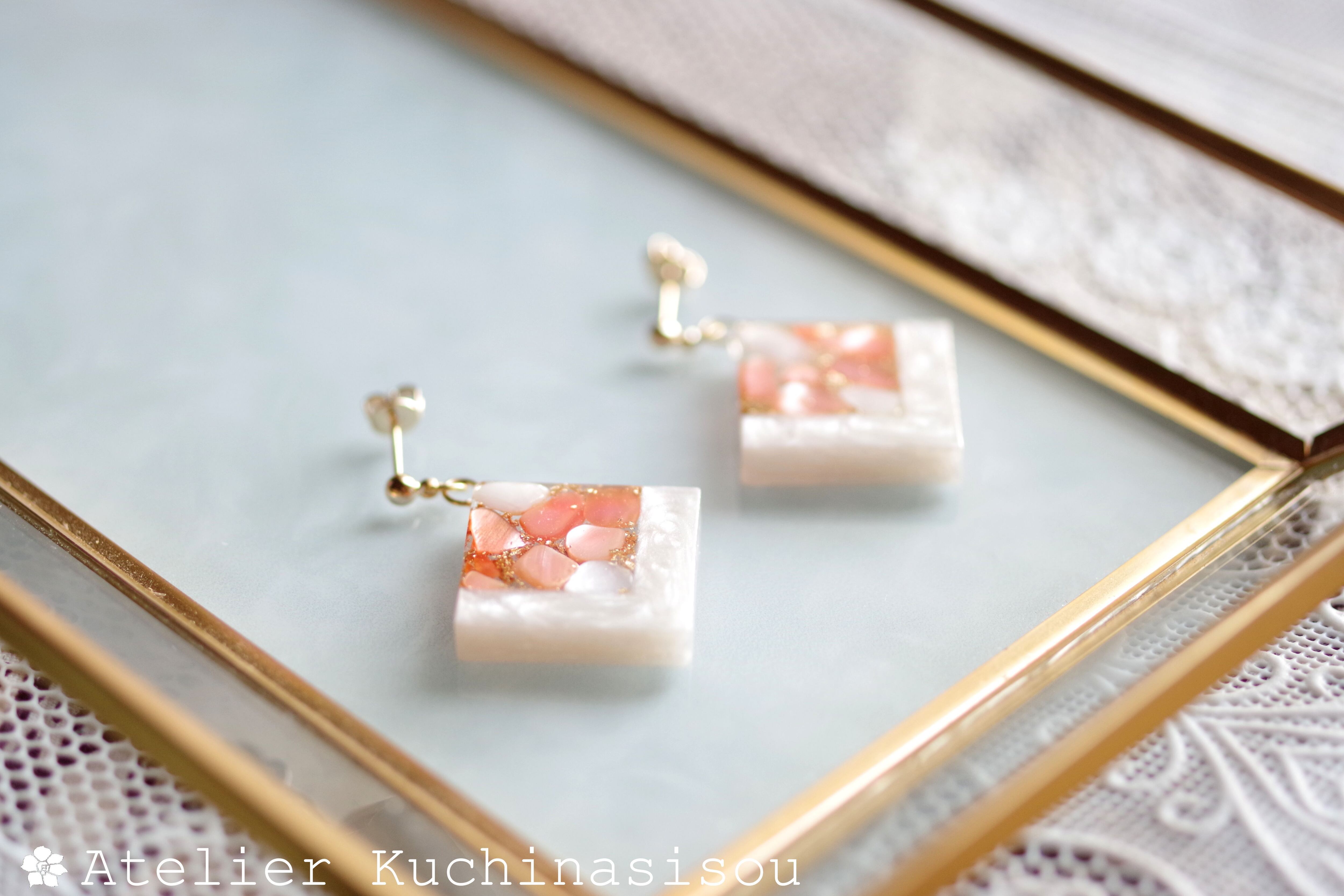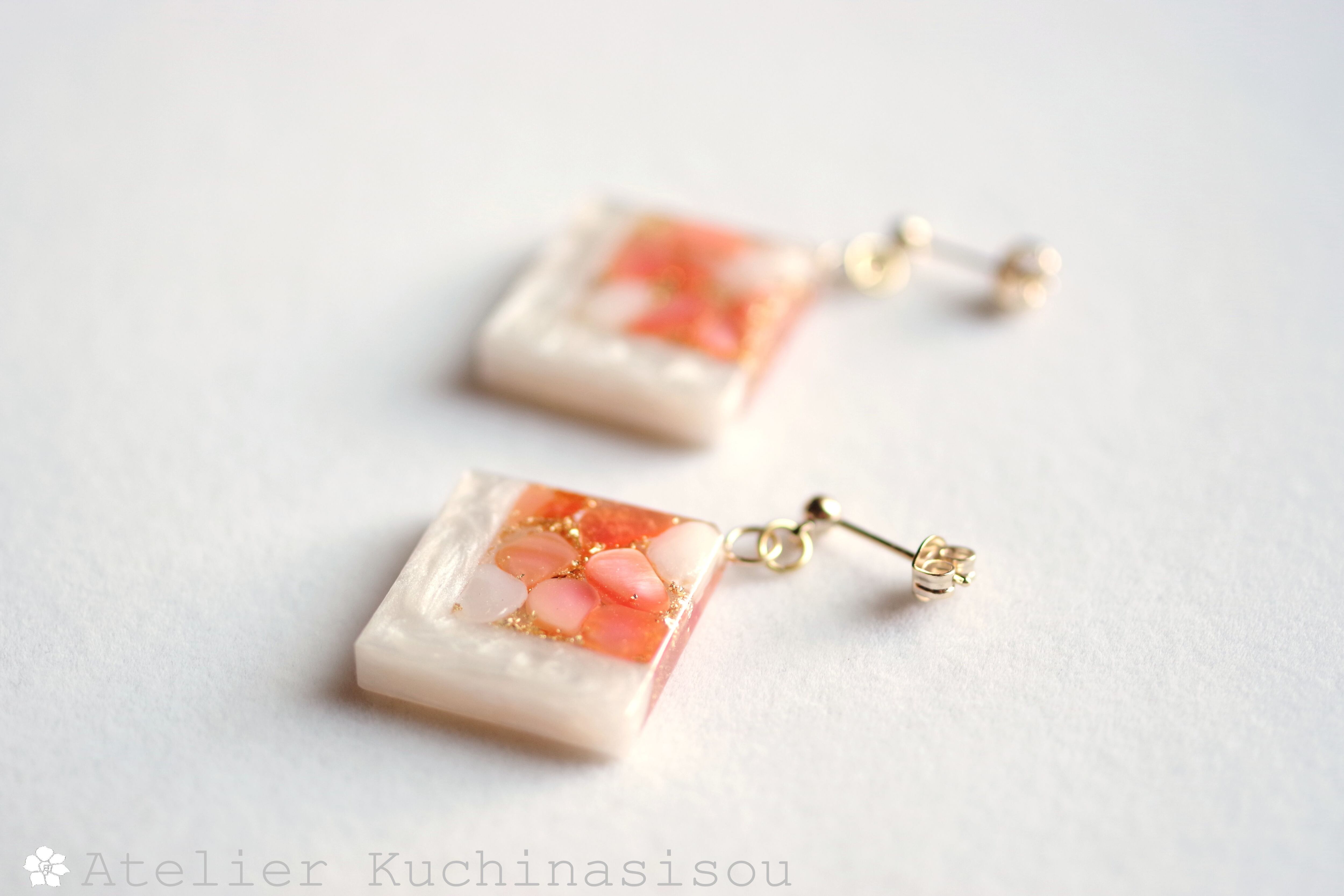 レジンアート スクエアピアス〈囁き貝・コーラル〉