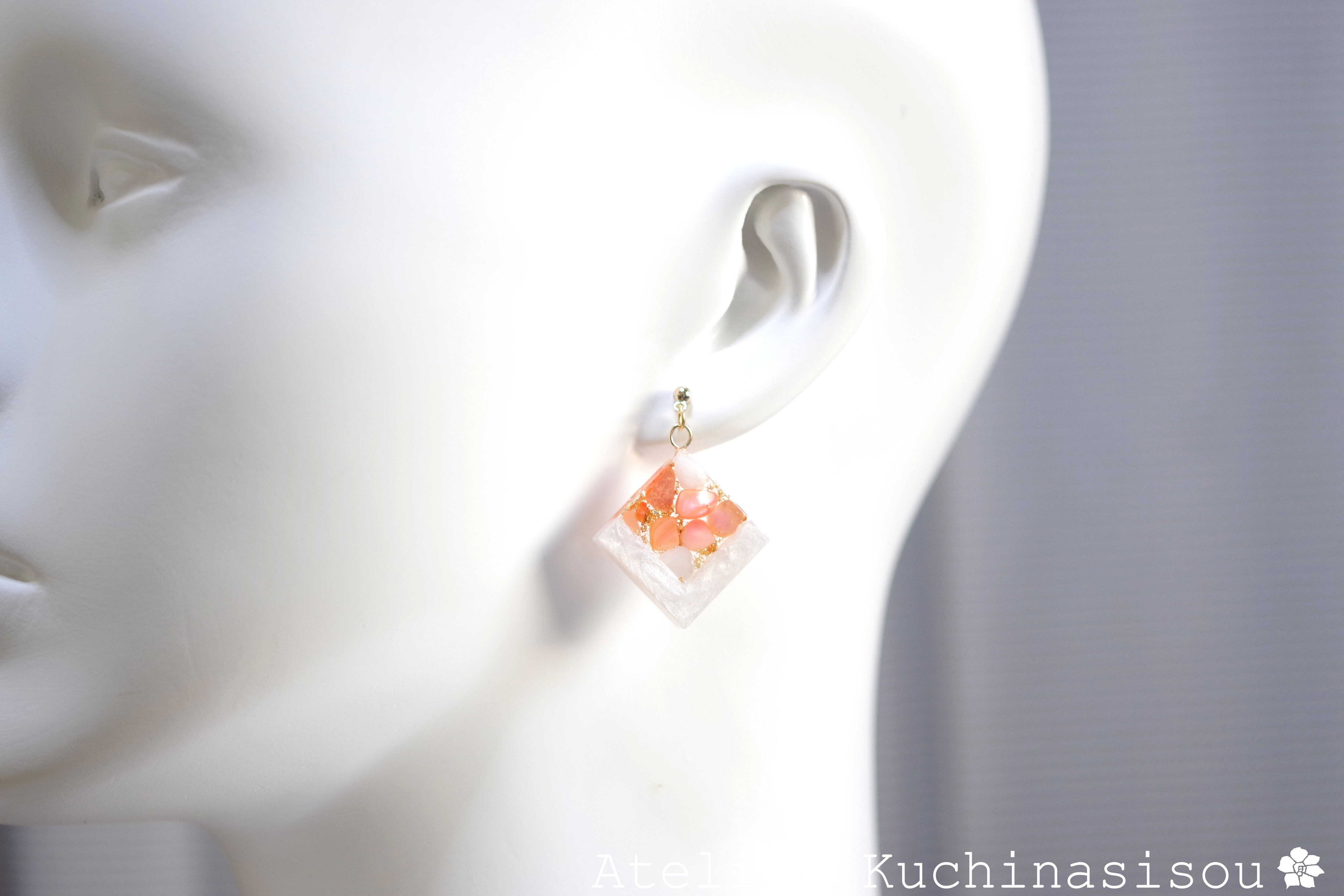 透明のレジンにホワイトシェルとコーラルに着色されたシェルを沈め、光沢のあるホワイトで囲ったピアス。