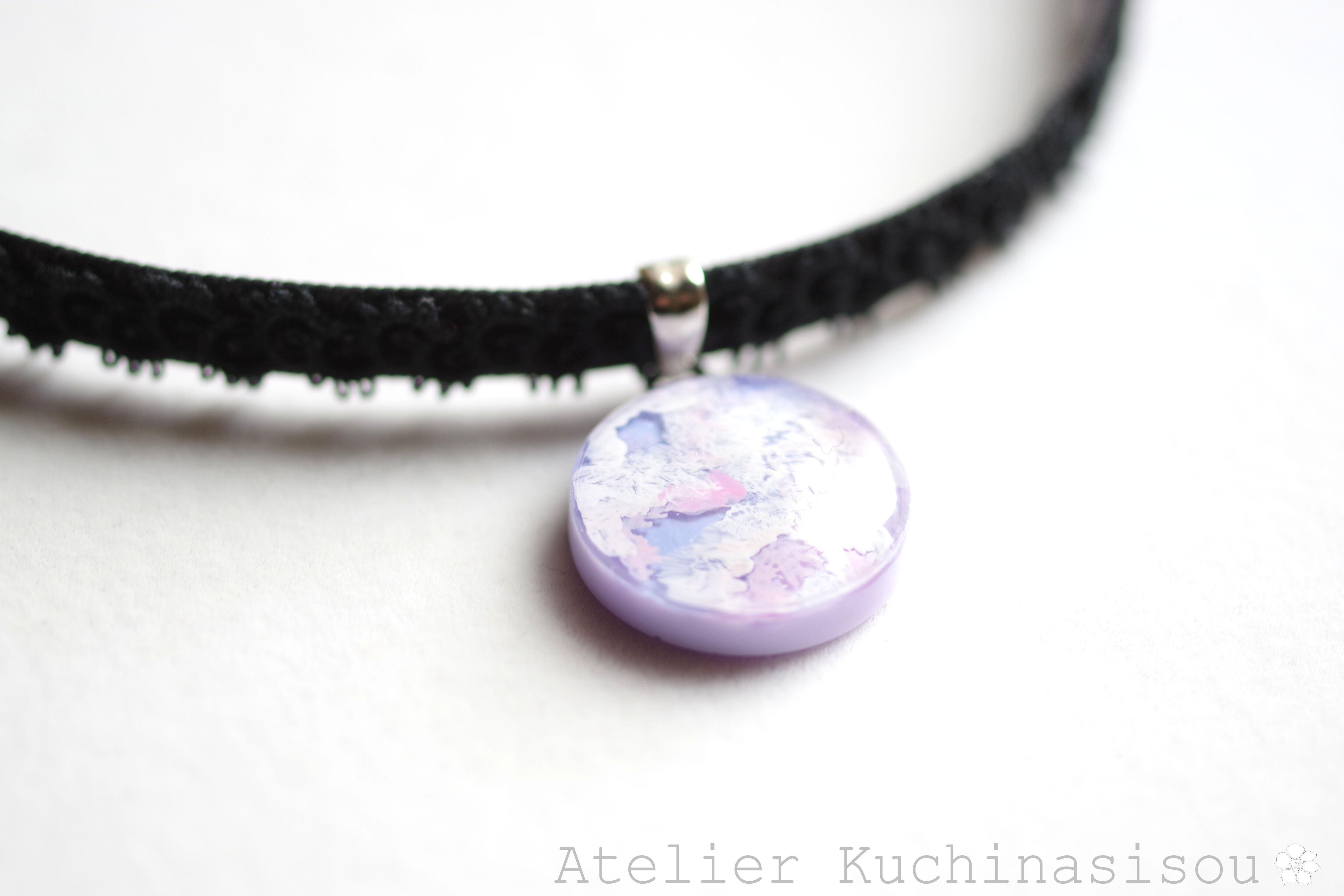 明け方のようにも黄昏のようにも見える、紫色にほのかにピンクが混じった雲に覆われた空を思わせるレジンを、ベルベットリボンにタティングレースで装飾を施したチョーカーに仕上げました。