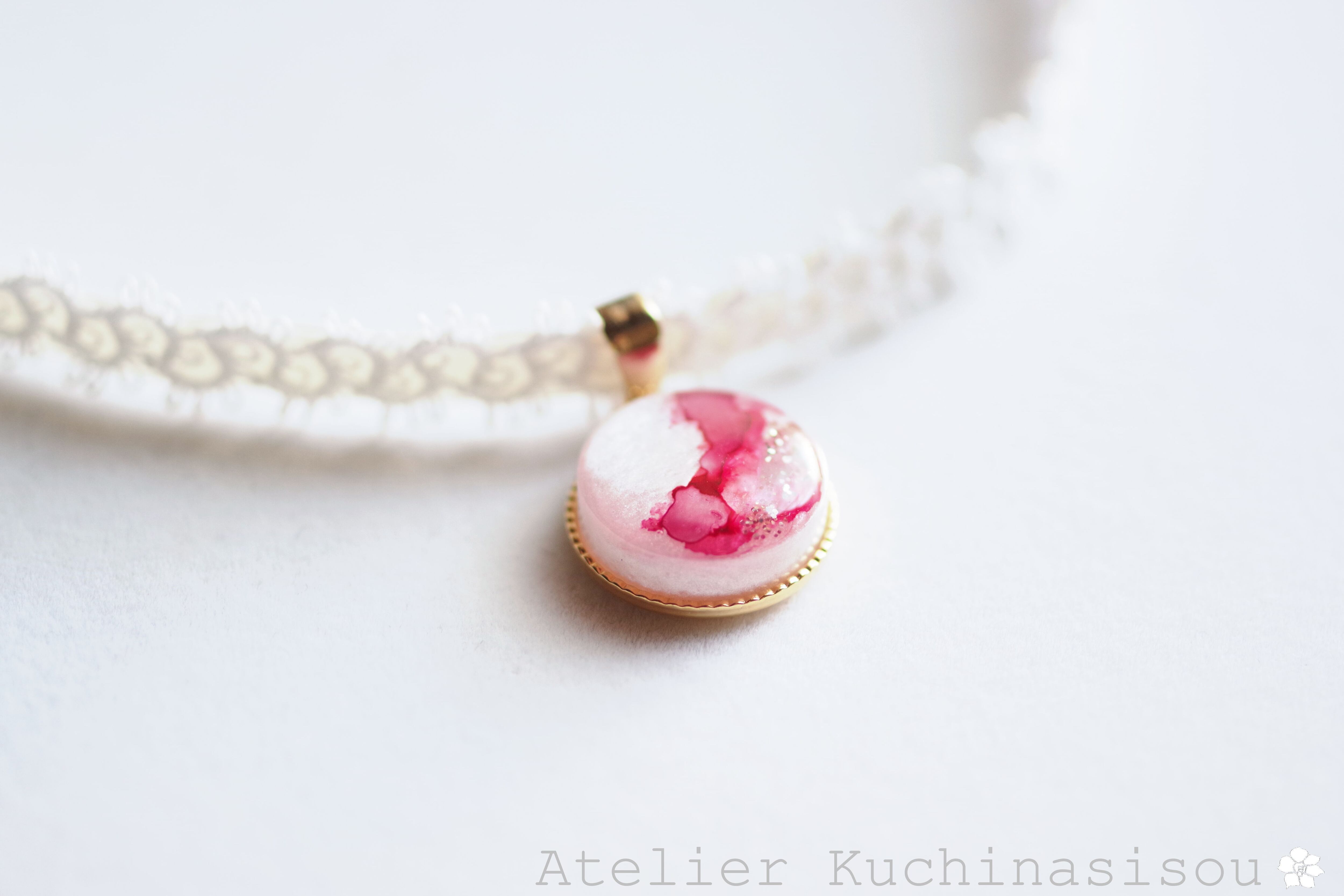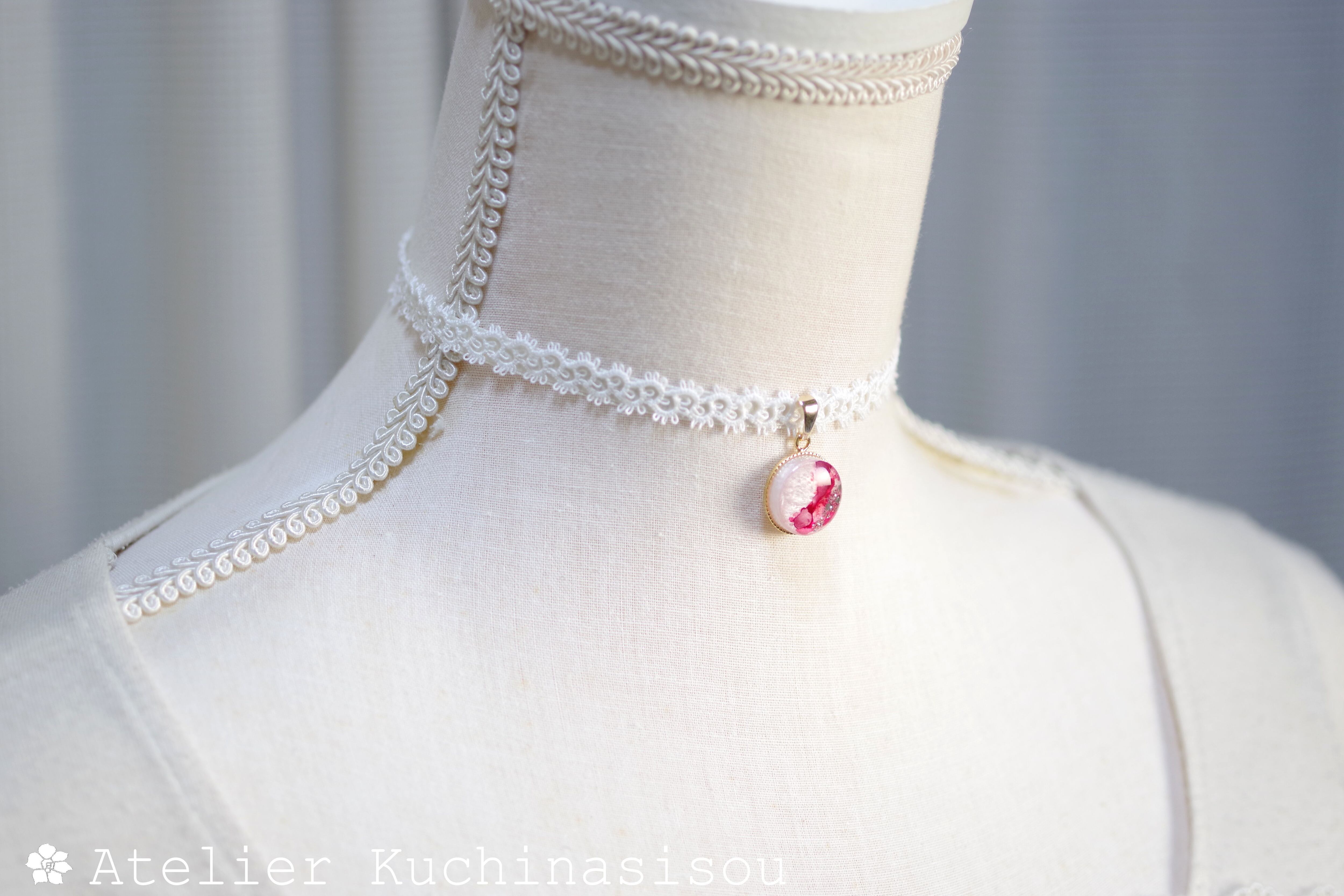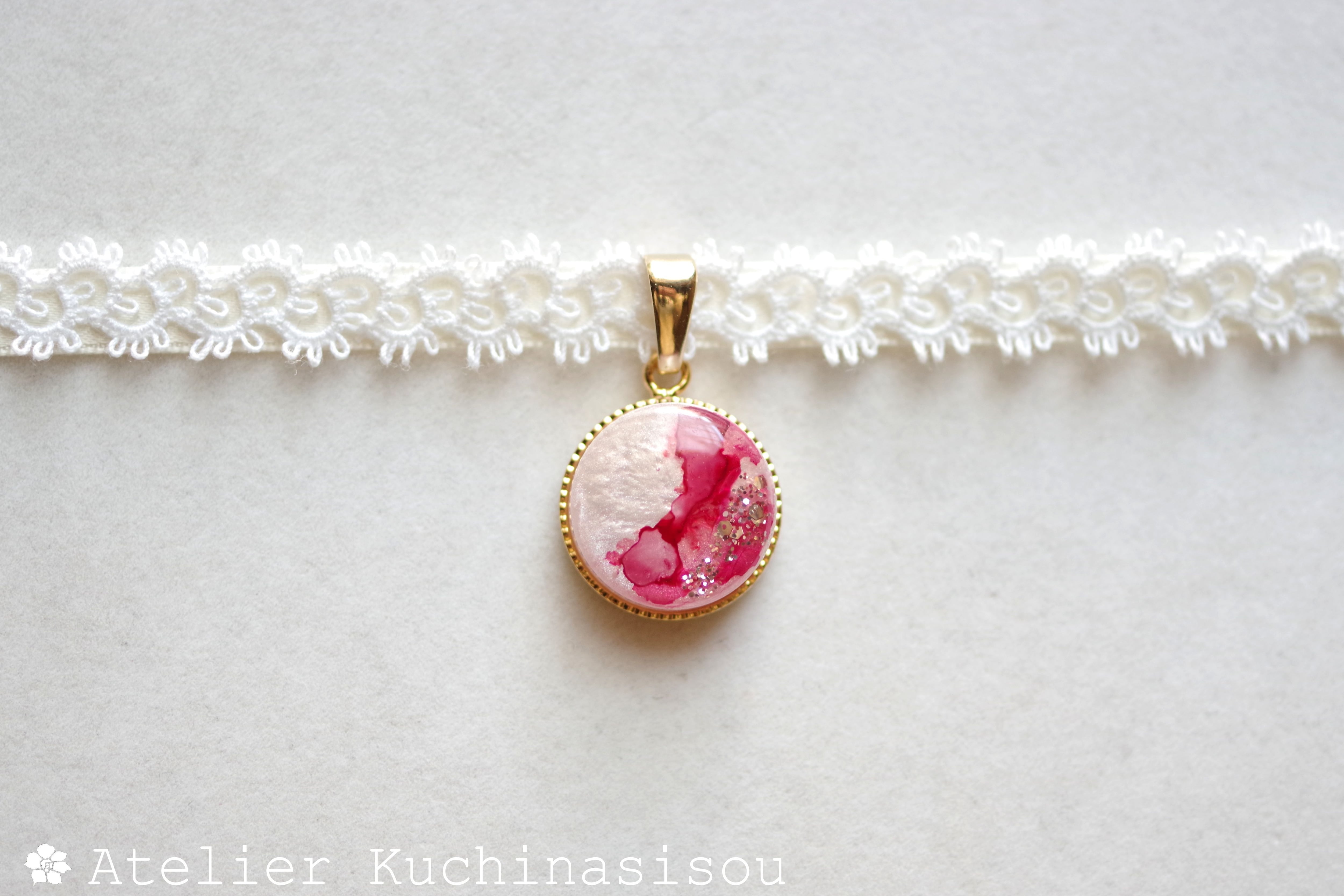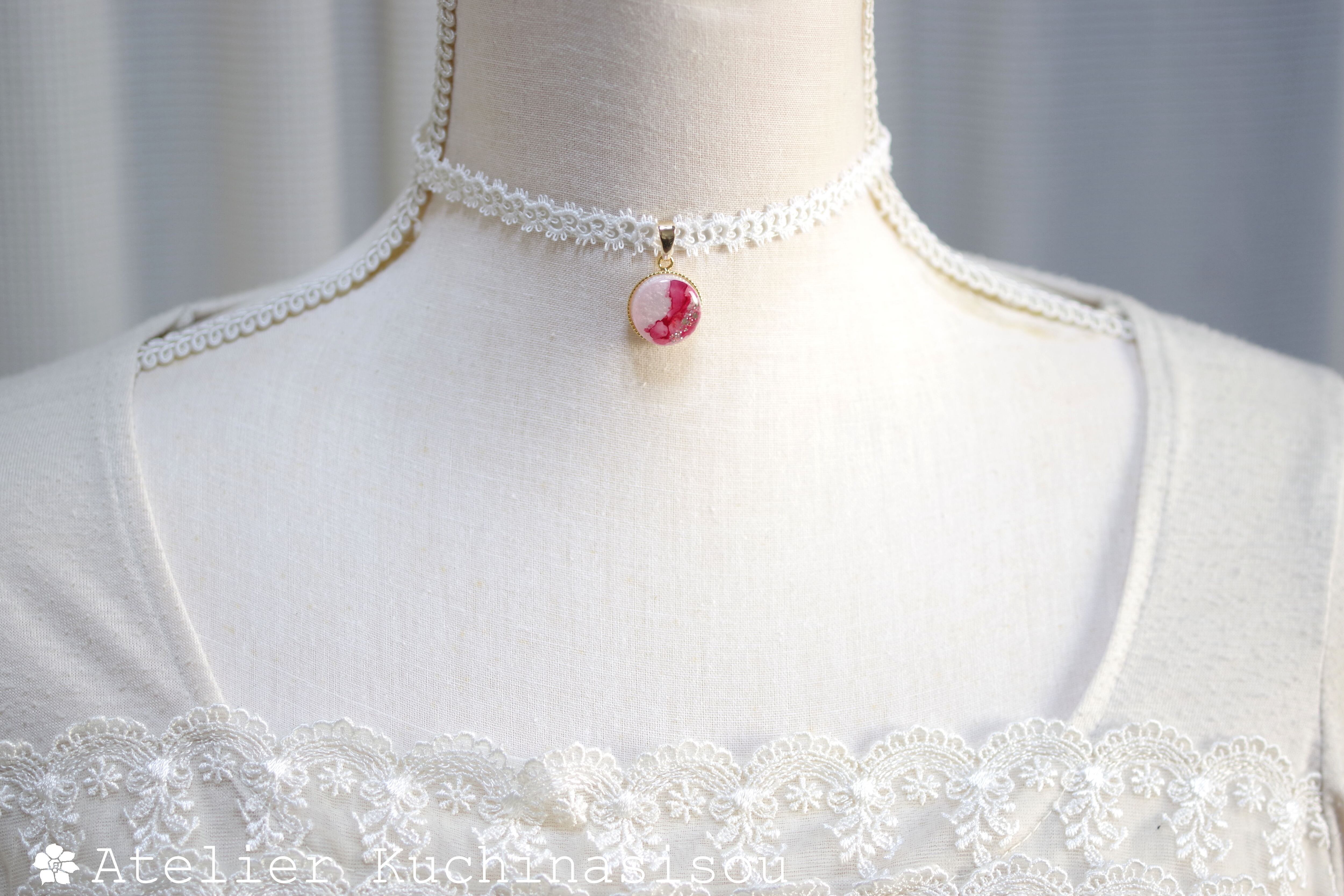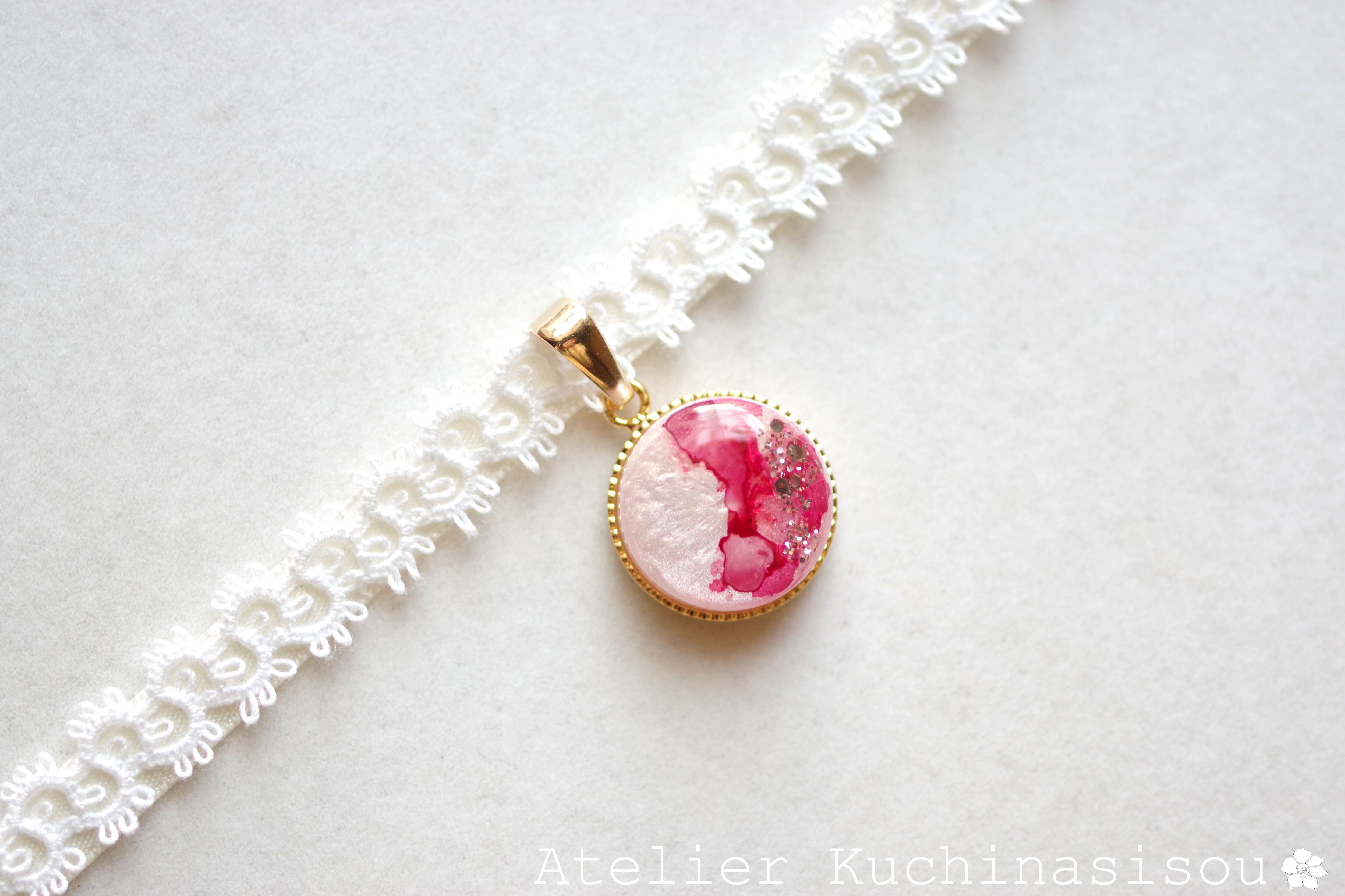 真珠色のレジンをピンク色で着色し、控えめにラメを乗せた、小粒ながらも可憐なレジンを、サテンリボンにタティングレースで装飾を施したチョーカーに仕上げました。