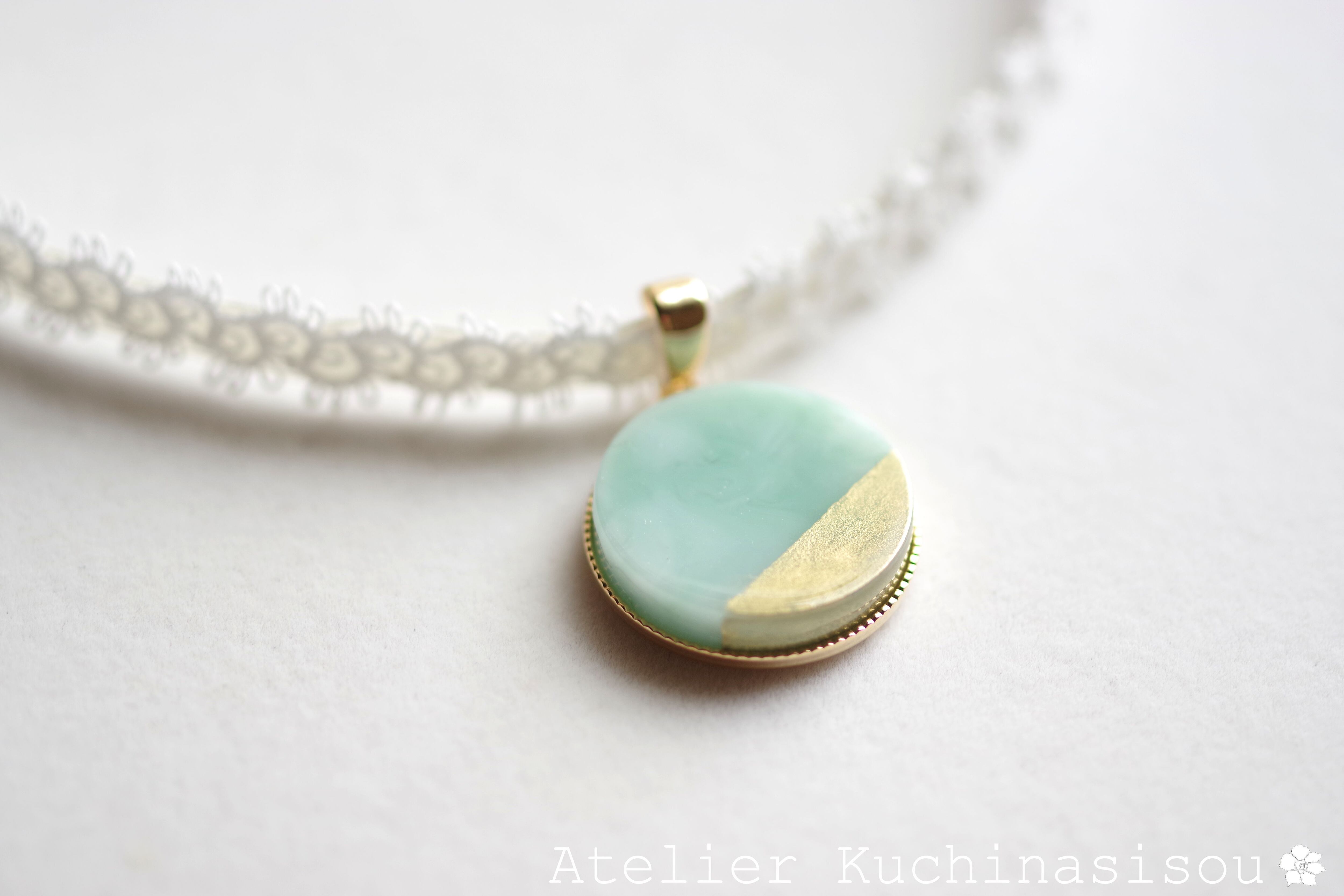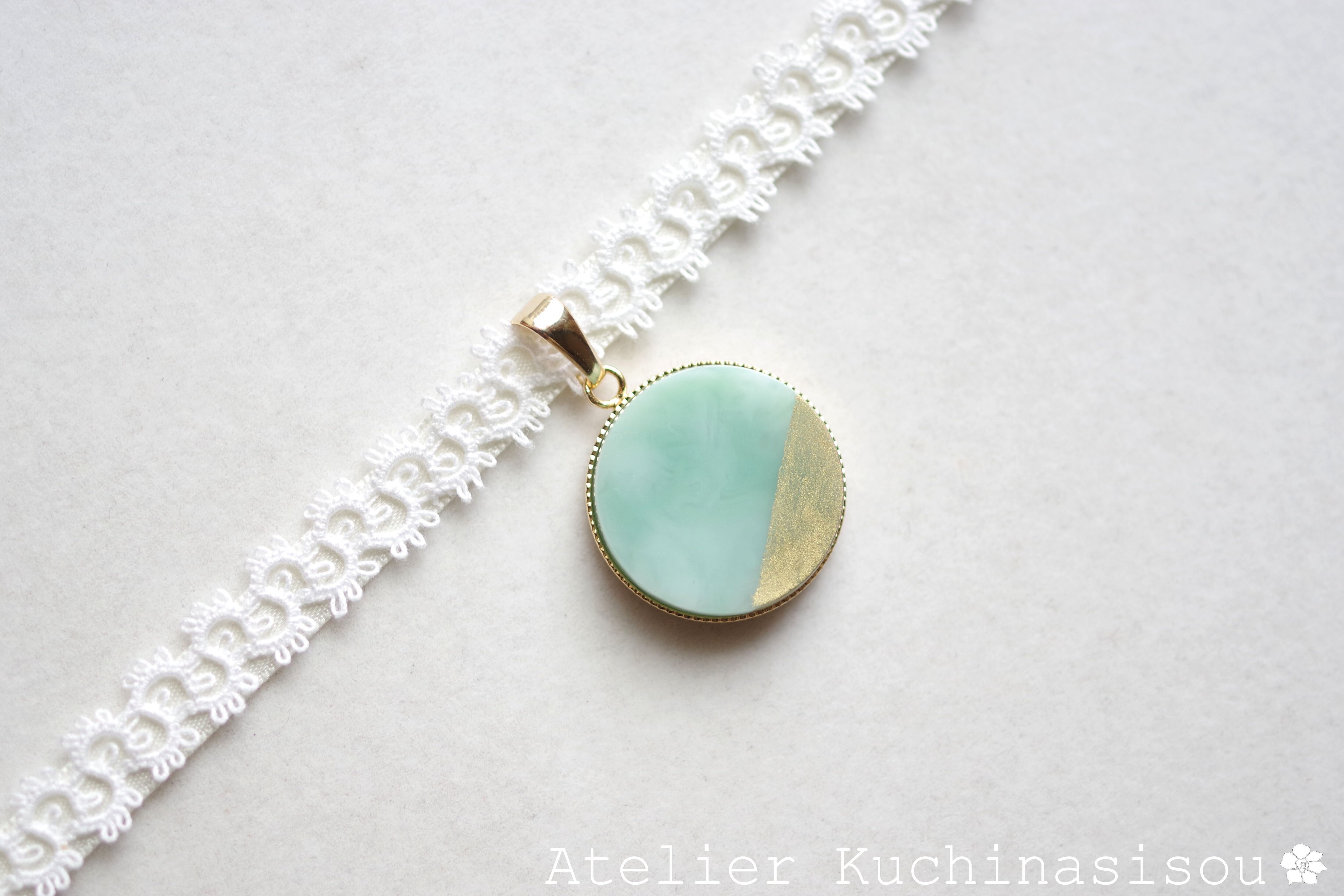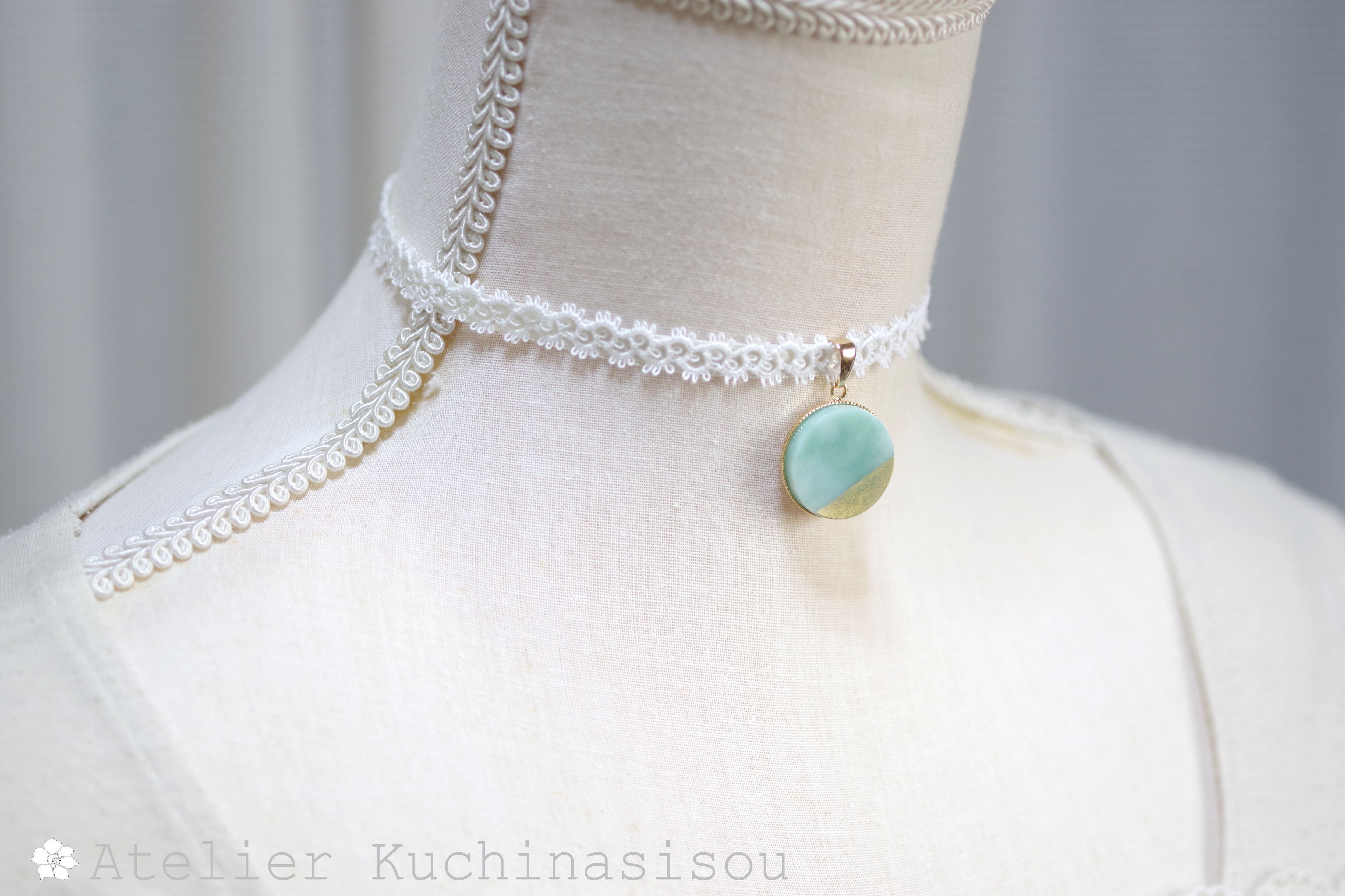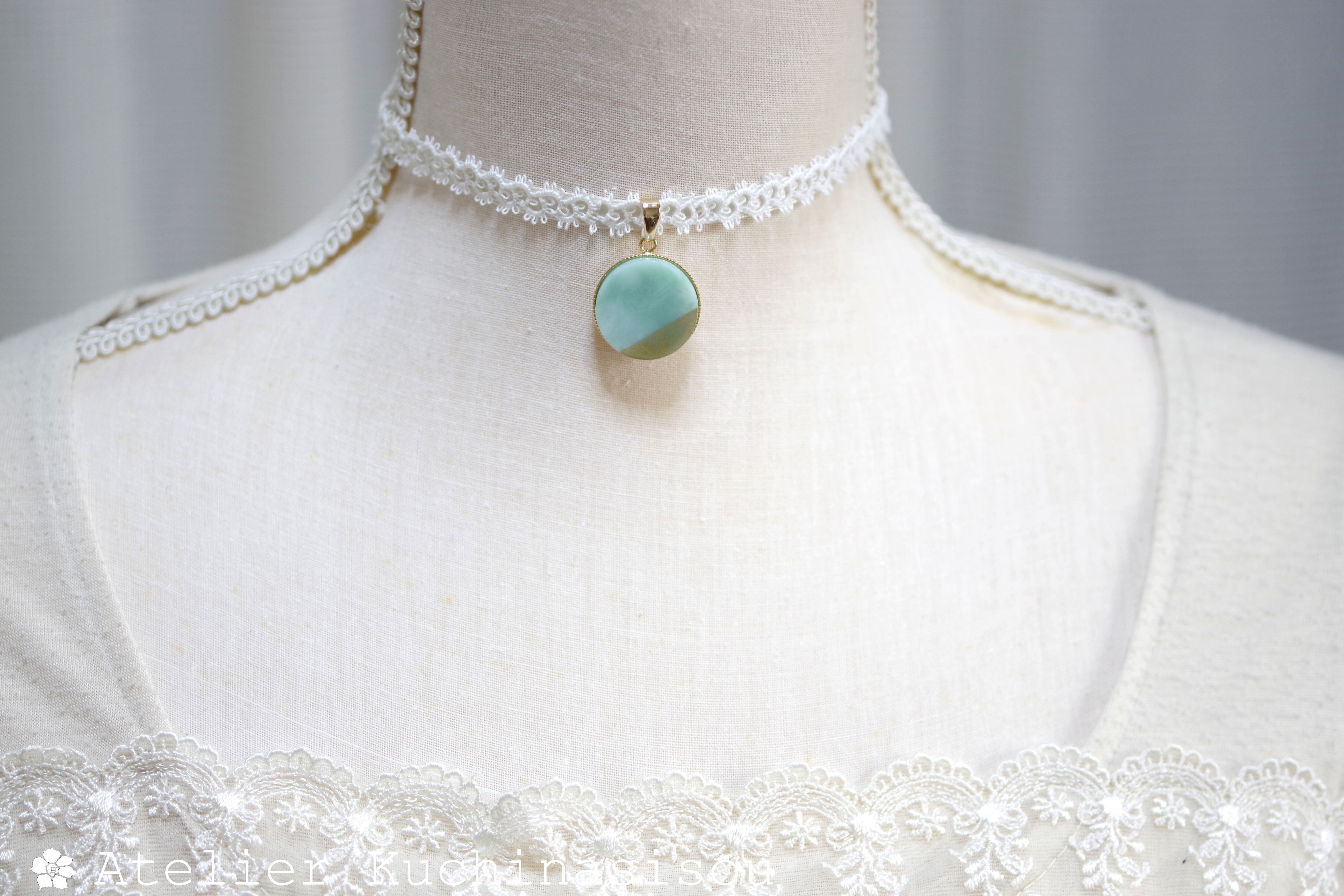 グリーンとホワイトが描く優美なマーブル模様に、ゴールドの装飾を加えたレジンを、サテンリボンにタティングレースで装飾を施したチョーカーに仕上げました。