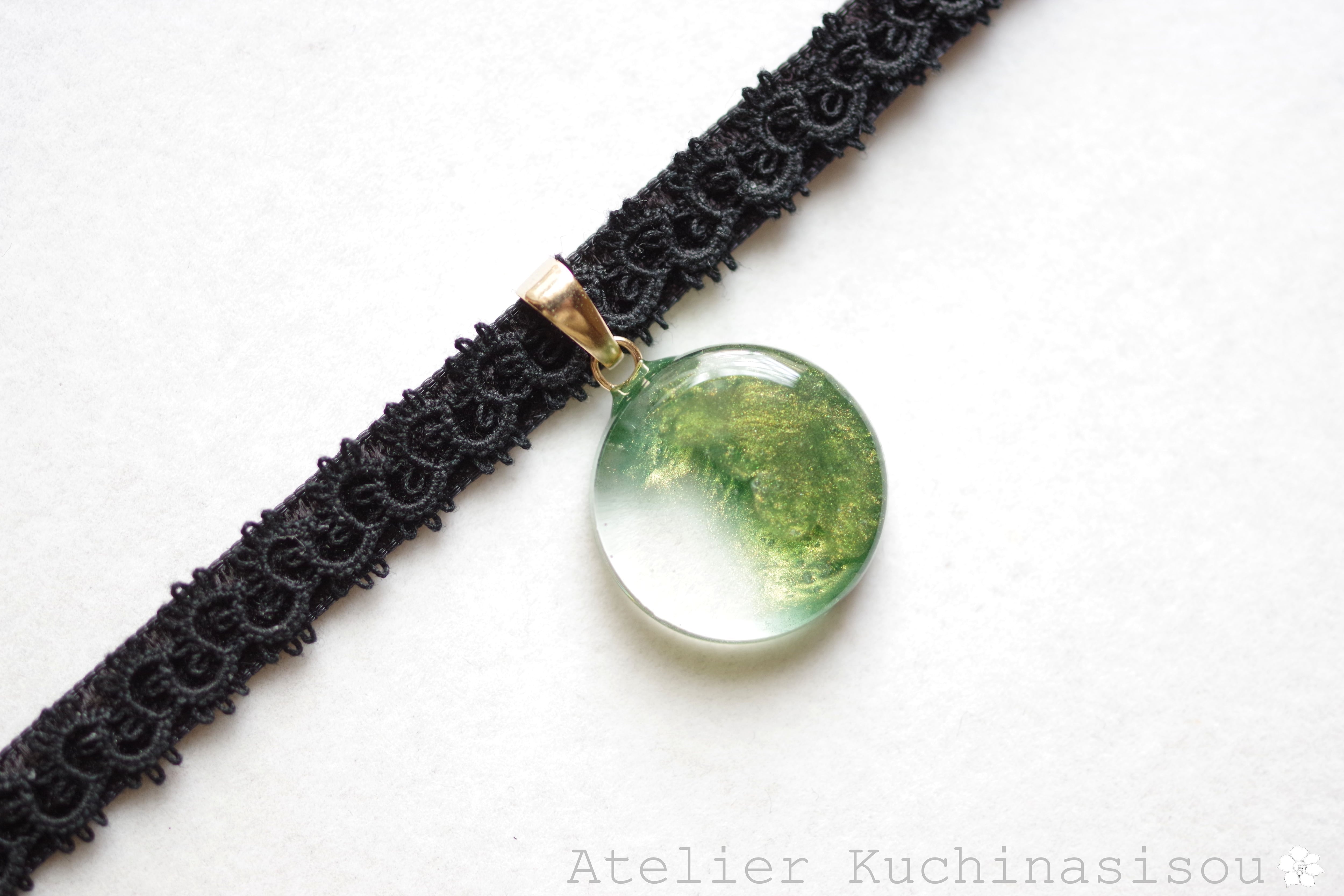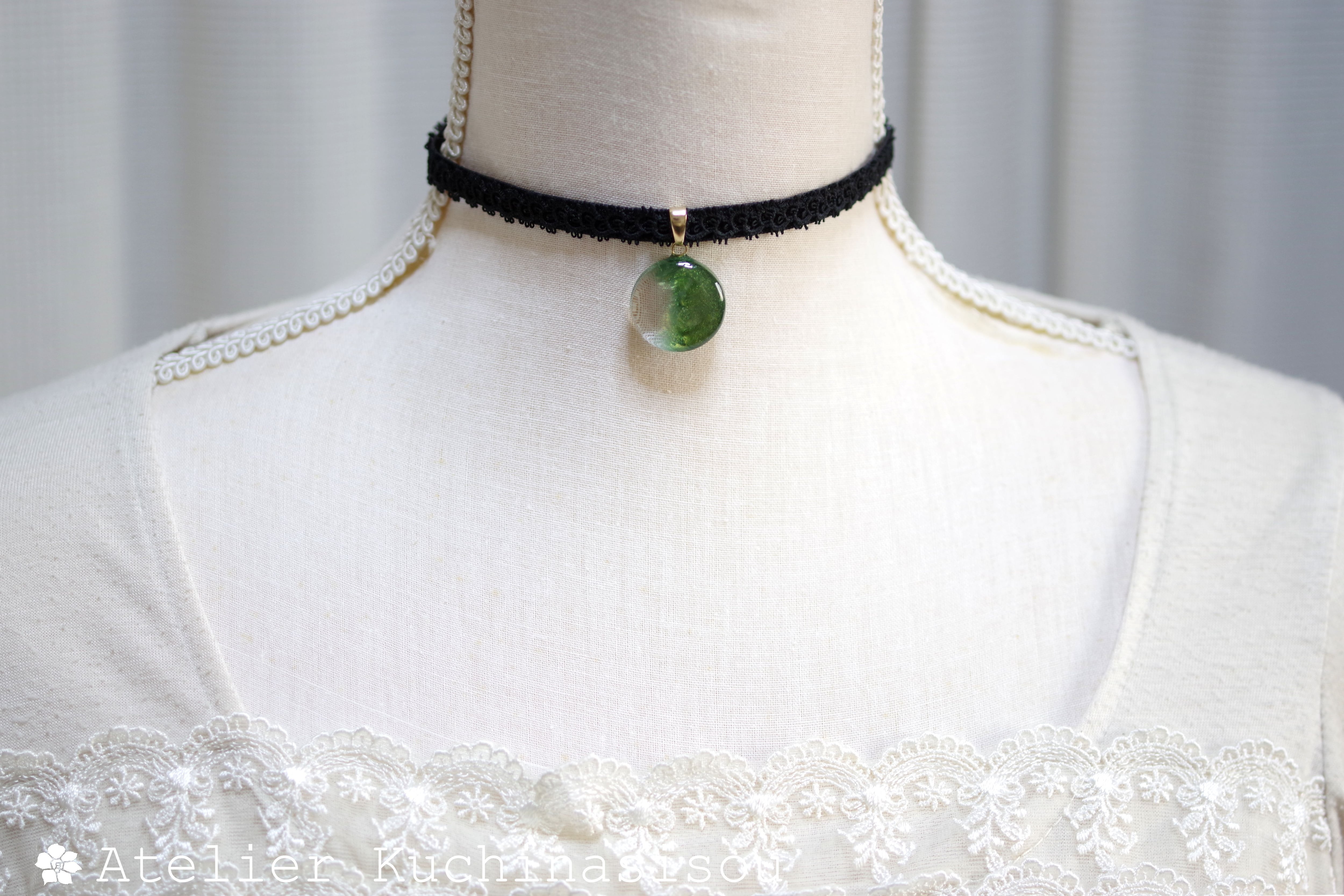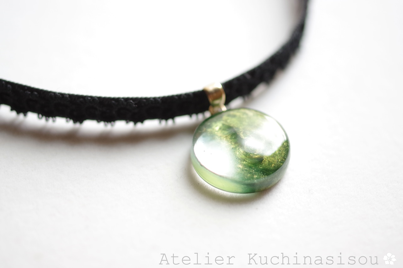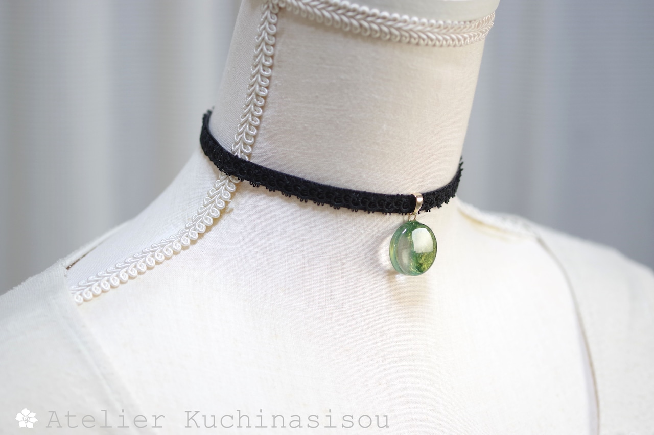 光沢のあるグリーンと透明部分のコントラストが華やかで美しいレジンを、ベルベットリボンにタティングレースで装飾を施したチョーカーに仕上げました。