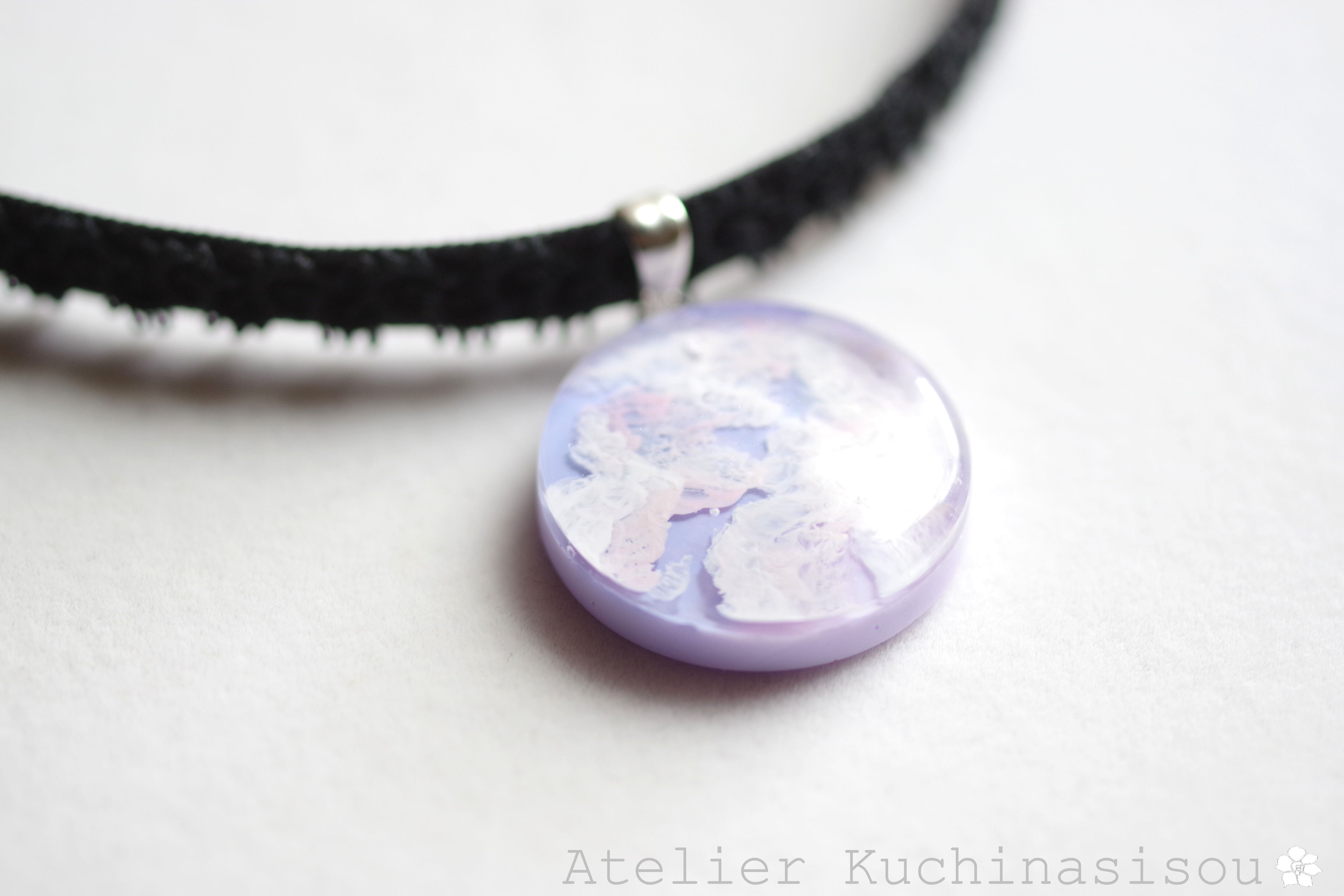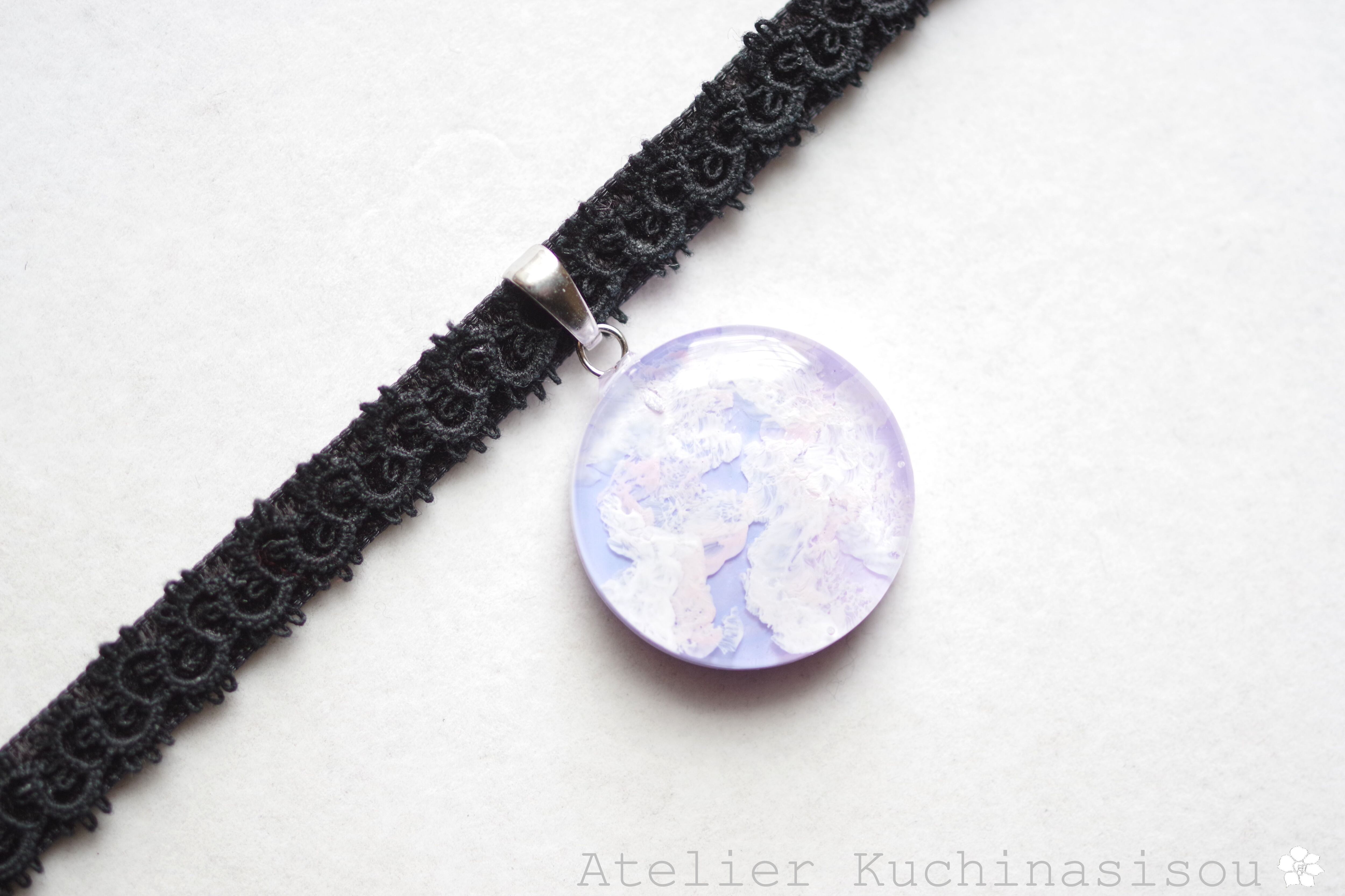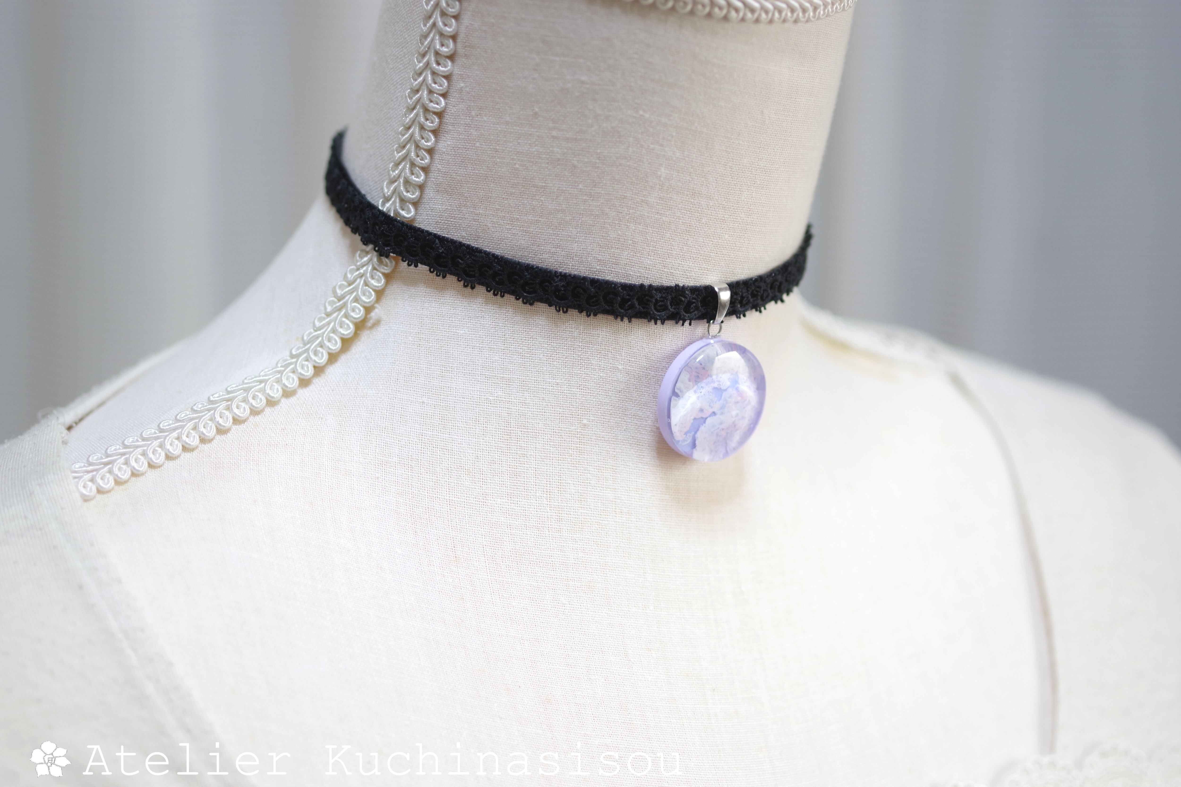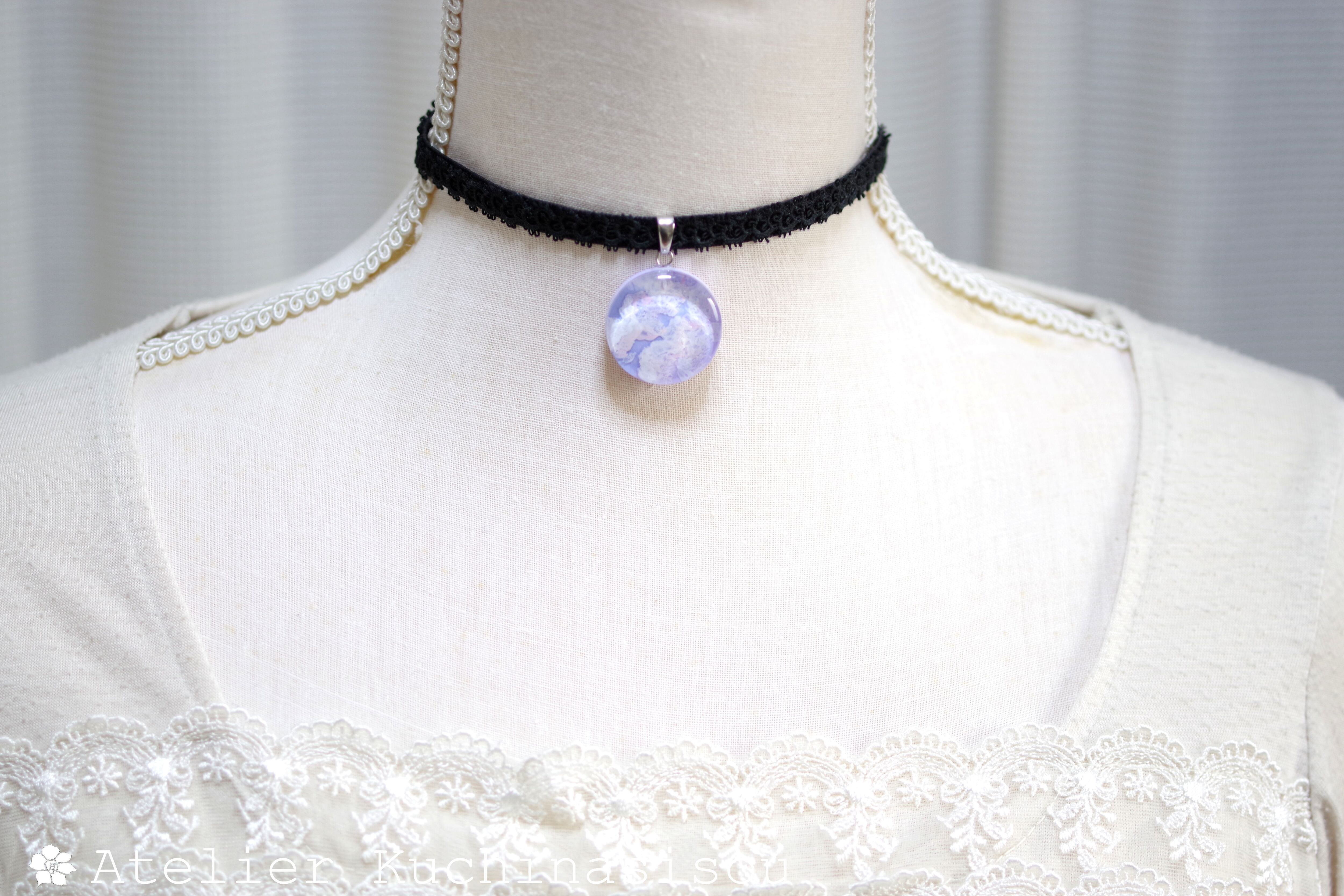 明け方のようにも黄昏のようにも見える、紫色にほのかにピンクが混じった雲に覆われた空を思わせるレジンを、ベルベットリボンにタティングレースで装飾を施したチョーカーに仕上げました。